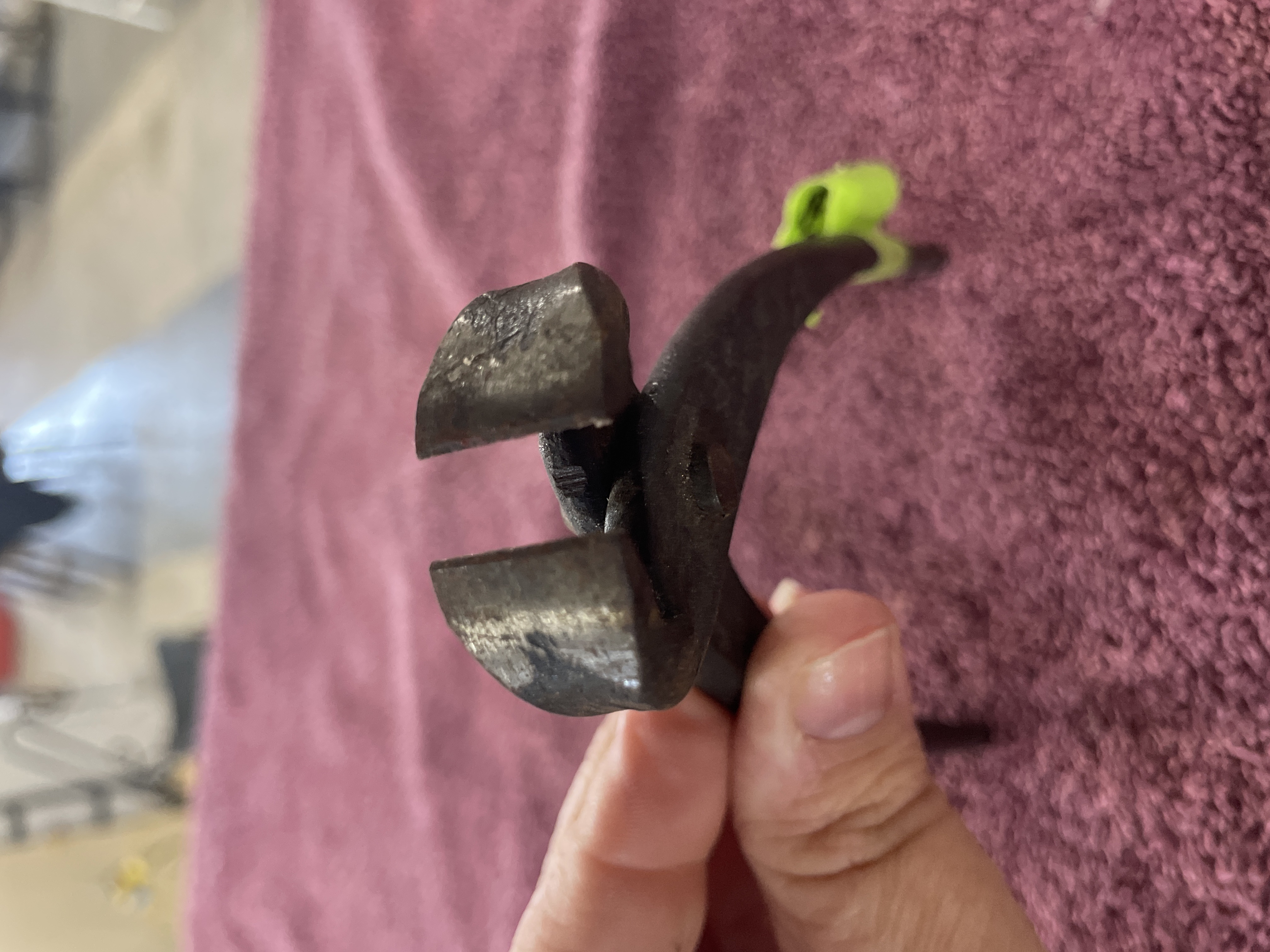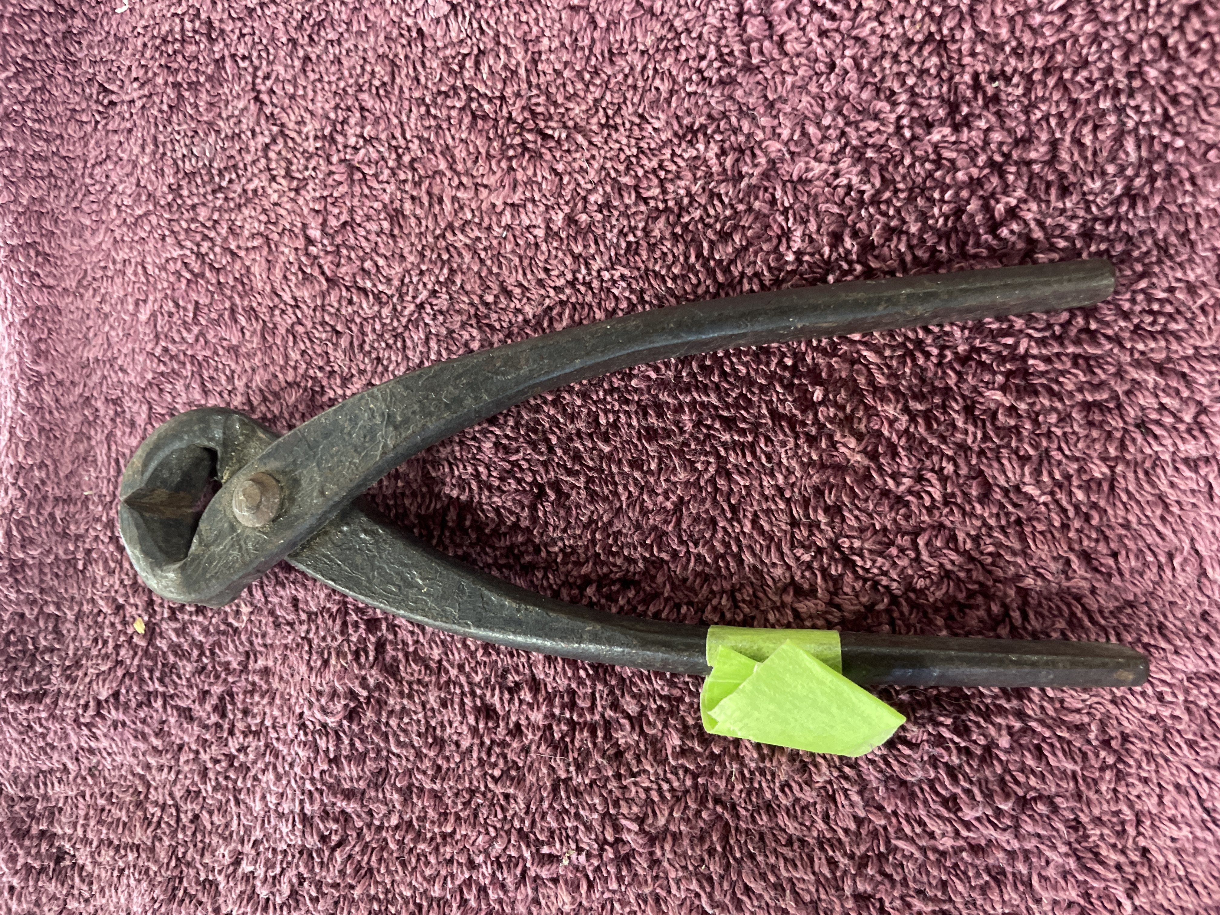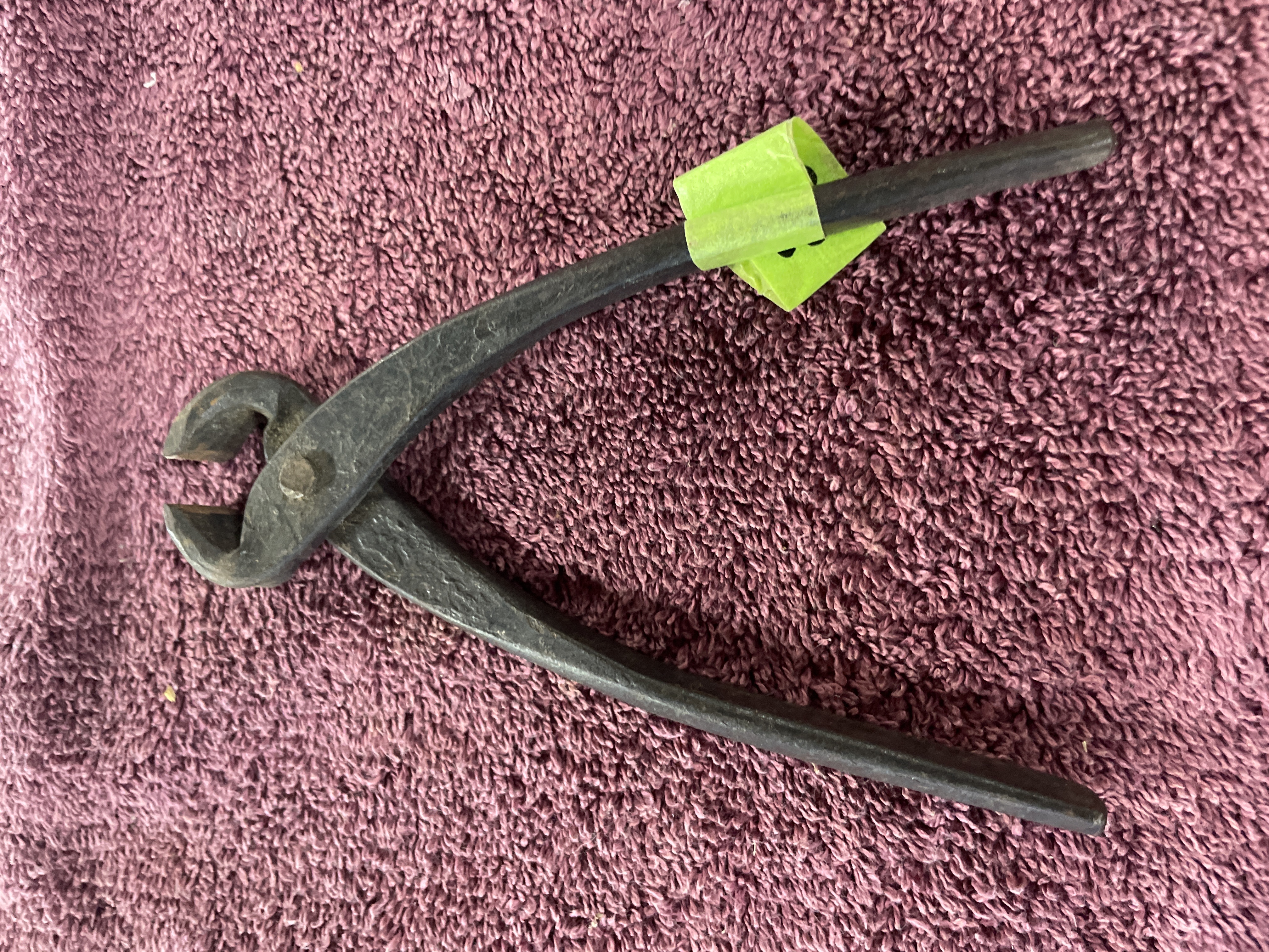 A single piece of vintage or antique forged metal nippers, likely designed for general utility, carpentry, or farrier use. The tool is constructed of dark iron or steel, featuring a heavy, rough texture consistent with a hand-forged process. It has long, bowed handles joined by a central riveted joint, terminating in short, blunt, and slightly offset jaws. A piece of neon green painter’s tape is affixed to one handle for identification purposes.
