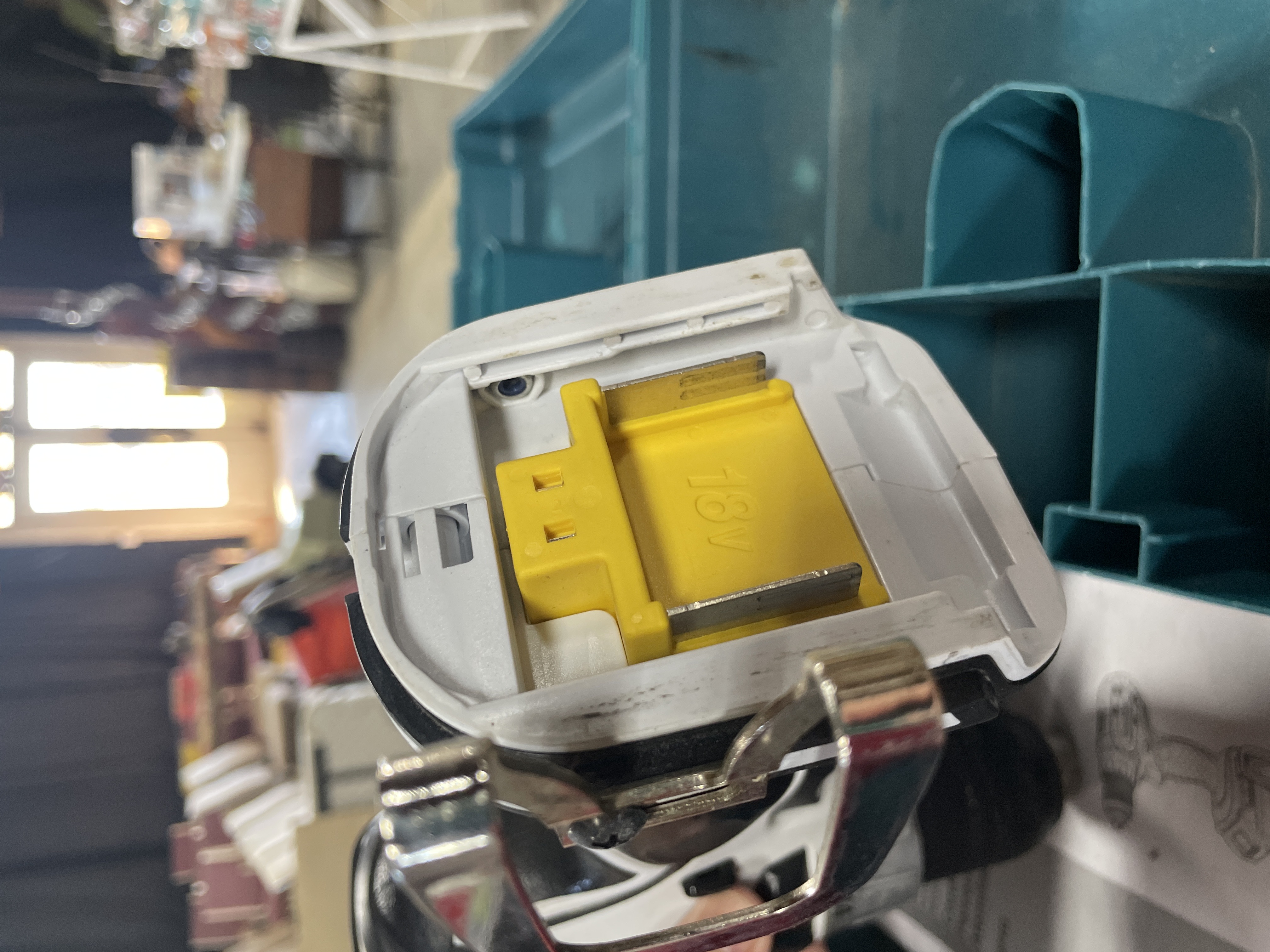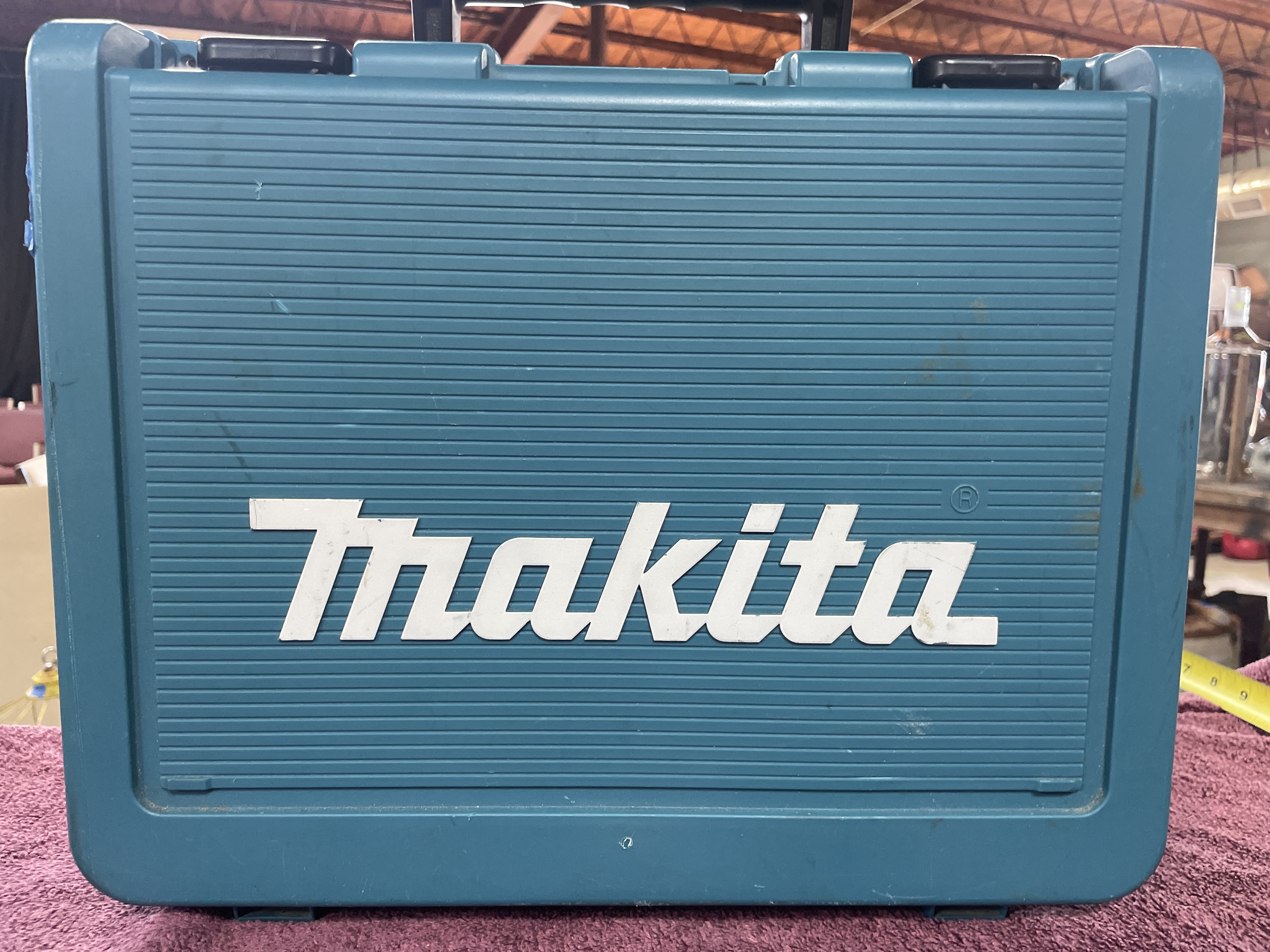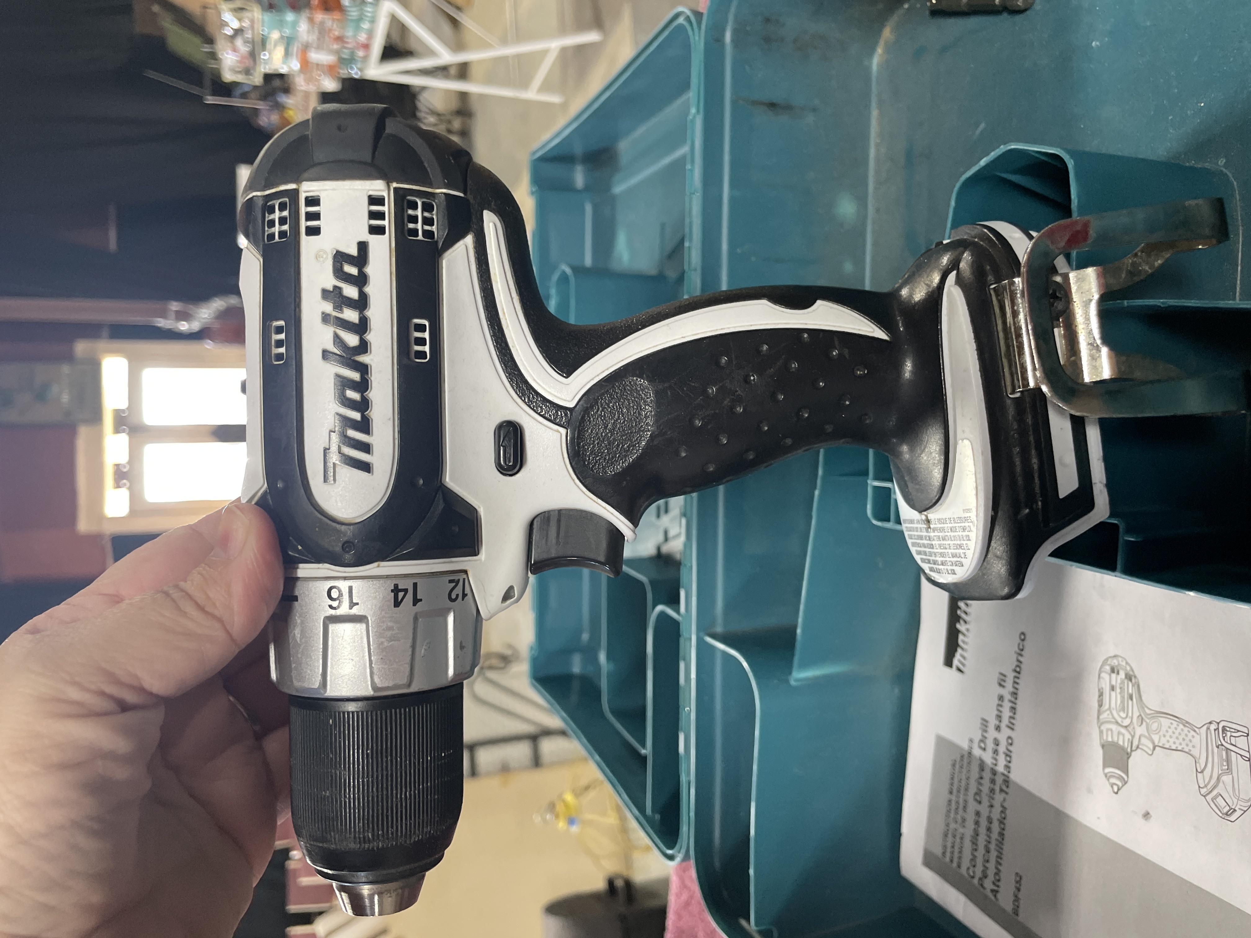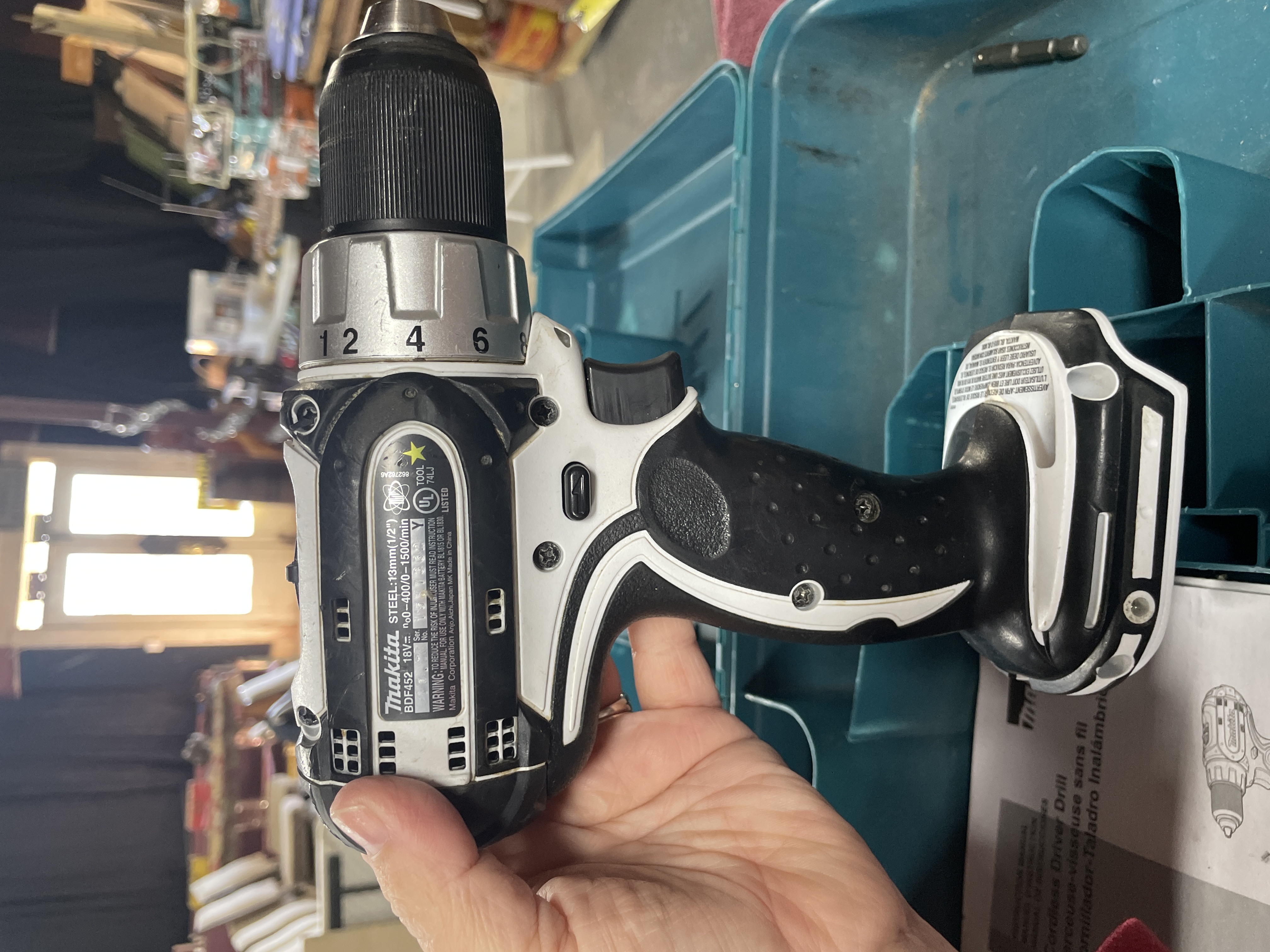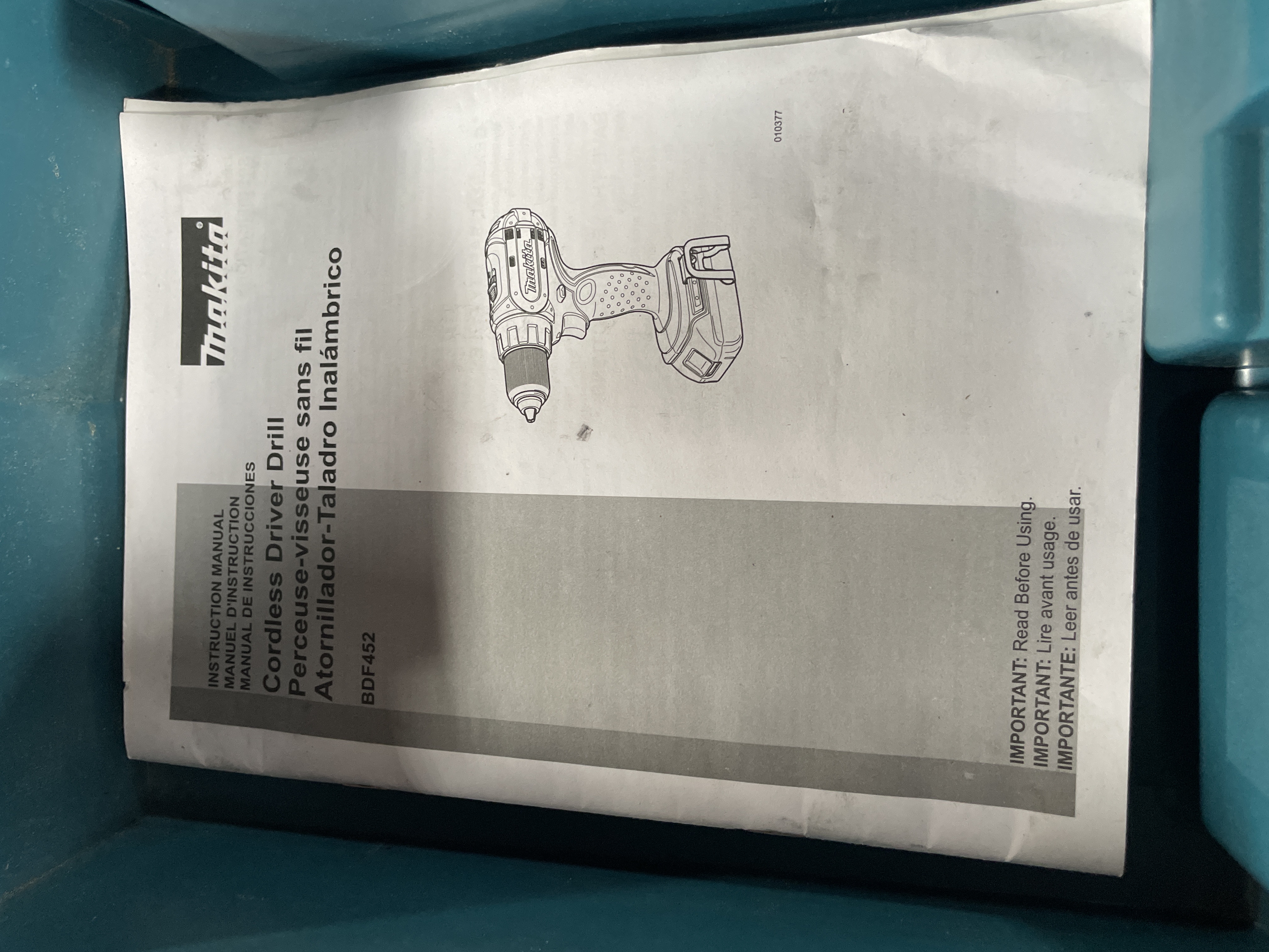 A trio of components comprising the Makita BDF452 18V Cordless Driver Drill Kit. The kit includes the Model BDF452 driver drill, its original teal/turquoise hard-shell carrying case marked with the Makita logo, and a multilingual instruction manual (English, French, Spanish). The drill features a black and white high-impact plastic body with a rubberized grip and is designed for the 18V battery platform, as indicated on the yellow battery housing connection. Specifications visible on the housing confirm the model BDF452 and operating speeds of nO 0-400/0-1500/min. The tool is equipped with a keyless 13mm (1/2″) chuck and an adjustable clutch with numerical settings ranging from 1 through 16. No Battery, not tested