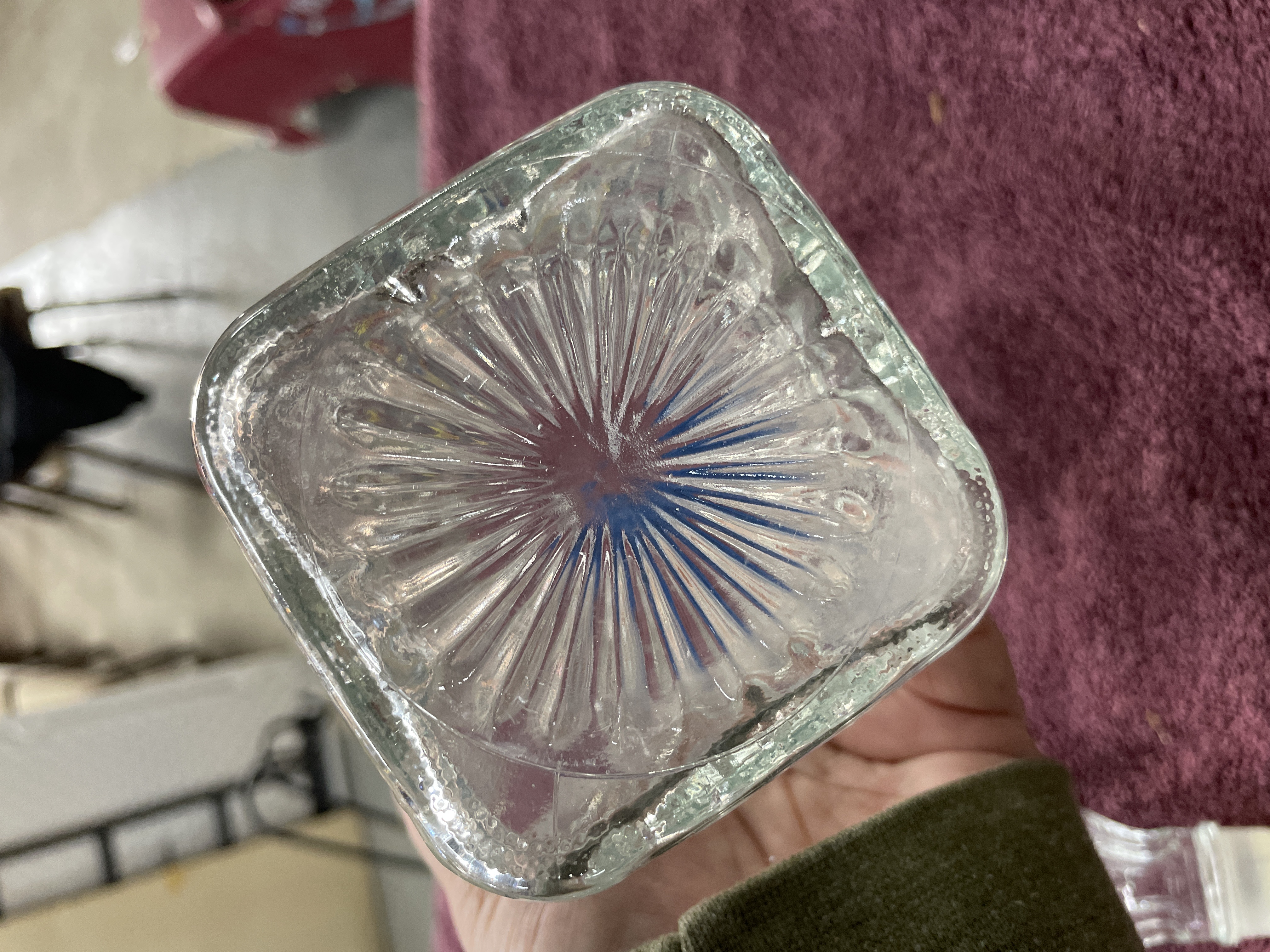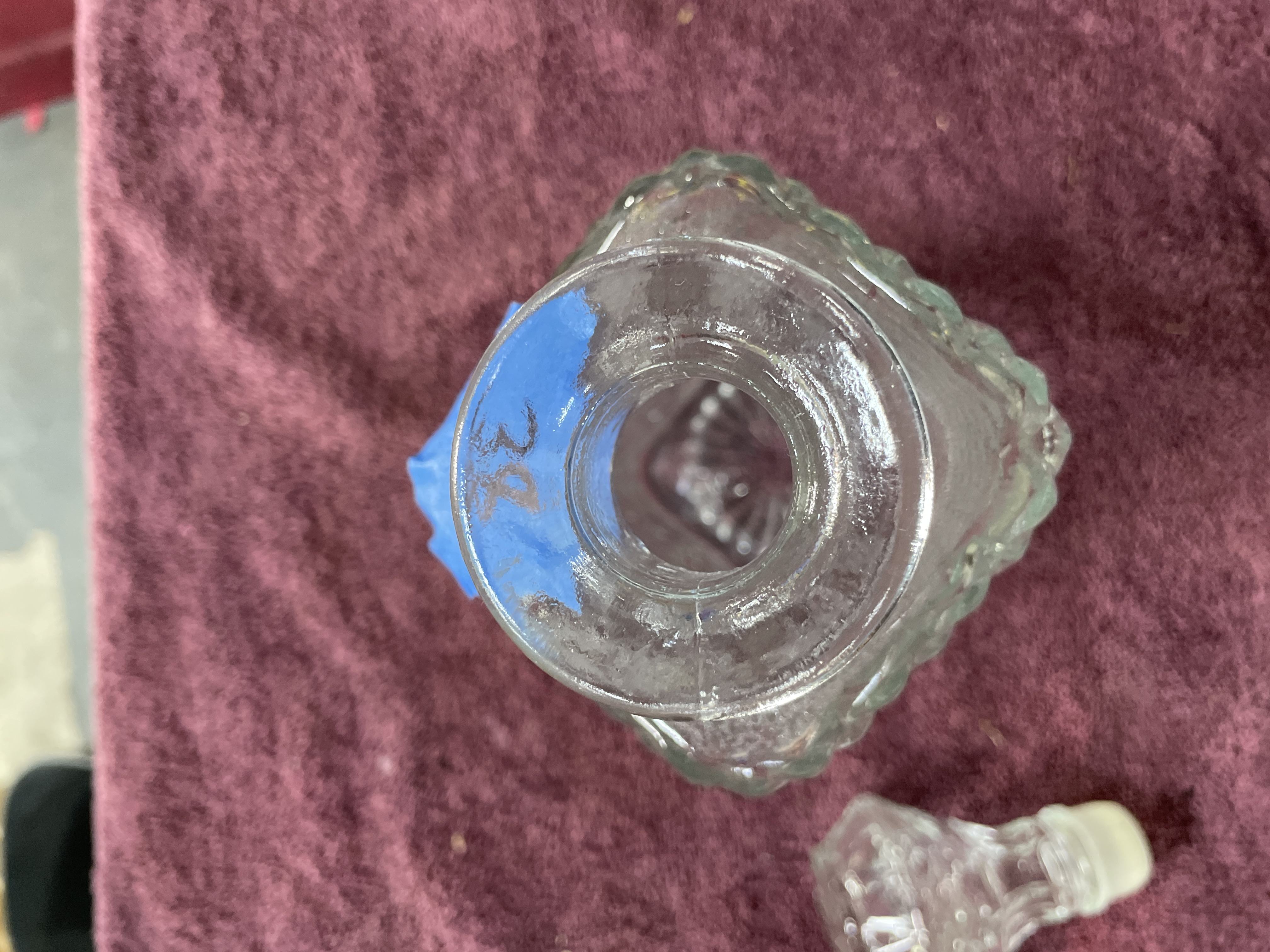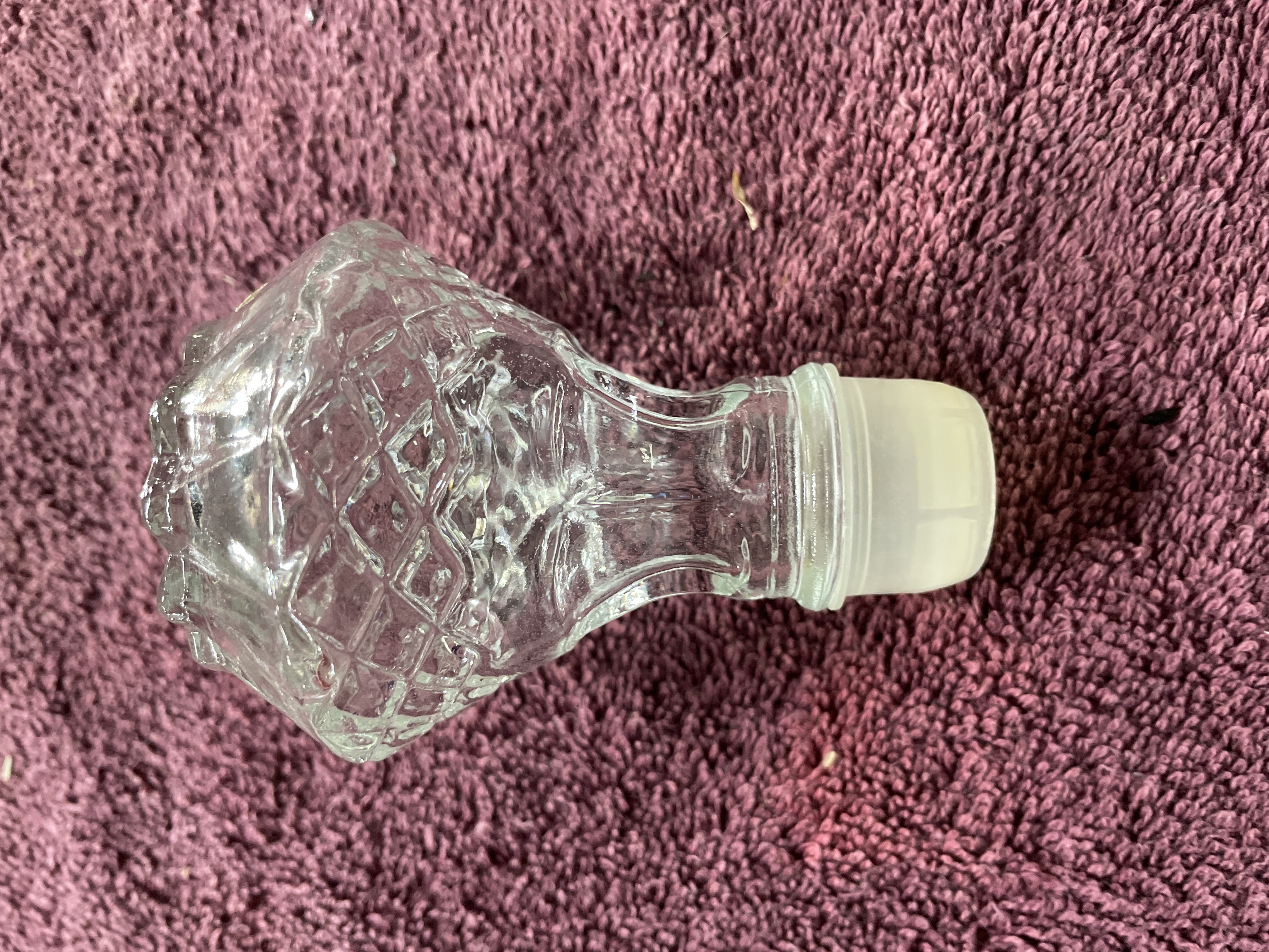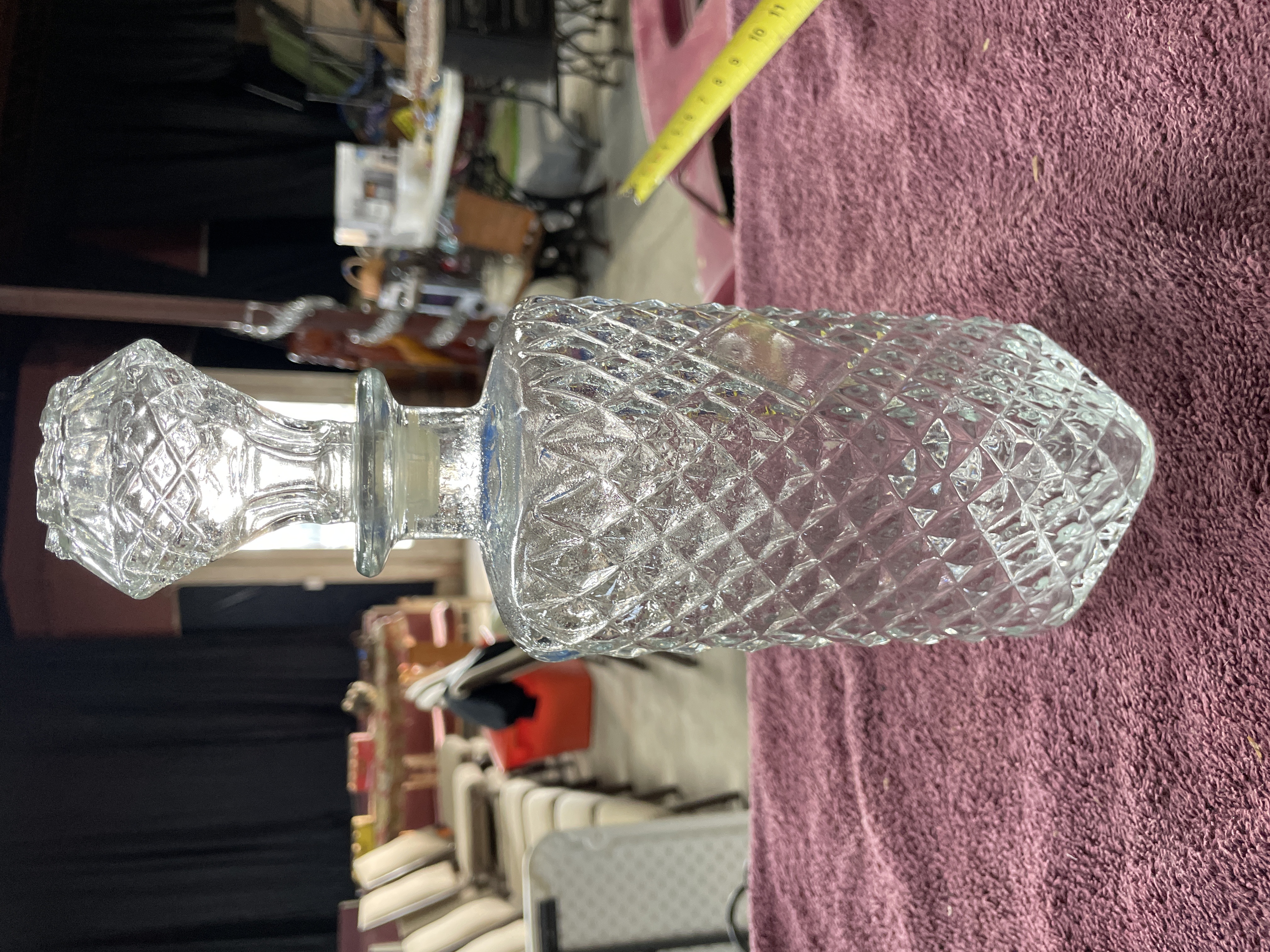 A single lot comprising a molded clear glass decanter and its matching stopper. The decanter features a square base transitioning to a rectangular body, executed in pressed glass, often marketed as crystal. The body is decorated entirely with a diamond quilted or hobnail pattern. The thick base is decorated with a radiating sunburst or fan pattern. The neck is plain and cylindrical. The matching stopper is faceted with the same diamond pattern and includes a modern white plastic or synthetic plug fitted over the glass portion for a tighter seal.