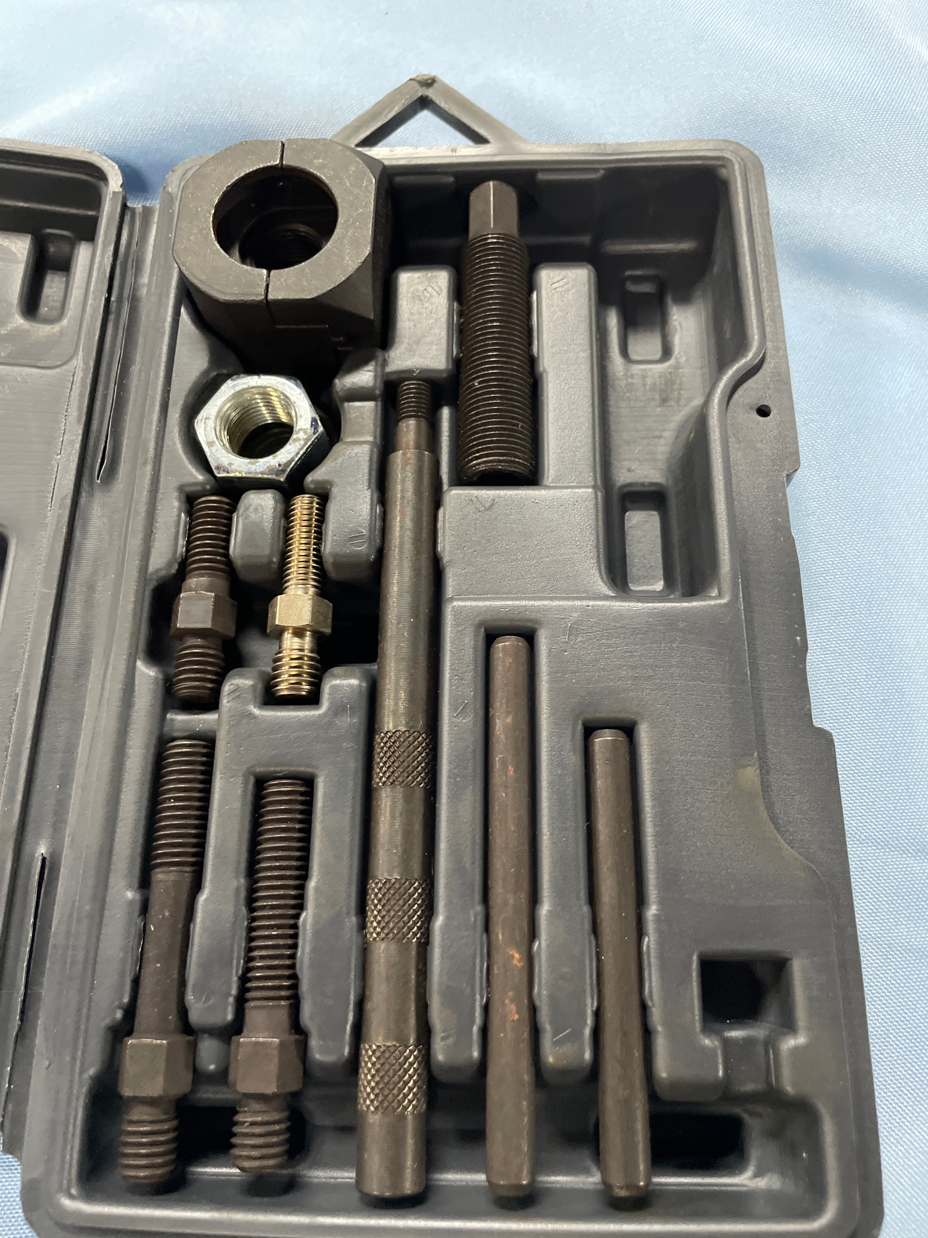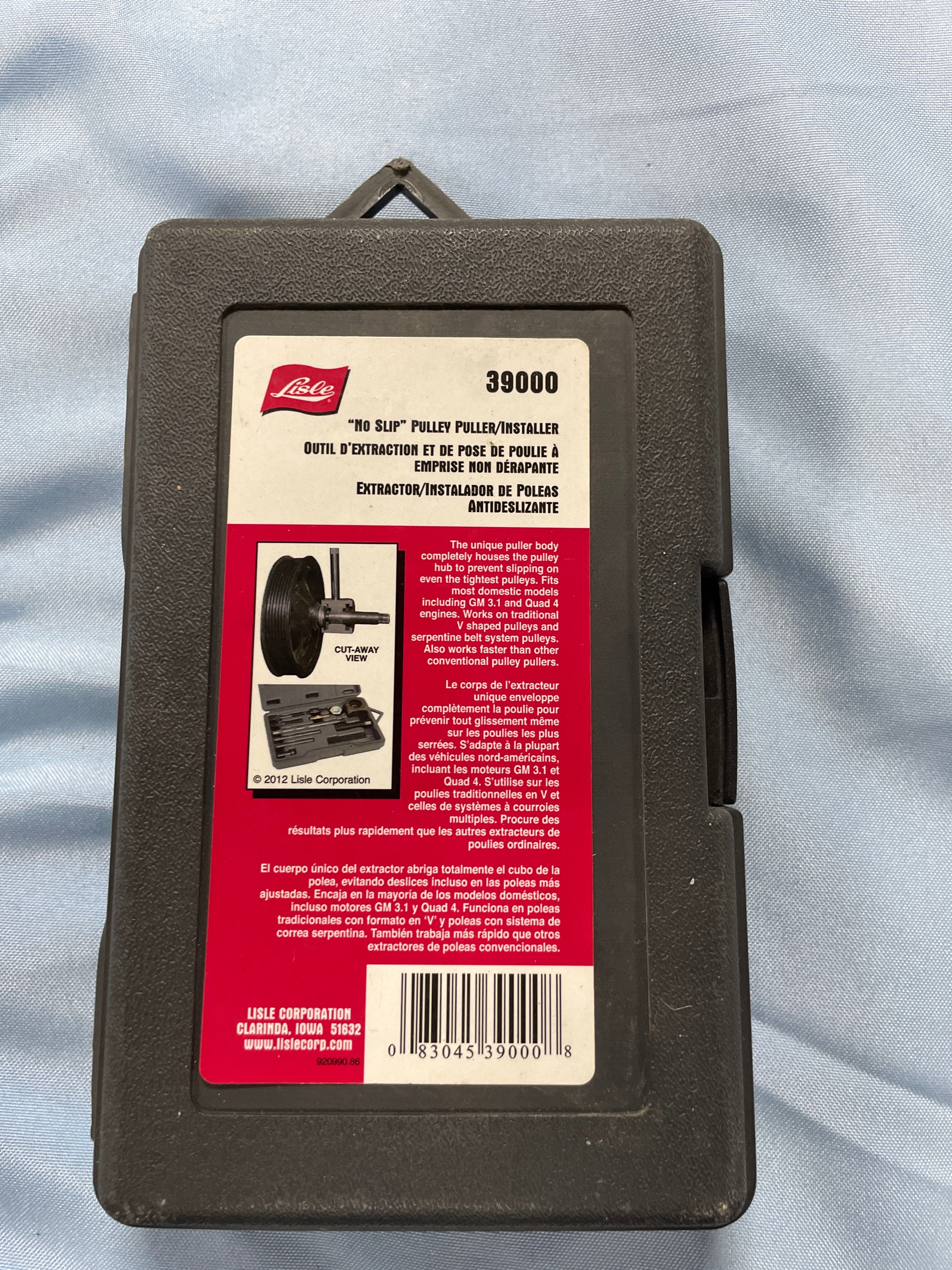 A Lisle No Slip Pulley Puller/Installer tool set, product number 39000, in a black plastic carrying case with dark grey/black metal tools and one silver nut.