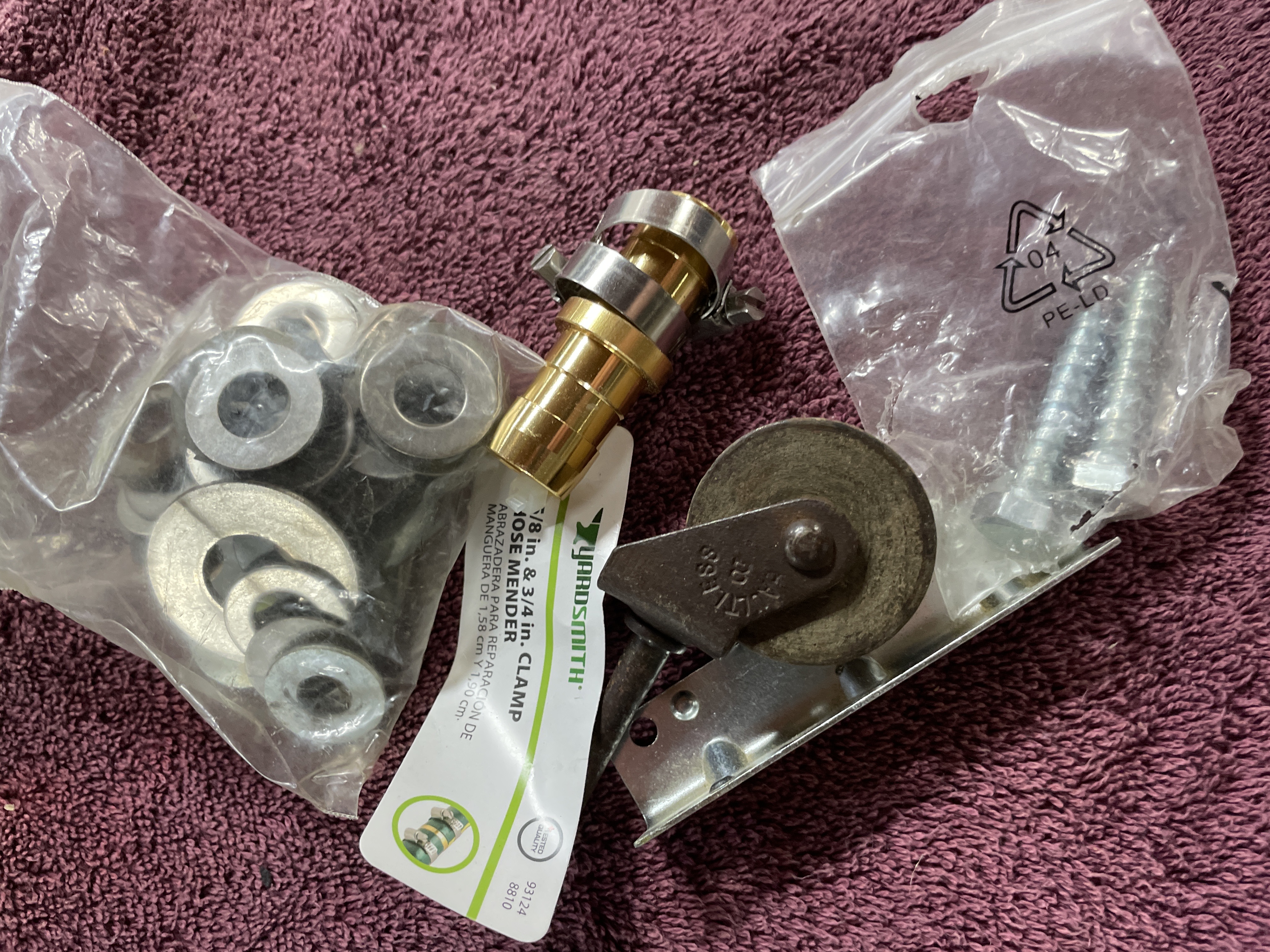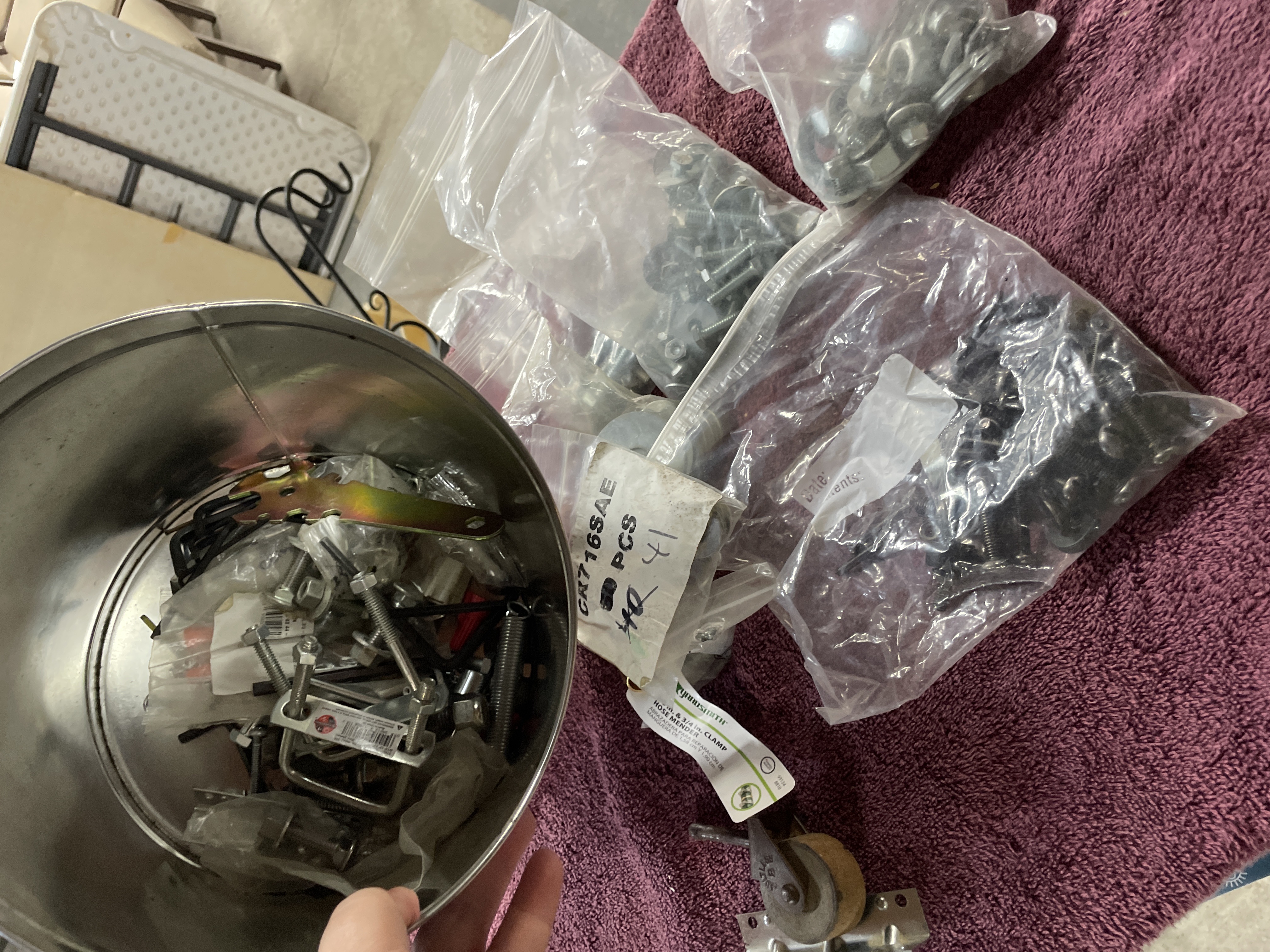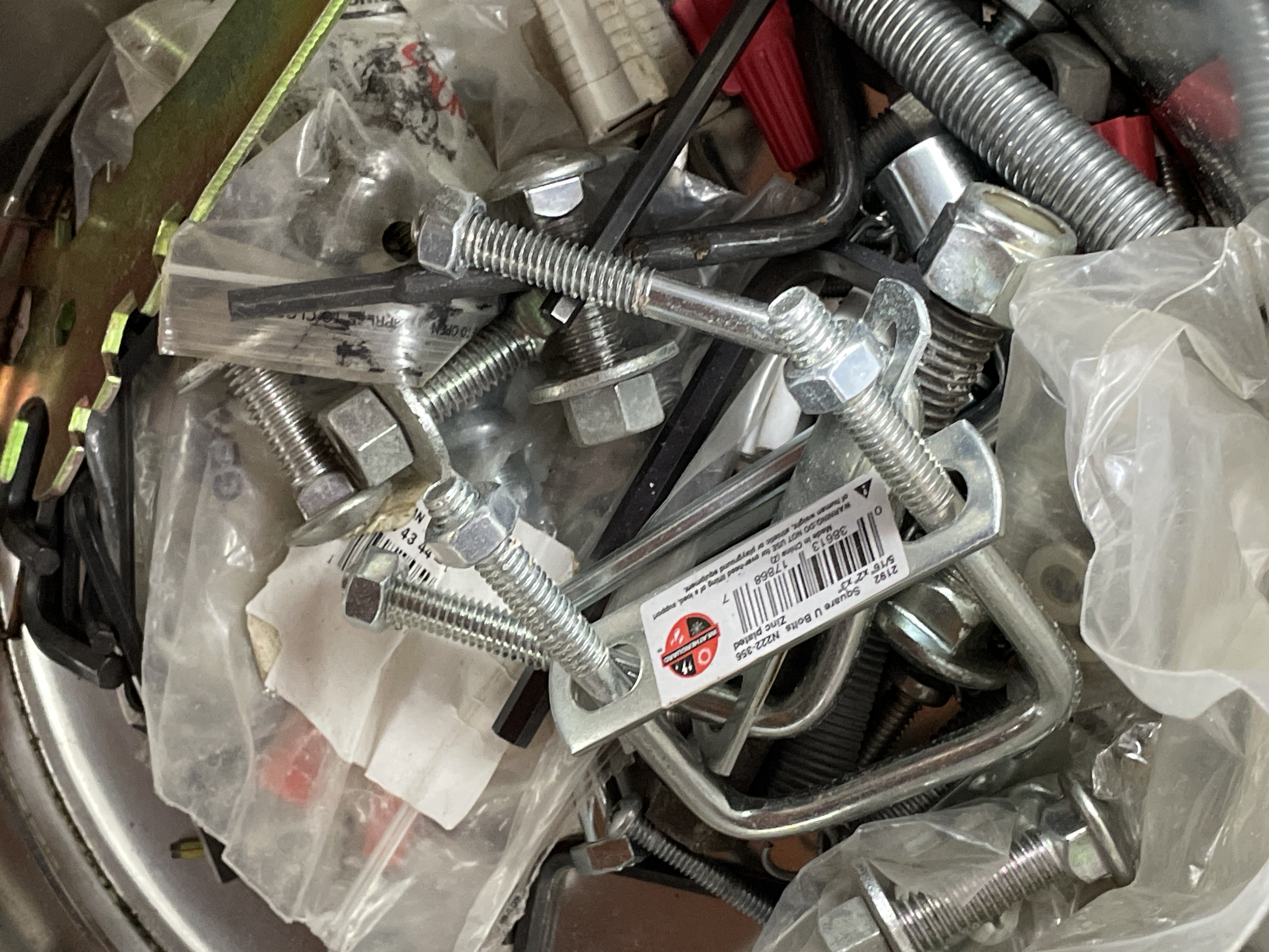 This collection consists of nine distinct lots or assemblies of construction and general-purpose hardware components. The collection includes one large metal storage bucket filled with various fasteners and tools, and eight smaller, separately packaged or assembled items. The hardware is predominantly steel, featuring finishes in bright zinc plating and black oxide. Components include hex bolts, hex nuts, flat washers, lock washers, screws, and U-bolts. Additional items include plastic wire connectors, a yellow-plated metal bracket tool, and a metal bracket assembly fitted with a wood and metal caster wheel. Specific packaged items include a YardSmith 1/8 in & 3/4 in. HOSE MENDER CLAMP kit. One fastener bag bears a handwritten label reading CK/716SAE 42 PCS 41. Another component features a retail label referencing a Square Bolt.