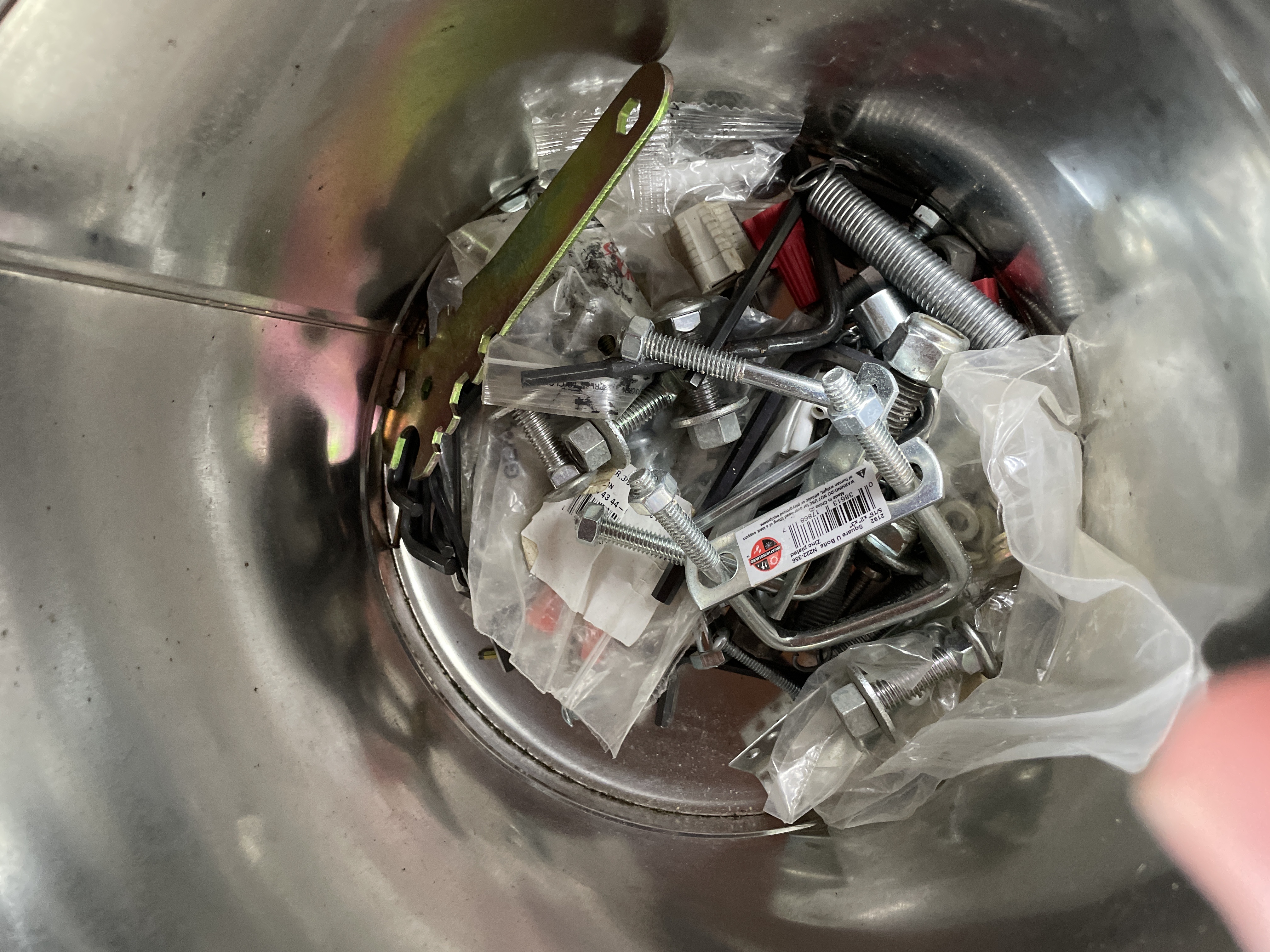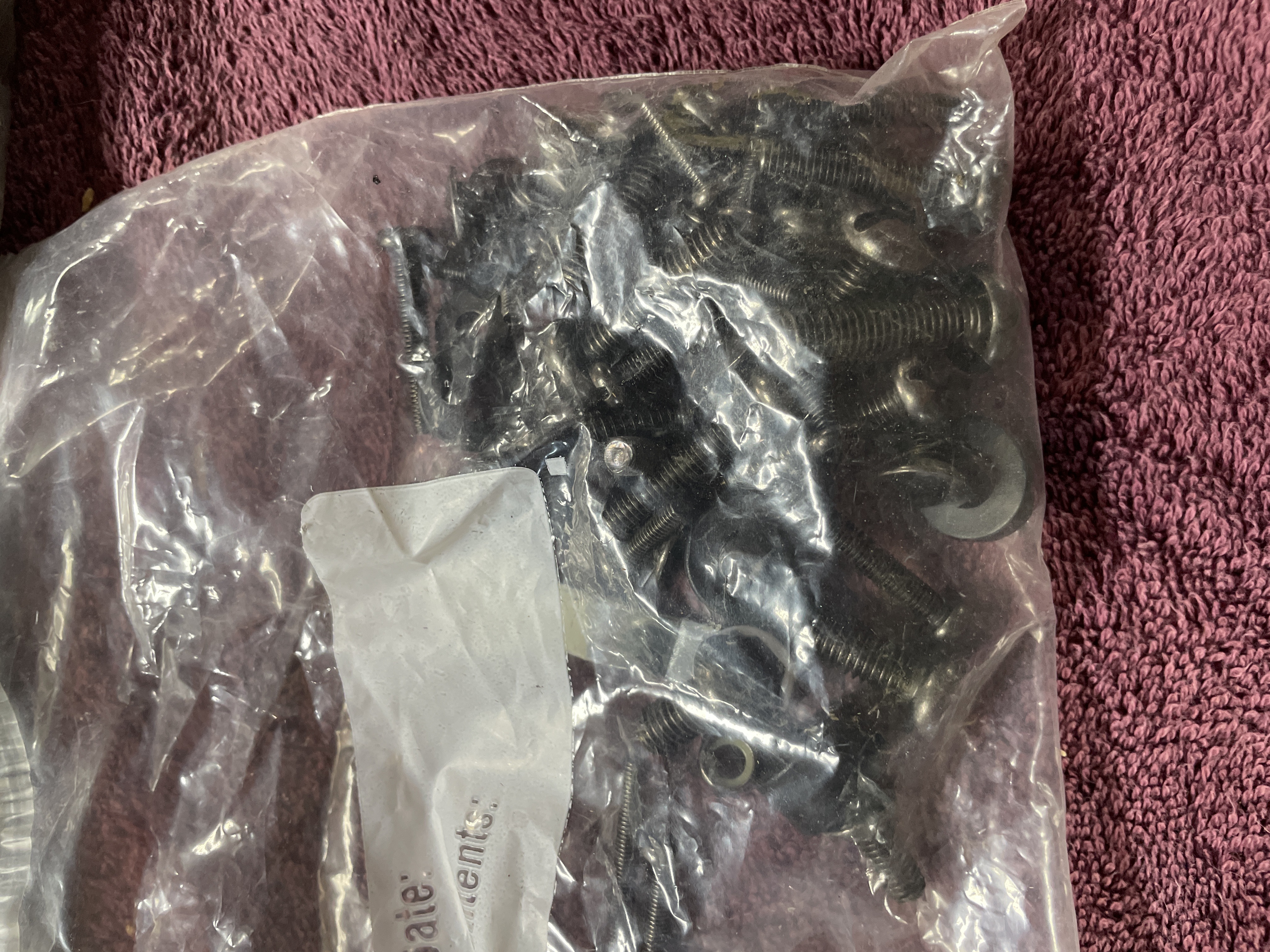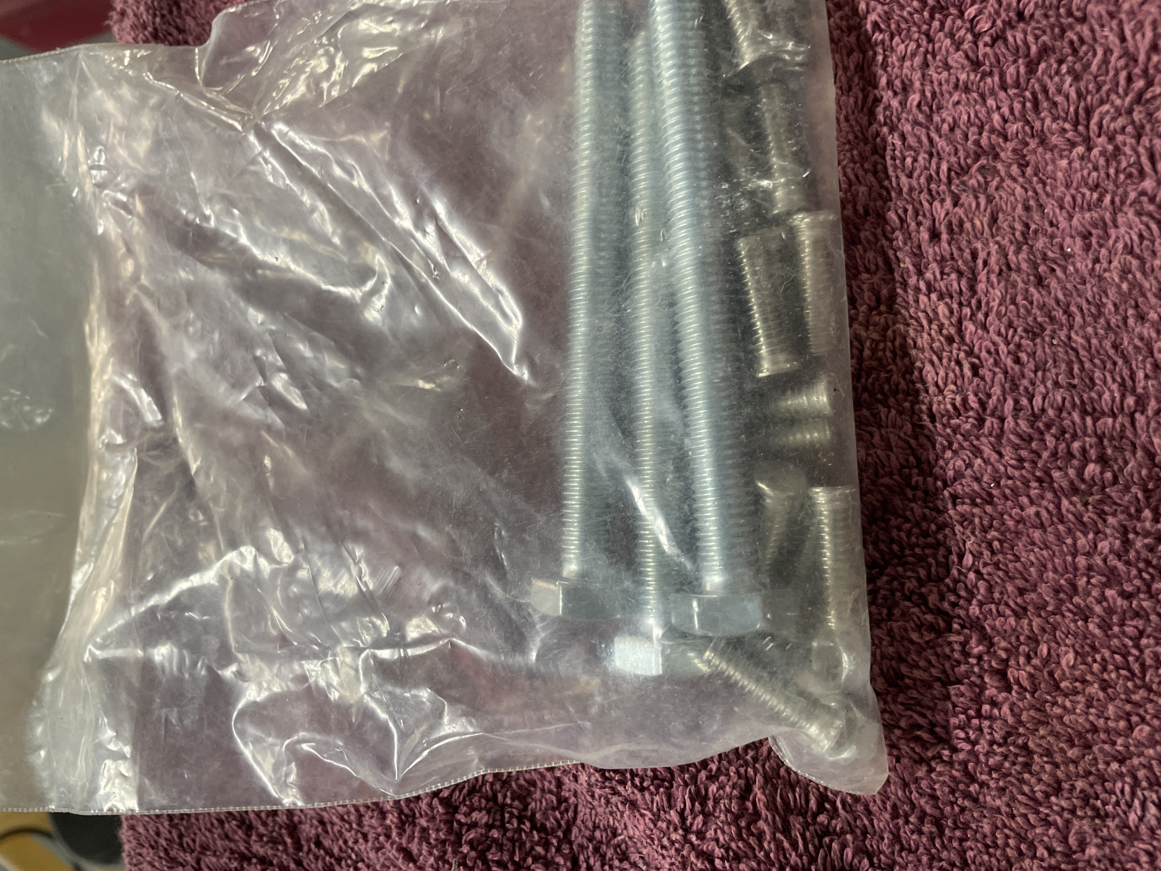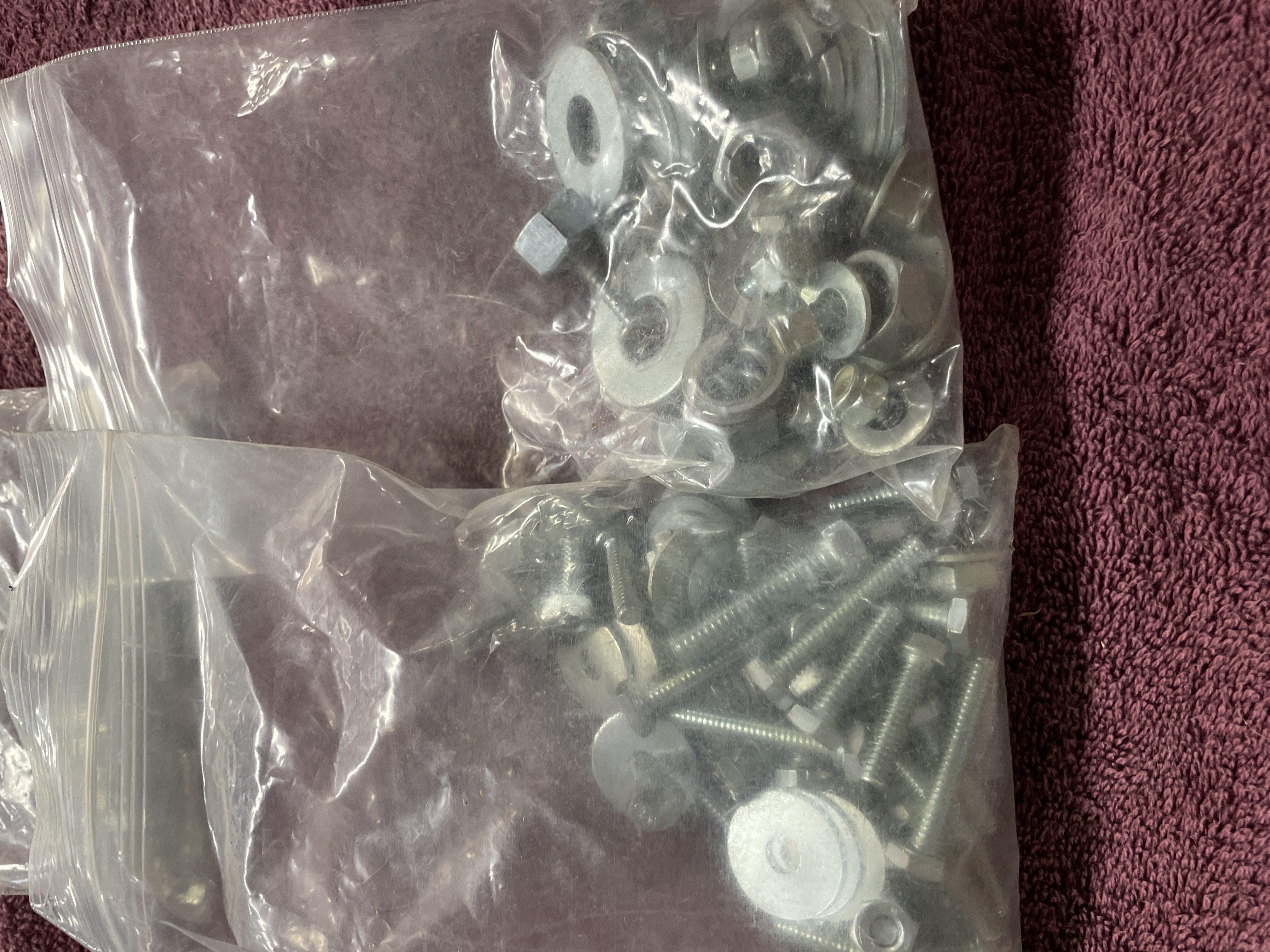 This collection consists of nine distinct lots or assemblies of construction and general-purpose hardware components. The collection includes one large metal storage bucket filled with various fasteners and tools, and eight smaller, separately packaged or assembled items. The hardware is predominantly steel, featuring finishes in bright zinc plating and black oxide. Components include hex bolts, hex nuts, flat washers, lock washers, screws, and U-bolts. Additional items include plastic wire connectors, a yellow-plated metal bracket tool, and a metal bracket assembly fitted with a wood and metal caster wheel. Specific packaged items include a YardSmith 1/8 in & 3/4 in. HOSE MENDER CLAMP kit. One fastener bag bears a handwritten label reading CK/716SAE 42 PCS 41. Another component features a retail label referencing a Square Bolt.