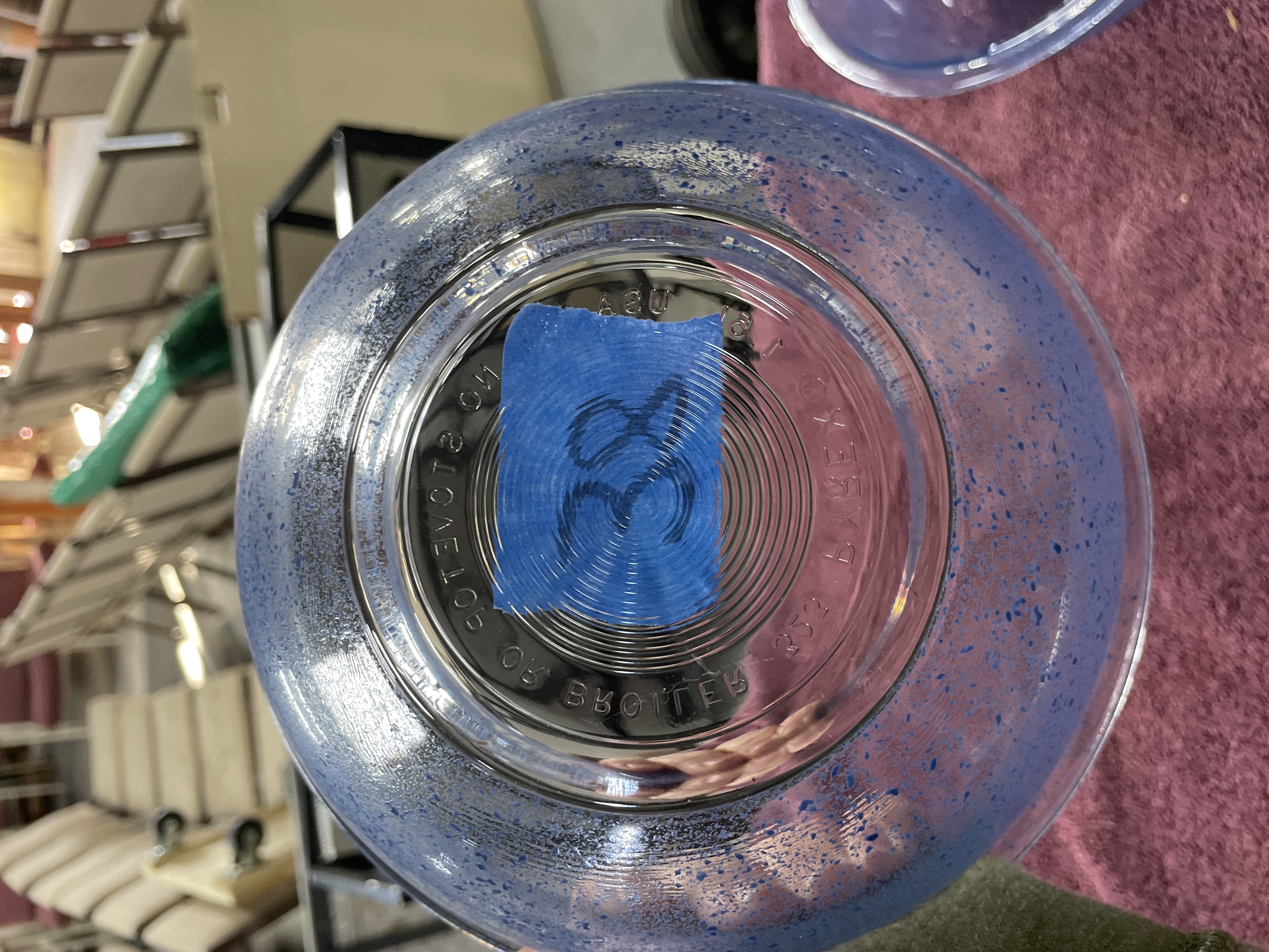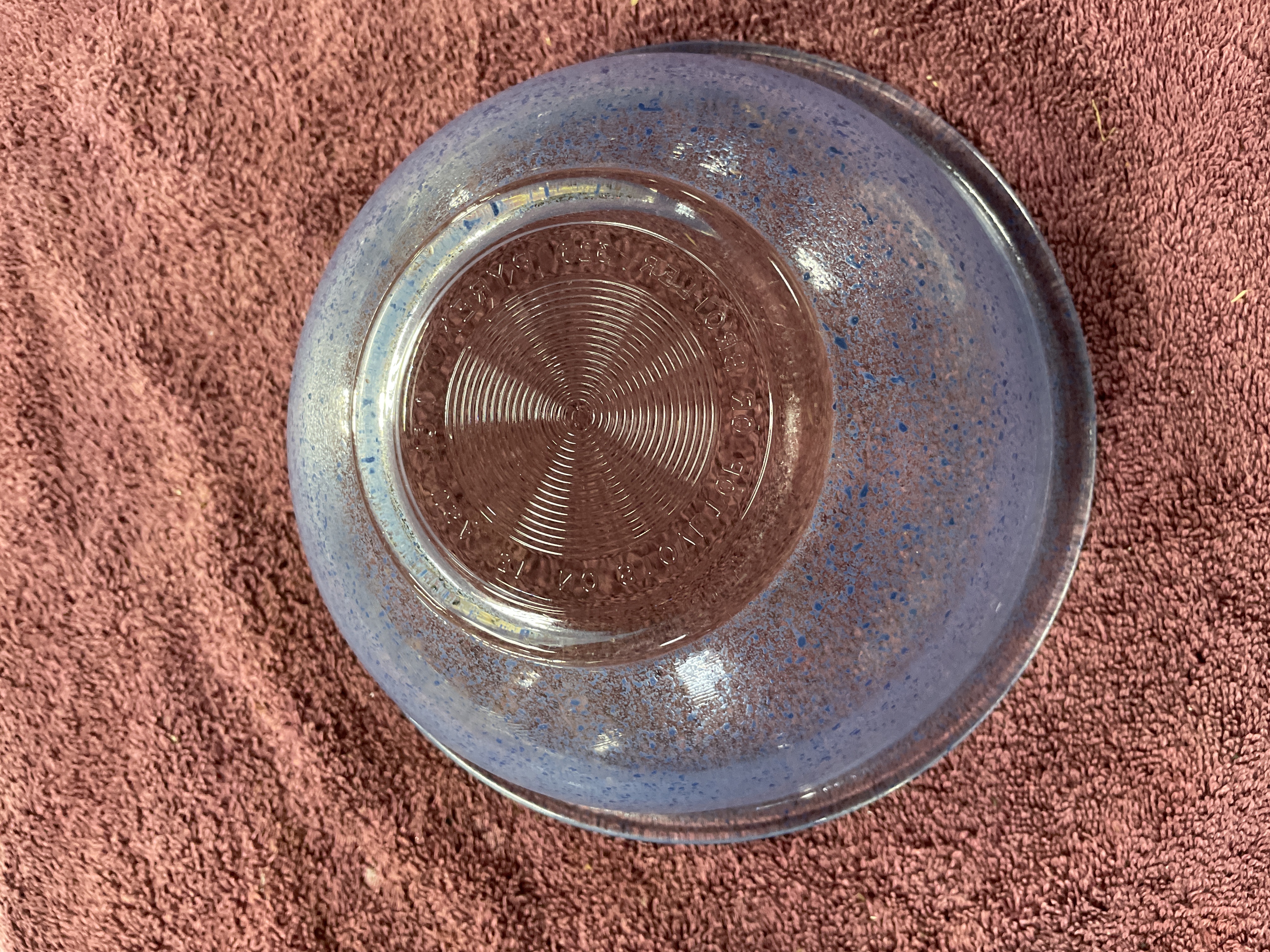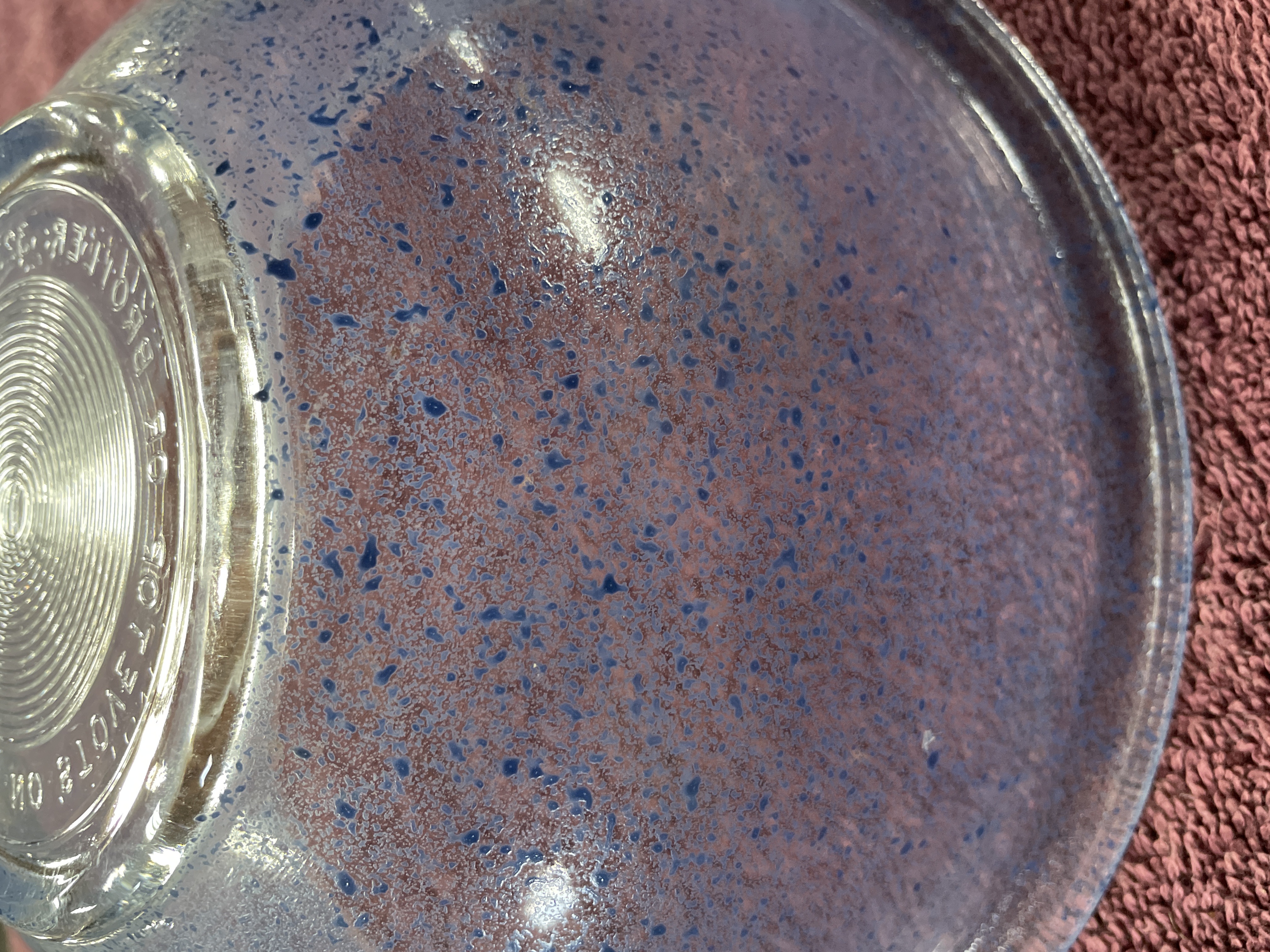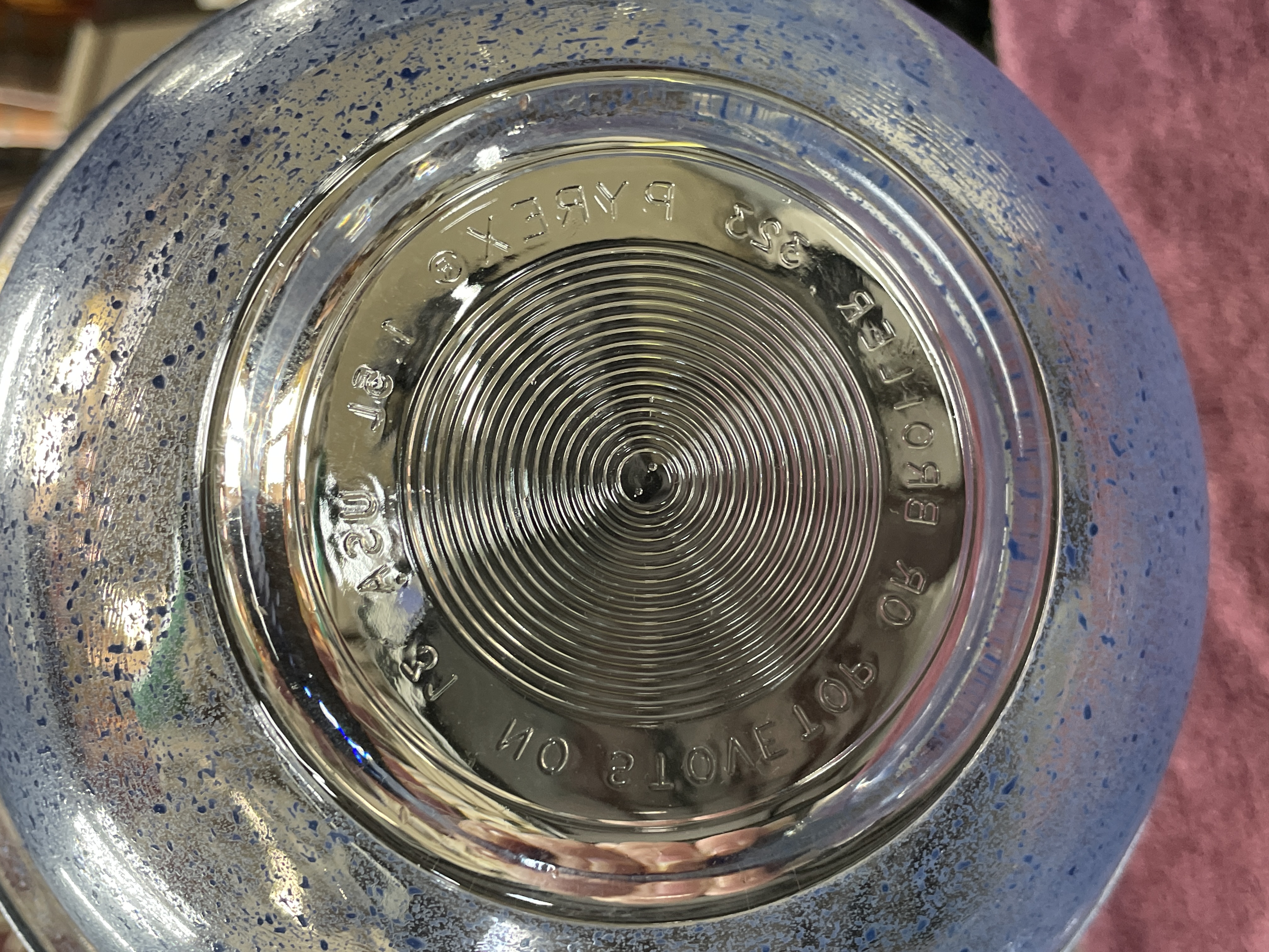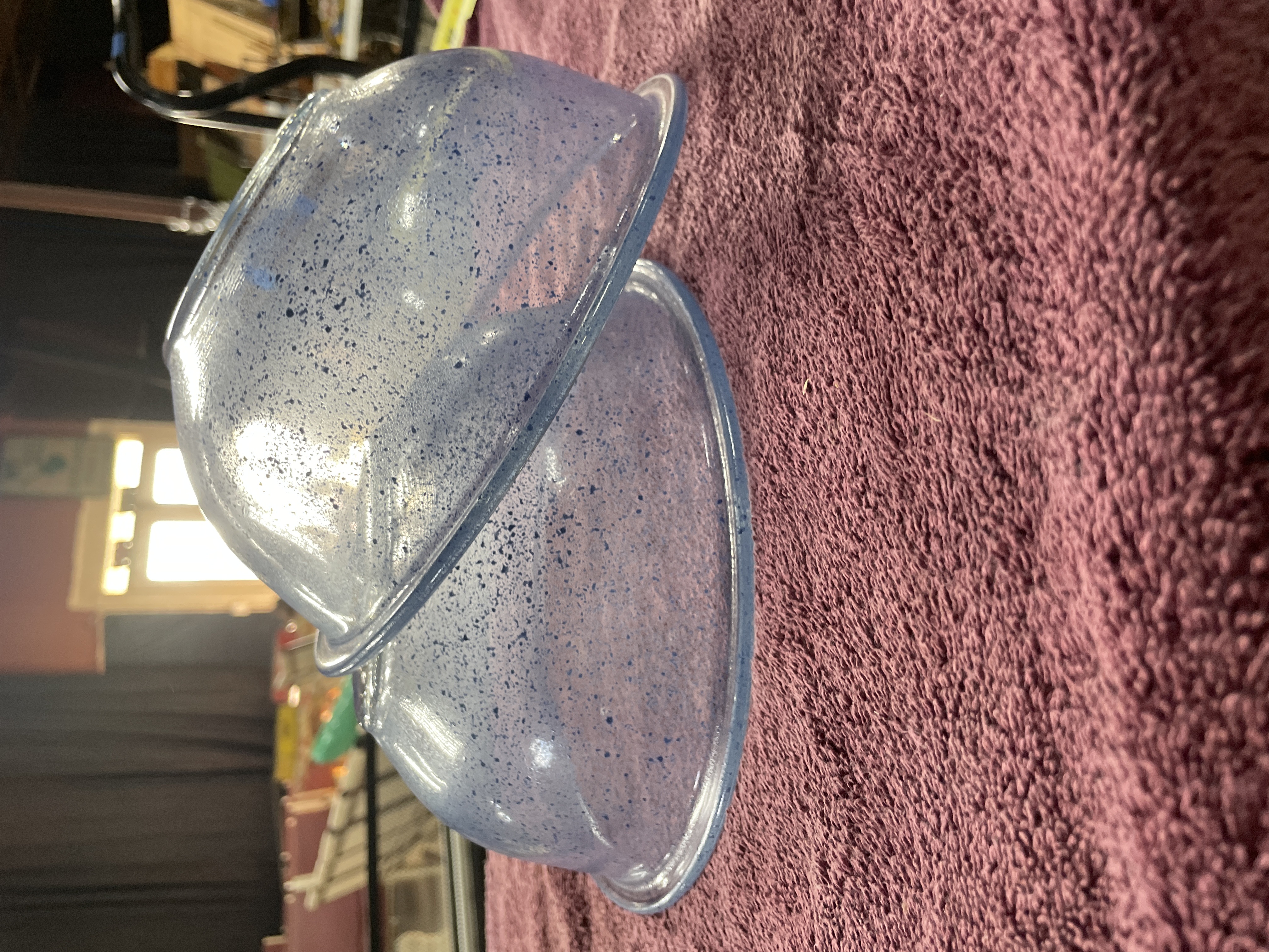 A pair of vintage Pyrex mixing bowls constructed from heat-resistant glass. The bowls feature a rounded form and are decorated with the Speckle Confetti pattern, characterized by a spatterware style enamel finish of dark blue spots over a translucent light blue body. The bowls are of differing sizes, consistent with a nested set. The undersides of the bowls feature a deeply molded pattern of concentric rings. Clear embossed manufacturer text is visible on the base, including the word PYREX, USA, a partial model number (likely from the 400 series), and a cautionary message stating, NO FOR STOVETOP OR BROILER. One base has a small rectangular piece of blue masking tape applied to the center, handwritten with the number 28.