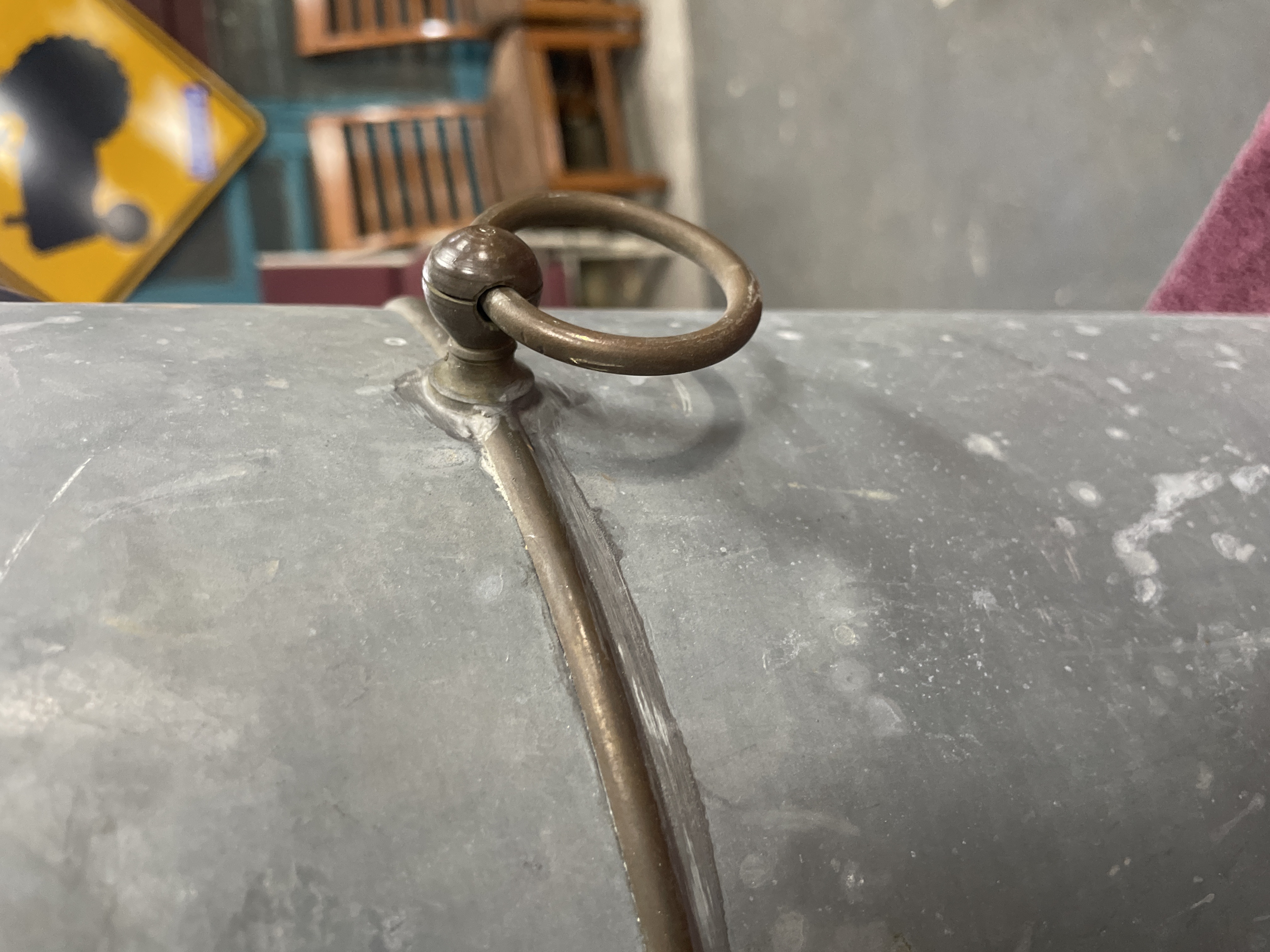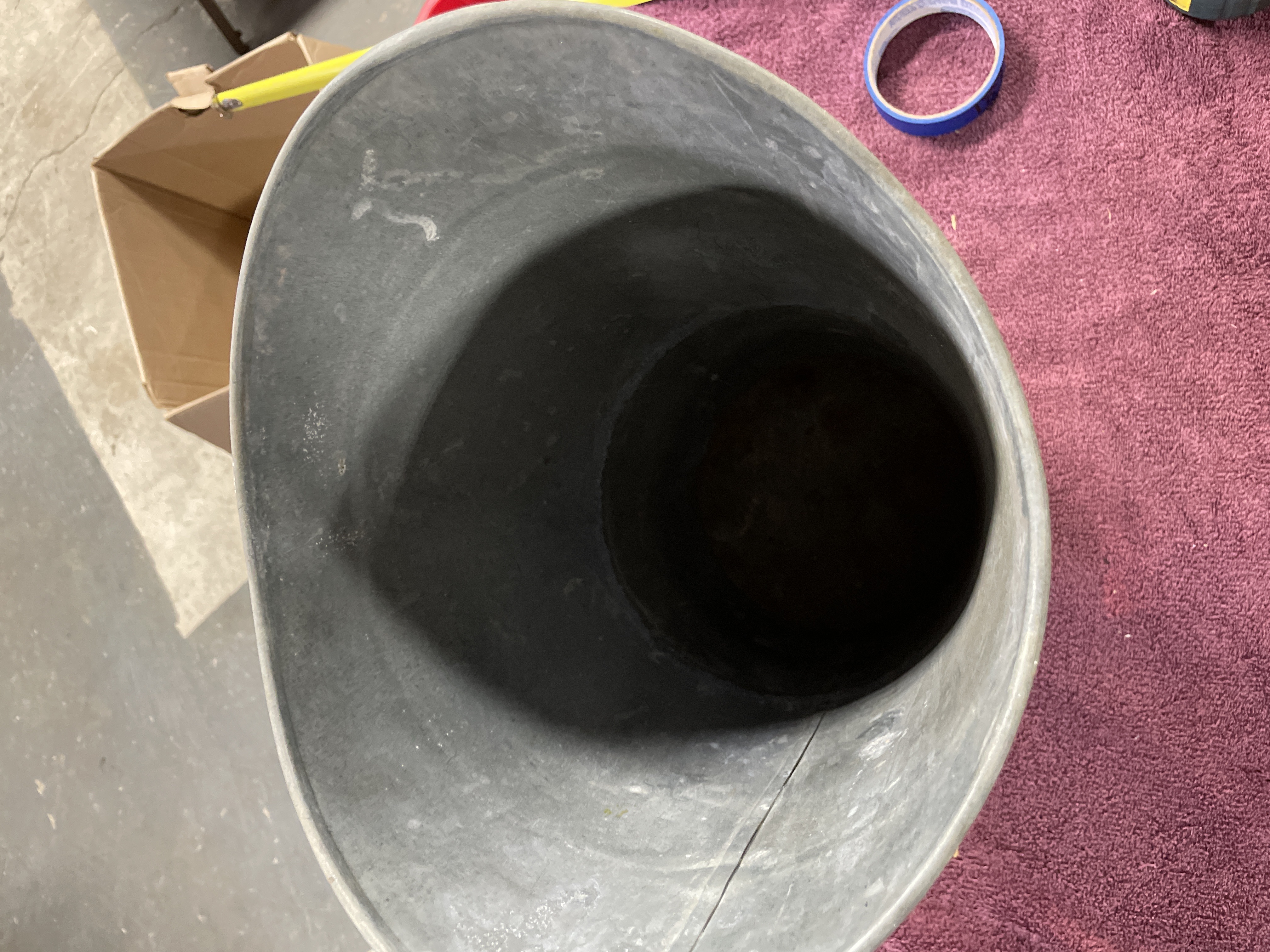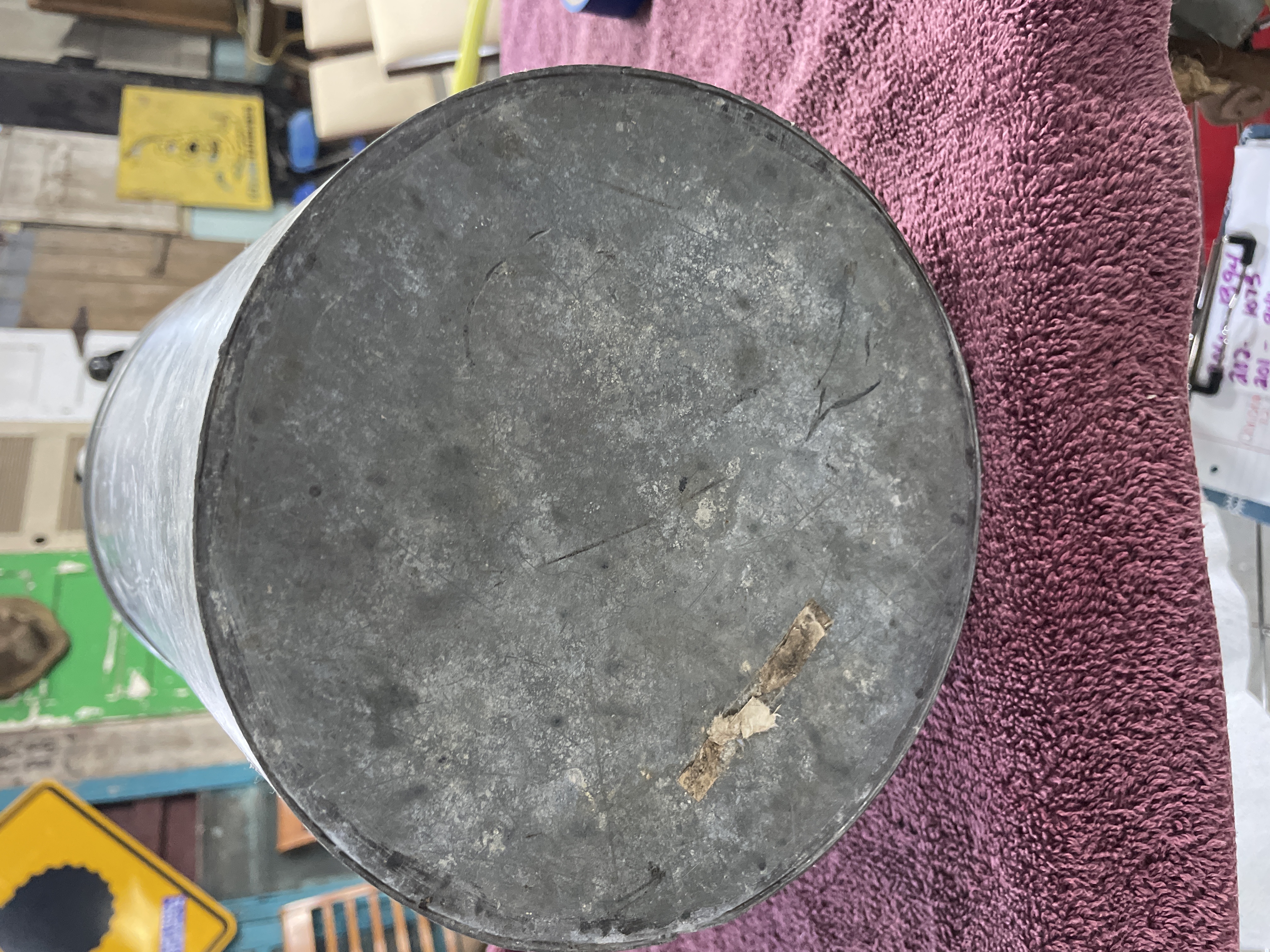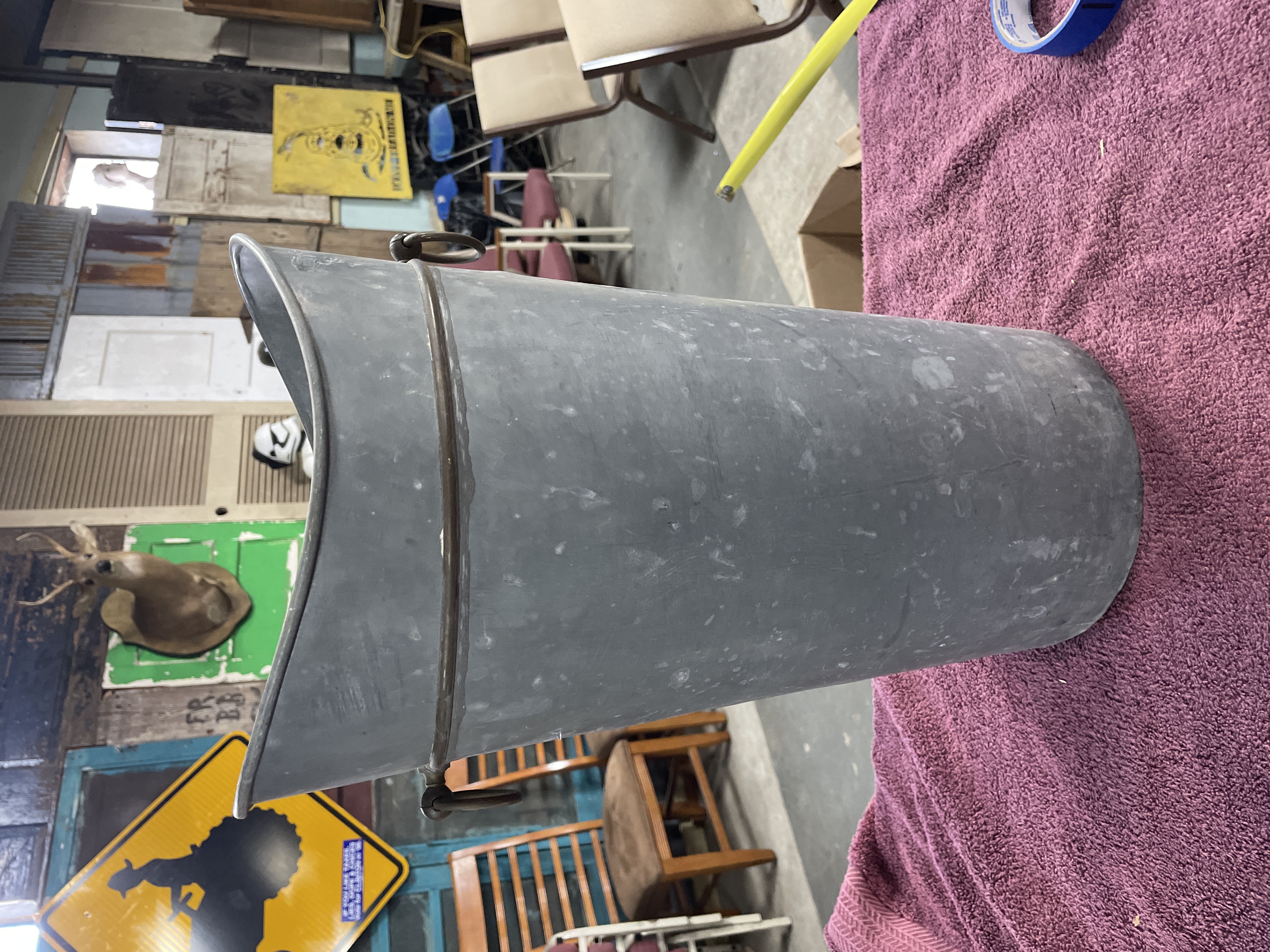 A single utility bucket constructed of galvanized metal, likely dating to the mid-20th century. The tapered form features an oblong or slightly scooped opening, stylistically resembling a coal scuttle or floor planter. A fixed reinforcing band of patinated brass or bronze encircles the upper perimeter, securing two decorative metal ring handles attached via spherical mounts. The circular base retains the remnants of an illegible paper label, but no other manufacturer markings are visible.