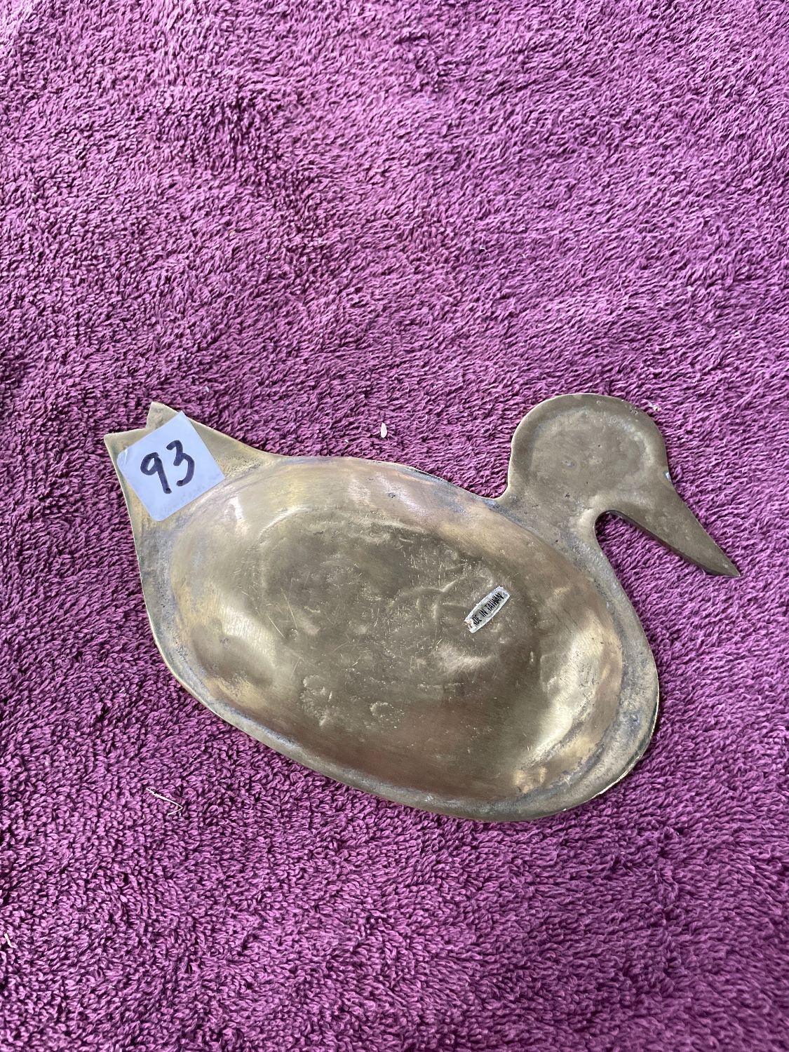 A pair of cast brass decorative dishes, commonly marketed as vide poche or trinket trays. Each dish is shaped like a swimming duck, featuring a shallow, elongated bowl forming the body. The design includes a defined head and beak, and stylized wing and feather details shallowly engraved into the interior surface of the bowl. One item retains an adhesive paper label marked "93" on the tail section.