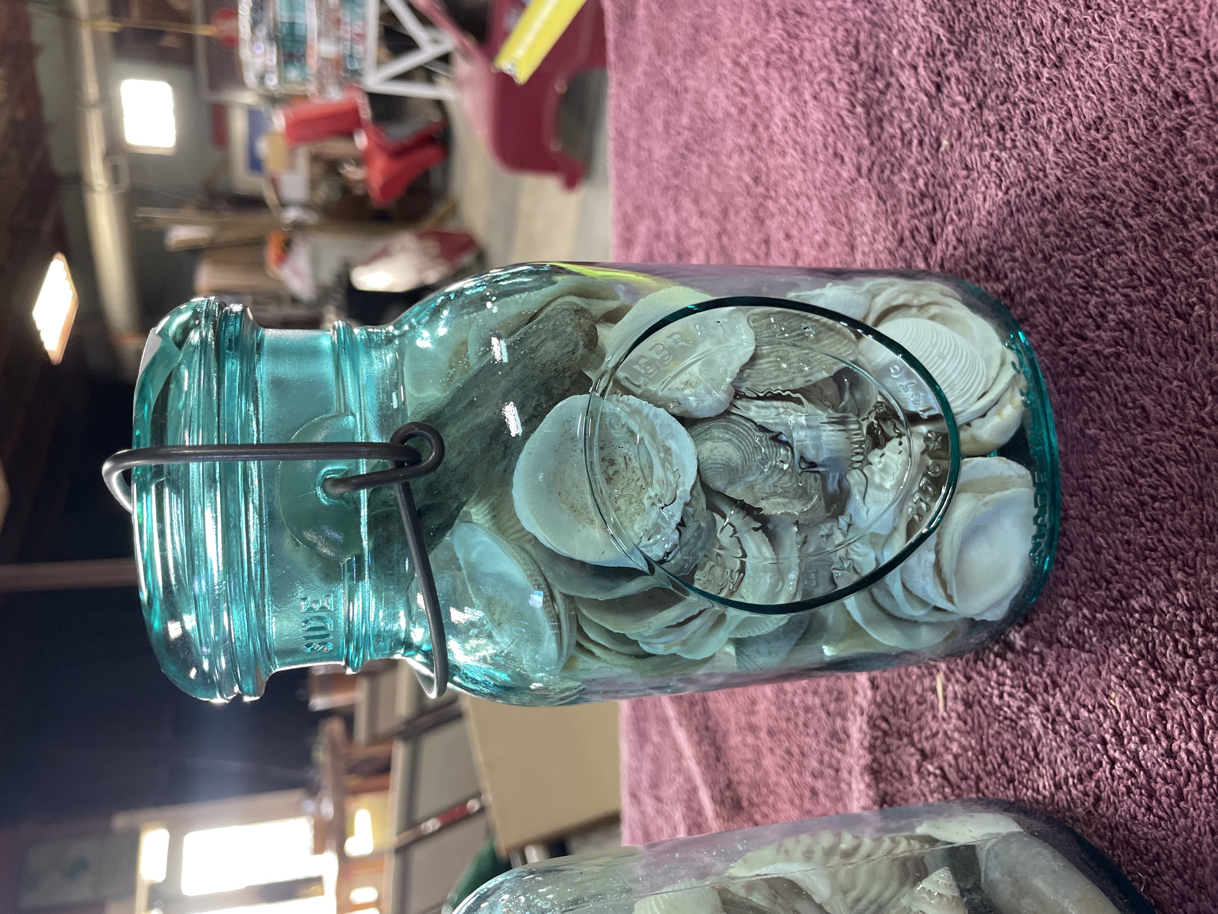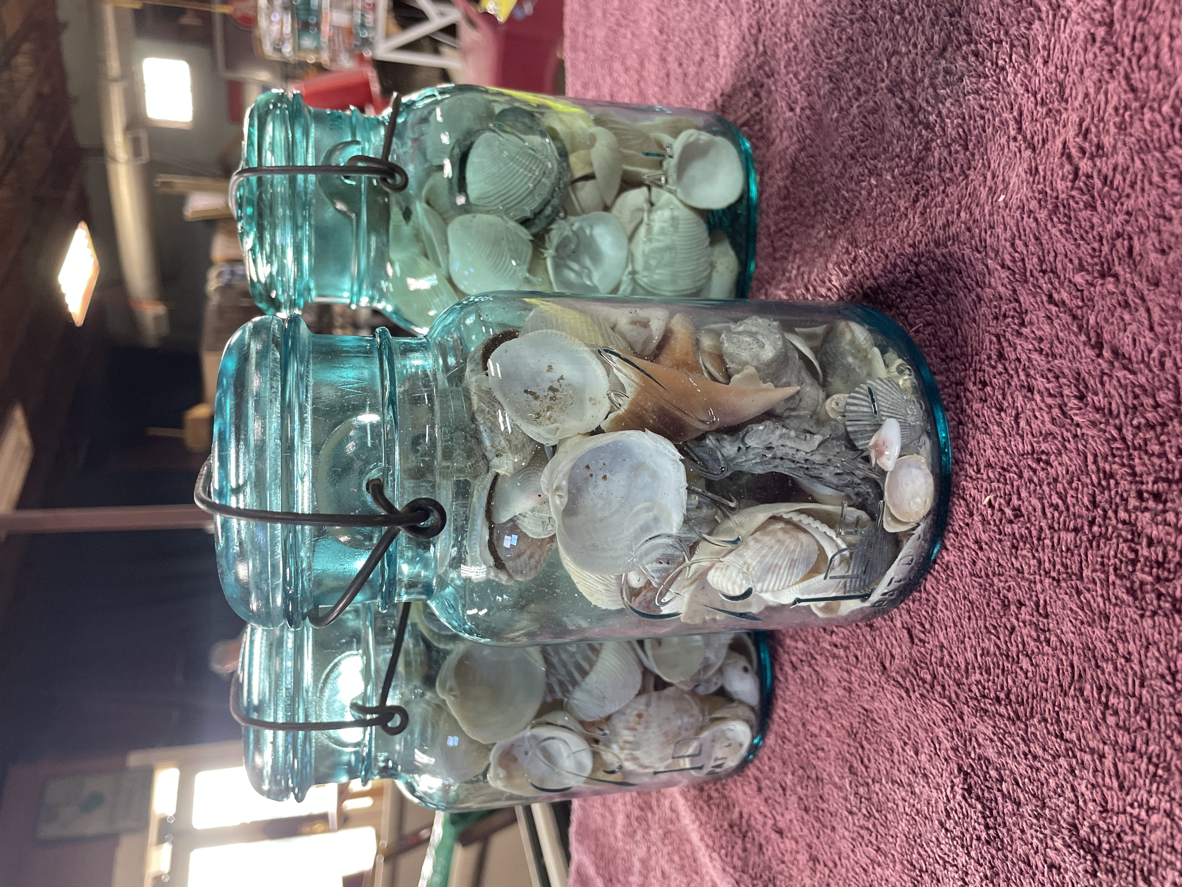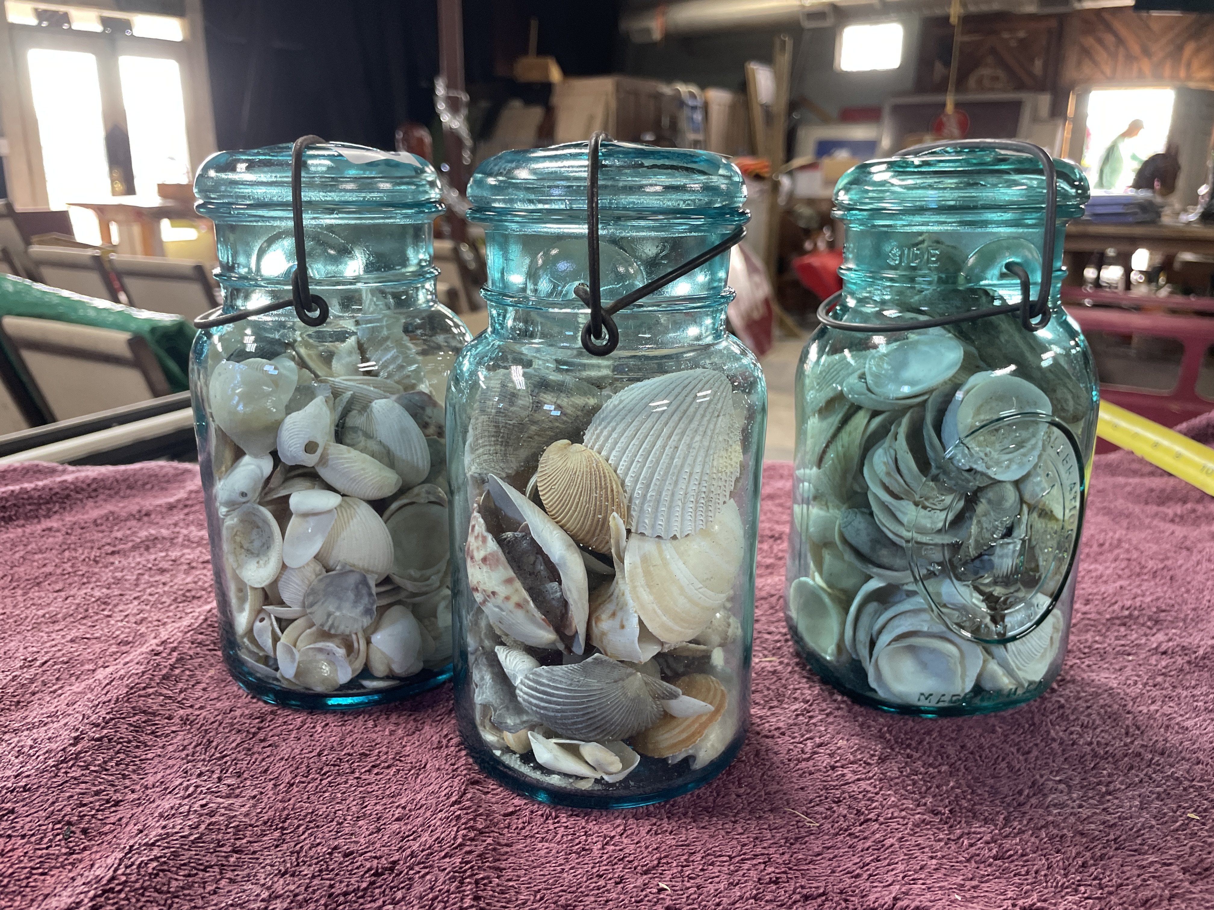 A Trio of Vintage Aqua-Blue Glass Canning Jars Filled with Seashells