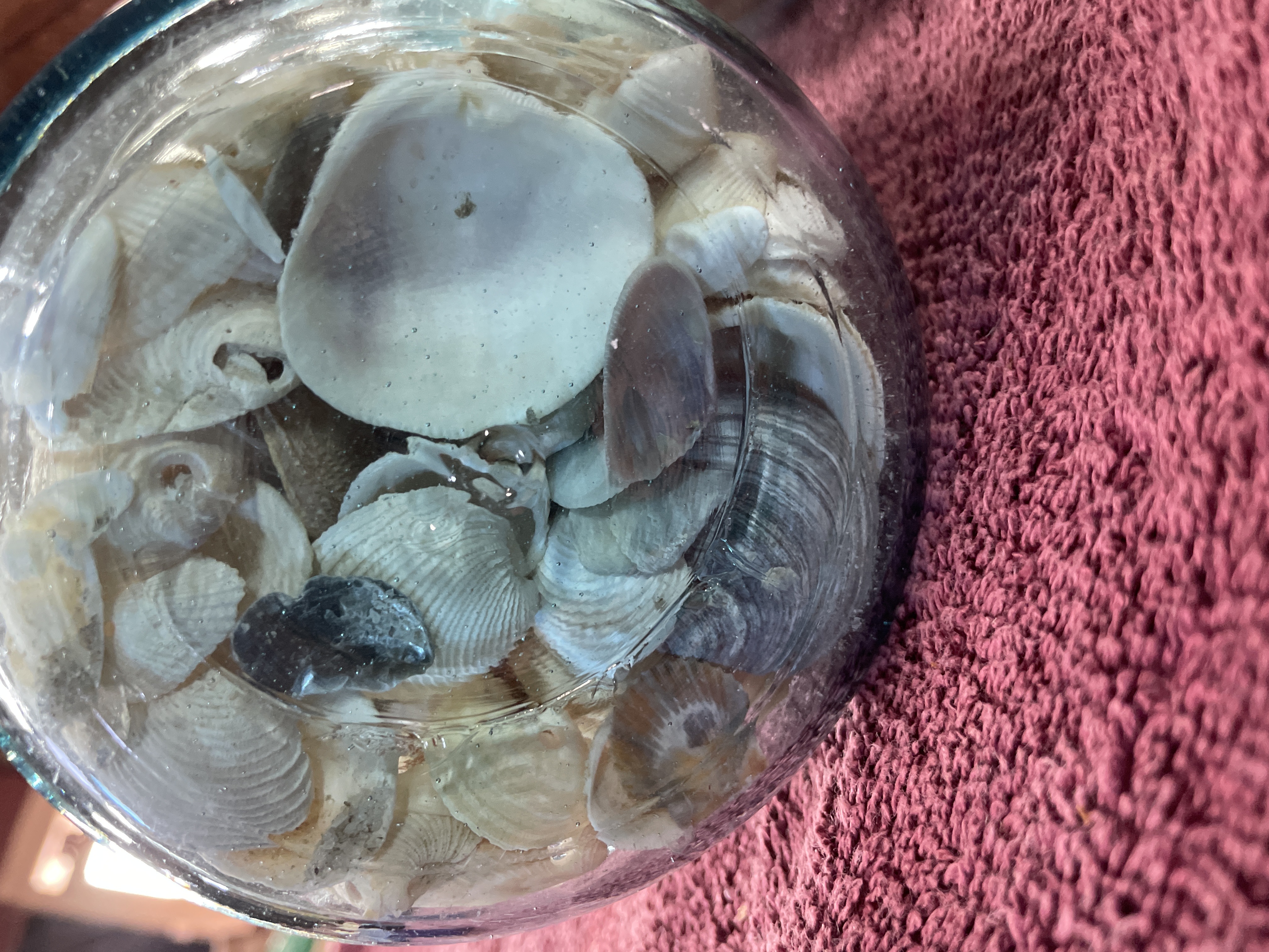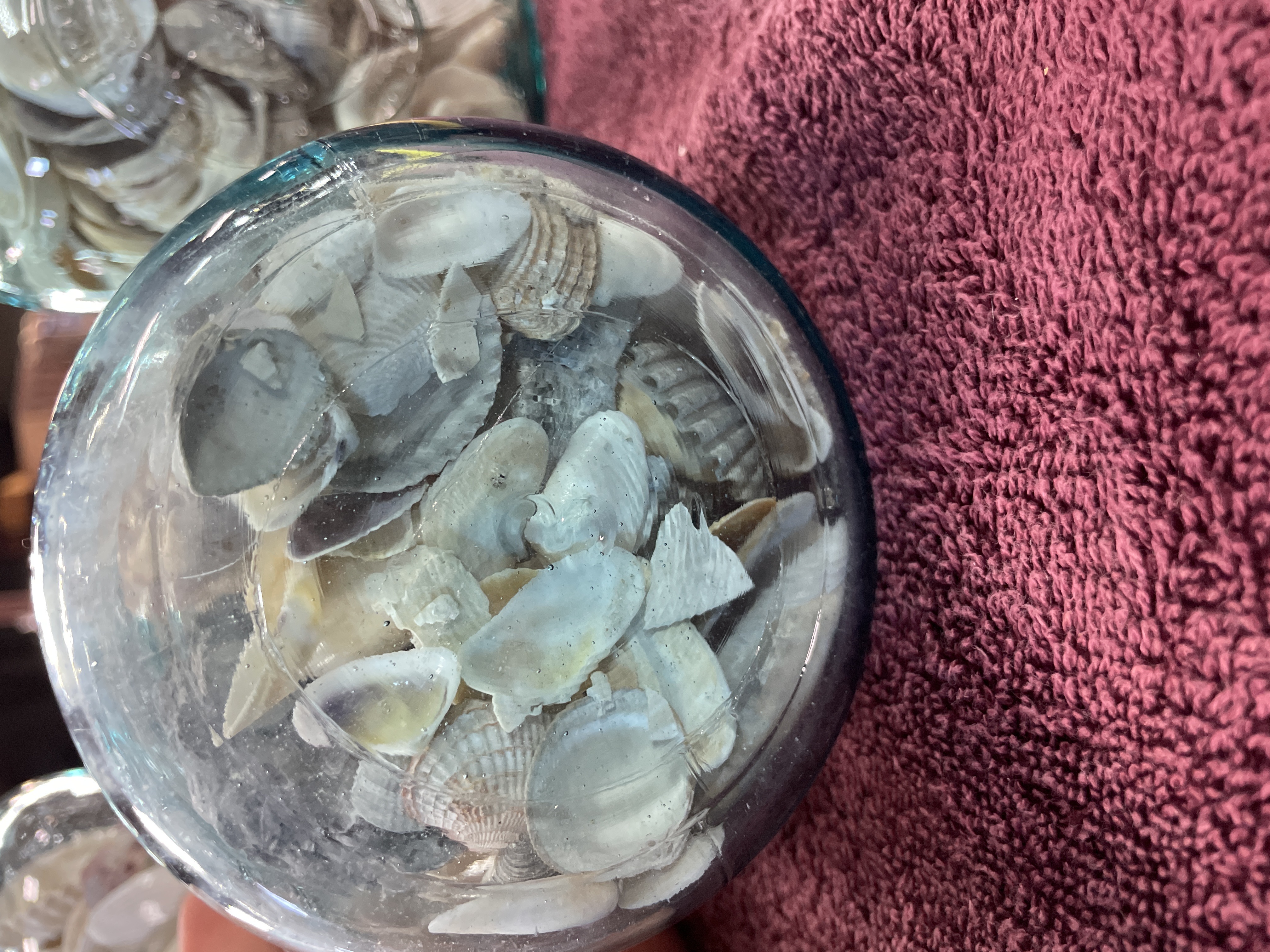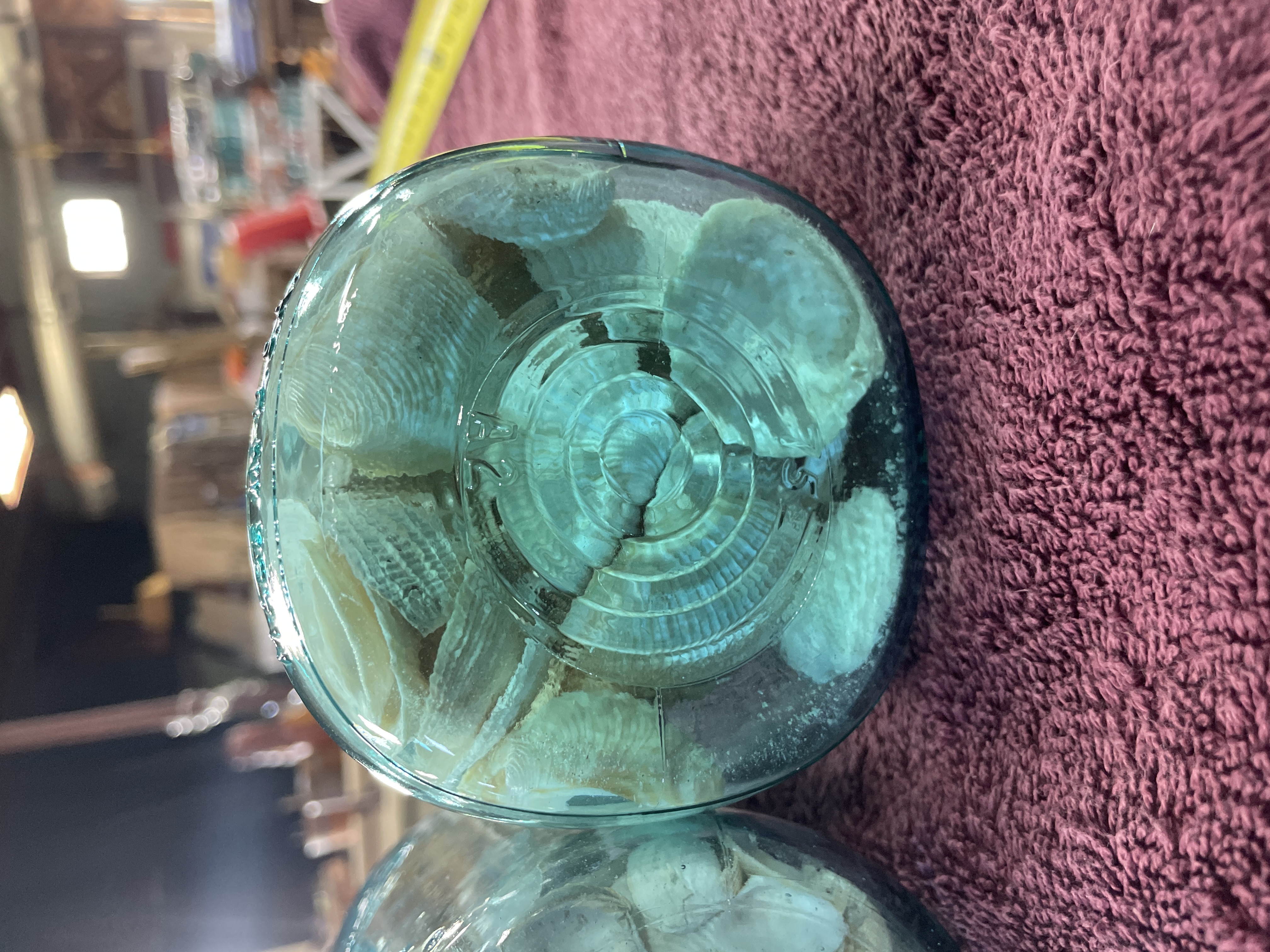 A Trio of Vintage Aqua-Blue Glass Canning Jars Filled with Seashells