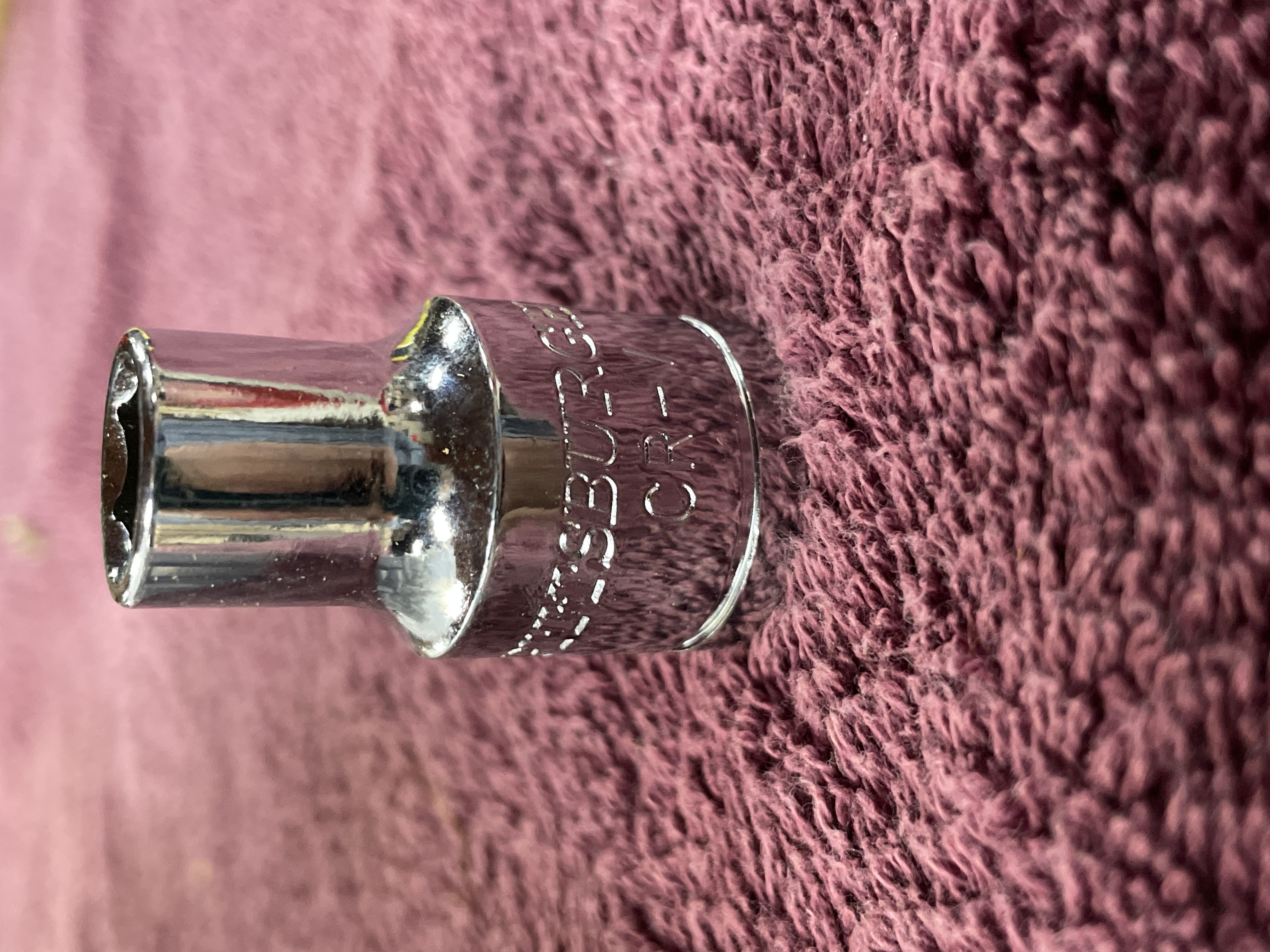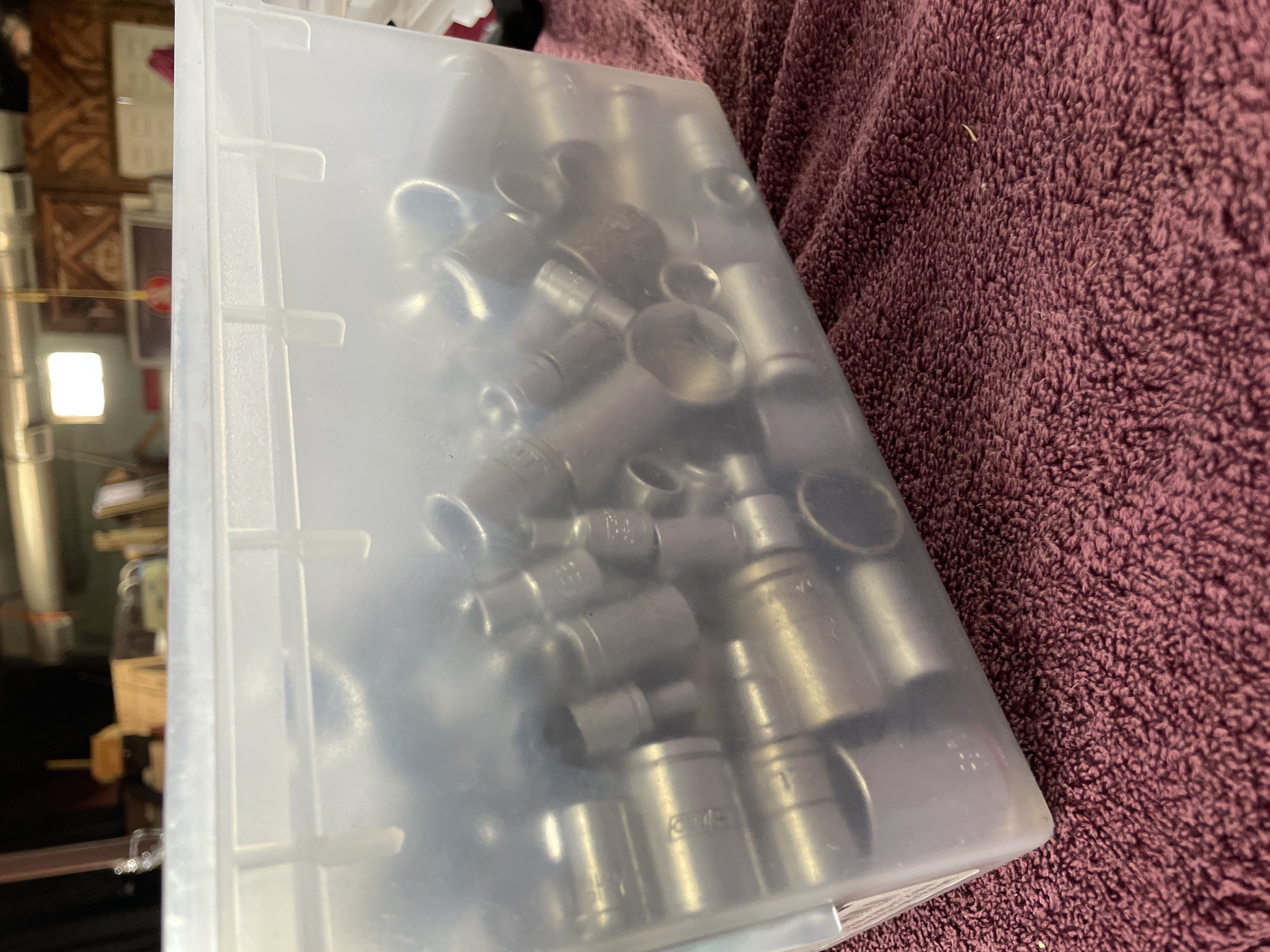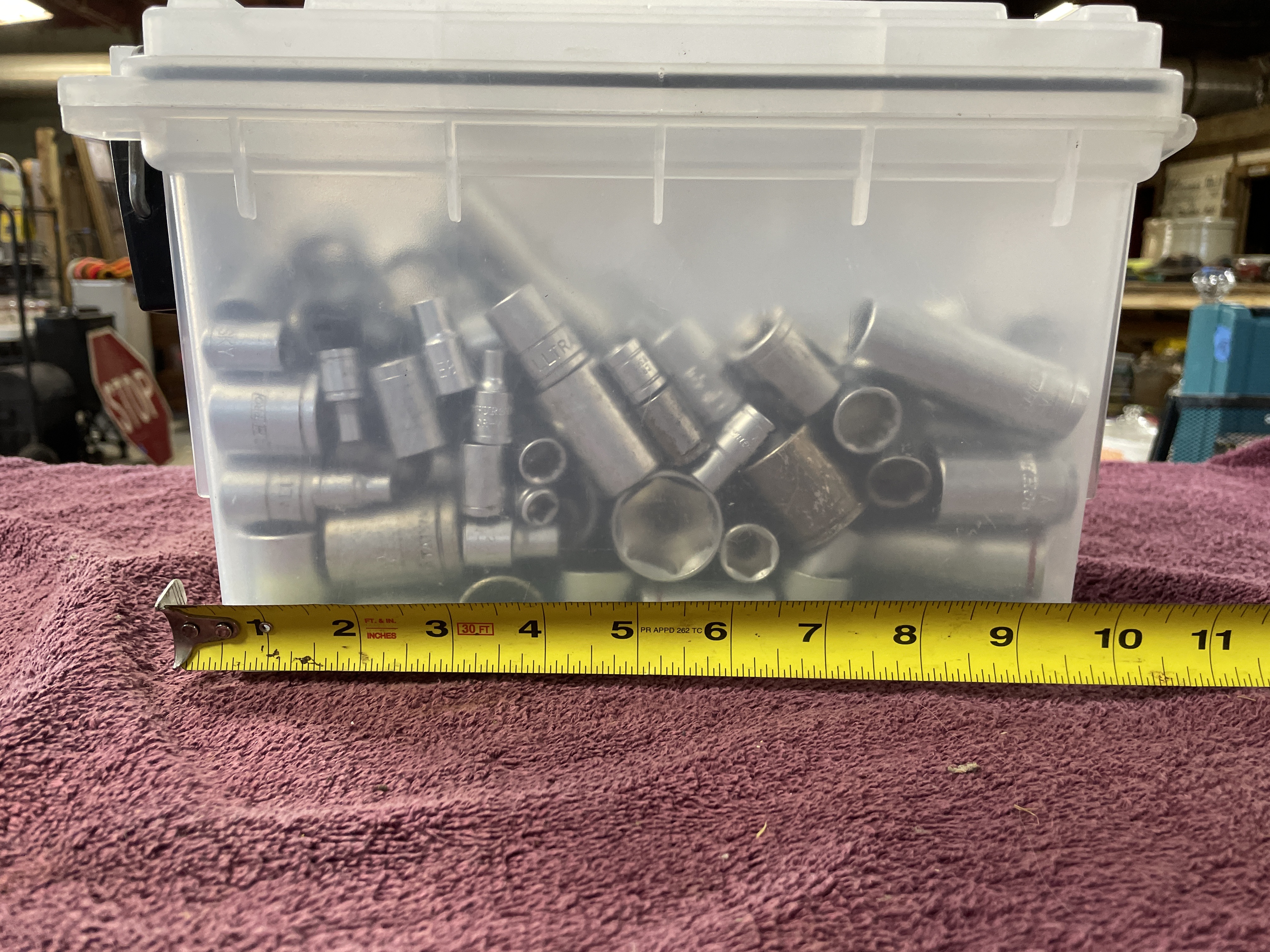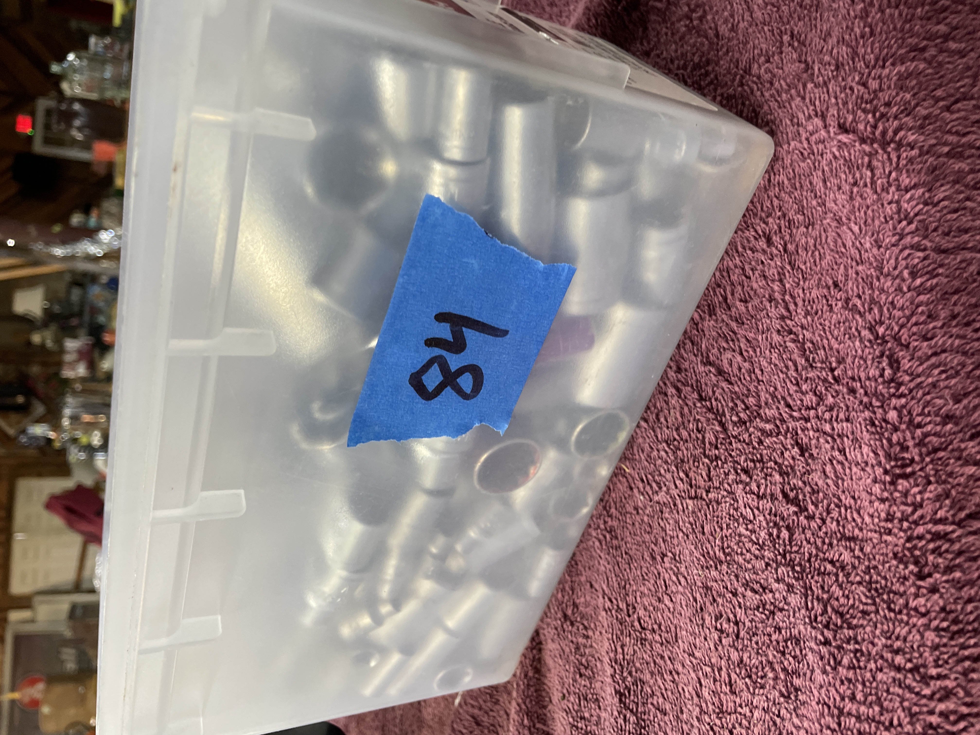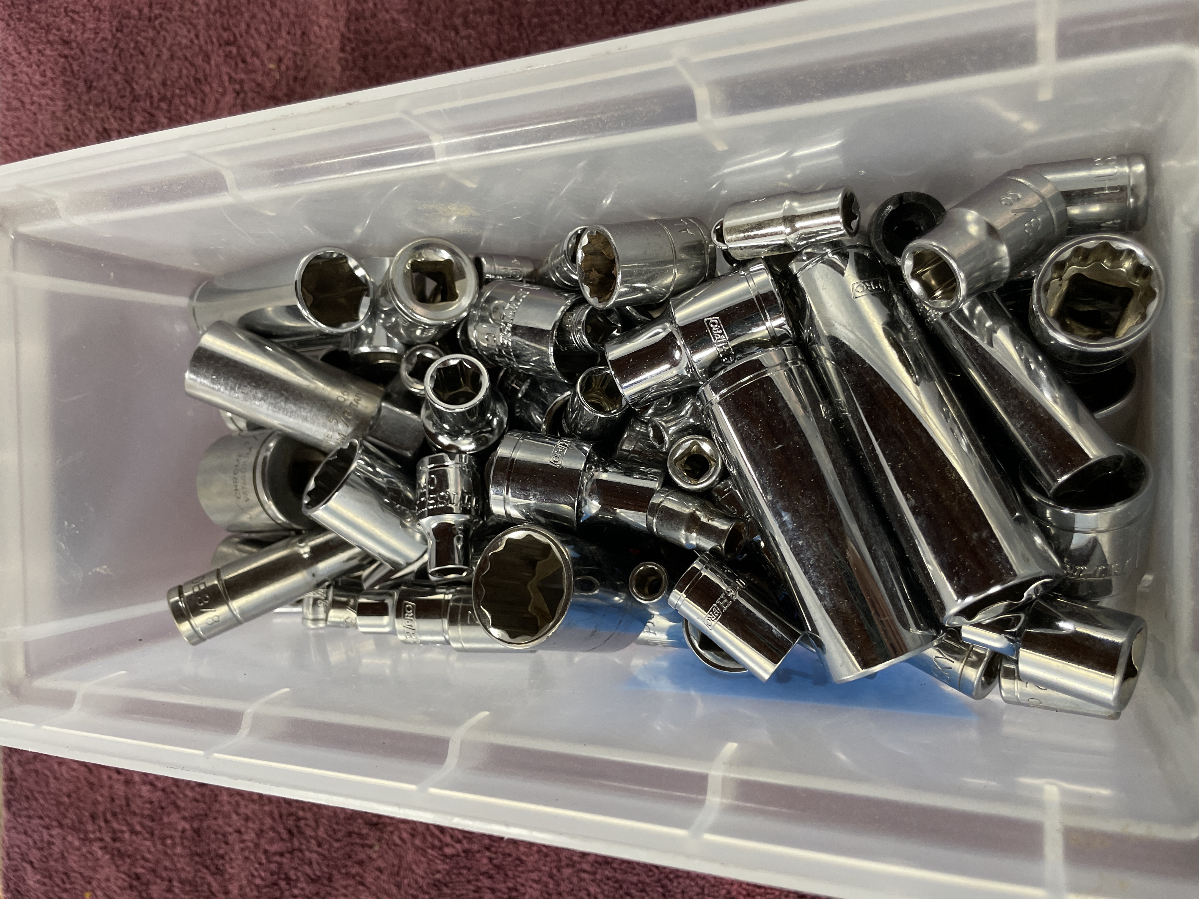A large collection of modern mechanics sockets manufactured by Pittsburgh. The assortment includes a variety of standard and deep-well sockets in both SAE and Metric sizes, consistent with common 1/4 inch and 3/8 inch drive sets. The tools are constructed of chrome-plated steel, marked "PITTSBURGH CR-V" (Chrome Vanadium). The sockets are contained within a translucent plastic storage bin, which features a blue tape label marked with the numerals "84."