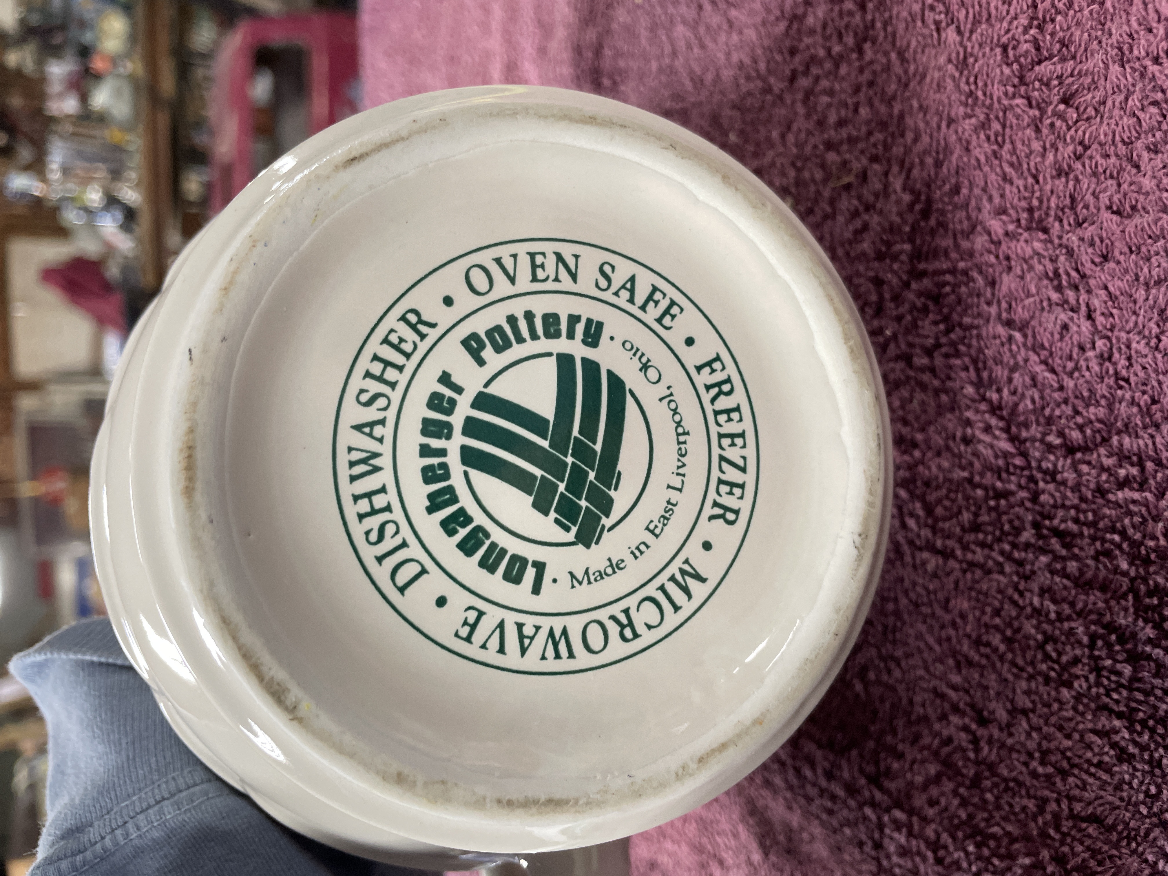 A single glazed ceramic pitcher from the Longaberger Pottery Woven Traditions line, finished in an off-white glaze with decorative elements rendered in dark green. The body features a molded basketweave texture pattern complemented by curved bands and stylized four-petal floral motifs. The pitcher has a spout and a looped handle, and rests on a small pedestal foot accented with a green stripe. The underside bears the circular Longaberger Pottery stamp and logo, inscribed Made in East Liverpool, Ohio, and noting it is DISHWASHER, MICROWAVE, OVEN SAFE, FREEZER.
