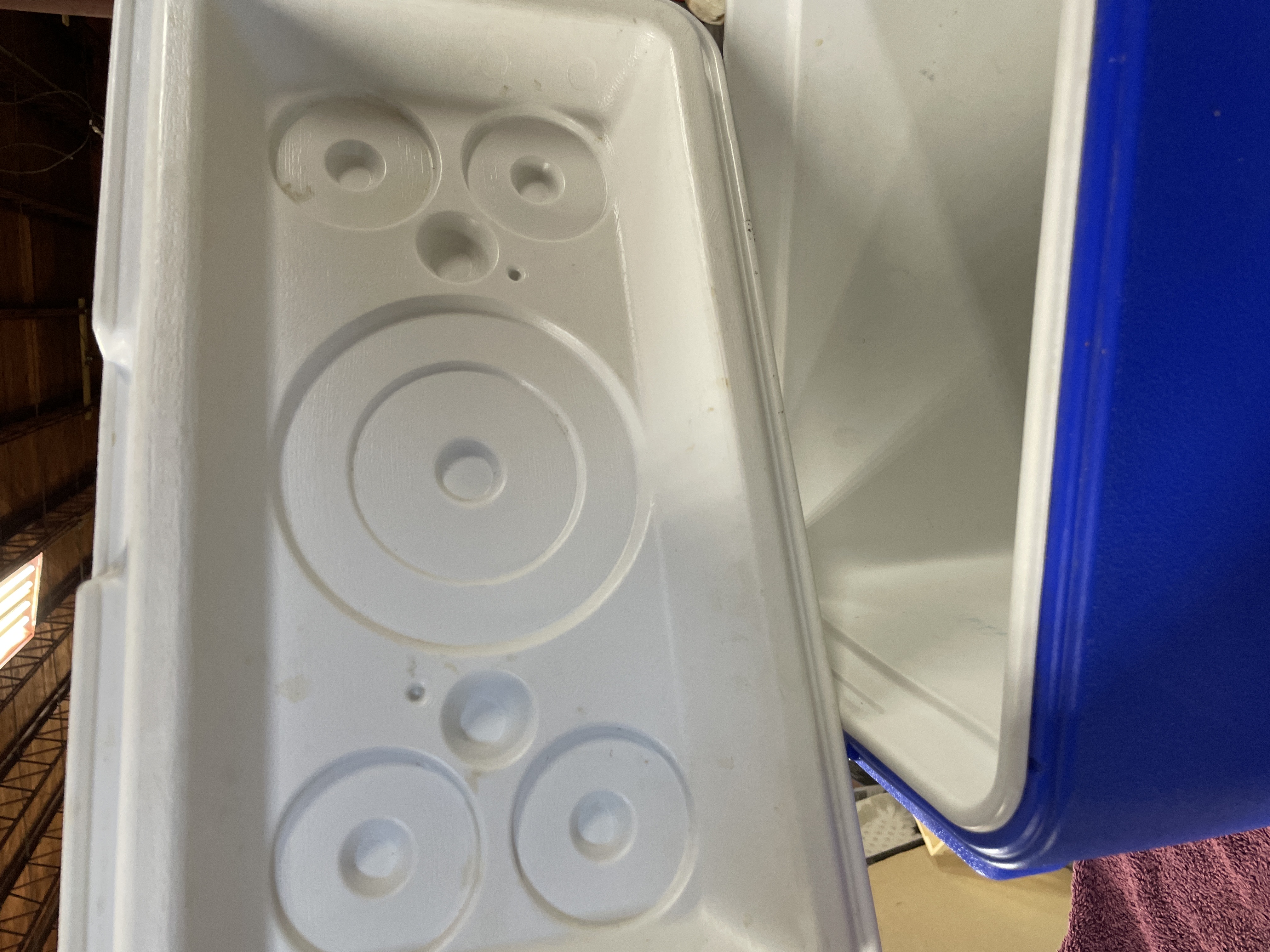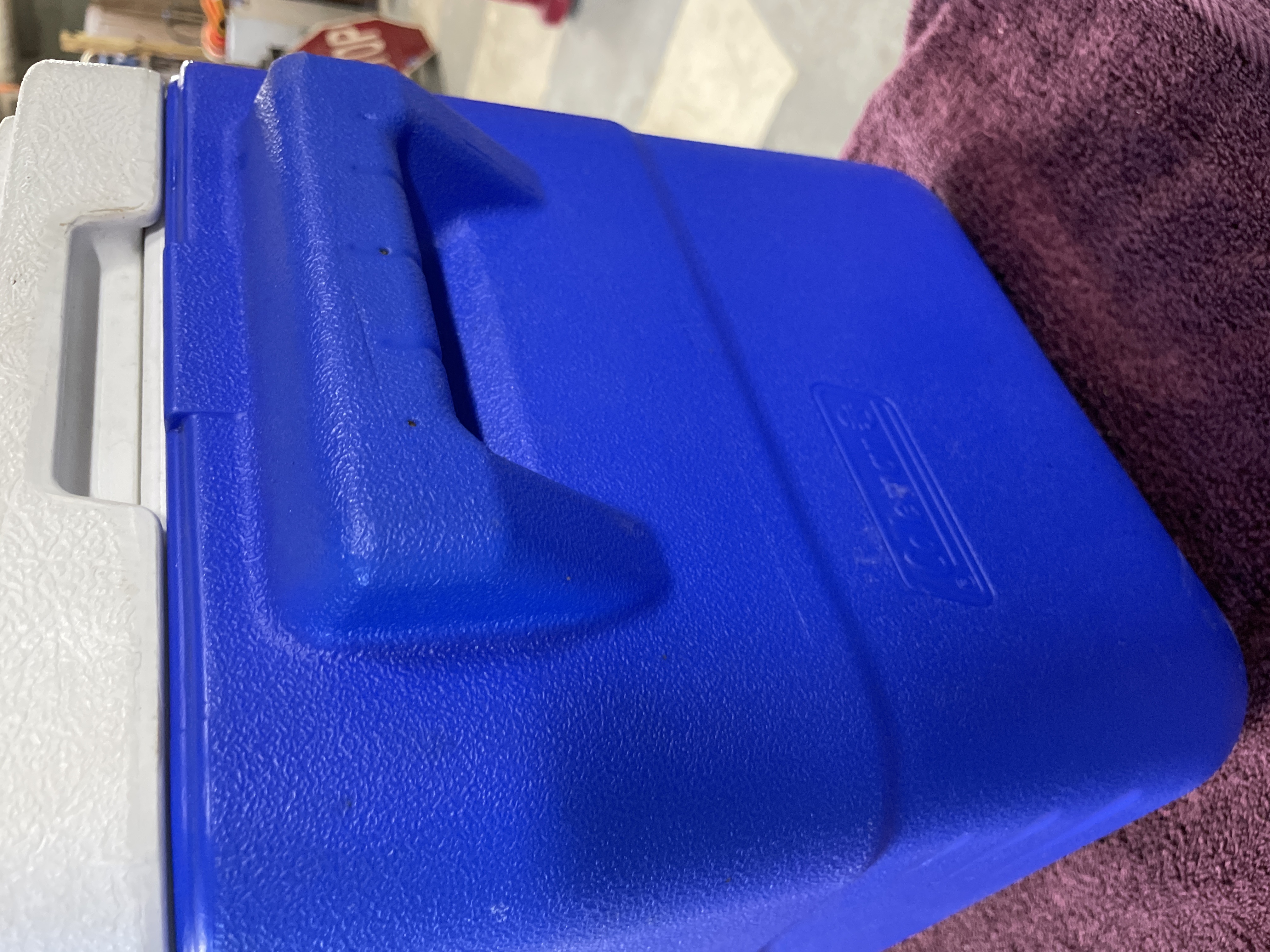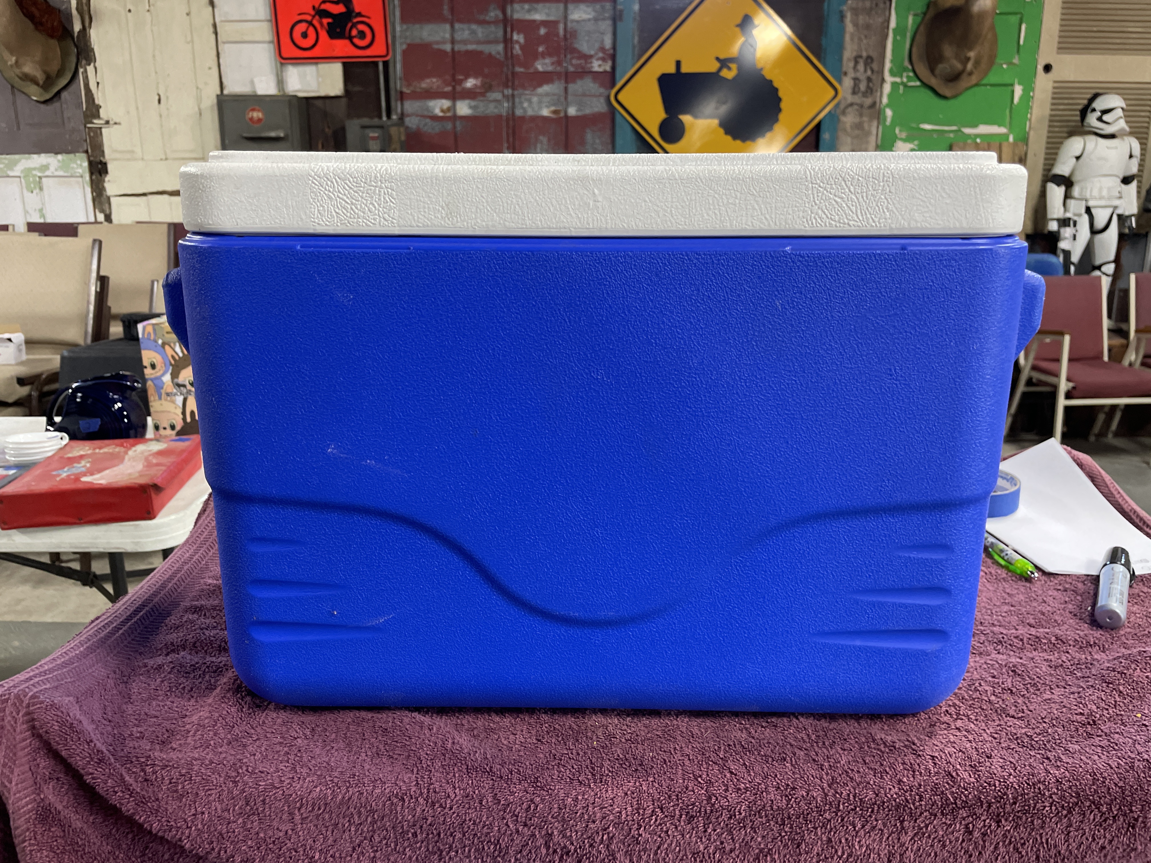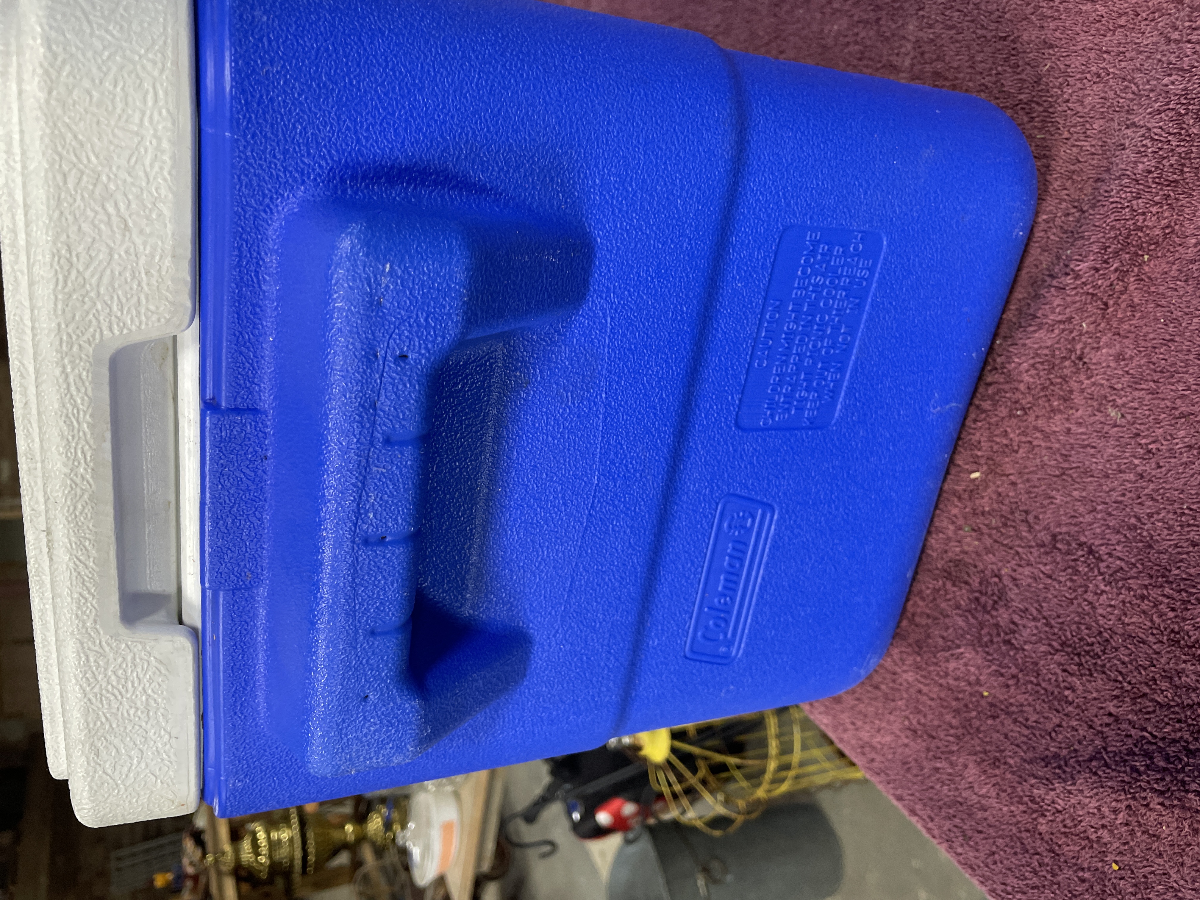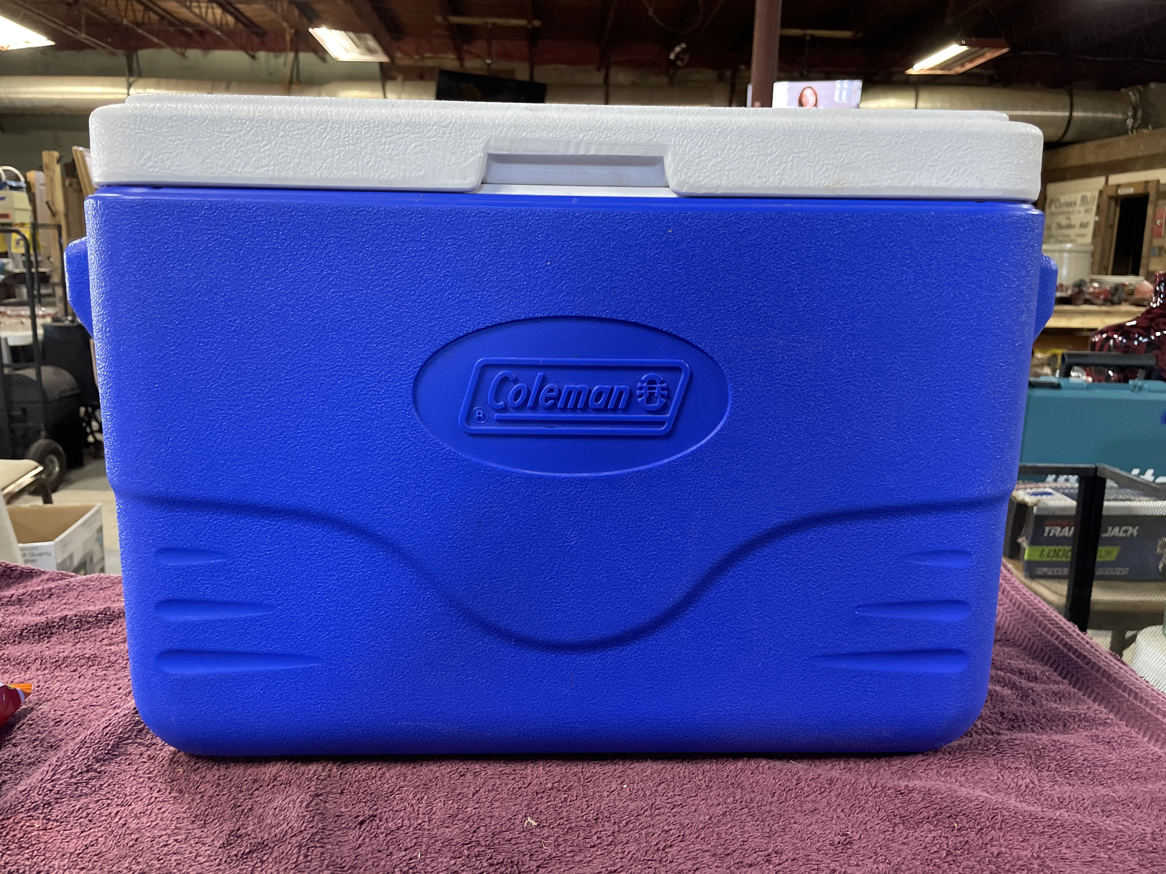A modern insulated beverage cooler manufactured by Coleman. The unit is constructed of molded plastic featuring a textured bright blue exterior body with integrated side handles and a white removable lid and interior liner. The front panel is clearly marked with the raised molded manufacturer’s name Coleman, which is repeated in a smaller font near the base of the side panels, alongside a molded, illegible caution label. The cooler is identified through web intelligence as a 28 Quart (approximately 27L) model.