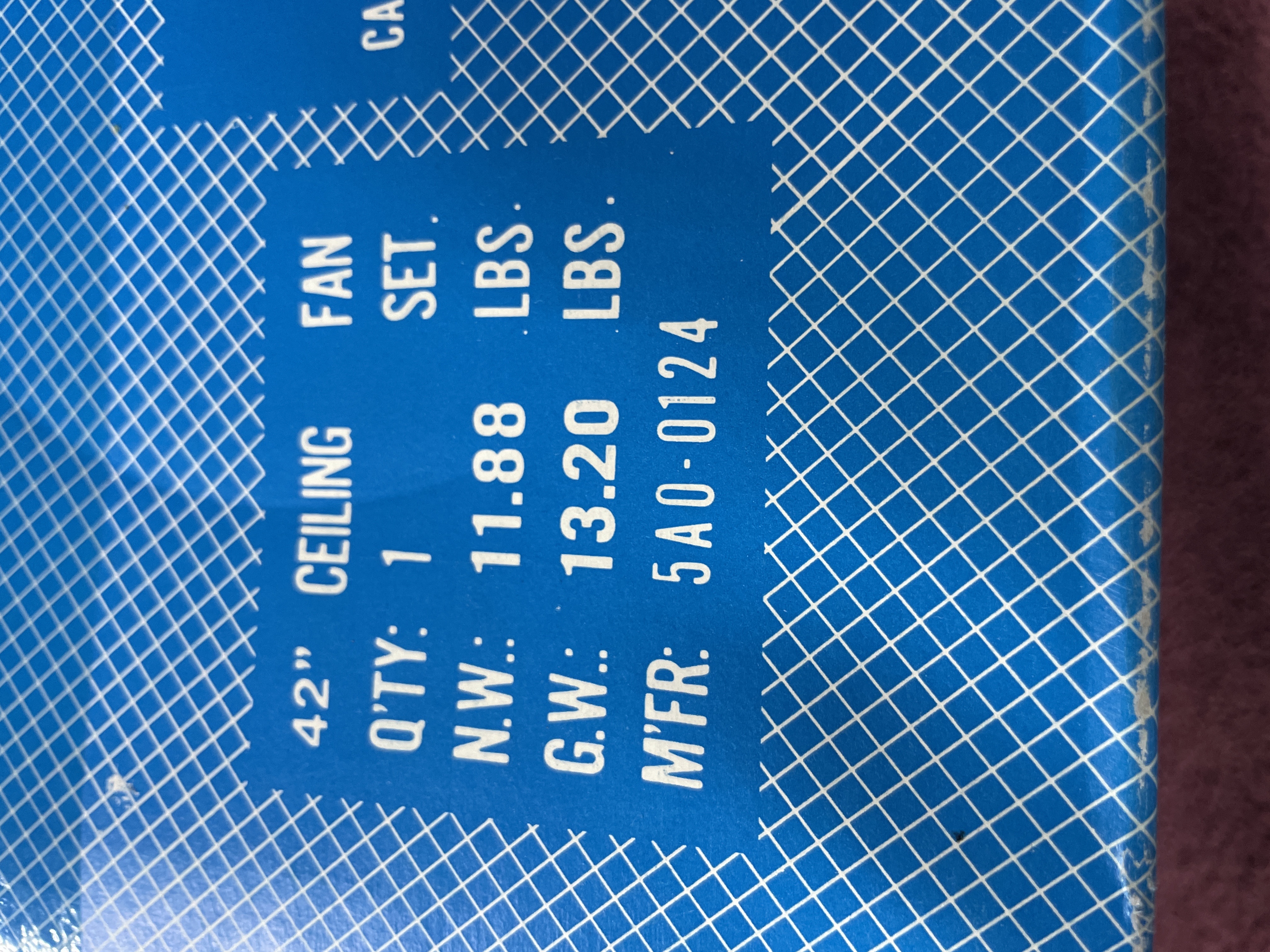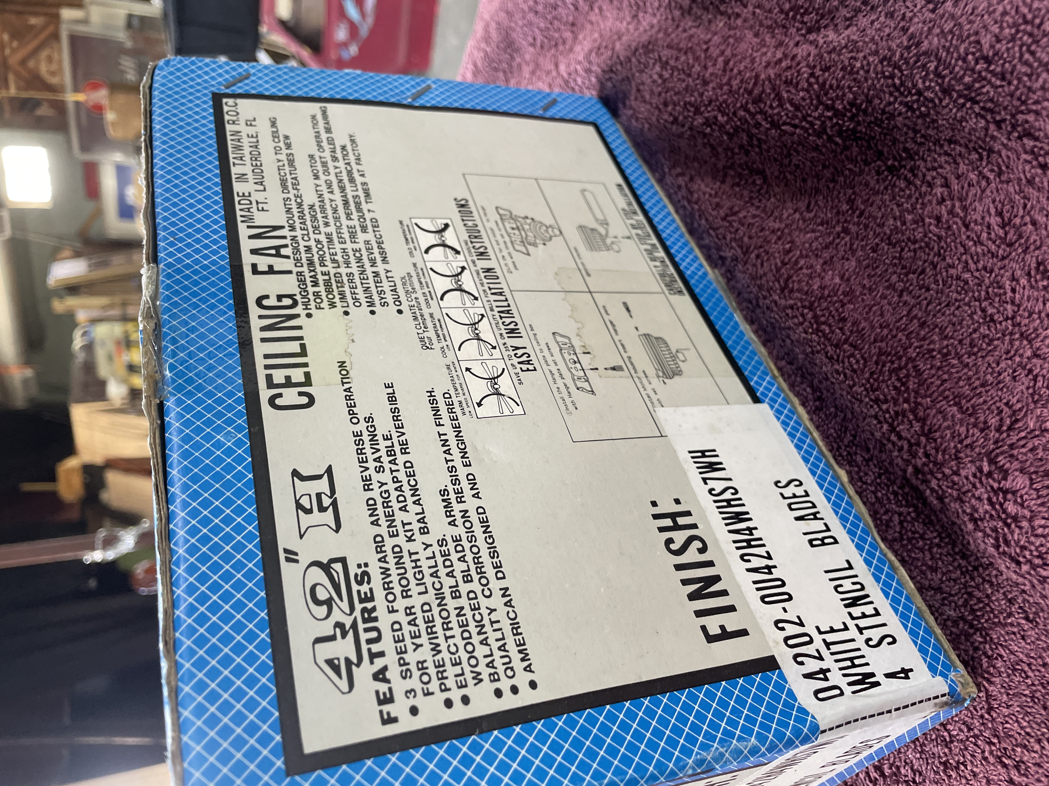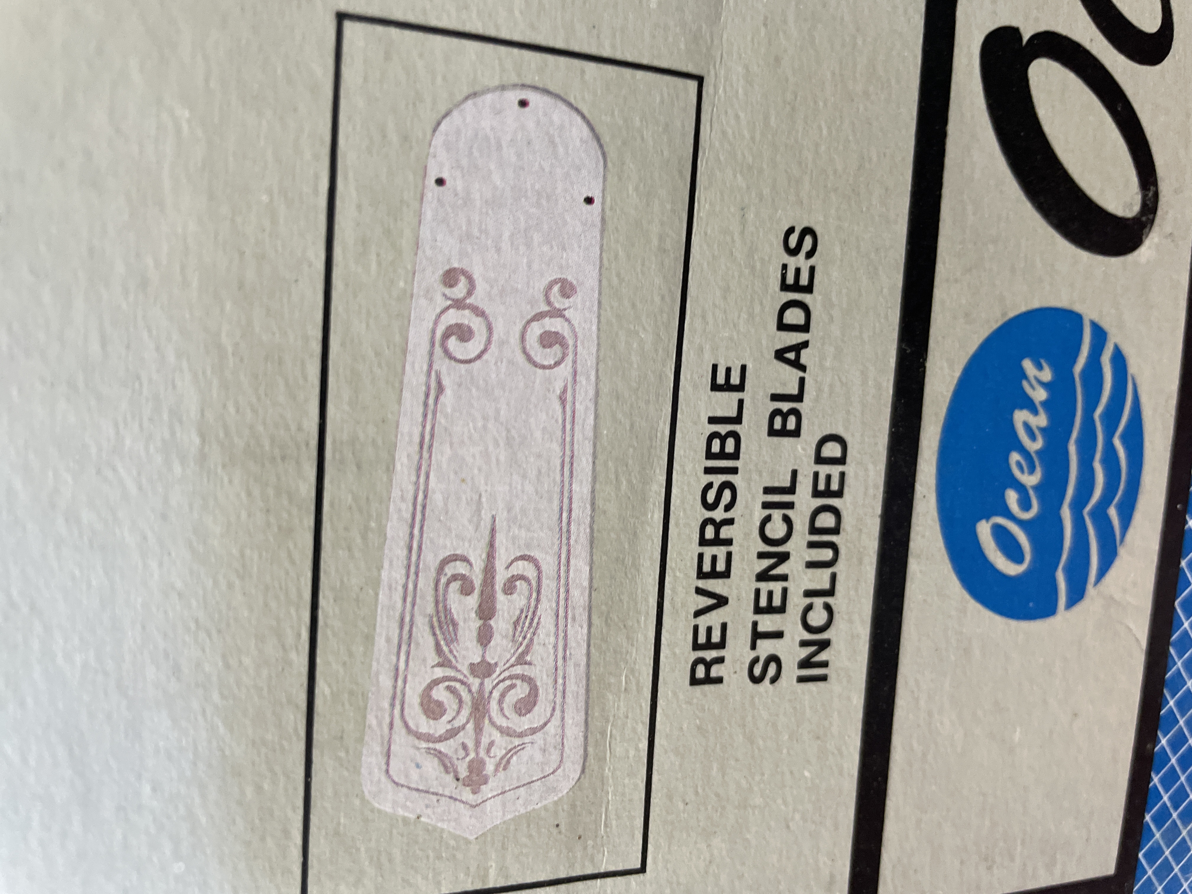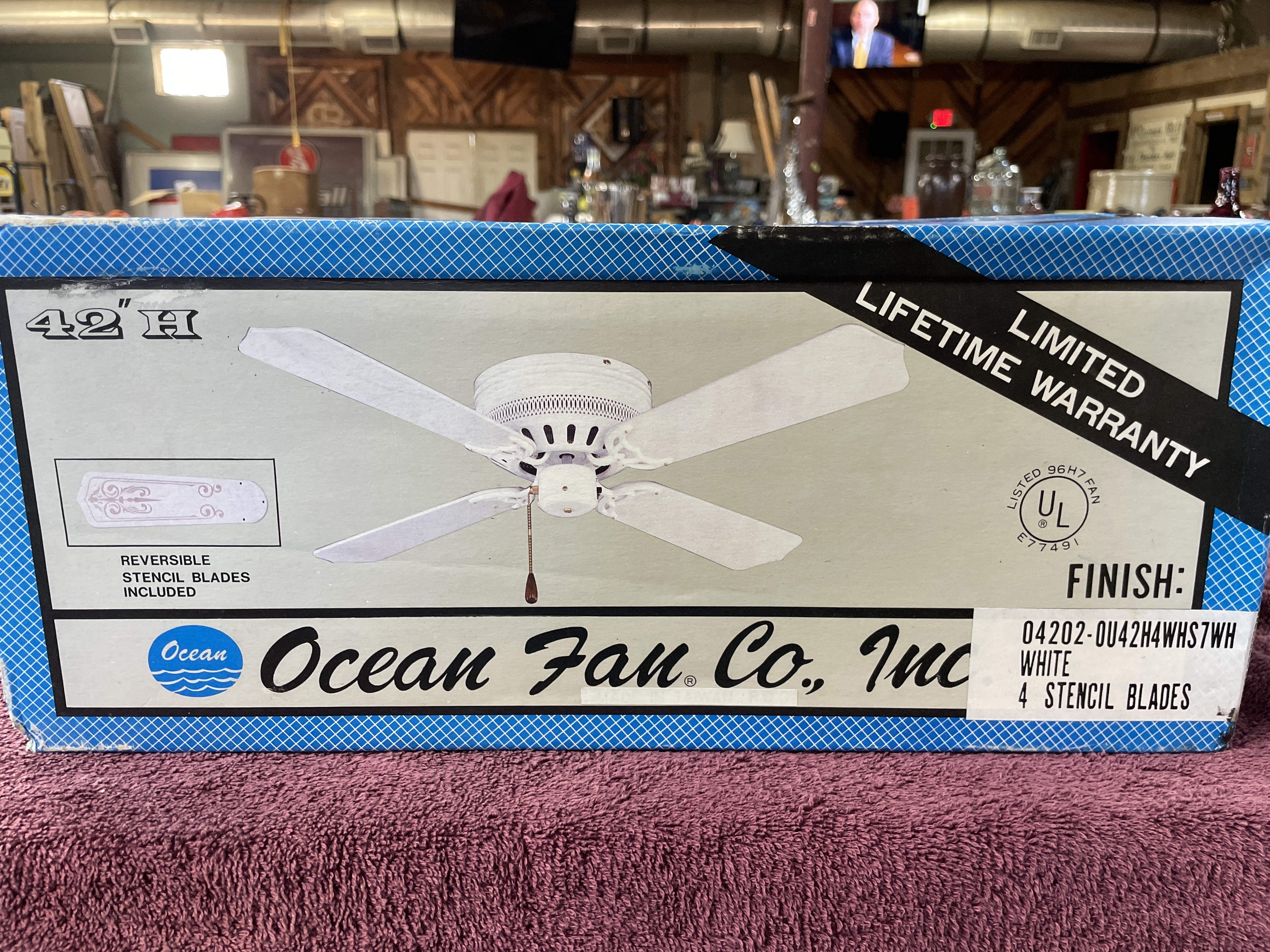 One new or unused residential ceiling fan manufactured by Ocean Fan Co Inc. The 42 inch fan is listed as Model 04202-0U42H4WHS7WH and features a white finish with four wooden reversible stencil blades displaying an ornate scrolling motif. The unit offers 3 speed forward and reverse operation, is light kit adaptable, and features electronically balanced corrosion resistant finish. The fan is UL Listed (E77491) and was manufactured in Taiwan R.O.C. The item is contained within its original packaging, which lists a quantity of 1 set.