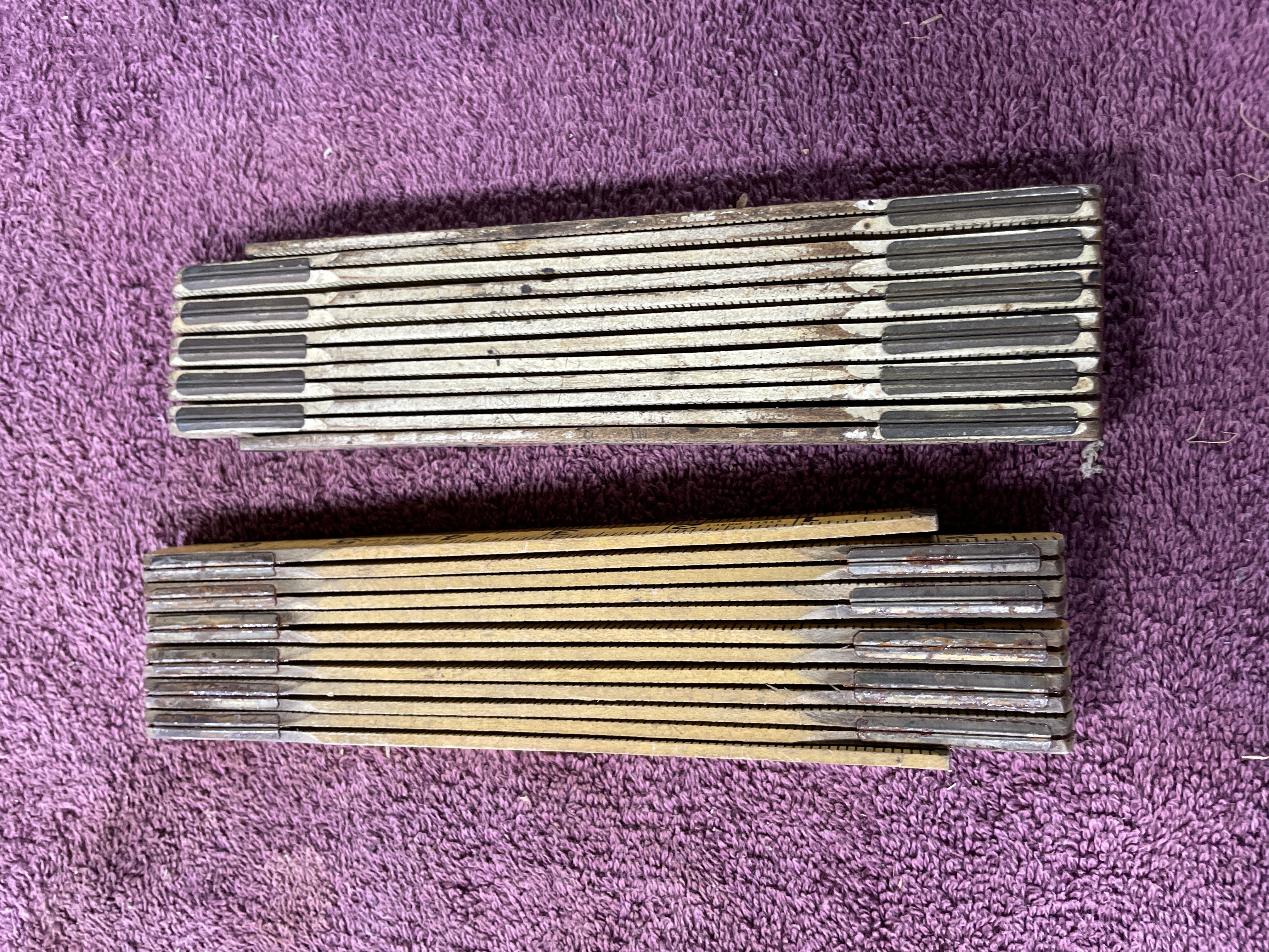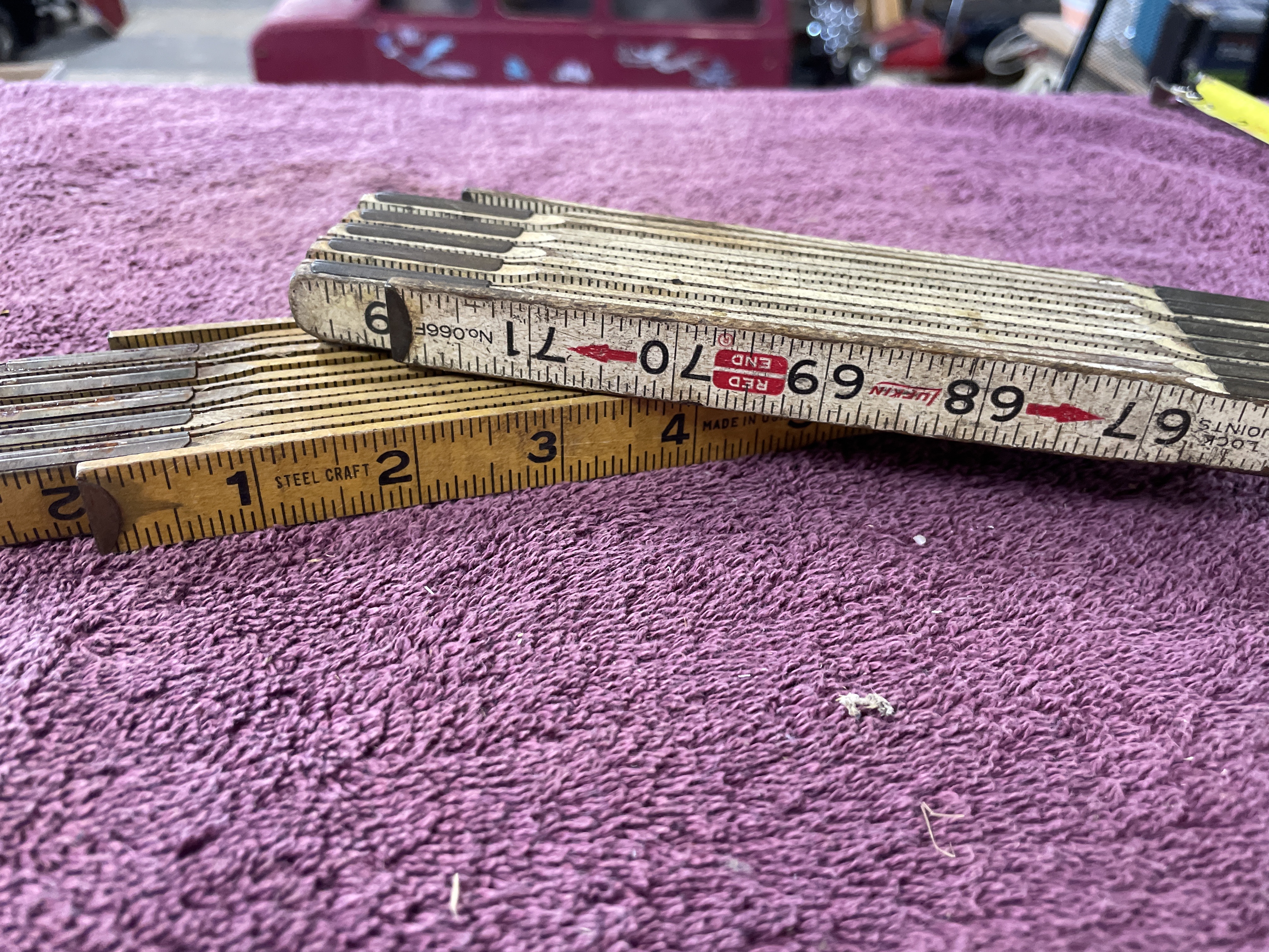 A pair of vintage folding rules constructed of wood with metal hinges and joints. The lot consists of two distinct measuring tools. The first ruler is marked RED END, 990, and references LOCK JOINTS, consistent with Lufkin manufacturing. This ruler displays measurements in the higher range (67 through 71 inches visible). The second ruler is marked STEEL CRAFT and displays imperial measurements (inches 1 through 4 visible). Both tools are designed for carpentry and measuring tasks.