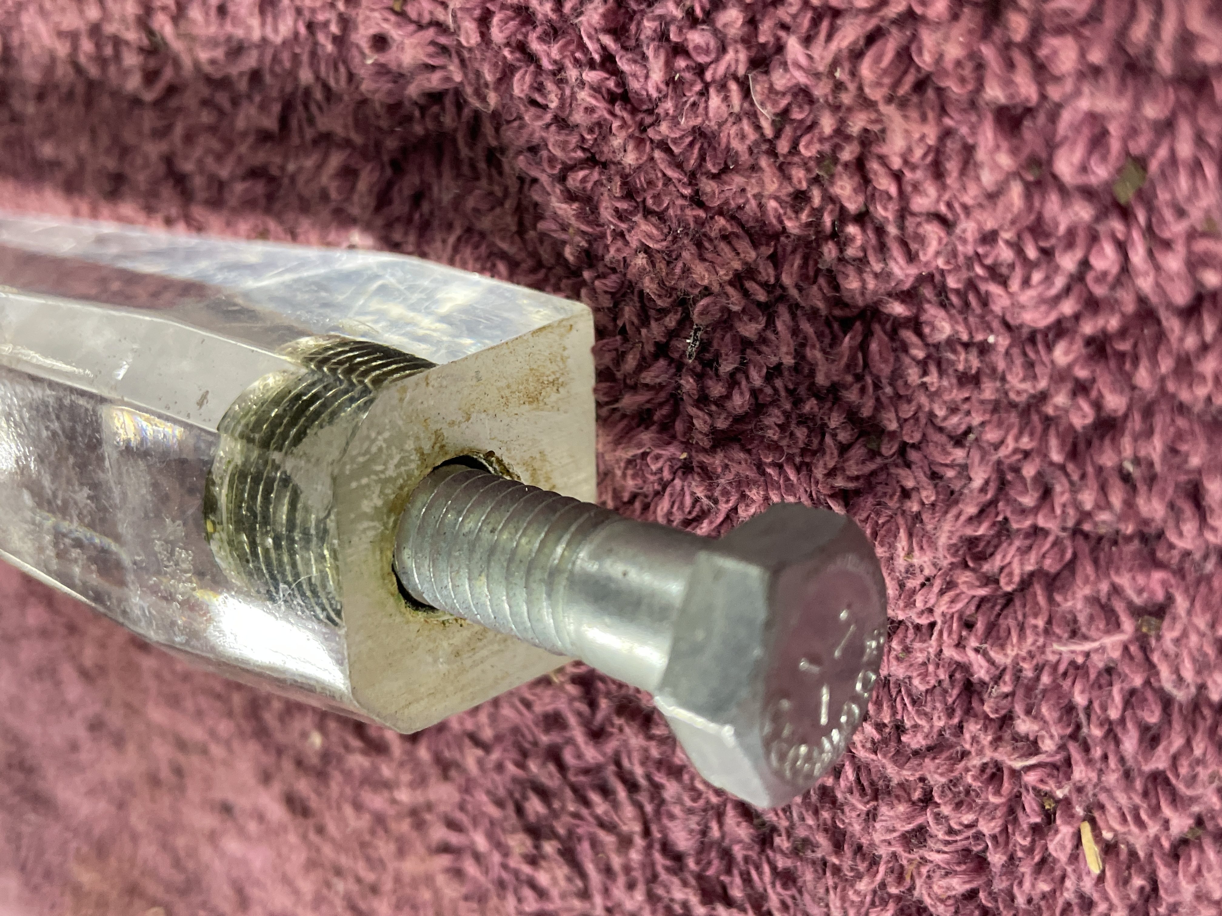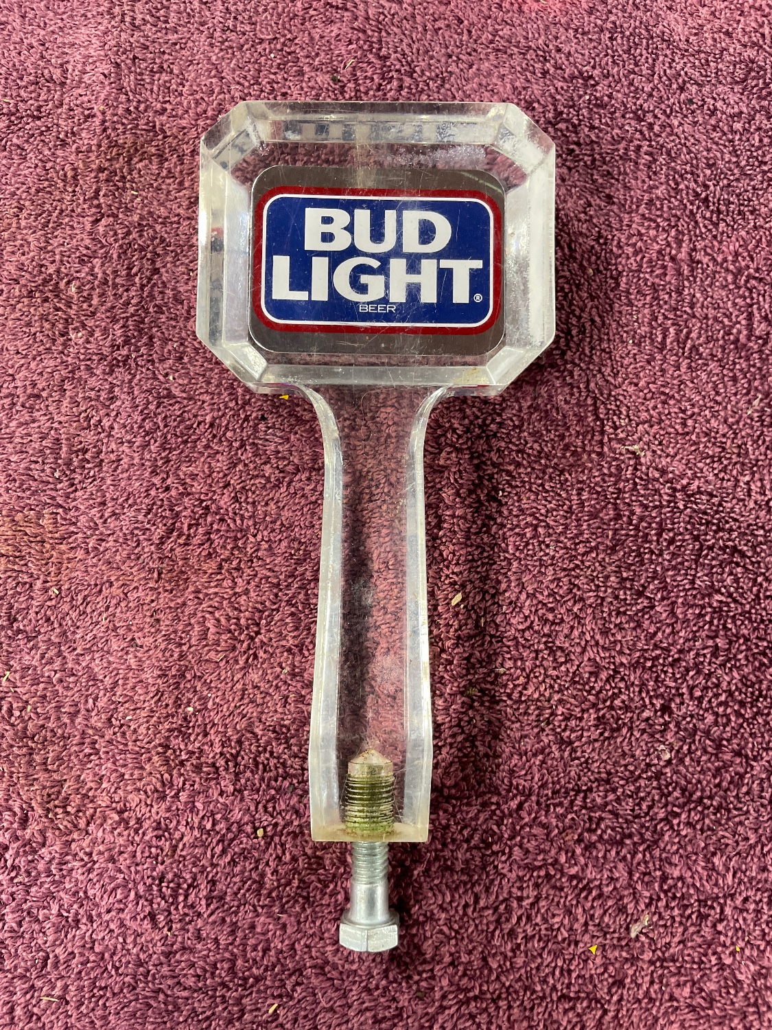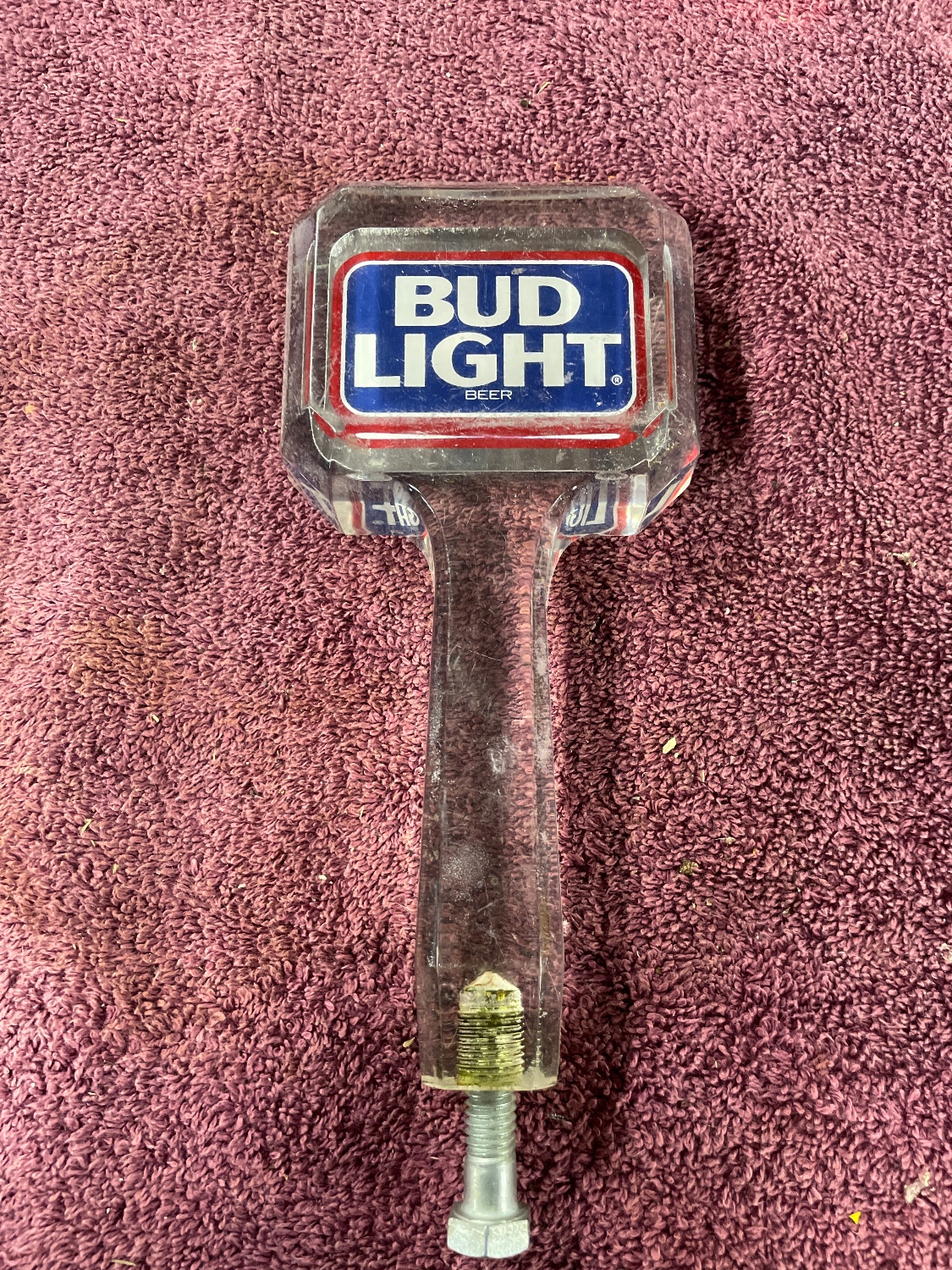A single vintage Bud Light beer tap handle constructed from clear acrylic or Lucite. The handle features a squared top section containing the iconic Bud Light logo, displayed in white text on a blue background outlined in red, with the text “BEER™” underneath. The body tapers toward the base, where embedded metal threads and a protruding silver-toned metal bolt connector are visible. The design is consistent with brewery promotional items of the period.
