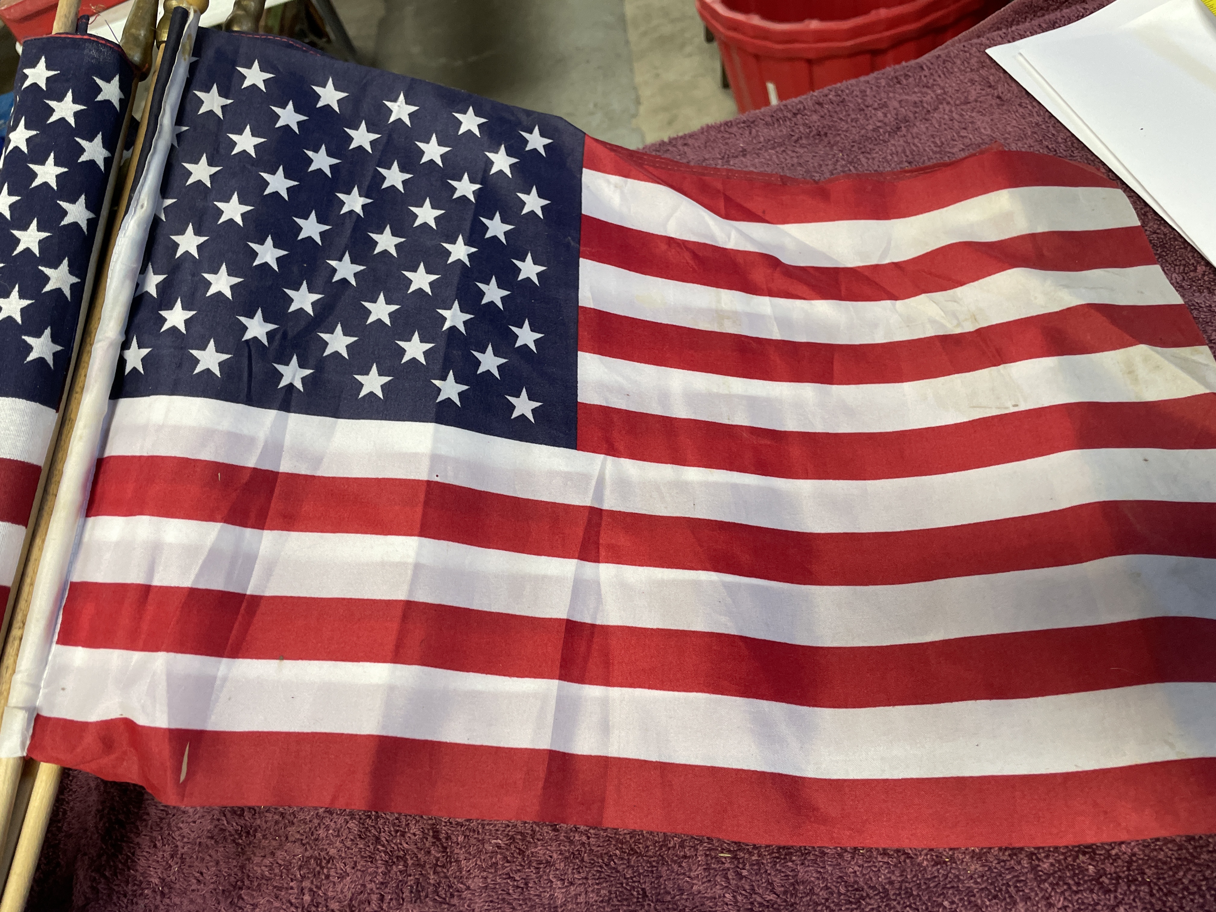 A collection of thirteen handheld American stick flags featuring the standard 50-star design. Each flag is constructed from a synthetic textile fabric attached to a finished natural wood dowel pole. Based on common commercial listings for similar items, the flags are likely sized approximately 4 x 6 inches. The flags are secured to the dowels, which are visible in a bundle.