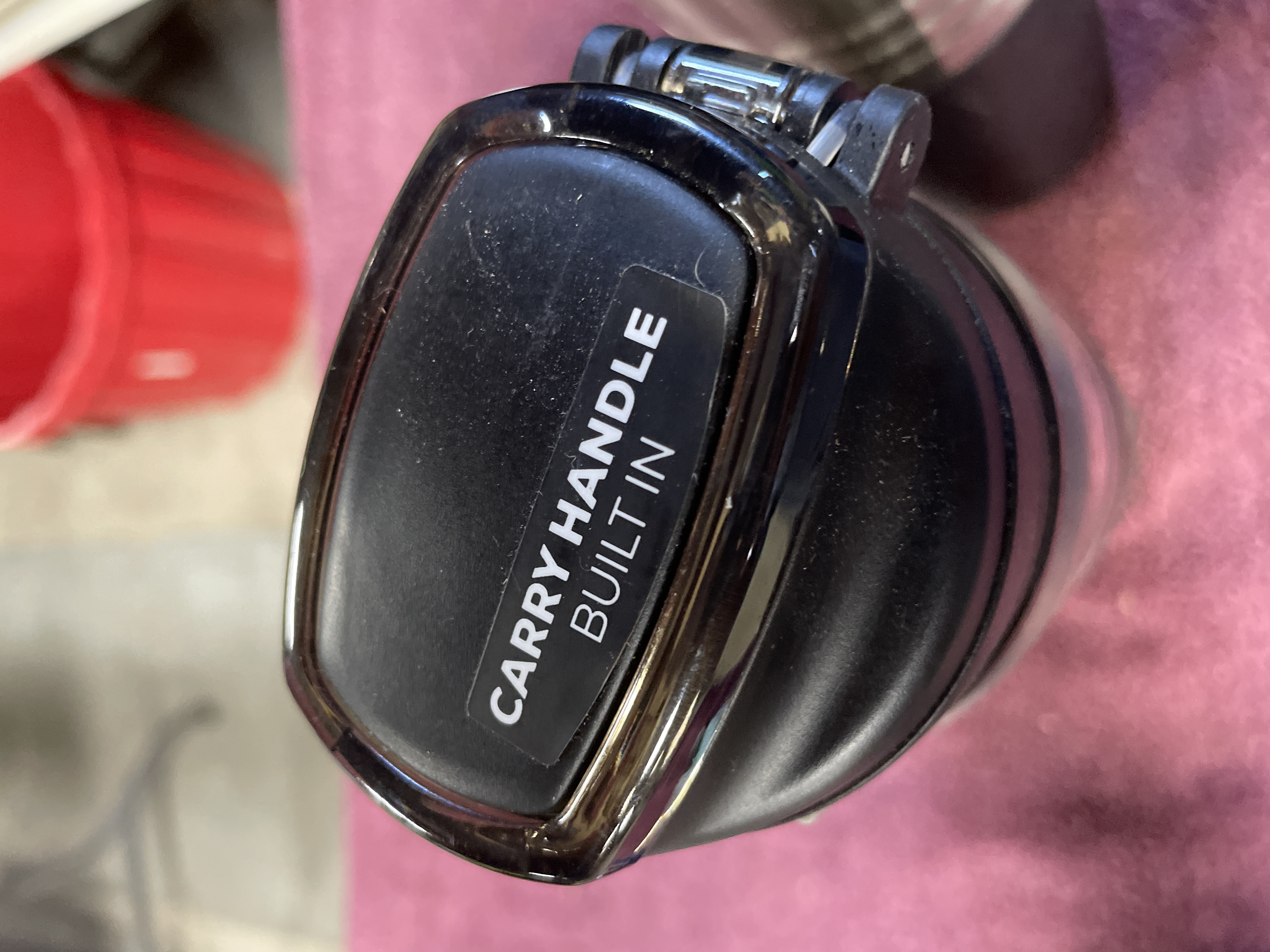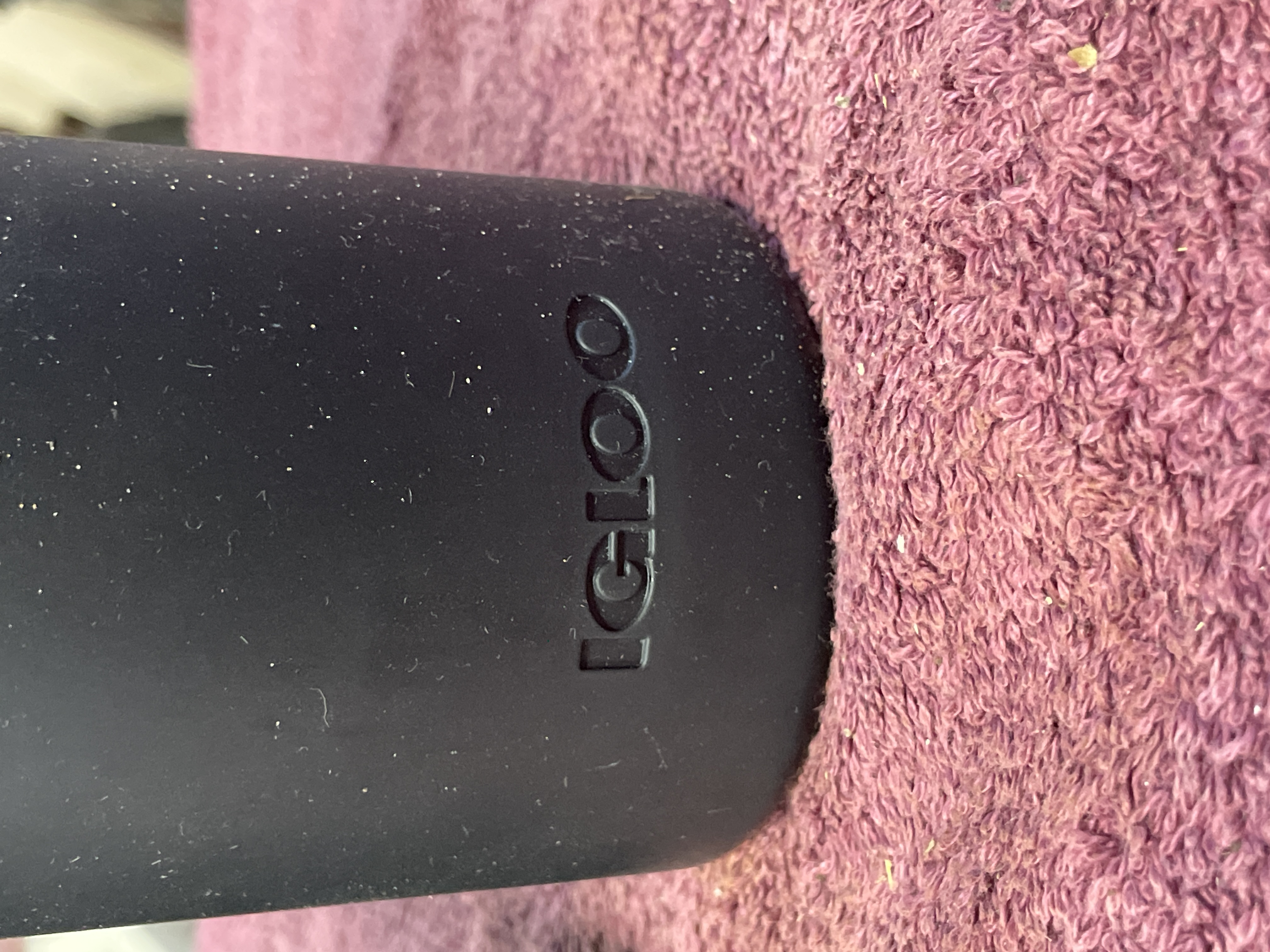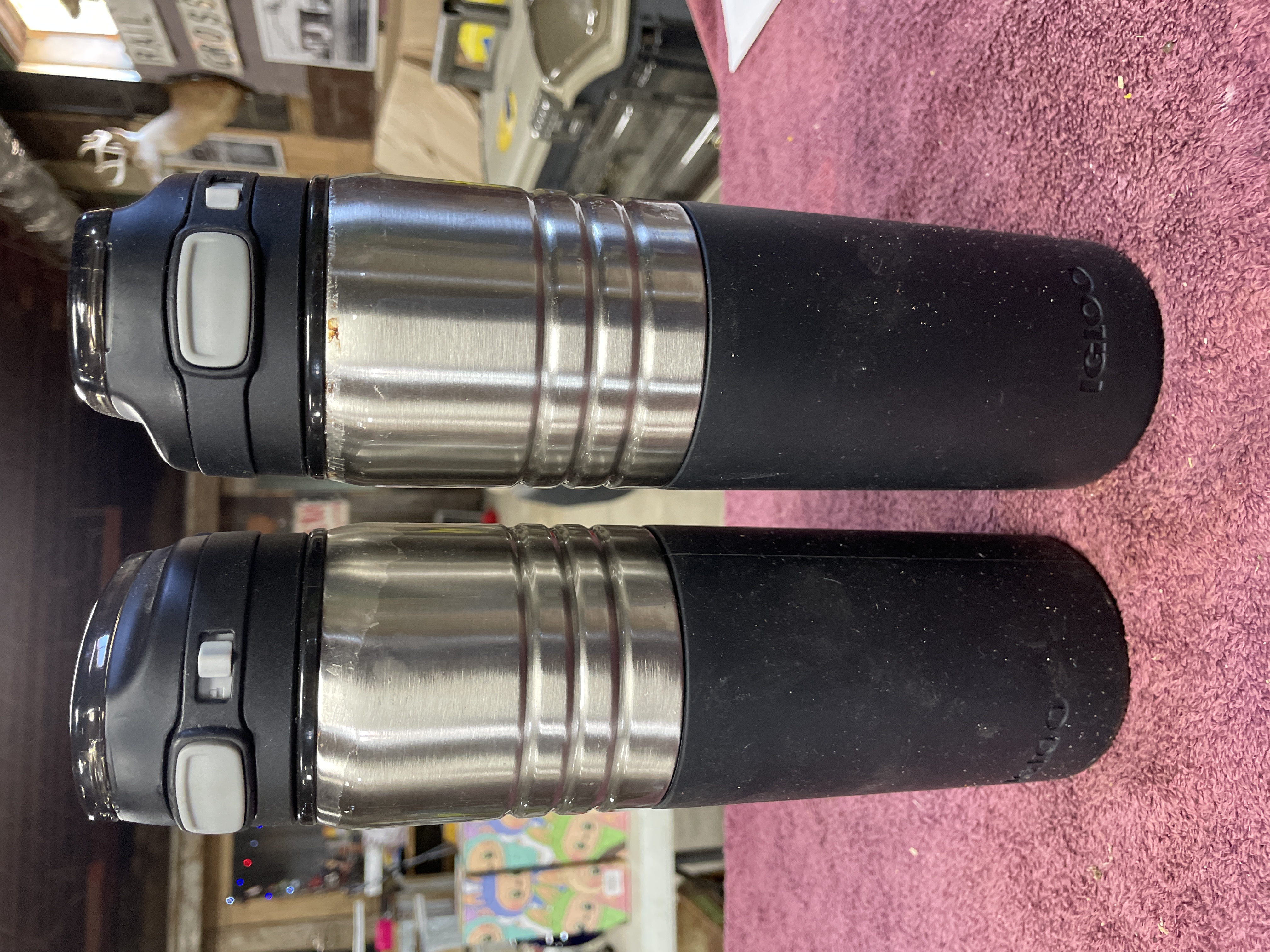 A pair of modern insulated drinking vessels manufactured by Igloo, identified as Hybrid Sports Jugs. Each vessel features a cylindrical body constructed in three sections: a black plastic lid assembly with grey activation buttons and a glossy top surface; a central vacuum-insulated body of brushed stainless steel with horizontal ribbing; and a lower section covered in a matte black rubberized grip sleeve. The branding IGLOO is debossed into the black grip material near the base of each bottle. One lid retains a sticker indicating a CARRY HANDLE BUILT IN feature. These vessels are designed for travel or sports use.