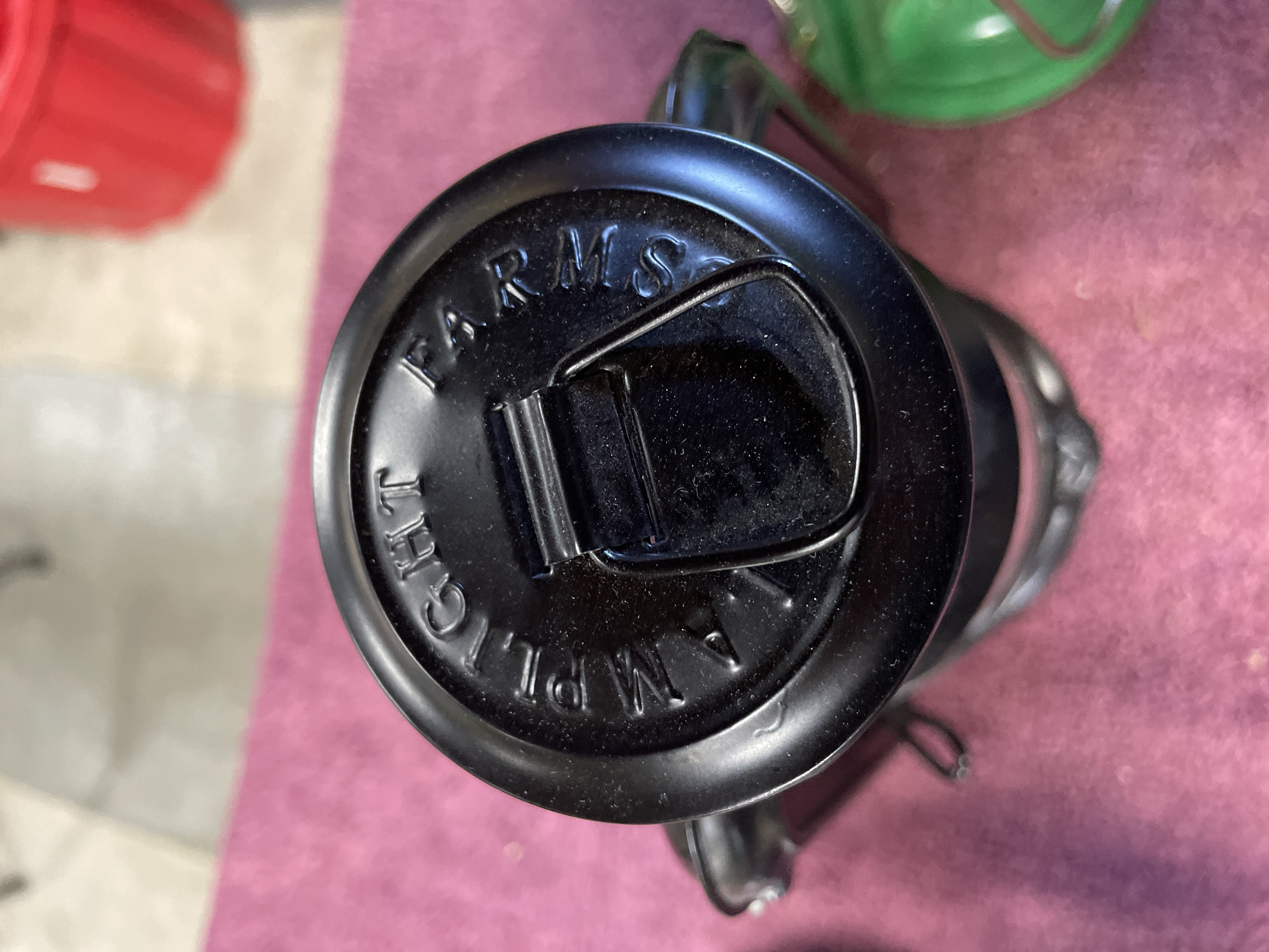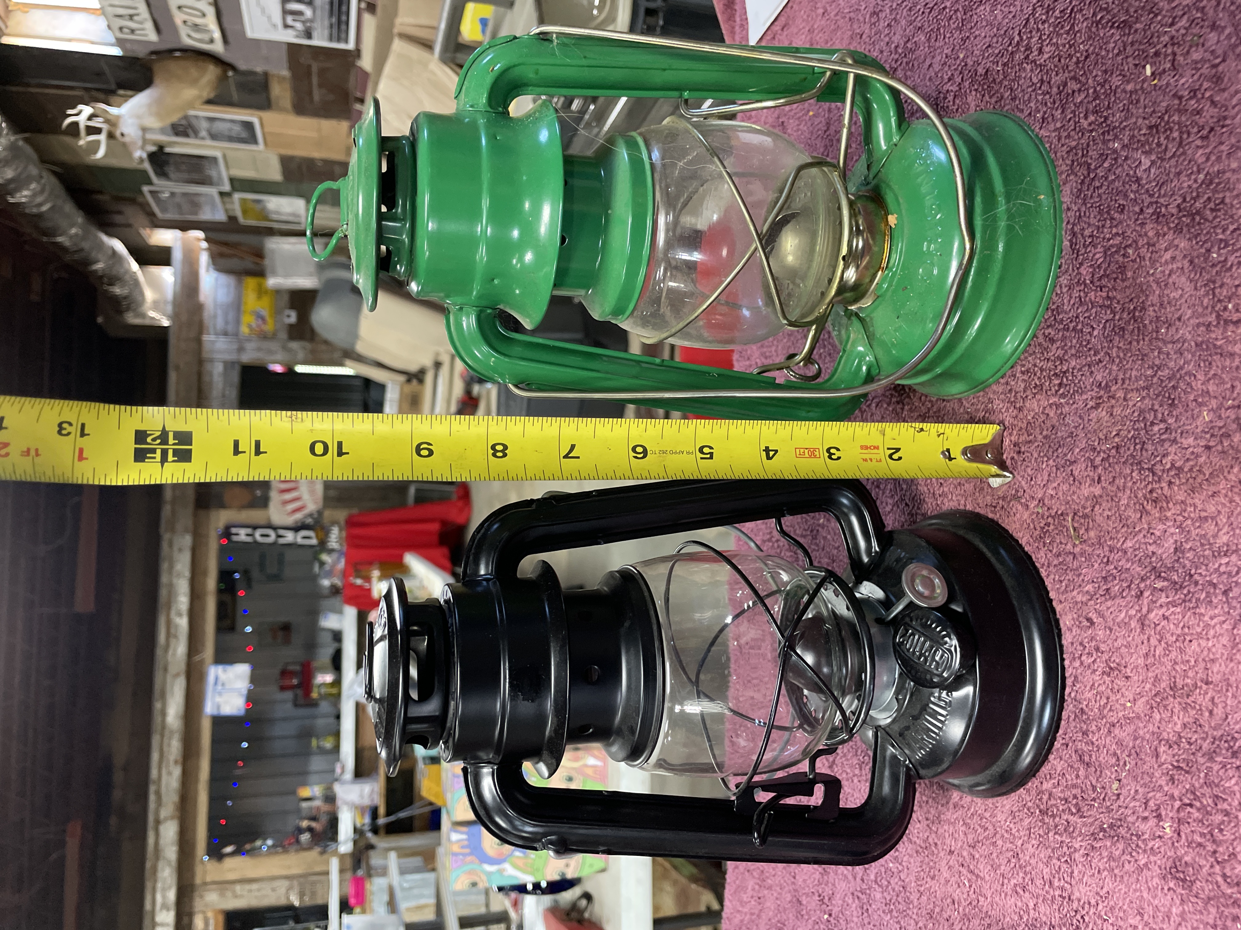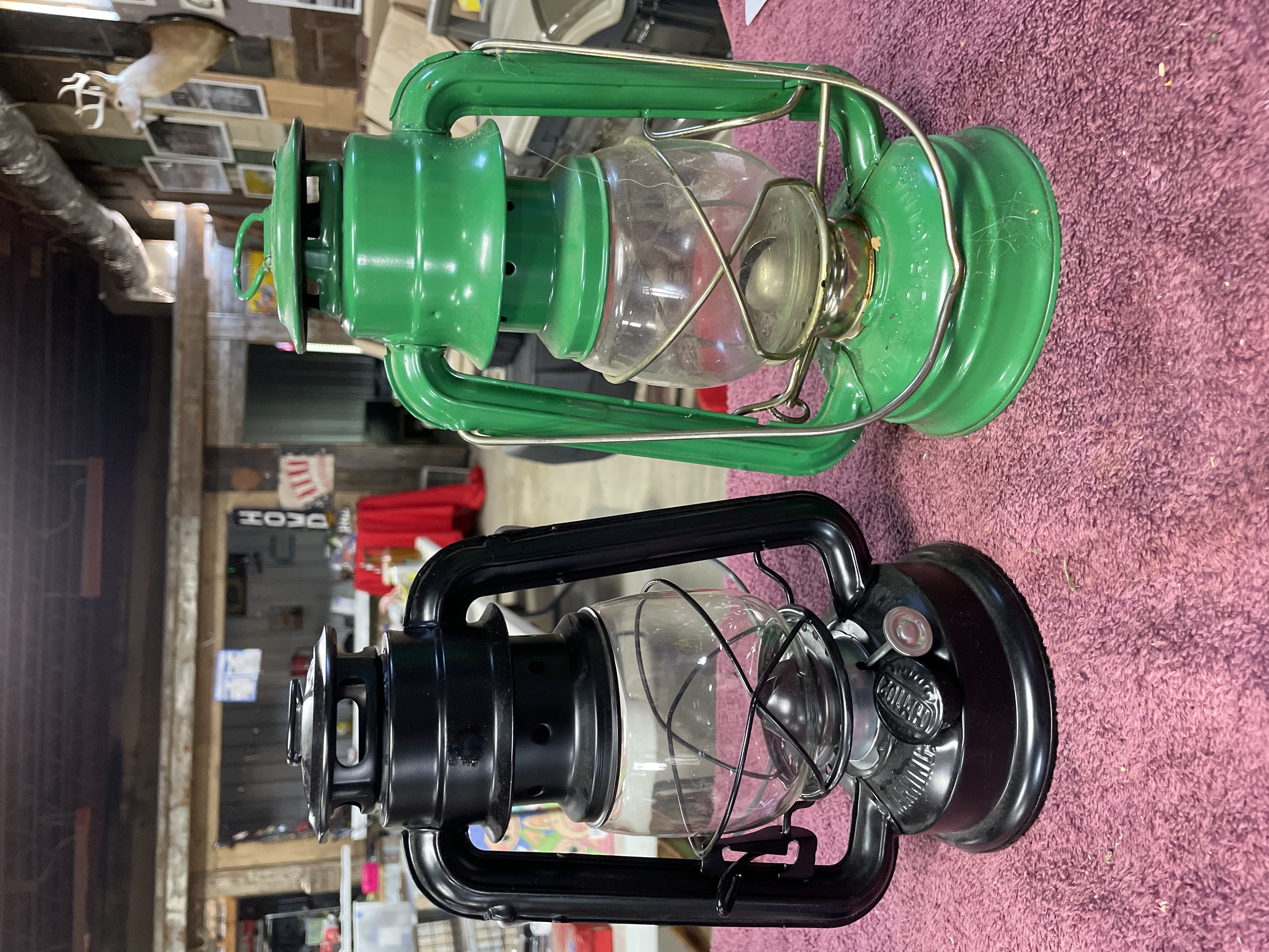 A pair of kerosene hurricane lanterns constructed of enameled metal and clear glass globes, each featuring a wire bail handle. The collection consists of two distinct examples. The first is finished in black enamel. This lantern is marked on the top cap with the embossed text LAMPLIGHT FARMS and stamped CHINA on the fuel tank base near the adjustment mechanism. The second lantern is finished in bright green enamel. The top cap of the green lantern is embossed with the numbers 24310 and 01312. Additional manufacturer text is present on the fuel tank but is obscured by wear and residue. Both lanterns feature adjustment mechanisms for the wick.