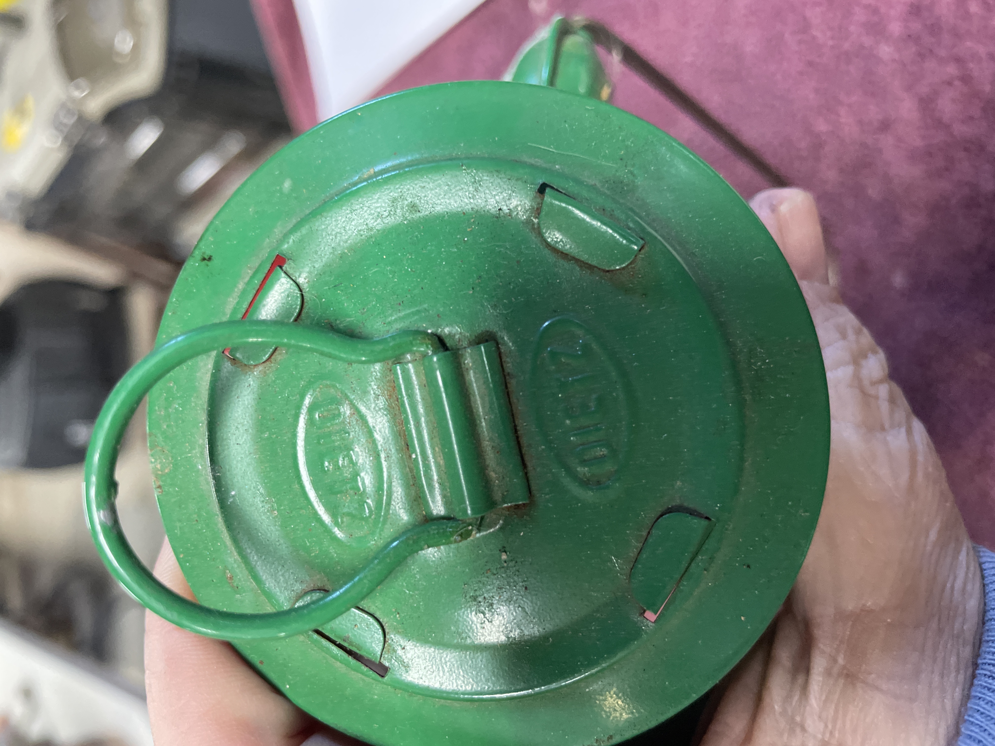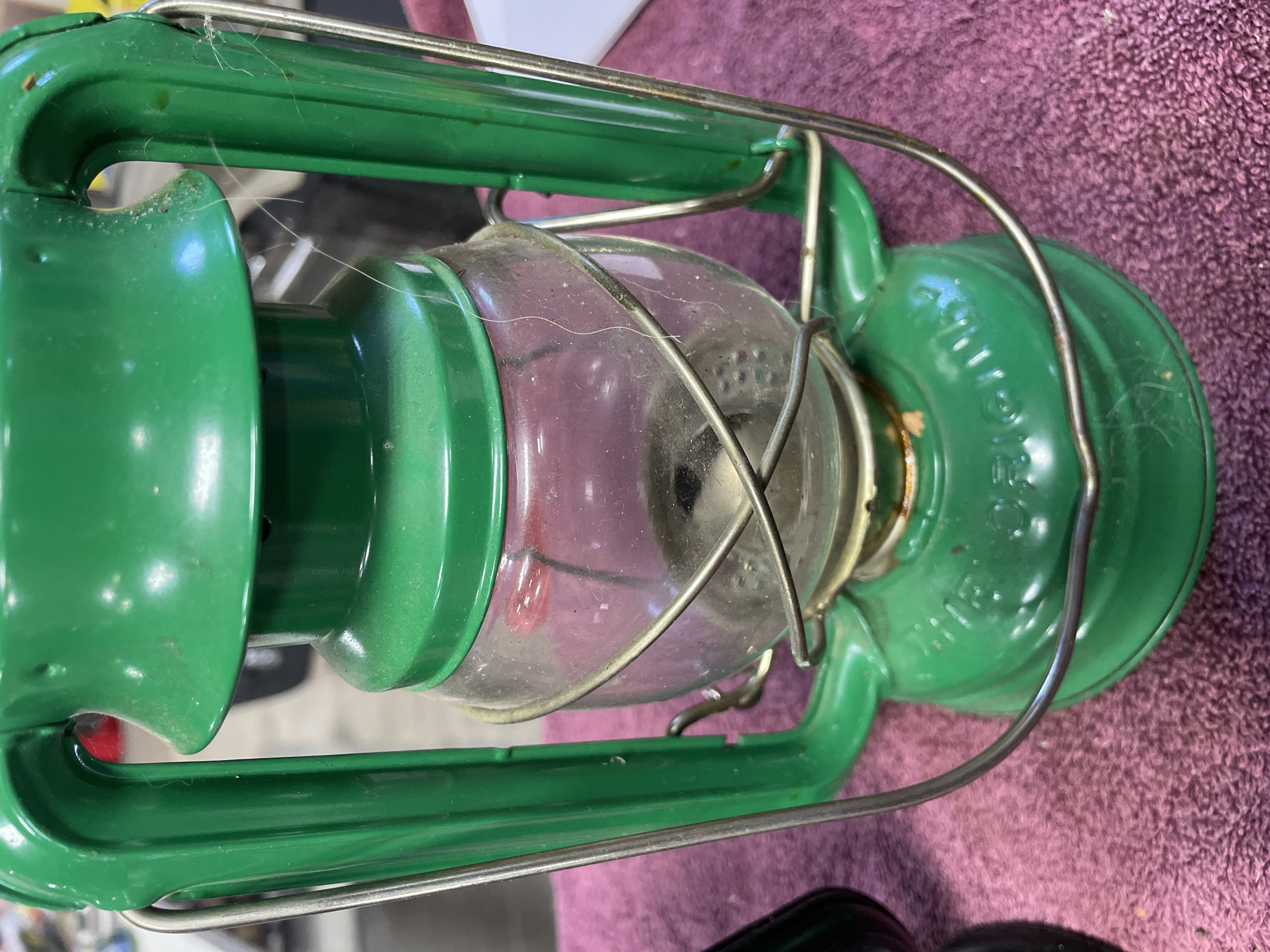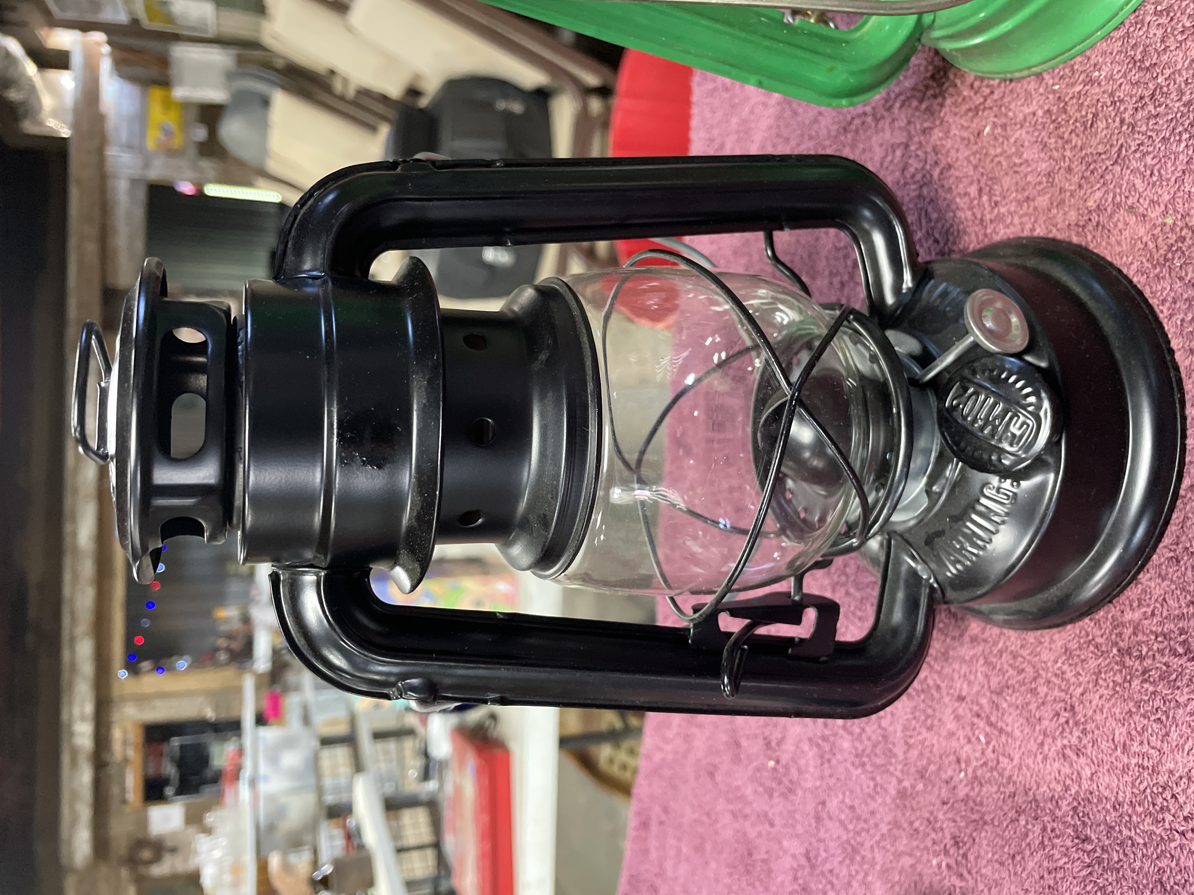 A pair of kerosene hurricane lanterns constructed of enameled metal and clear glass globes, each featuring a wire bail handle. The collection consists of two distinct examples. The first is finished in black enamel. This lantern is marked on the top cap with the embossed text LAMPLIGHT FARMS and stamped CHINA on the fuel tank base near the adjustment mechanism. The second lantern is finished in bright green enamel. The top cap of the green lantern is embossed with the numbers 24310 and 01312. Additional manufacturer text is present on the fuel tank but is obscured by wear and residue. Both lanterns feature adjustment mechanisms for the wick.