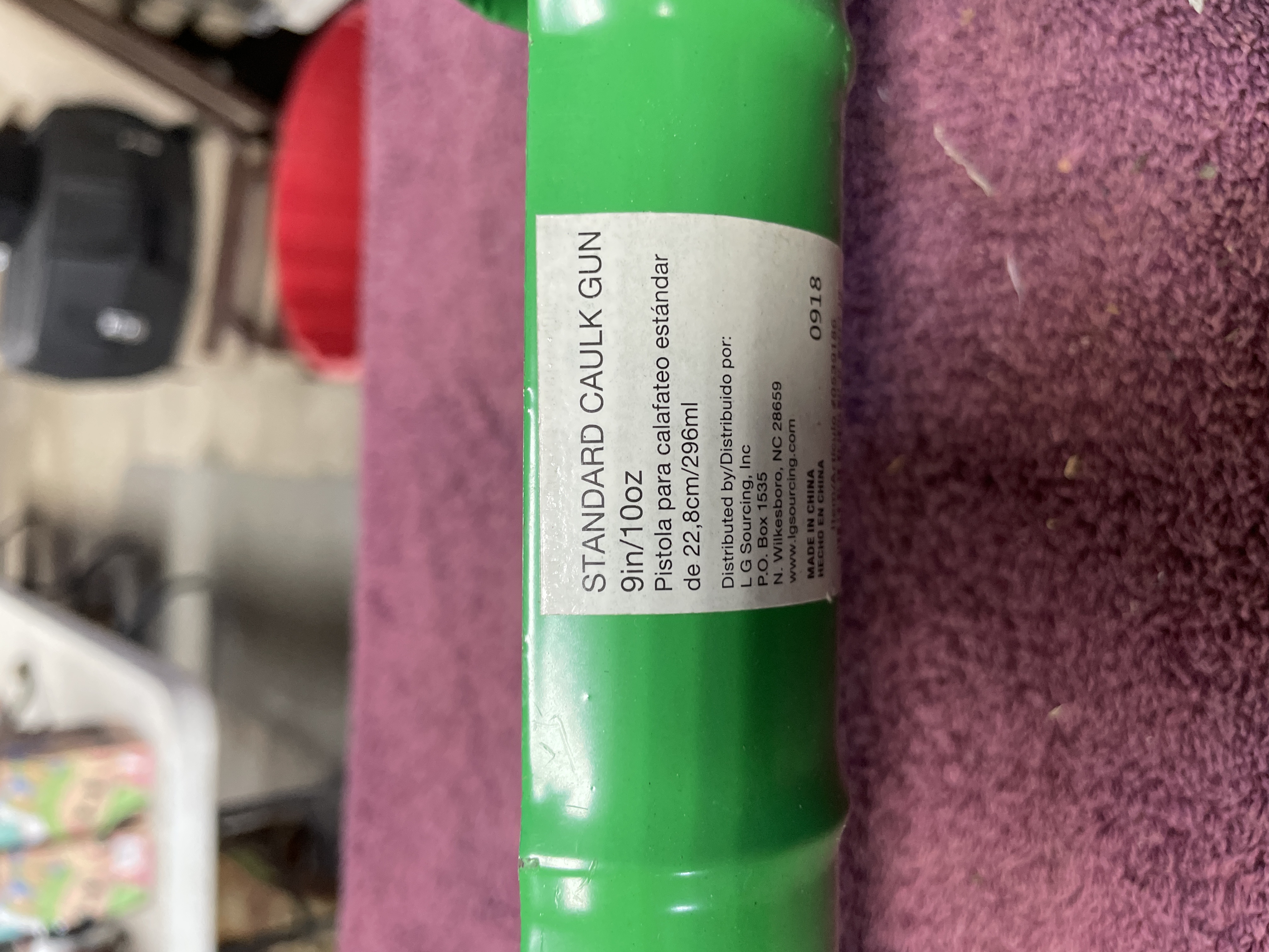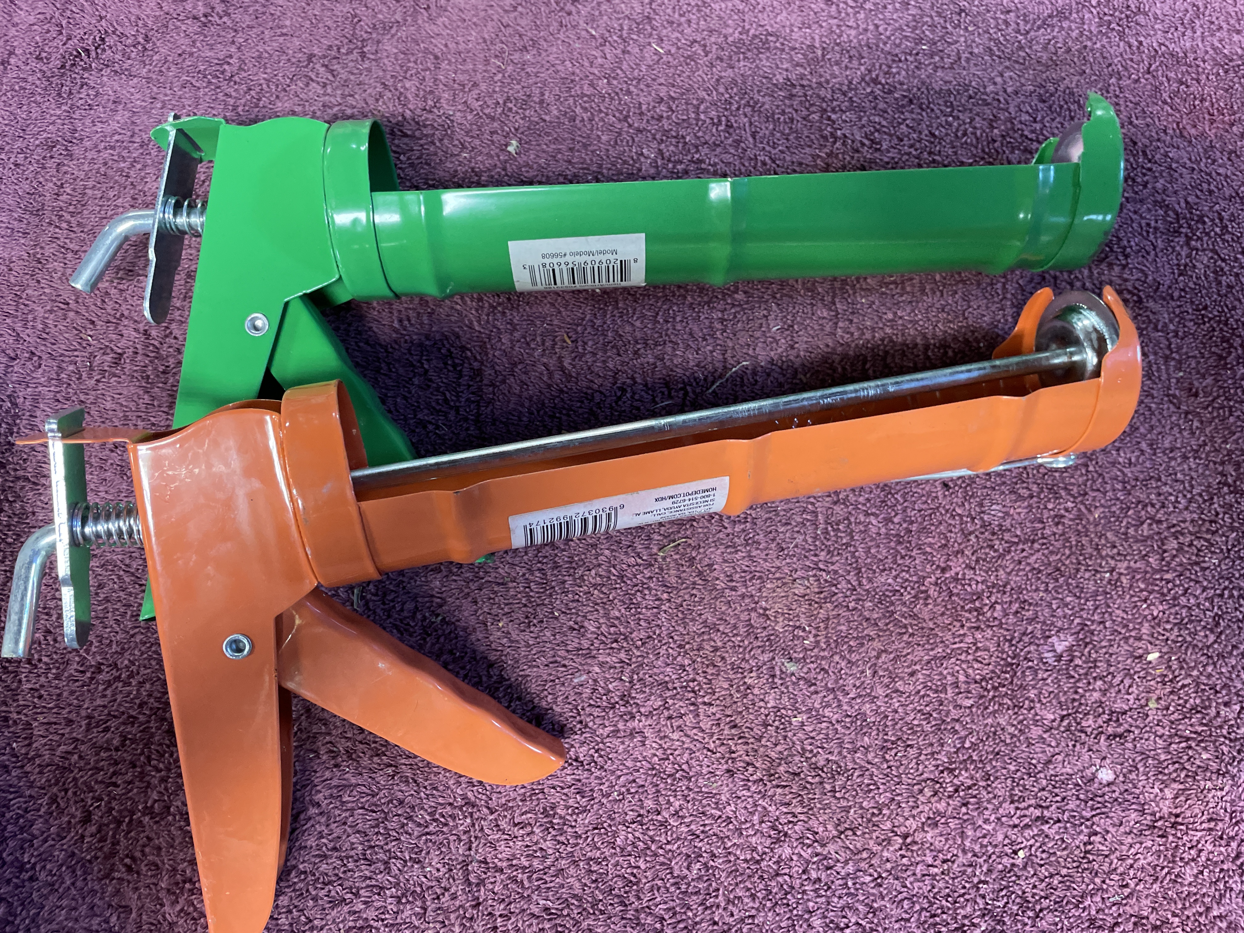 A pair of contemporary hand tools consisting of two unused caulk guns. The first item is a bright orange skeleton-frame smooth rod caulk gun, labeled HDX™ 10 oz Smooth Rod Caulk Gun (SKU 449 032), specifically recommended for use with latex caulks. The second item is a bright green full-barrel standard caulk gun, labeled as a Standard Caulk Gun (9in/10oz, 22.8cm/296mL) distributed by L G Sourcing, Inc. Both tools are constructed primarily of brightly painted metal with visible metal plunger rods and mechanisms. Both items bear retail labels stating they were Made in China (Hecho en China).