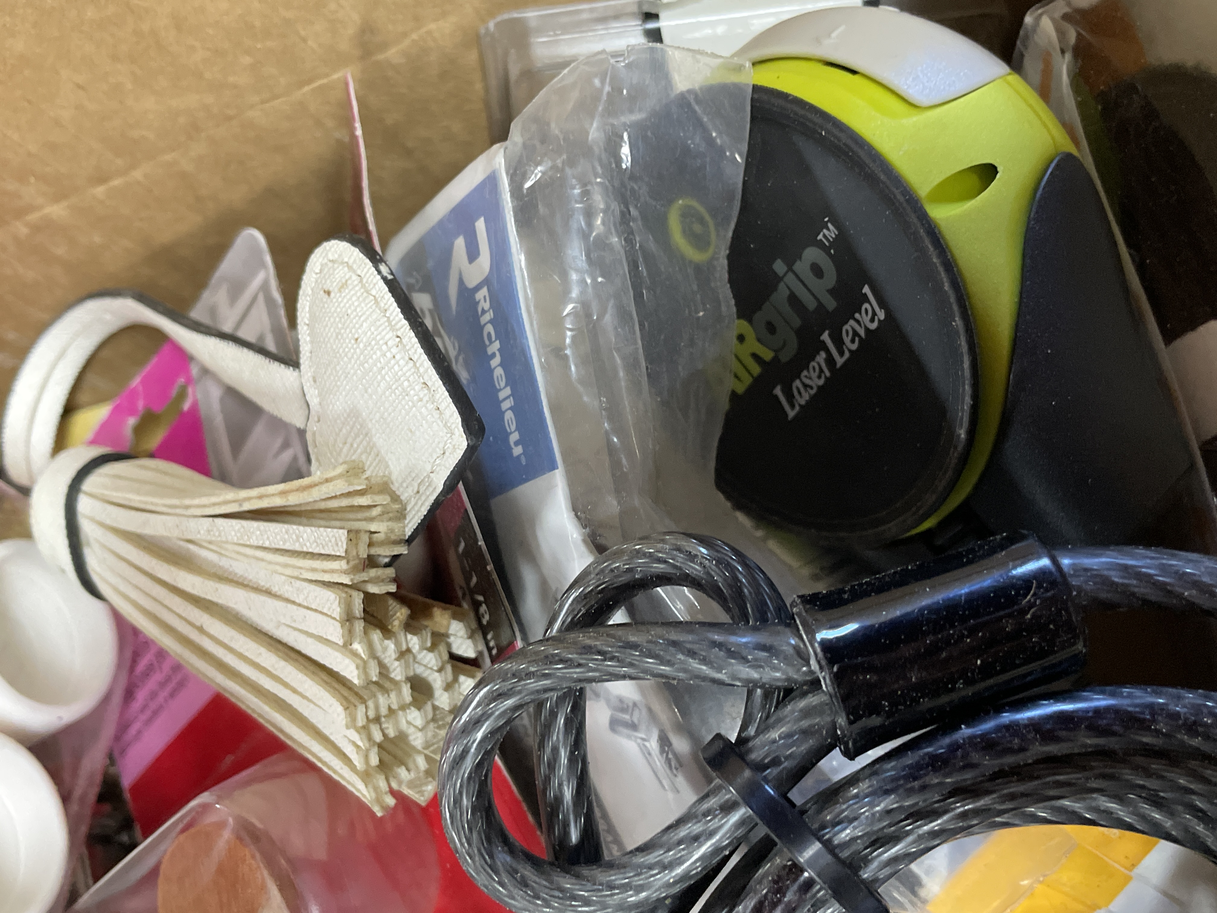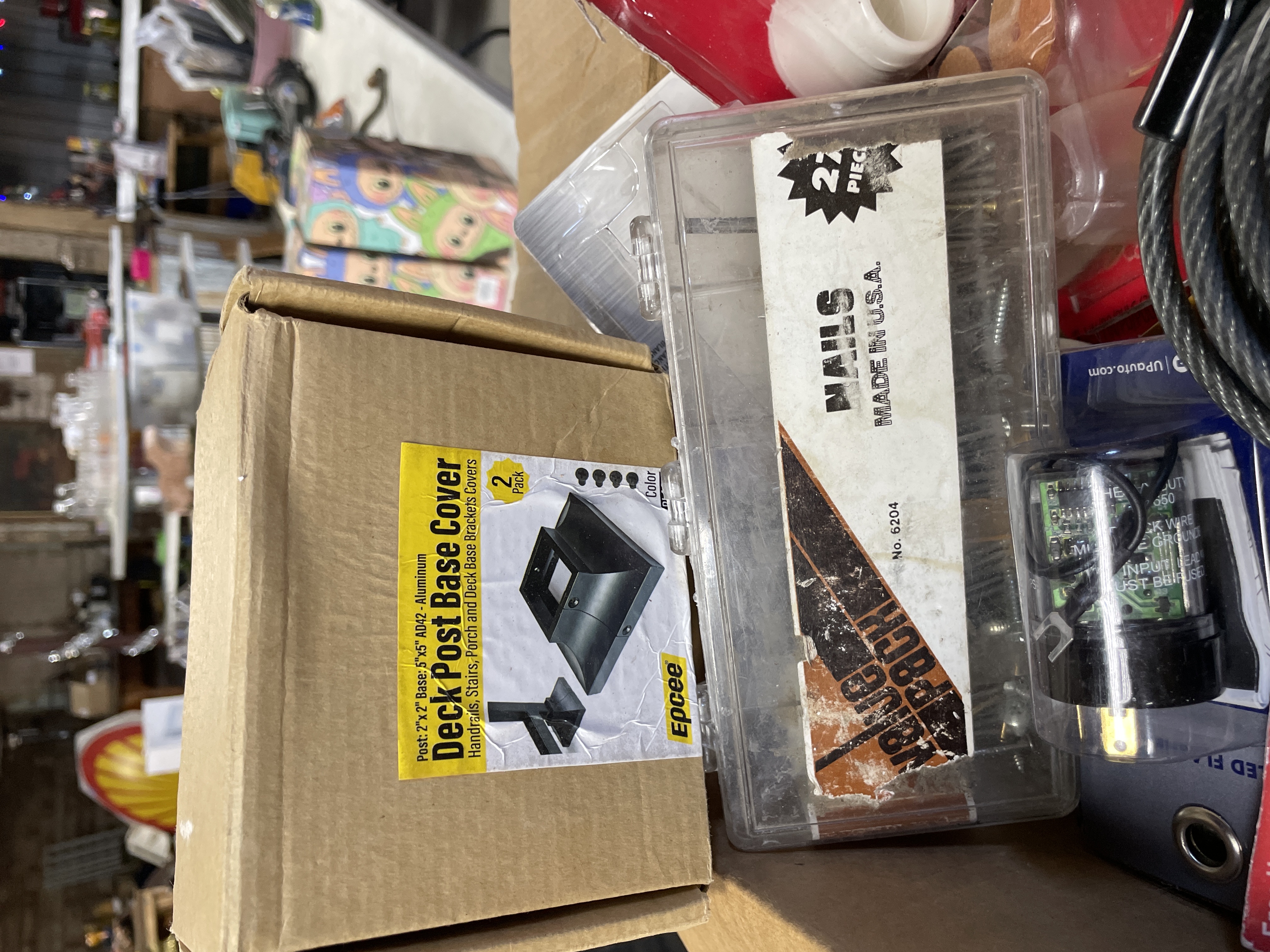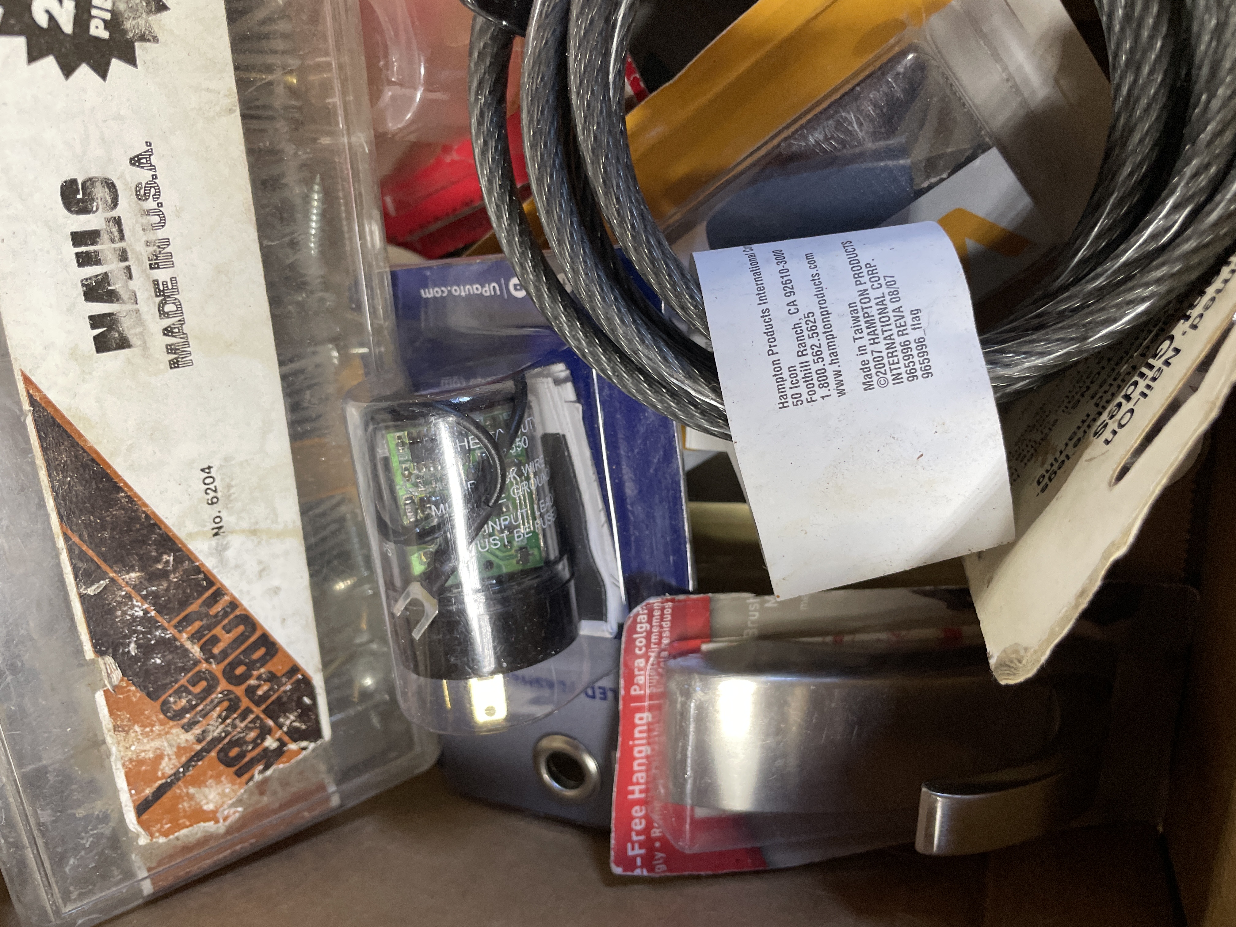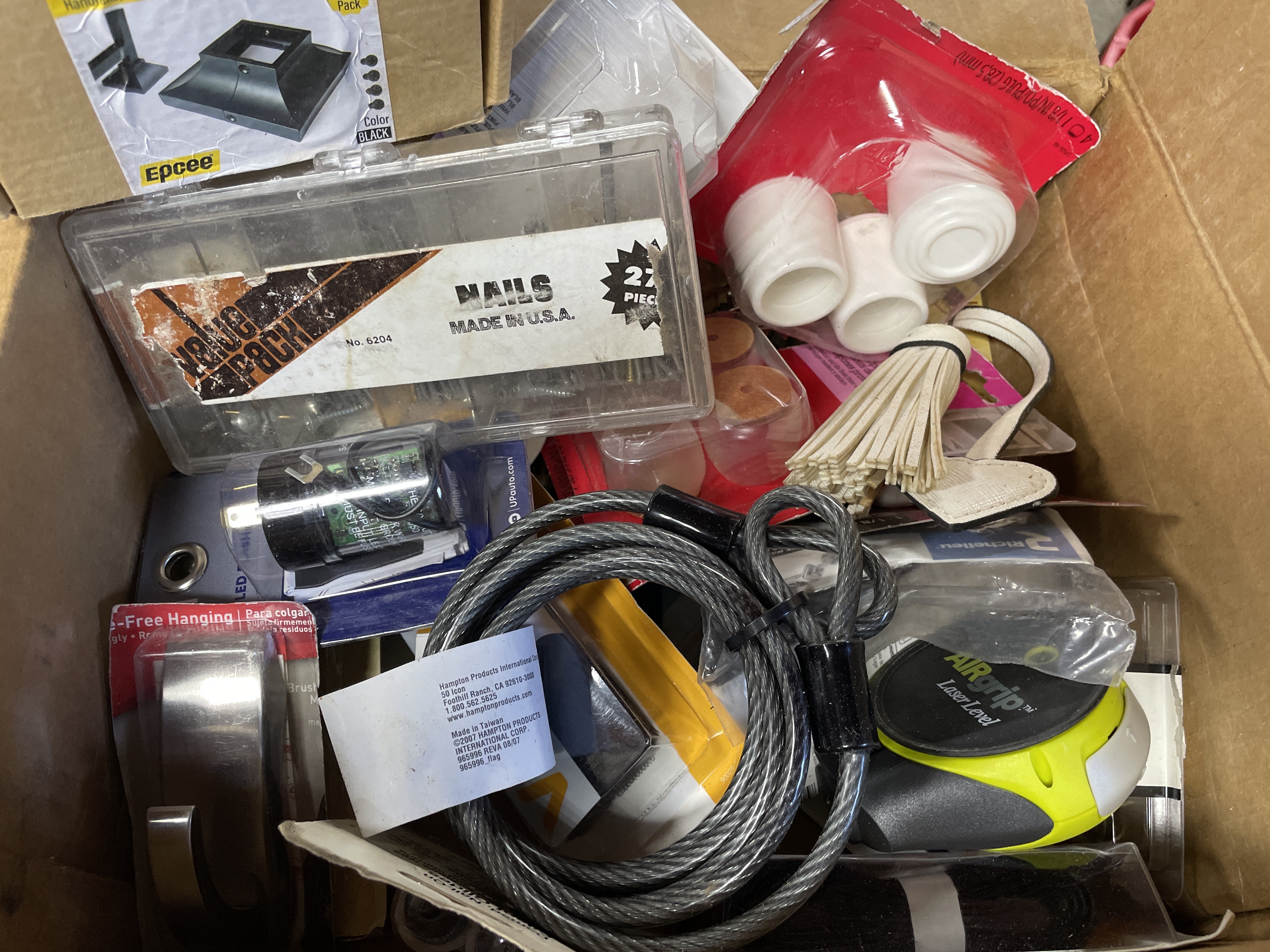 A mixed lot of 11 distinct, contemporary hardware items and accessories, primarily consisting of new or unused construction and security components. Key items include a brown cardboard box for an Epcee 2-Pack Aluminum Deck Post Base Cover (2 x 2 size), a clear plastic container holding fasteners labeled HANG PACK NAILS MADE IN U.S.A. No. 6204 (27 PIECES), and a coiled, gray plastic-coated steel cable lock. The lot also contains a fluorescent green and black plastic AirGrip Laser Level, small white plastic fixtures, a beige decorative tassel, and various blister-packaged metal hardware, electrical plugs, and components branded Richelieu and Hampton Products International. The cable lock packaging label indicates the item was Made in Taiwan.