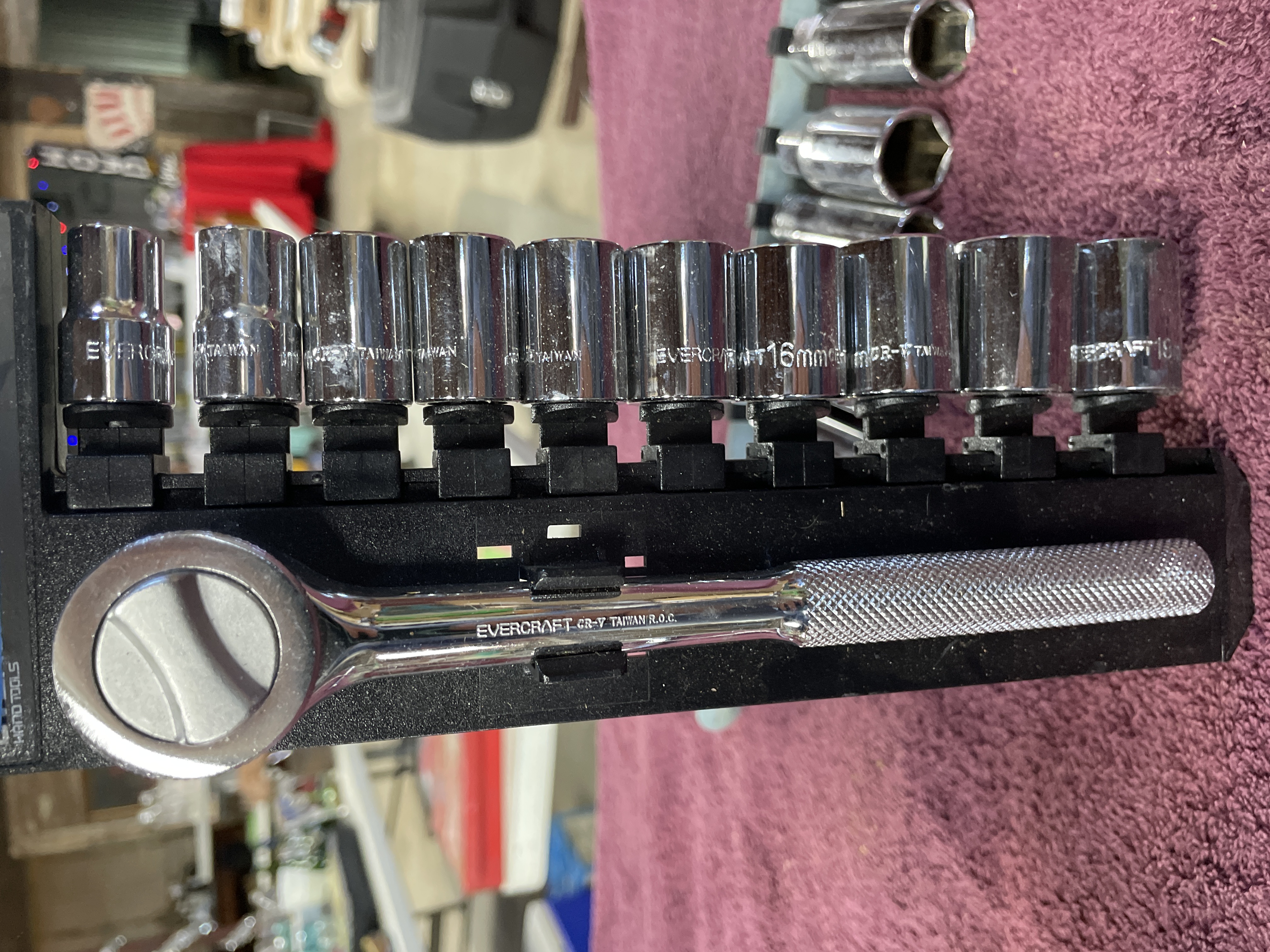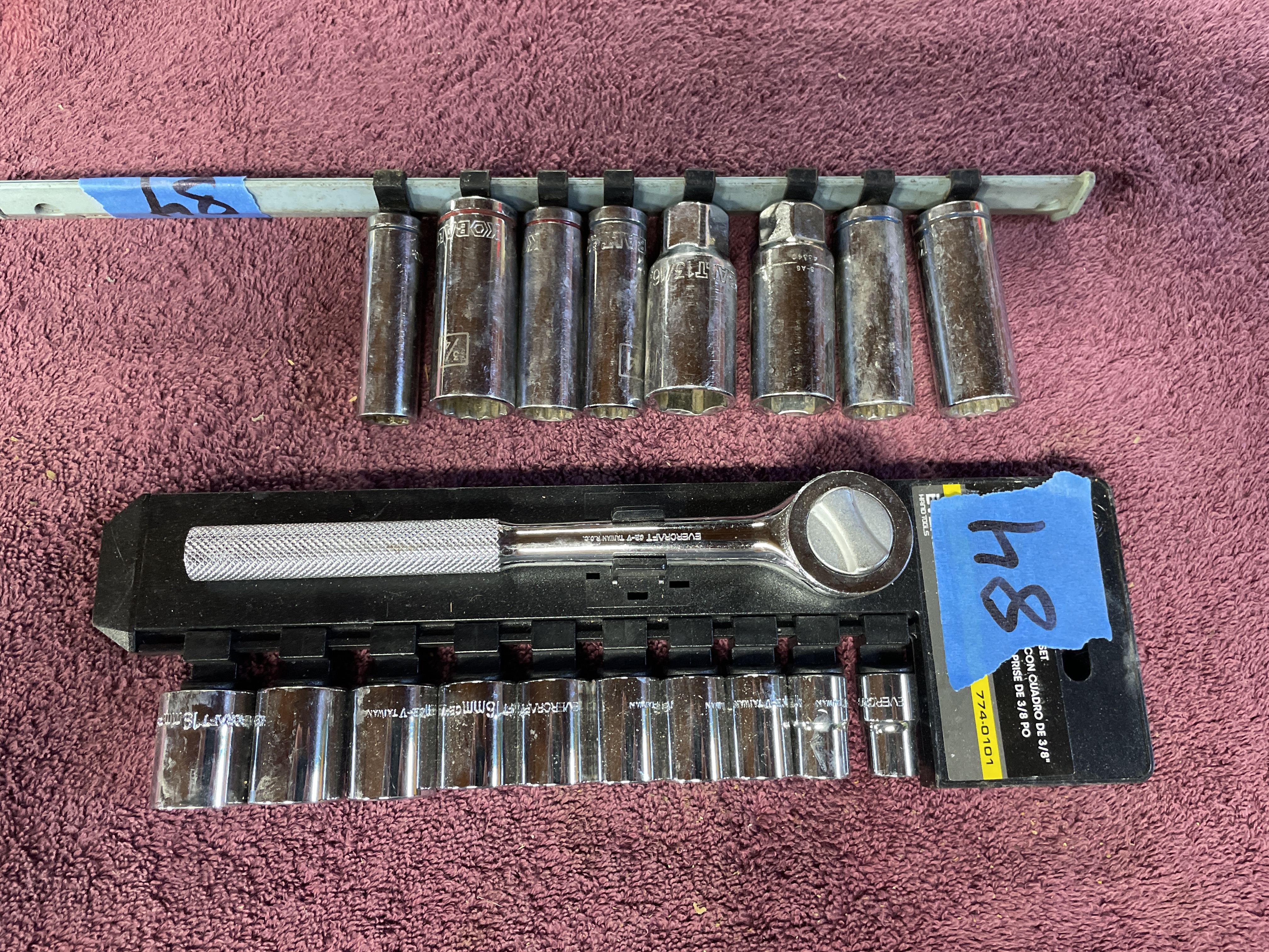 The collection consists of 17 individual mechanical hand tools, primarily 3/8-inch drive components. The lot includes one ratchet wrench and 16 deep wall sockets, organized across two separate carriers. The tools are constructed of polished chrome-plated steel. The ratchet features a knurled handle and is marked EVERCRAFT 7/8 TAIWAN 3/8. Eight sockets are mounted on a black plastic Evercraft carrier, featuring metric sizes and marked EVERCRAFT. The black plastic carrier retains a partial label indicating HAND TOOLS, item number 774-0101, and includes Spanish context text: CON CUADRO DE 3/8 (with 3/8 square drive). A handwritten blue label marked 84 is affixed to this carrier. The remaining eight sockets are mounted on a separate blue/grey metal rail. These sockets are of mixed manufacture, including tools marked KOBALT and 19MM.