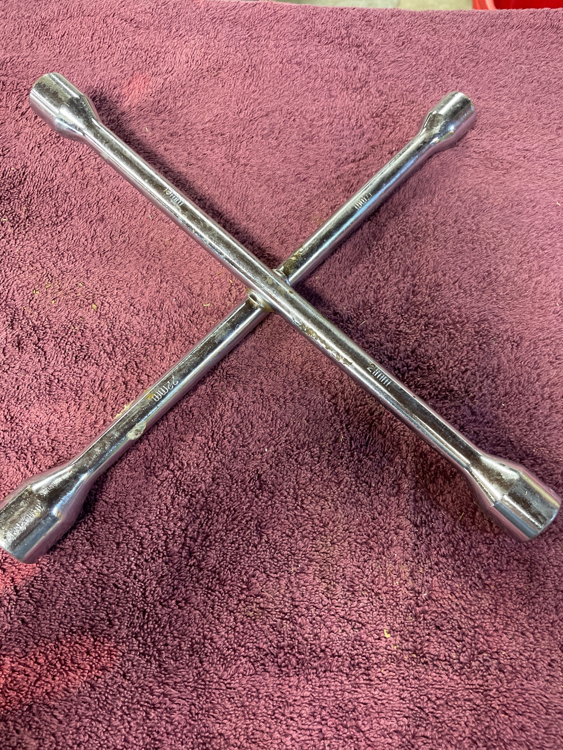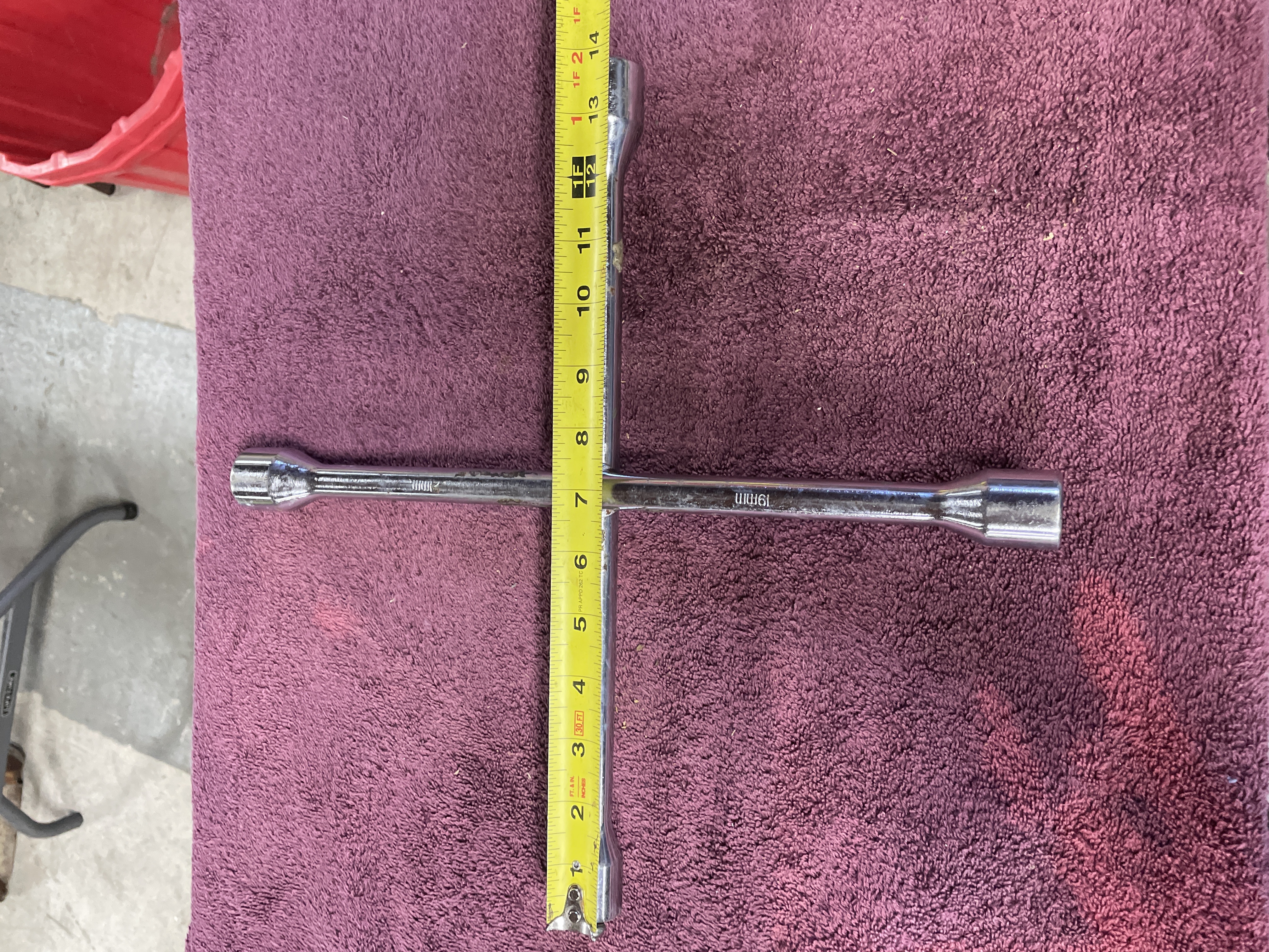 A single four-way universal lug wrench constructed of chrome-plated steel in a cross-style configuration, designed for automotive maintenance. The tool features four distinct socket sizes stamped near the ends of the arms: 17mm, 19mm, 22mm, and 11/16 inch. A numerical stamp reading ‘0003’ is visible near the center of the cross.