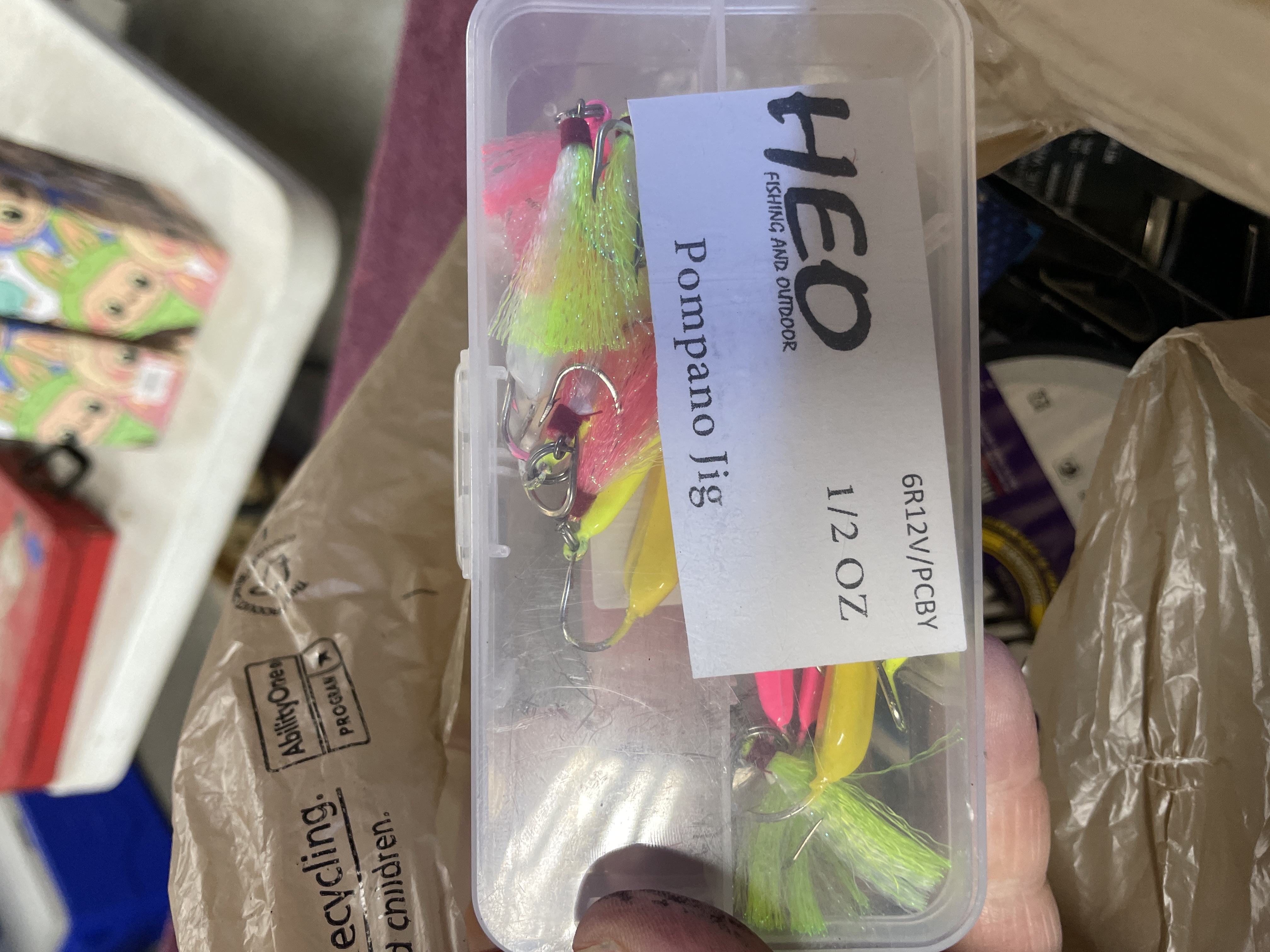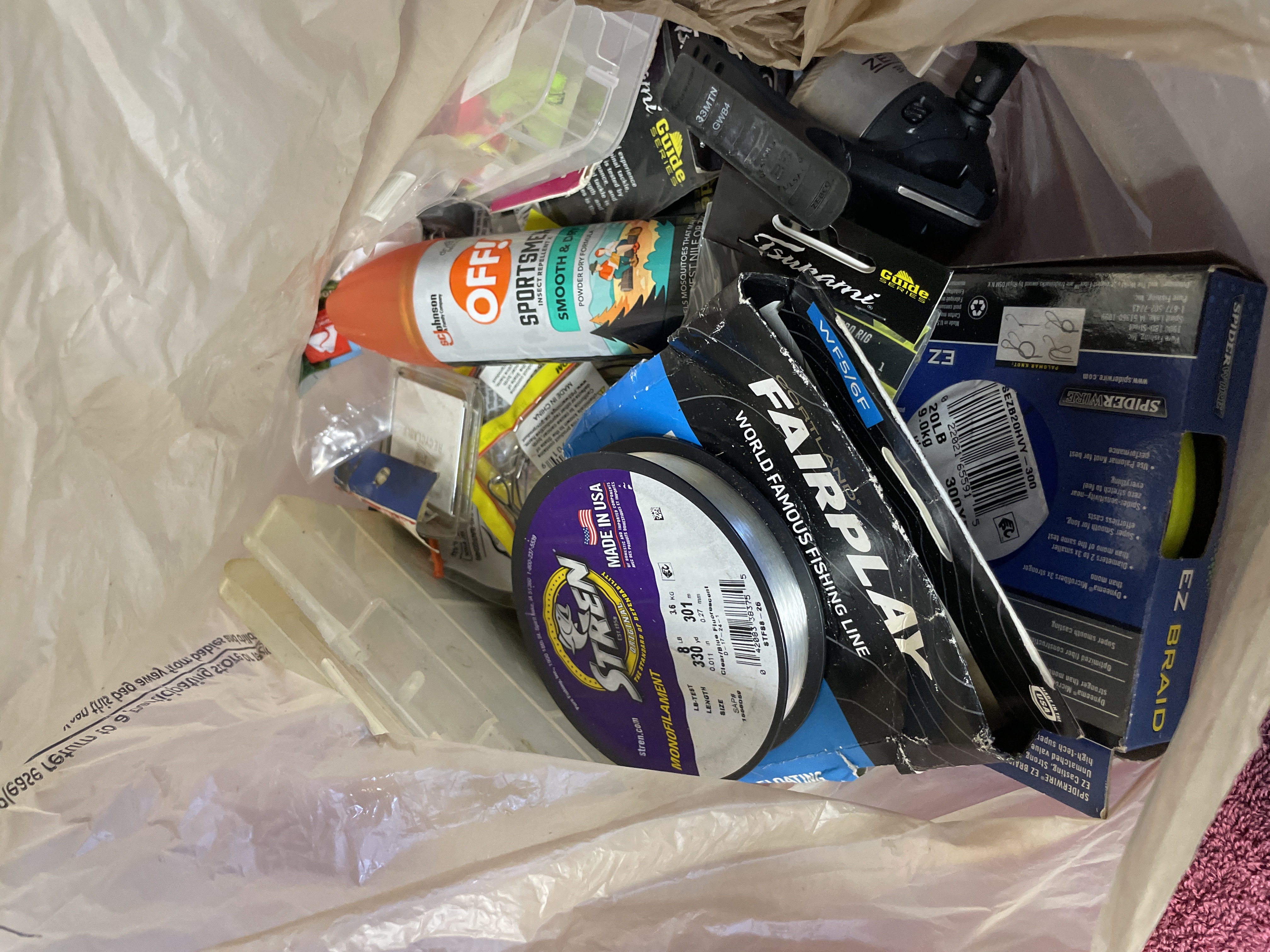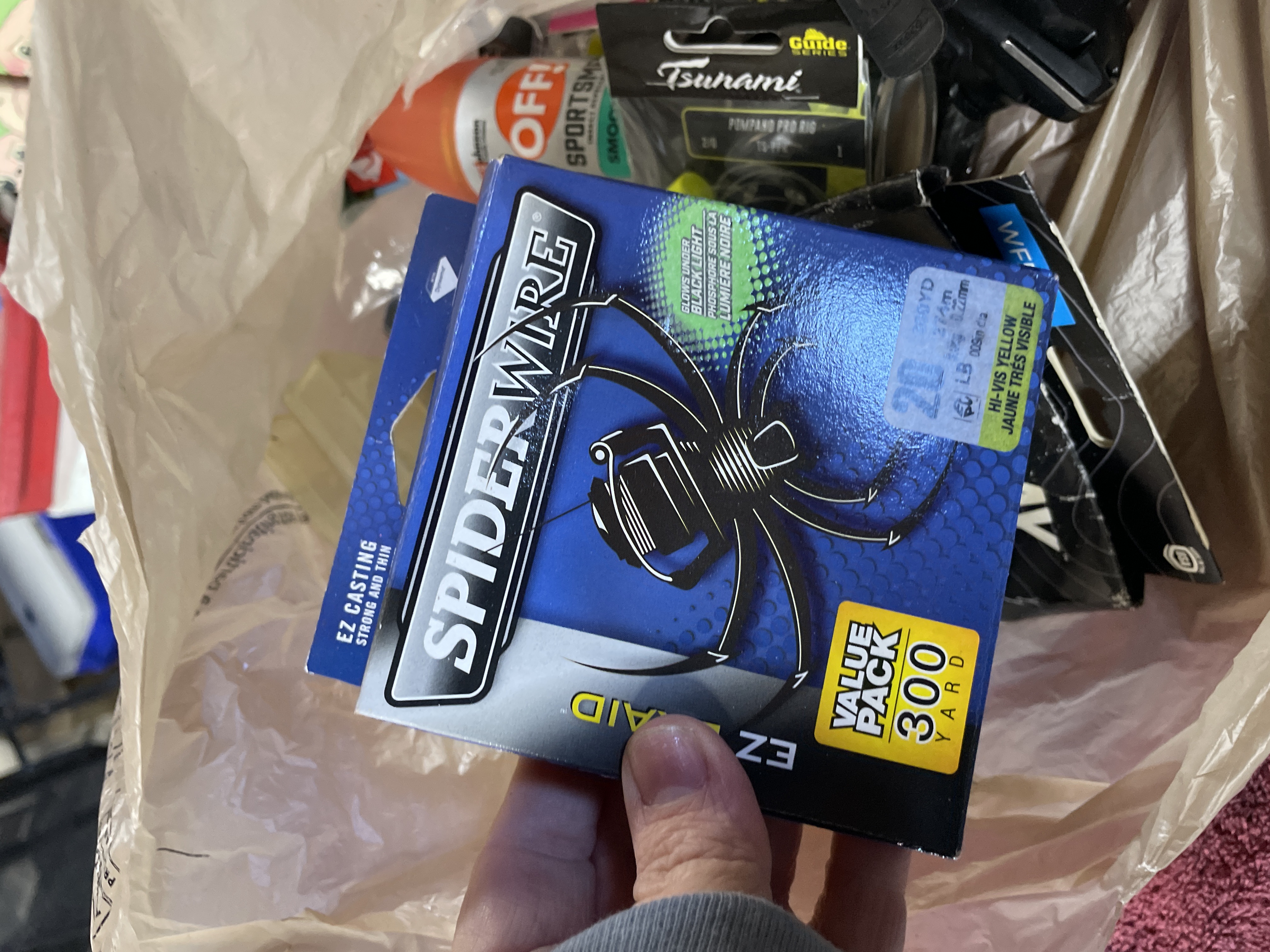 A collection of fishing equipment and accessories contained loosely within a tan plastic shopping bag. The lot primarily comprises fishing line, terminal tackle, and a spinning reel. Fishing line components include a large spool of STREN Monofilament line marked MADE IN USA, several packaged boxes of braided line including SPIDERWIRE EZ Braid Hi-Vis Yellow (300 yard Value Pack, 20 LB), and packaged line labeled FAIRPLAY. Terminal tackle includes a clear plastic utility box containing several brightly colored Pompano Jigs (1/2 OZ.) and a separate translucent utility box containing a quantity of lead split shot or weights. Also present is a partially exposed black and silver spinning fishing reel and several other packaged jigs and lures, including Tsunami branded tackle. The lot includes one ancillary item, a can of OFF! SPORTSMEN Smooth & Dry insect repellent.