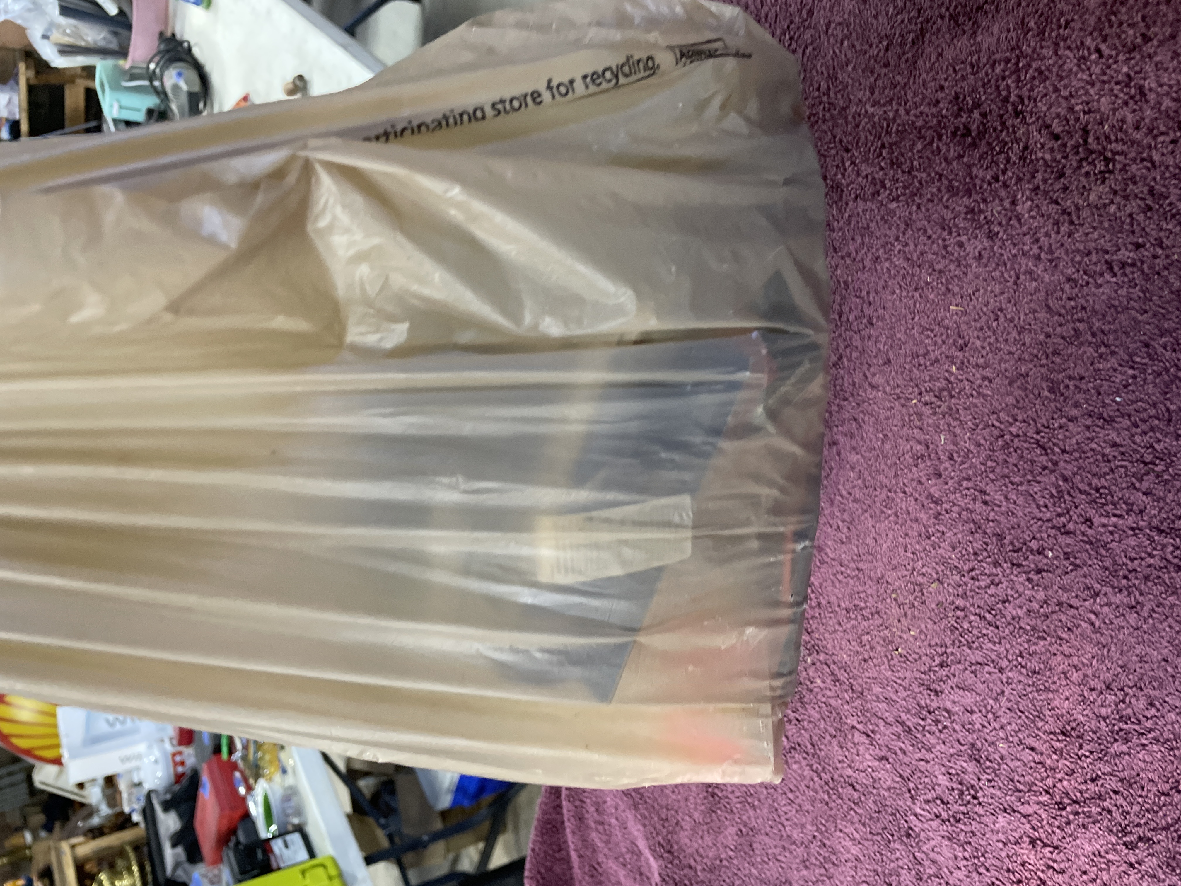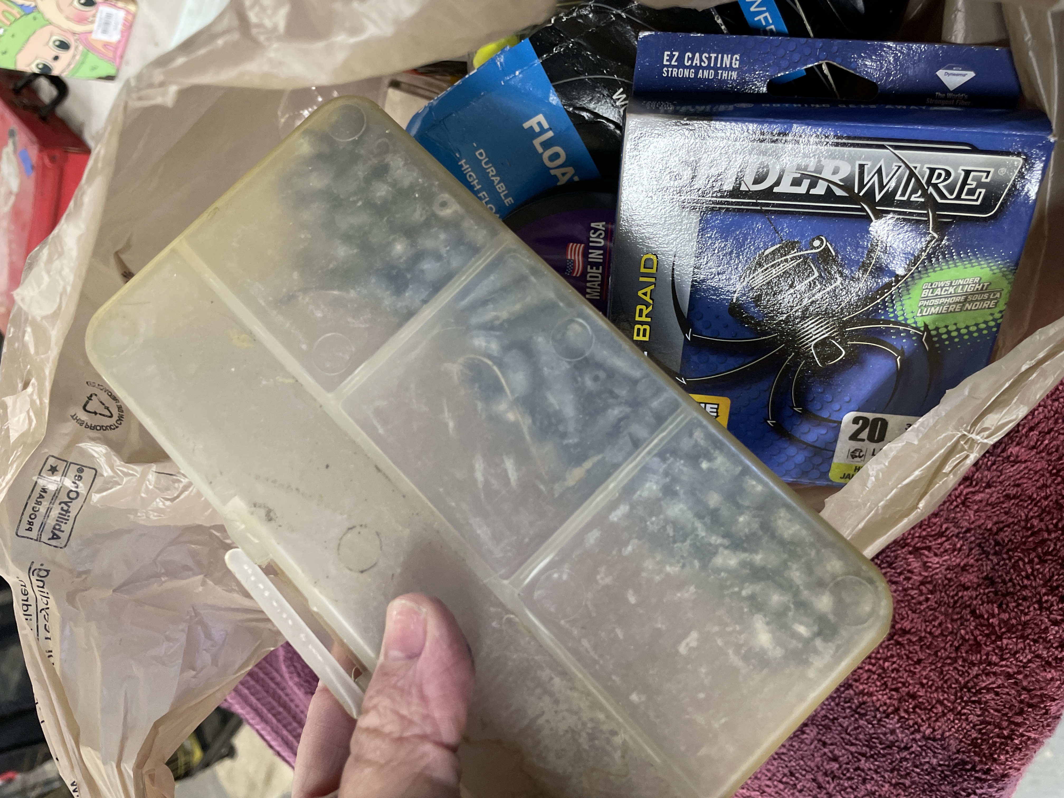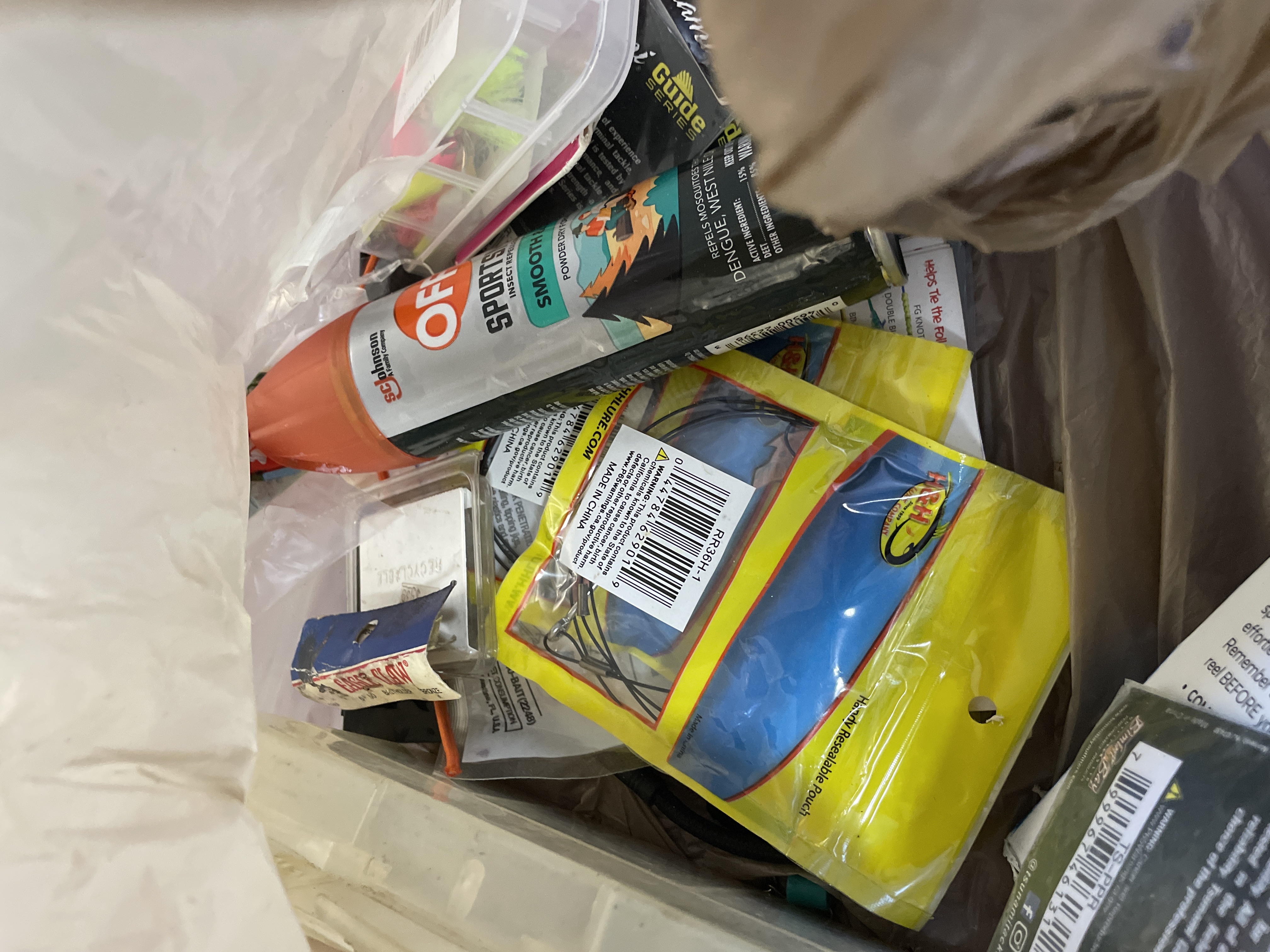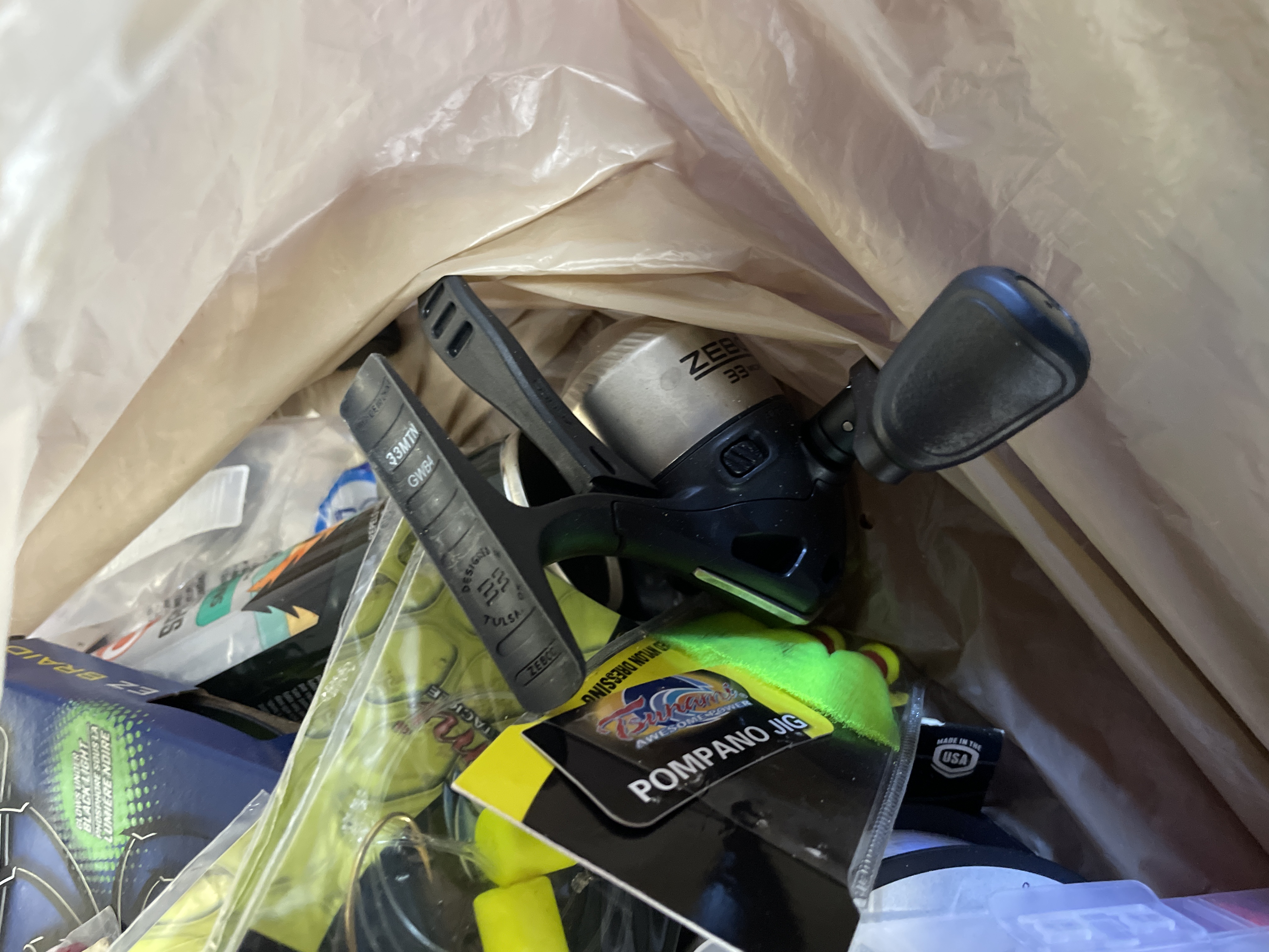 A collection of fishing equipment and accessories contained loosely within a tan plastic shopping bag. The lot primarily comprises fishing line, terminal tackle, and a spinning reel. Fishing line components include a large spool of STREN Monofilament line marked MADE IN USA, several packaged boxes of braided line including SPIDERWIRE EZ Braid Hi-Vis Yellow (300 yard Value Pack, 20 LB), and packaged line labeled FAIRPLAY. Terminal tackle includes a clear plastic utility box containing several brightly colored Pompano Jigs (1/2 OZ.) and a separate translucent utility box containing a quantity of lead split shot or weights. Also present is a partially exposed black and silver spinning fishing reel and several other packaged jigs and lures, including Tsunami branded tackle. The lot includes one ancillary item, a can of OFF! SPORTSMEN Smooth & Dry insect repellent.