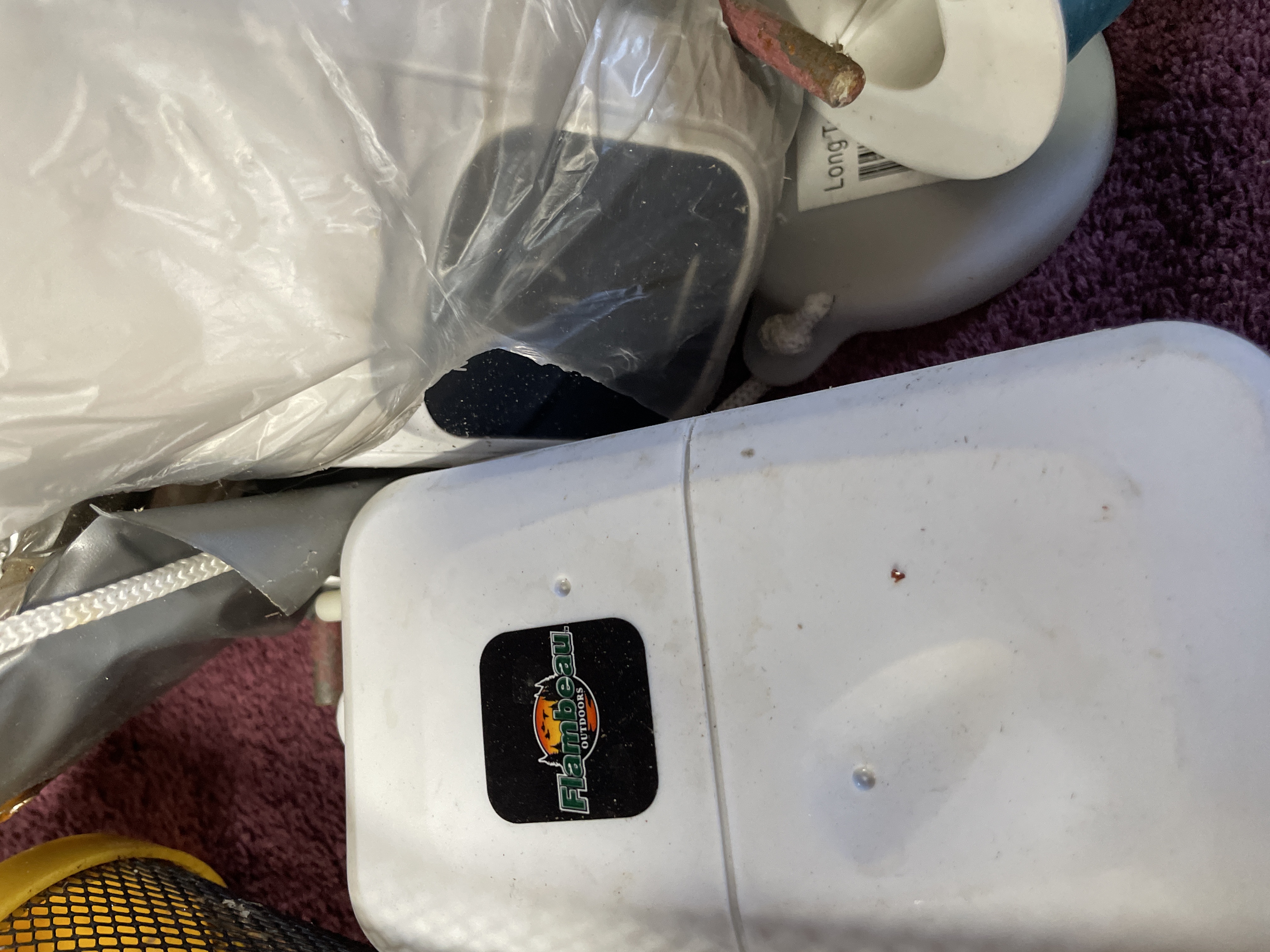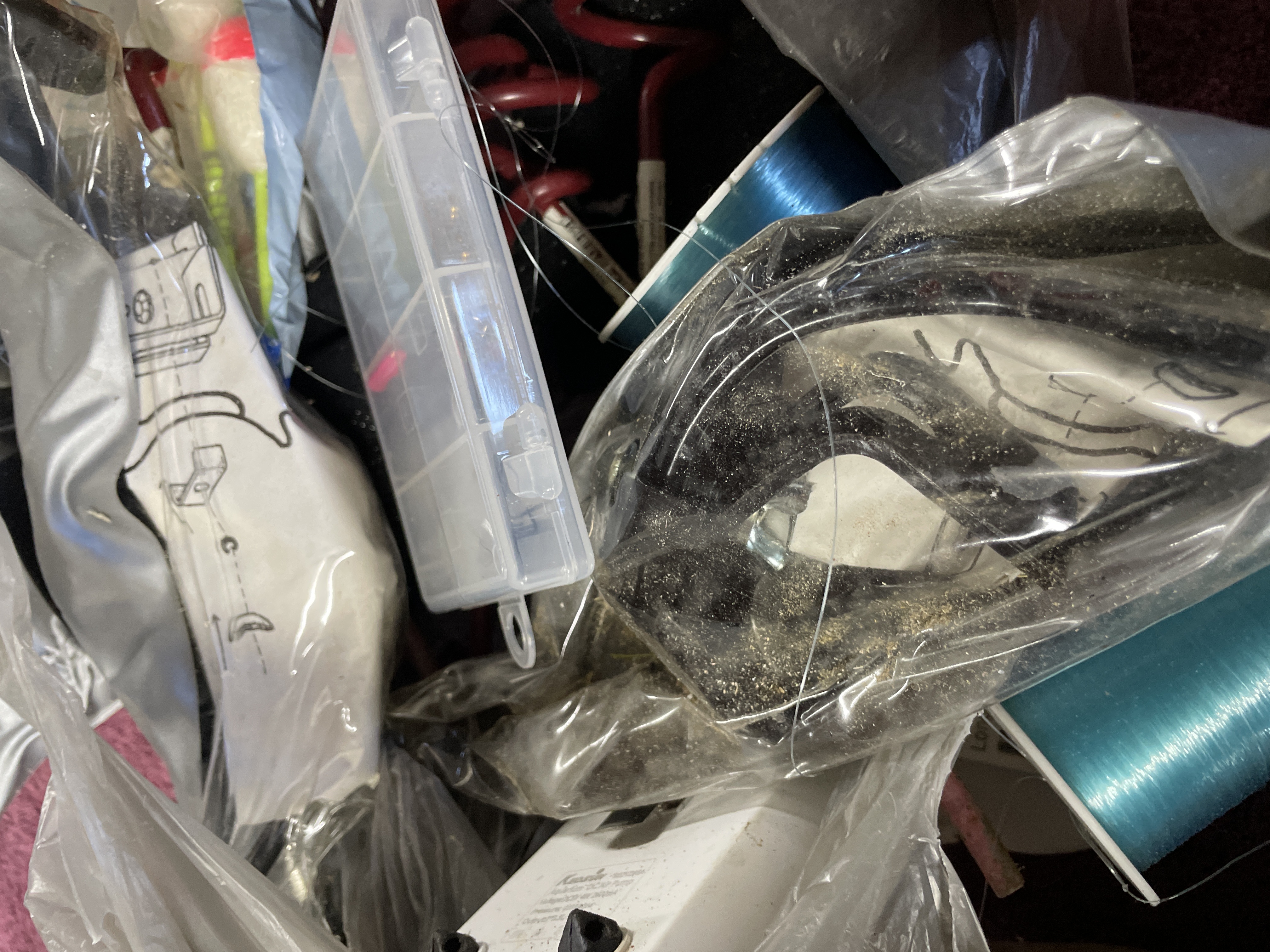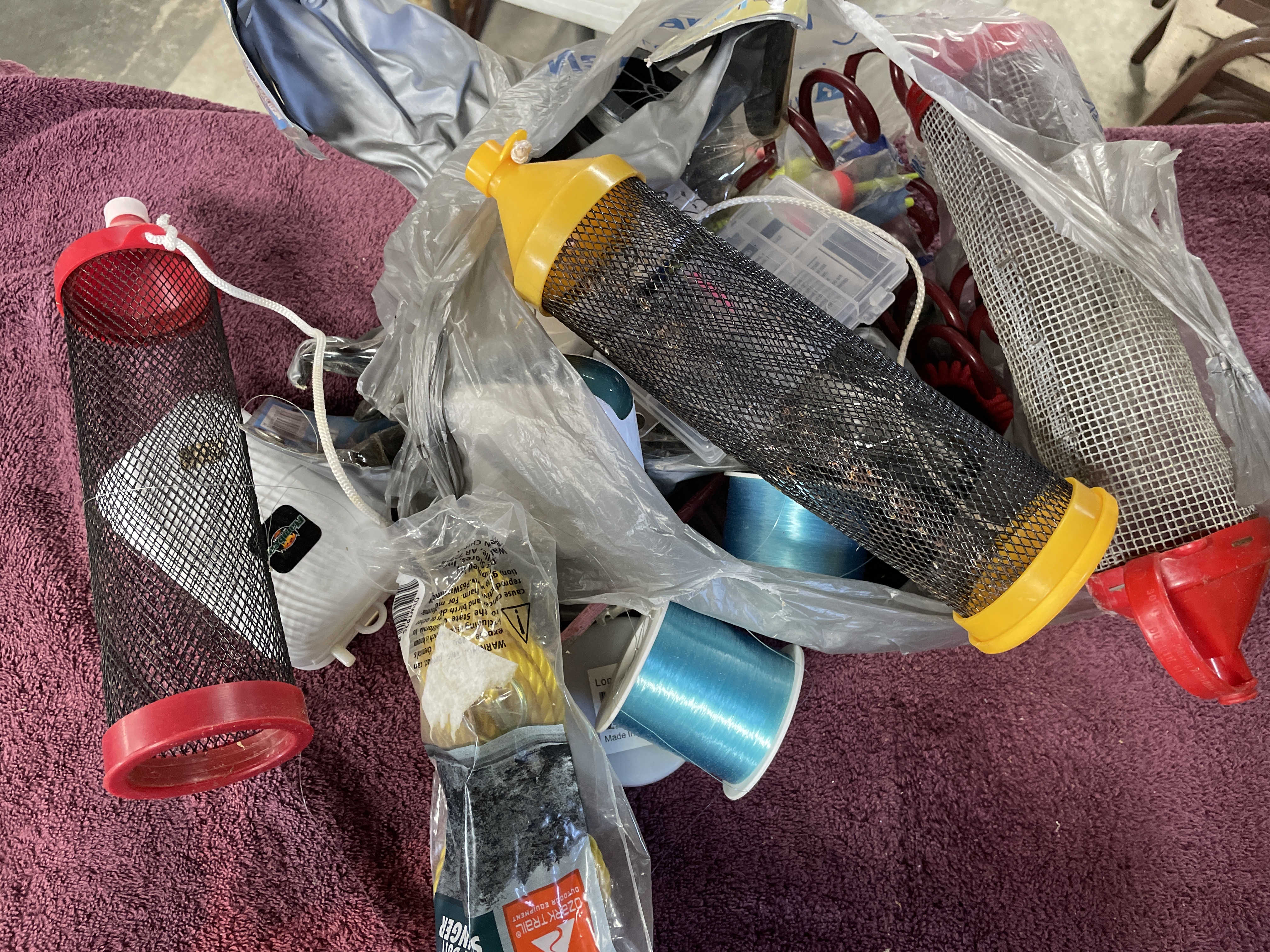 A collection fishing tackle and storage accessories. The lot includes various components constructed primarily of plastic, metal mesh, and monofilament line. Storage elements consist of one white plastic hinged box branded Flambeau OUTDOOR, and three tubular mesh storage containers, featuring mesh bodies with plastic caps (one yellow and two red). Accessories include four spools of fishing line (two blue and two black), a sealed plastic bag containing multiple red and white fishing bobbers or floats, a length of red coiled tubing, and a small, clear plastic compartmentalized box. The collection is currently contained within various plastic bags and shows signs of disorganization.