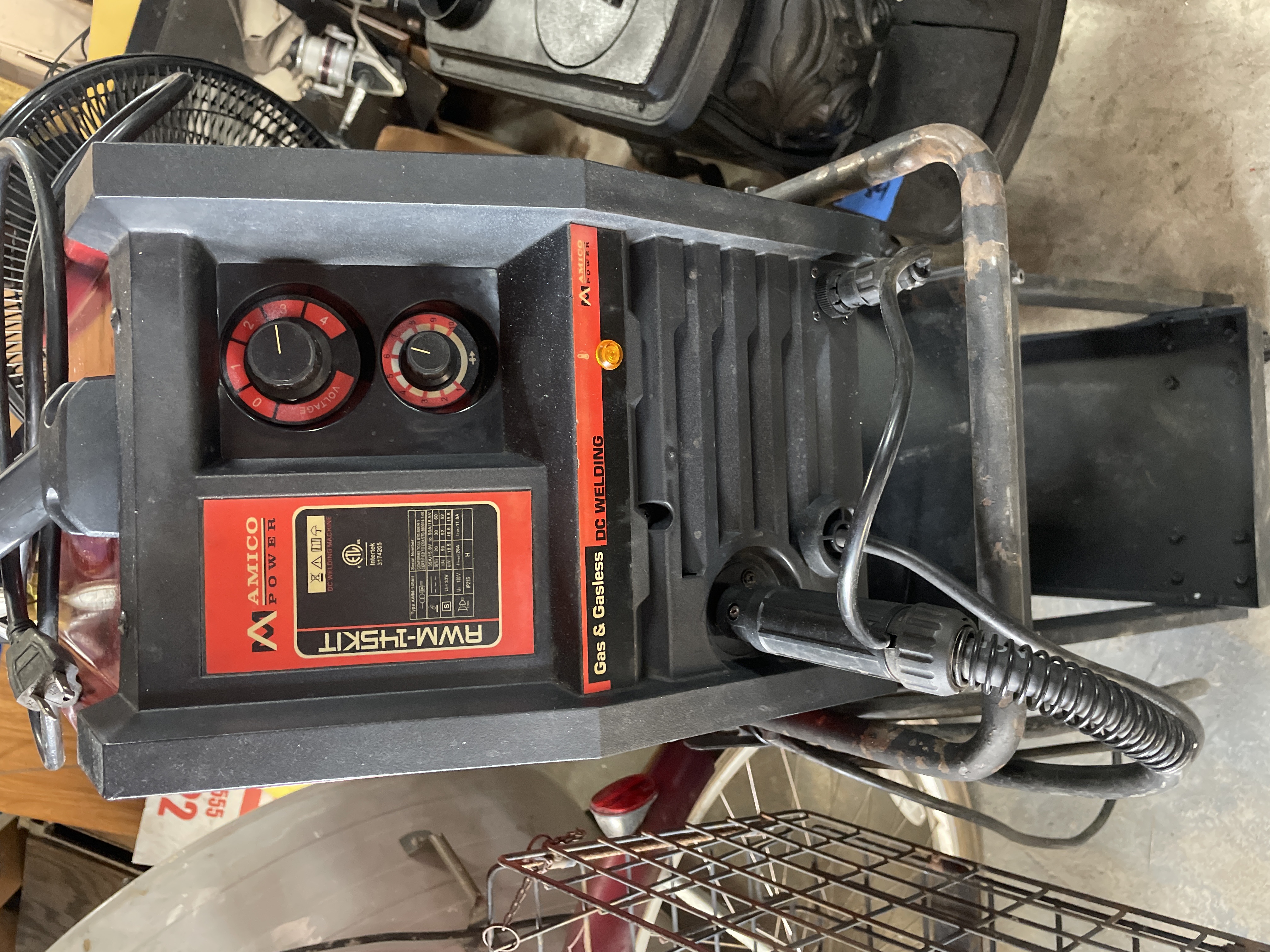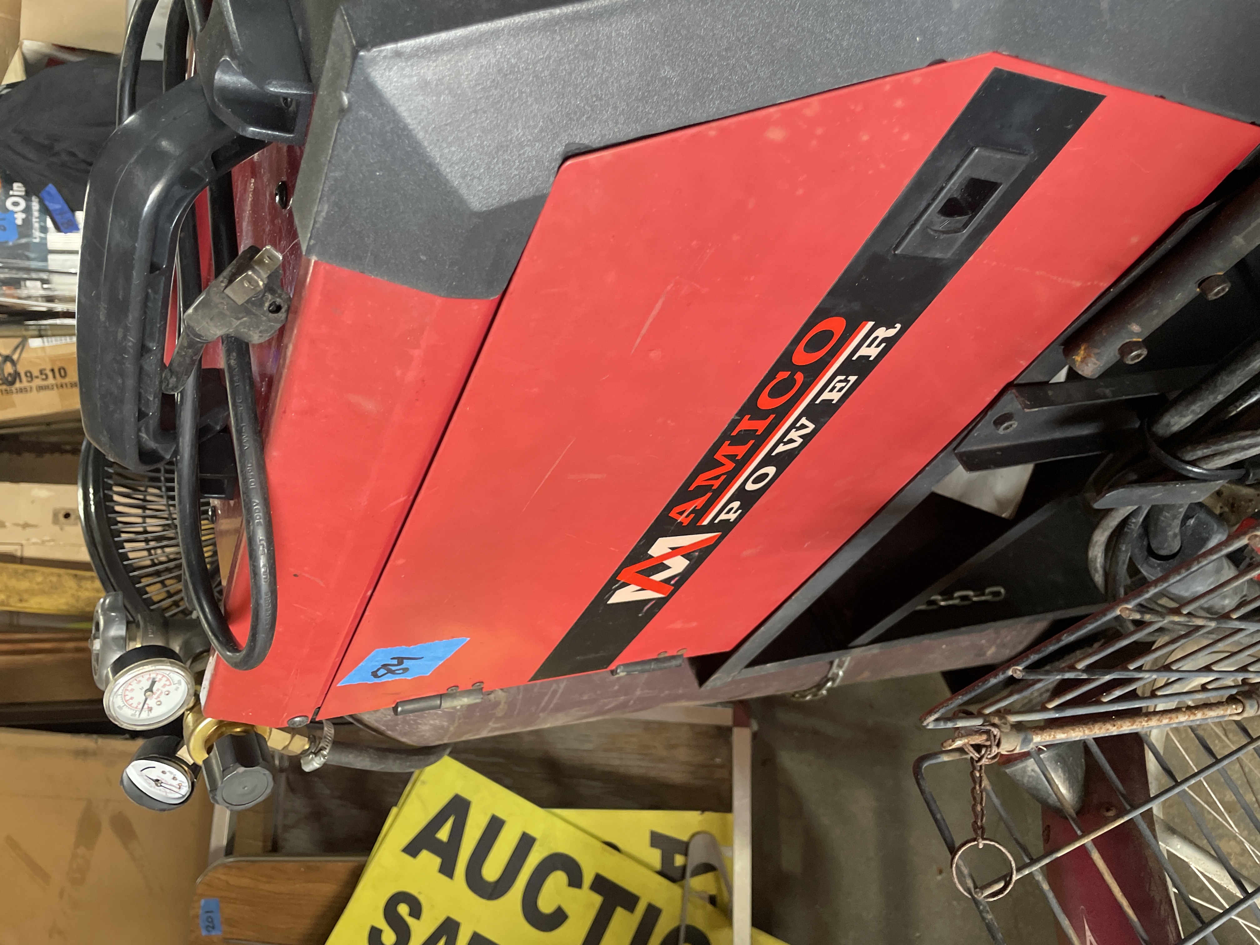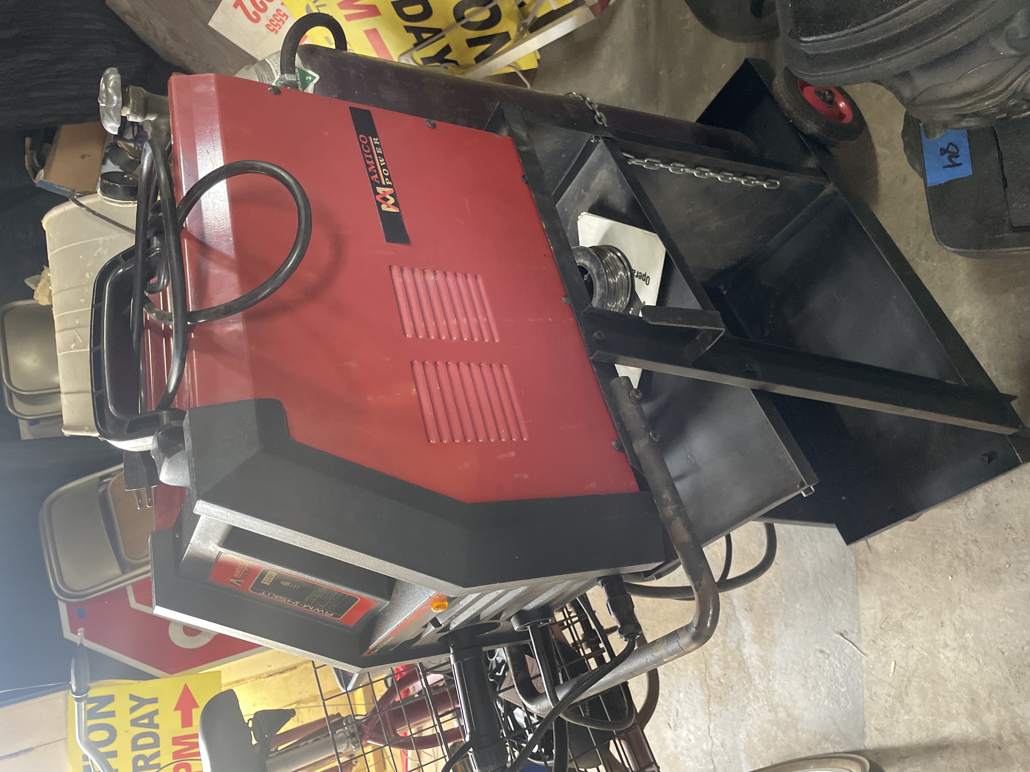 A AMICO POWER RWM-145KIT Gas & Gasless DC Welding Machine. The welder features a red and black composite casing with operational dials for Voltage and current settings visible on the front panel. The machine is mounted upon a black painted metal rolling cart equipped with two storage shelves and wheels. The lot includes a large, reddish-brown industrial gas cylinder secured to the side of the cart via a metal chain, fitted with a brass regulator manifold displaying two pressure gauges. Also included are the associated welding leads and torch assembly. Visible identification includes the model number RWM-145KIT and the branding AMICO POWER on the machine casing. A manufacturer’s label on the front panel provides specifications, including Type RWM-145KIT and DC Welding.
