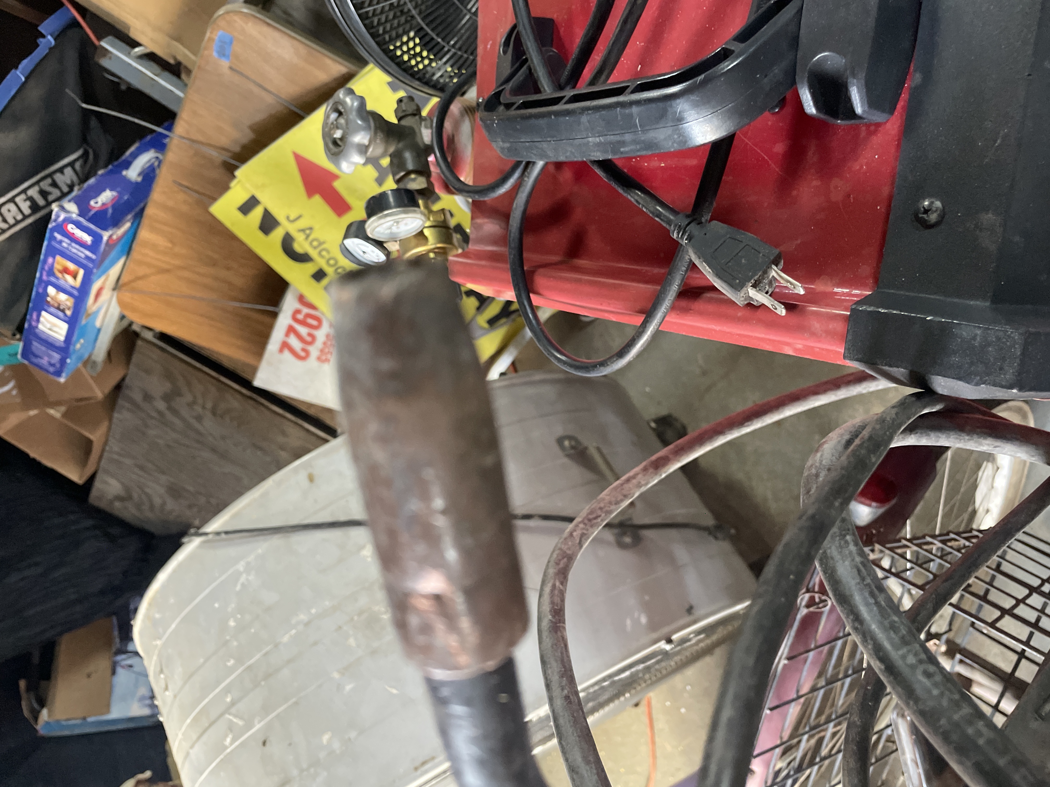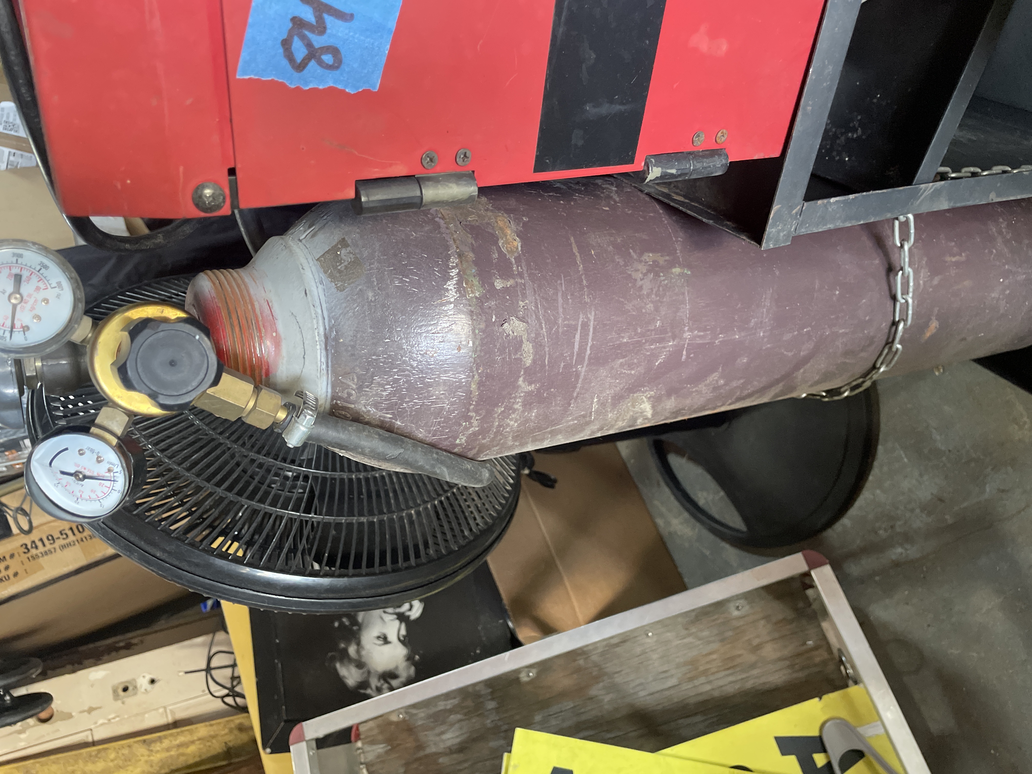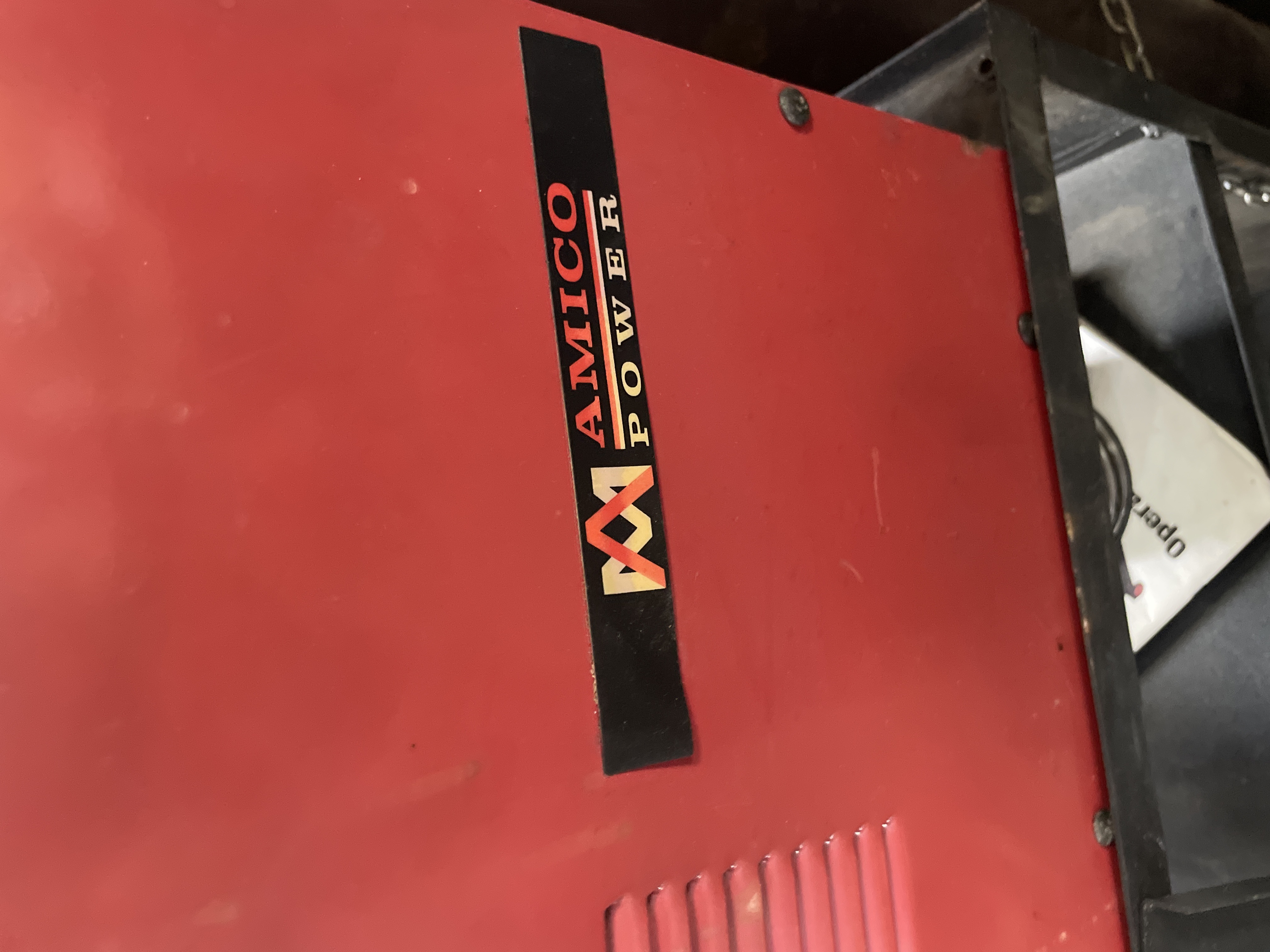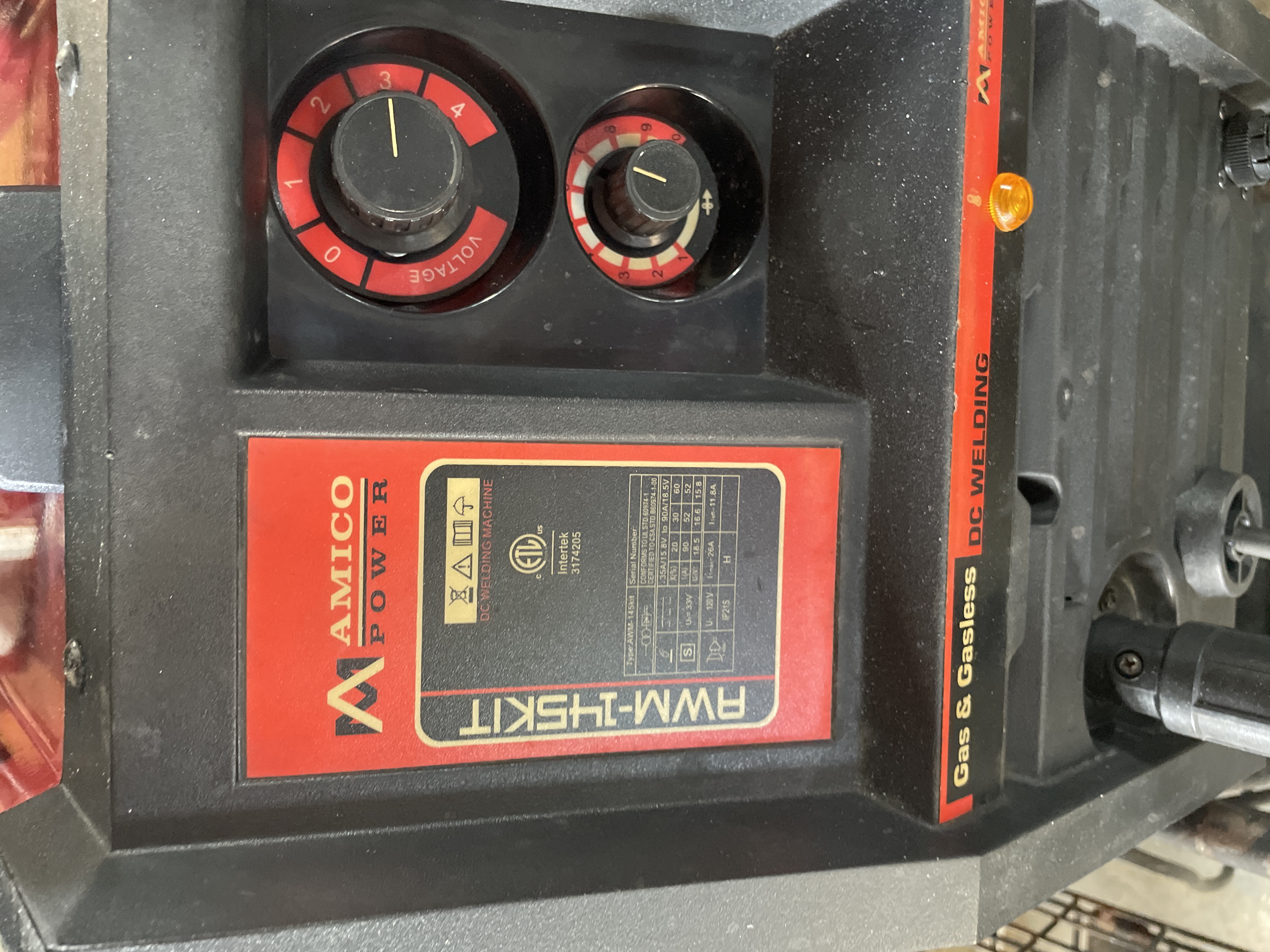 A AMICO POWER RWM-145KIT Gas & Gasless DC Welding Machine. The welder features a red and black composite casing with operational dials for Voltage and current settings visible on the front panel. The machine is mounted upon a black painted metal rolling cart equipped with two storage shelves and wheels. The lot includes a large, reddish-brown industrial gas cylinder secured to the side of the cart via a metal chain, fitted with a brass regulator manifold displaying two pressure gauges. Also included are the associated welding leads and torch assembly. Visible identification includes the model number RWM-145KIT and the branding AMICO POWER on the machine casing. A manufacturer’s label on the front panel provides specifications, including Type RWM-145KIT and DC Welding.