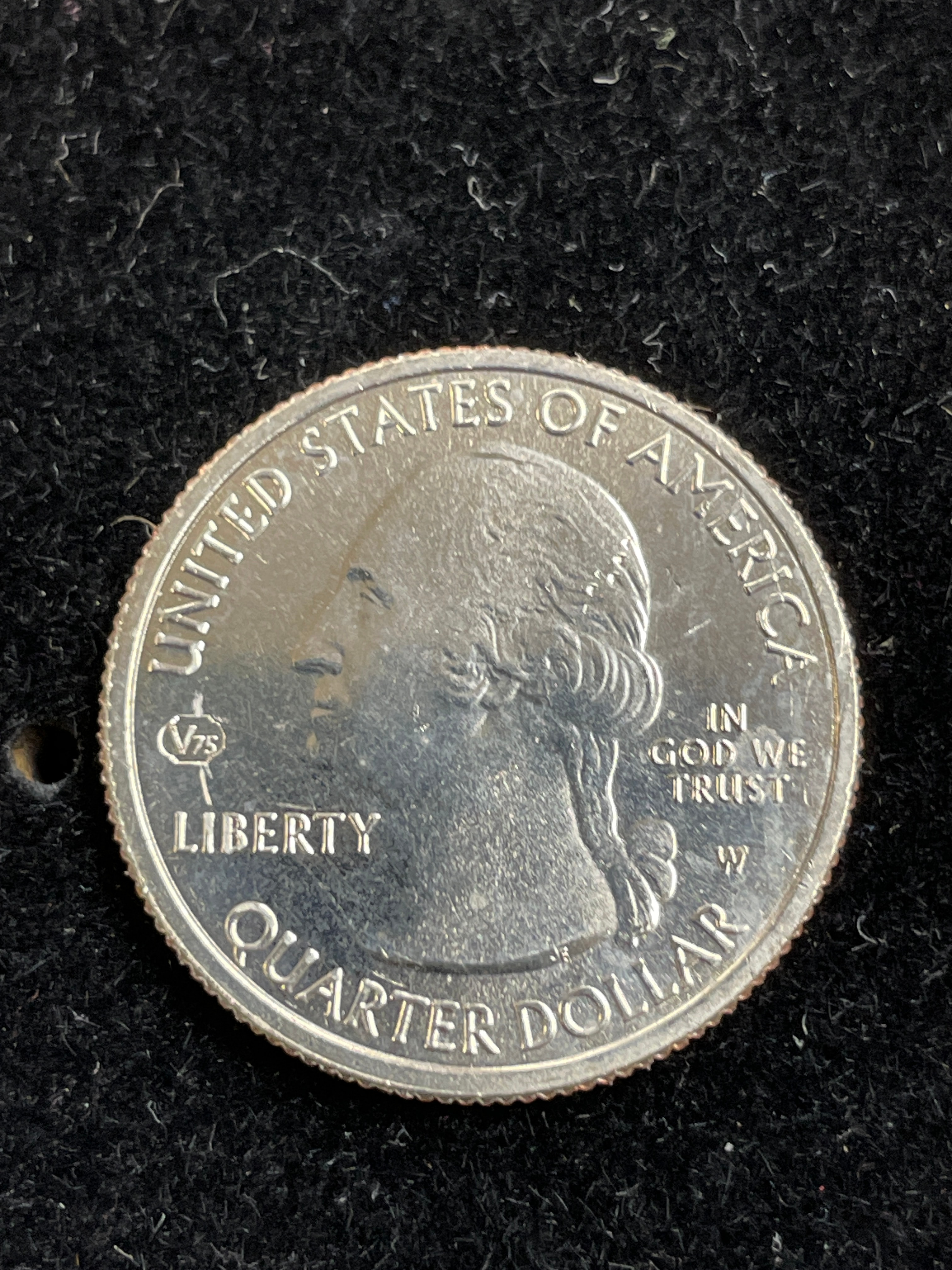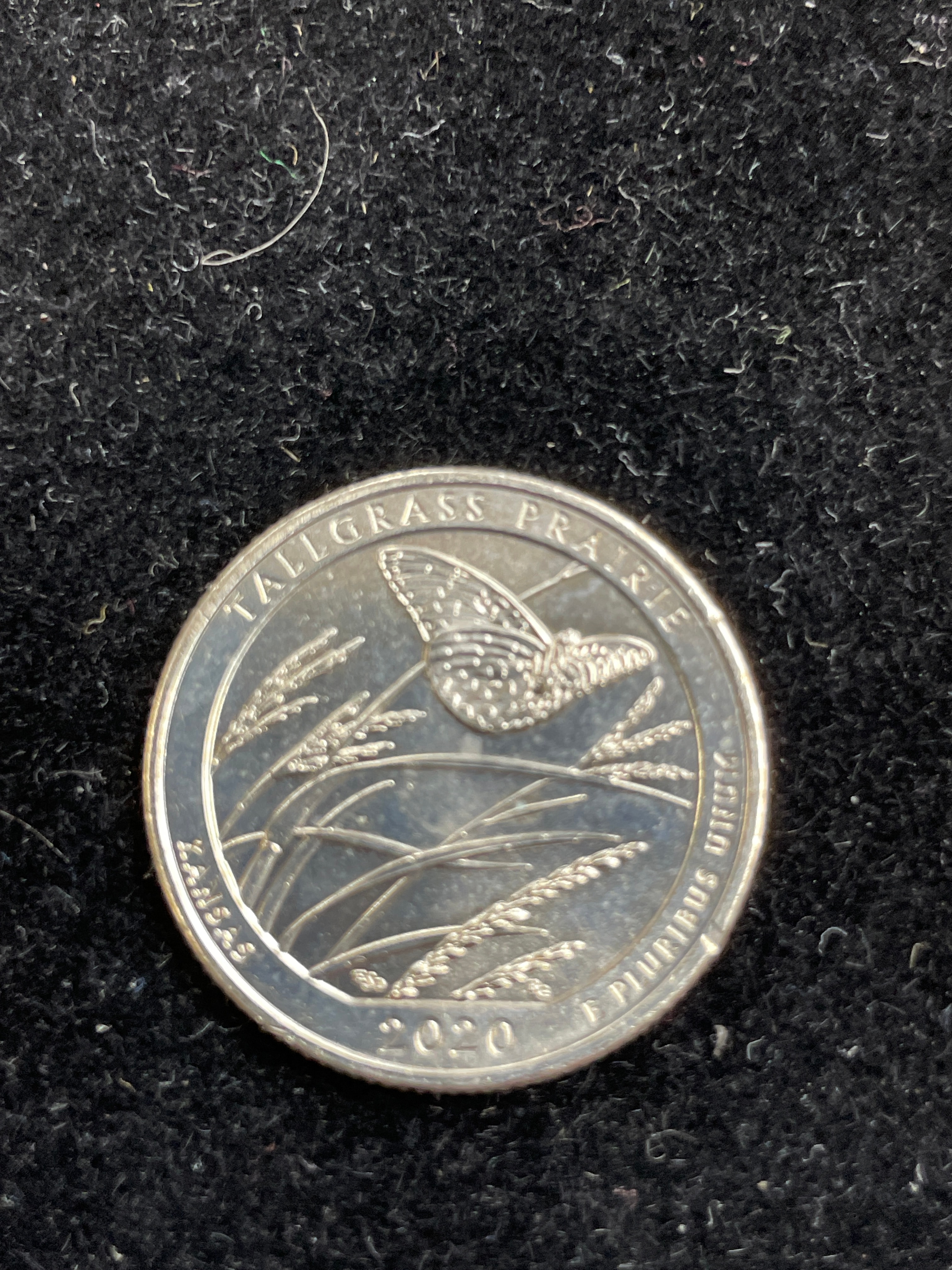 A 2020 ‘America the Beautiful’ series quarter dollar coin, issued for Tallgrass Prairie, Kansas. The obverse features a bust of George Washington, encircled by ‘UNITED STATES OF AMERICA’ and ‘QUARTER DOLLAR,’ with ‘LIBERTY,’ ‘IN GOD WE TRUST,’ a ‘W’ mint mark, and a ‘V75’ privy mark. The reverse depicts a butterfly on tallgrass, inscribed with ‘TALLGRASS PRAIRIE,’ ‘KANSAS,’ ‘2020,’ and ‘E PLURIBUS UNUM’ (Latin for ‘Out of many, one’).