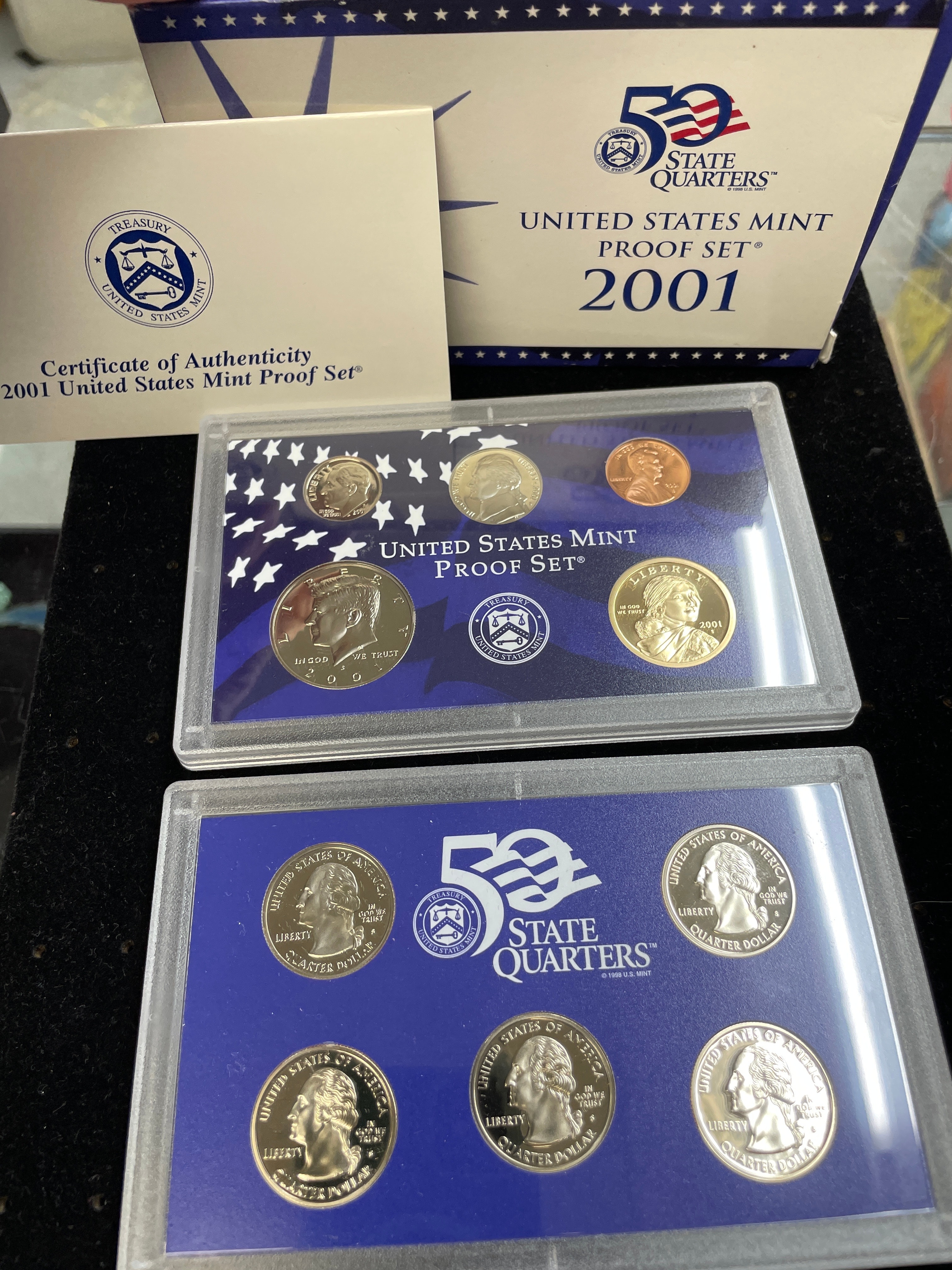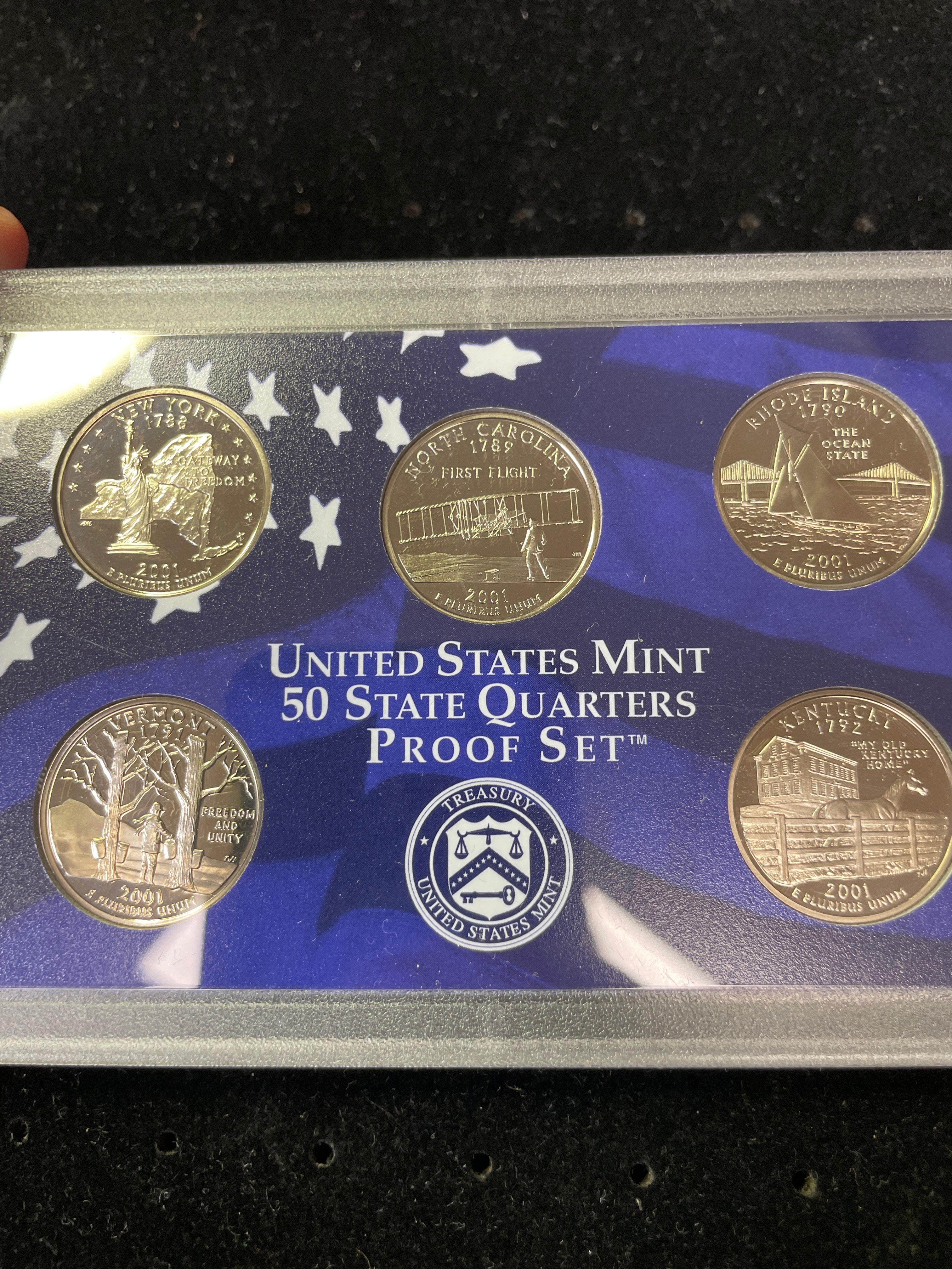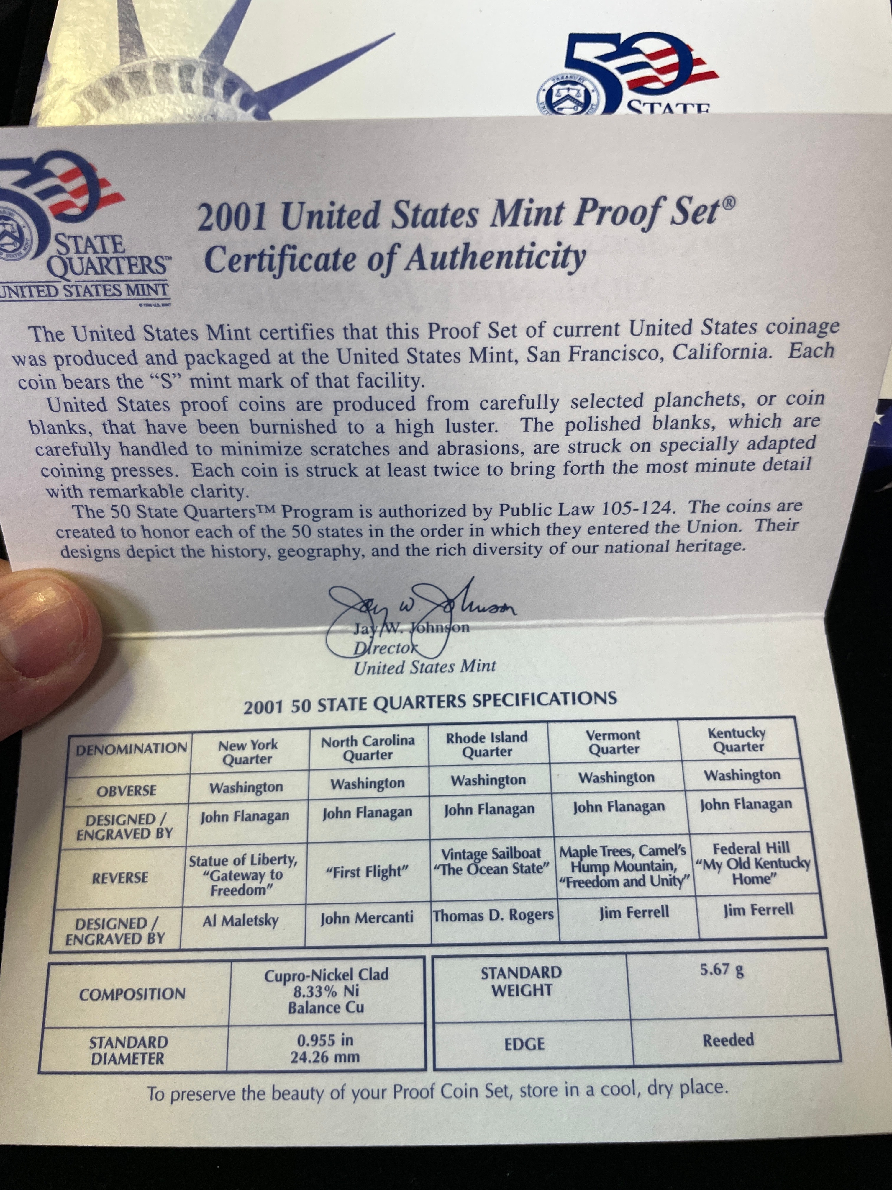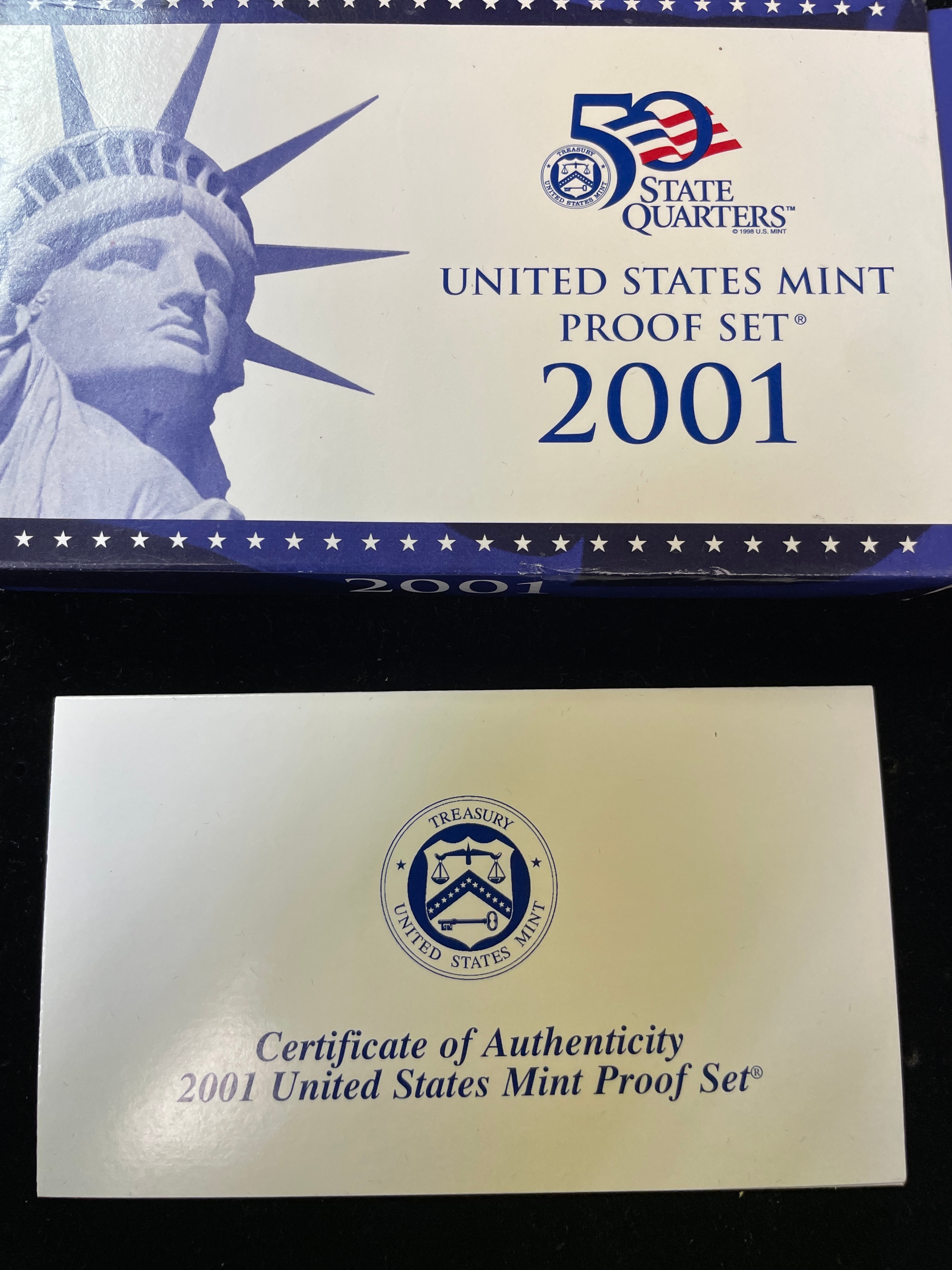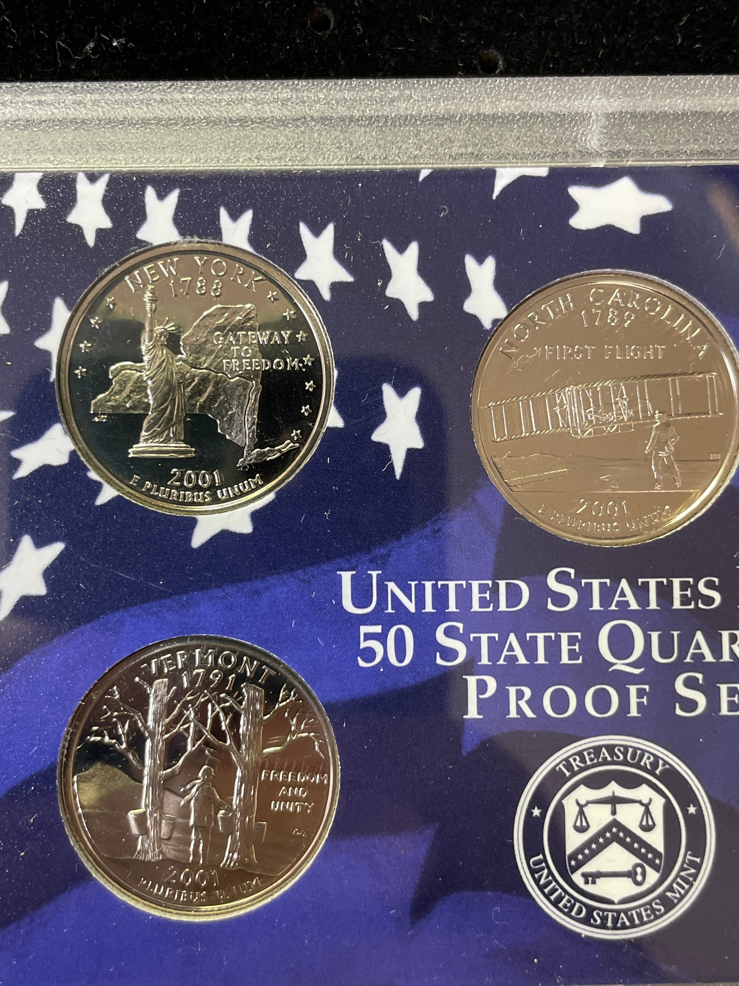 This lot comprises a 2001 United States Mint Proof Set and a 2001 United States Mint 50 State Quarters Proof Set. The standard proof set features five highly polished coins dated 2001: a copper-colored Cent, a silver-colored Nickel, Dime, Half Dollar, and a gold-colored Sacagawea Golden Dollar, each displaying standard U.S. coinage designs. The 50 State Quarters proof set contains five silver-colored quarters, also dated 2001, celebrating New York, North Carolina, Rhode Island, Vermont, and Kentucky, with unique state-specific reverse designs and George Washington on the obverse. Both sets are housed in their original clear plastic display cases and accompanied by the original white and blue cardboard packaging and a Certificate of Authenticity. All coins exhibit a brilliant, mirror-like proof finish characteristic of their issue, appearing in excellent, uncirculated condition within their sealed mint packaging, which also bears English text denoting the collection titles, year “2001,” and U.S. Mint information.