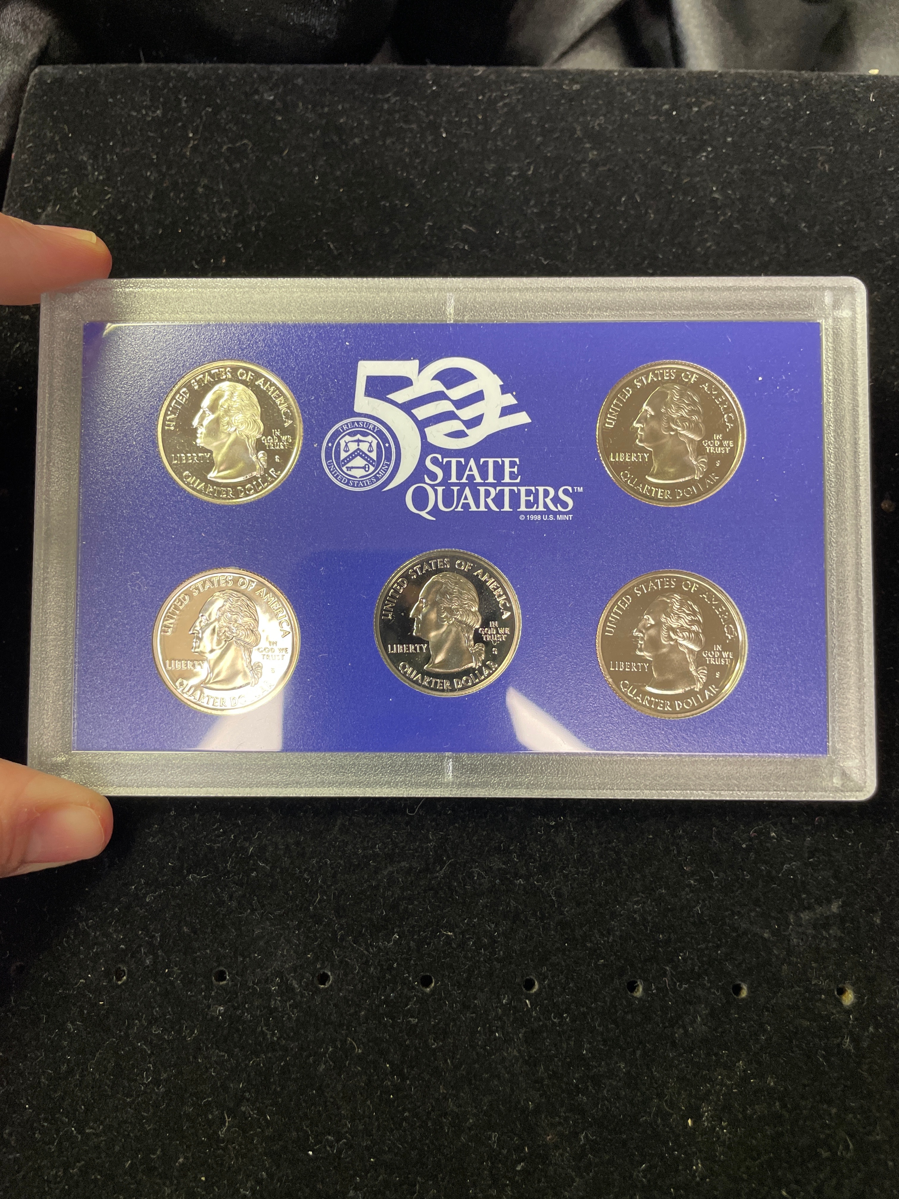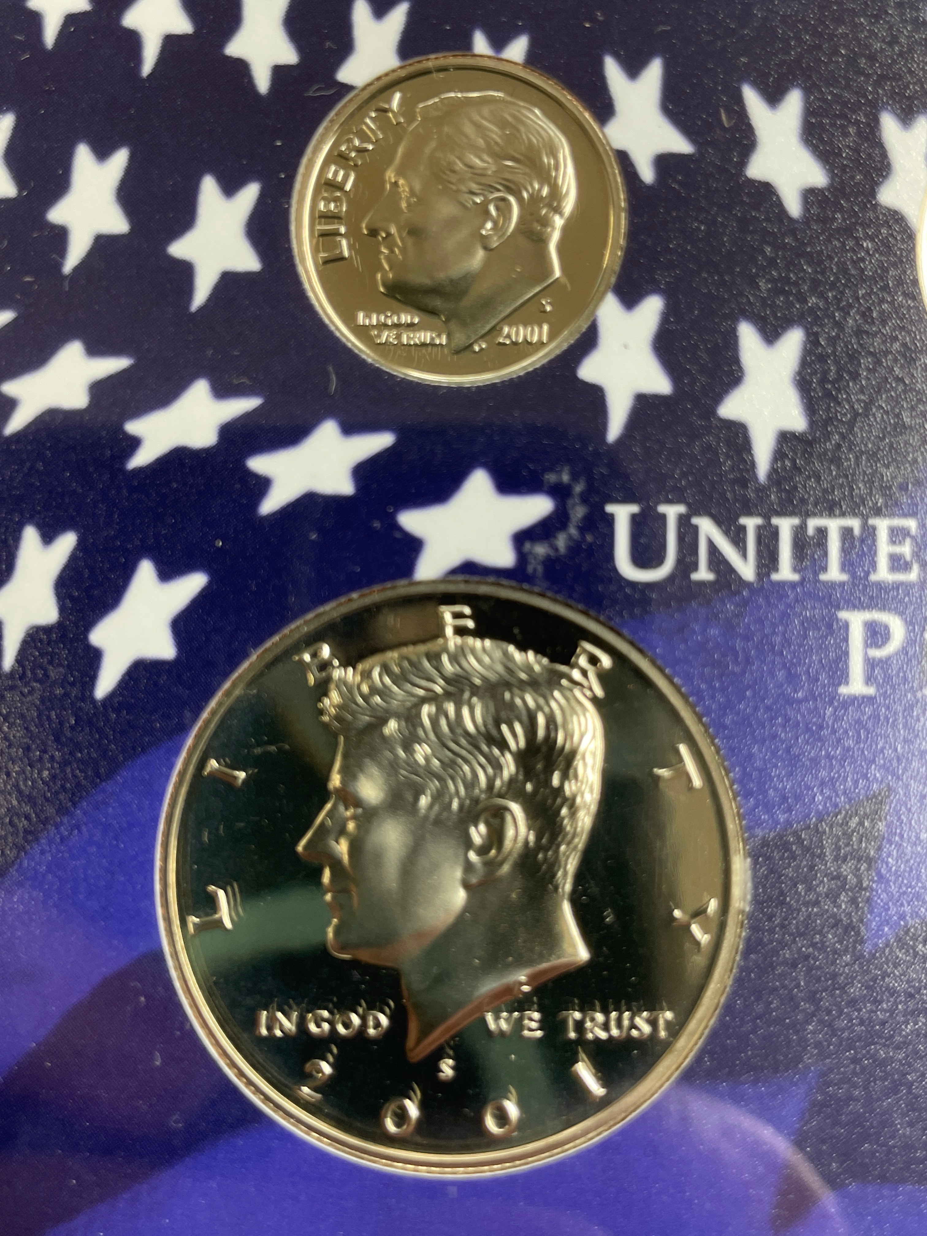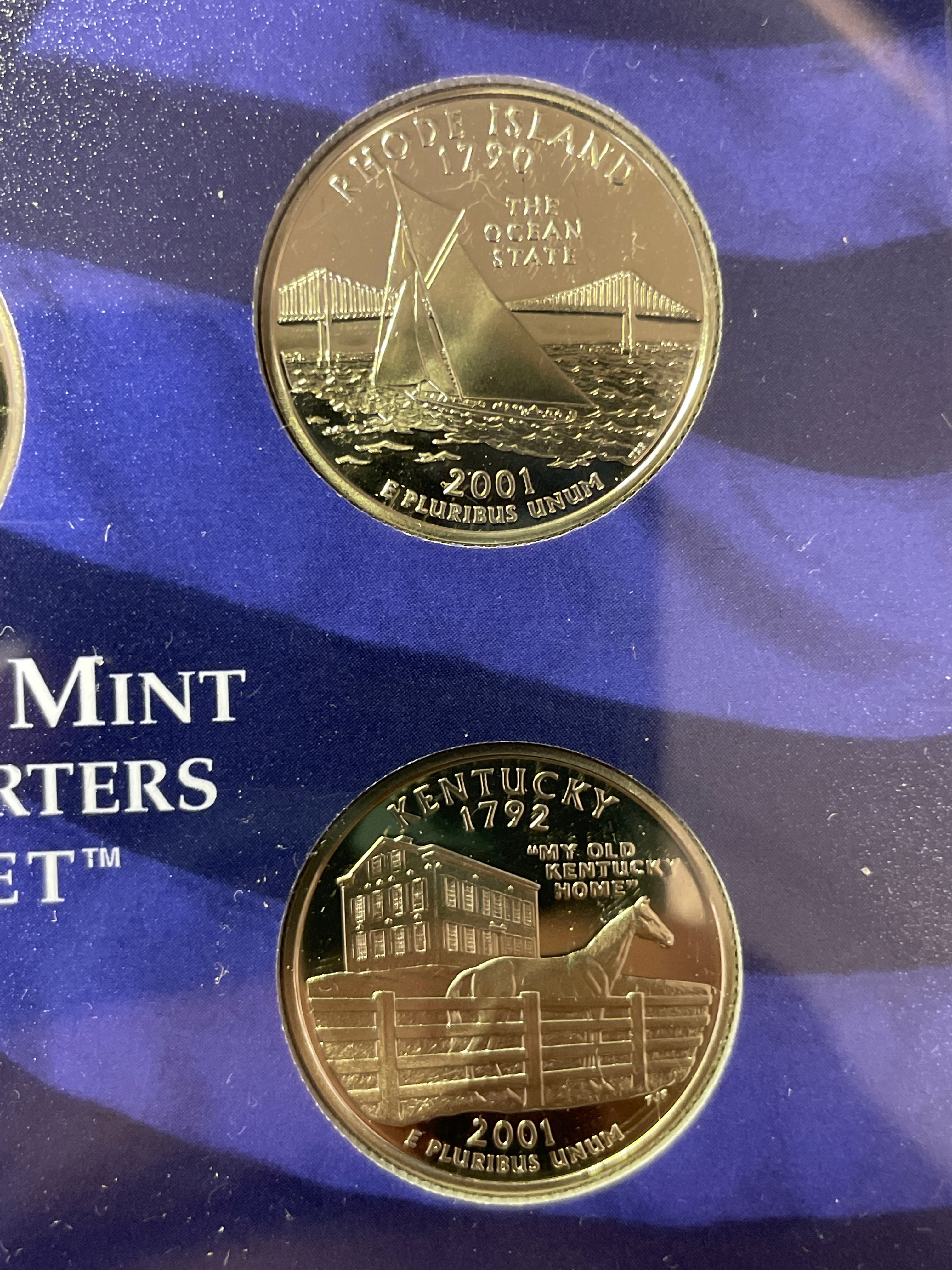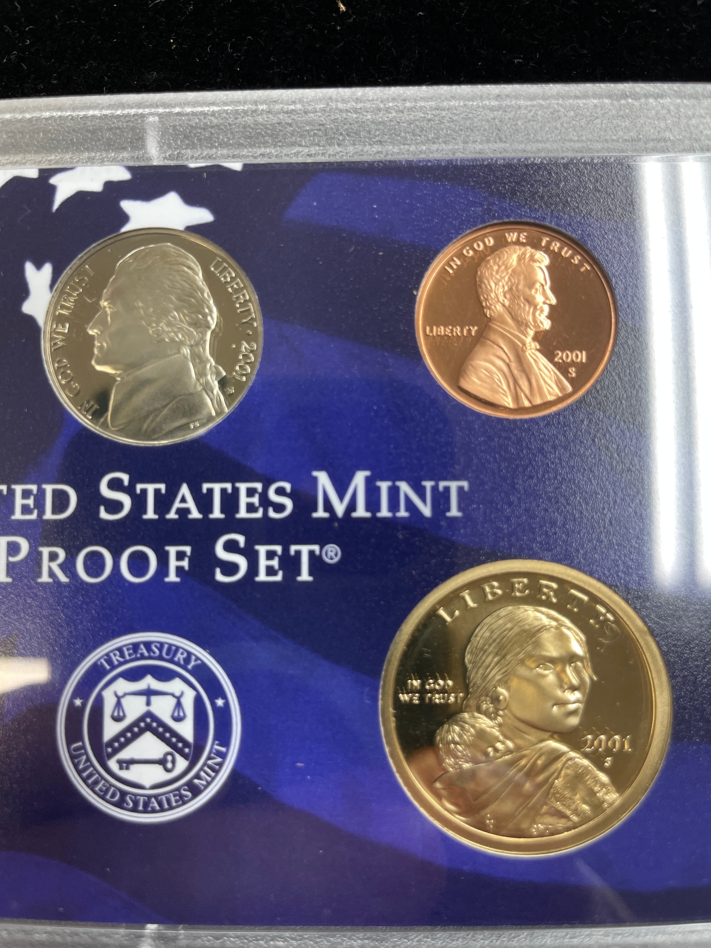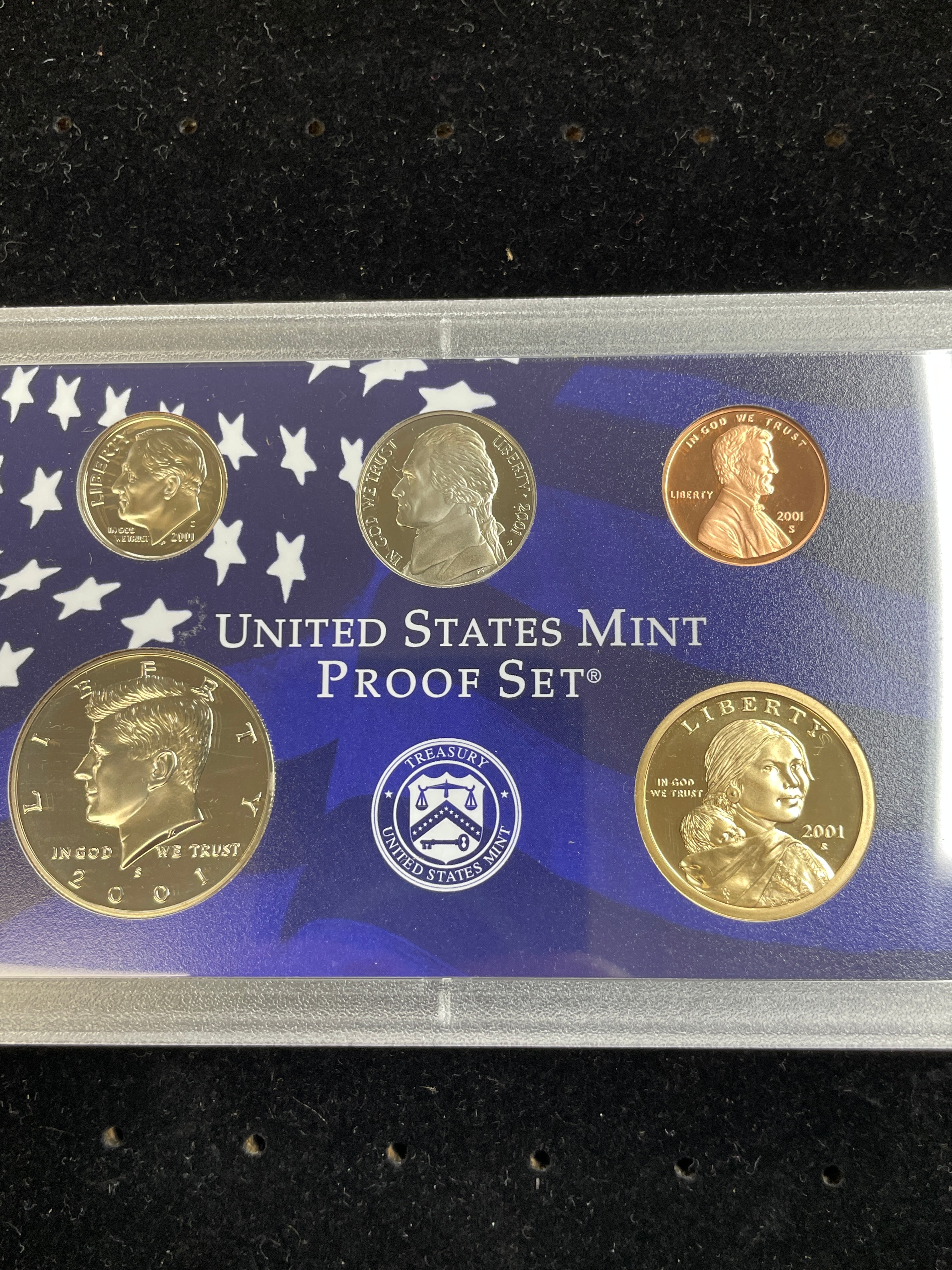This lot comprises a 2001 United States Mint Proof Set and a 2001 United States Mint 50 State Quarters Proof Set. The standard proof set features five highly polished coins dated 2001: a copper-colored Cent, a silver-colored Nickel, Dime, Half Dollar, and a gold-colored Sacagawea Golden Dollar, each displaying standard U.S. coinage designs. The 50 State Quarters proof set contains five silver-colored quarters, also dated 2001, celebrating New York, North Carolina, Rhode Island, Vermont, and Kentucky, with unique state-specific reverse designs and George Washington on the obverse. Both sets are housed in their original clear plastic display cases and accompanied by the original white and blue cardboard packaging and a Certificate of Authenticity. All coins exhibit a brilliant, mirror-like proof finish characteristic of their issue, appearing in excellent, uncirculated condition within their sealed mint packaging, which also bears English text denoting the collection titles, year “2001,” and U.S. Mint information.