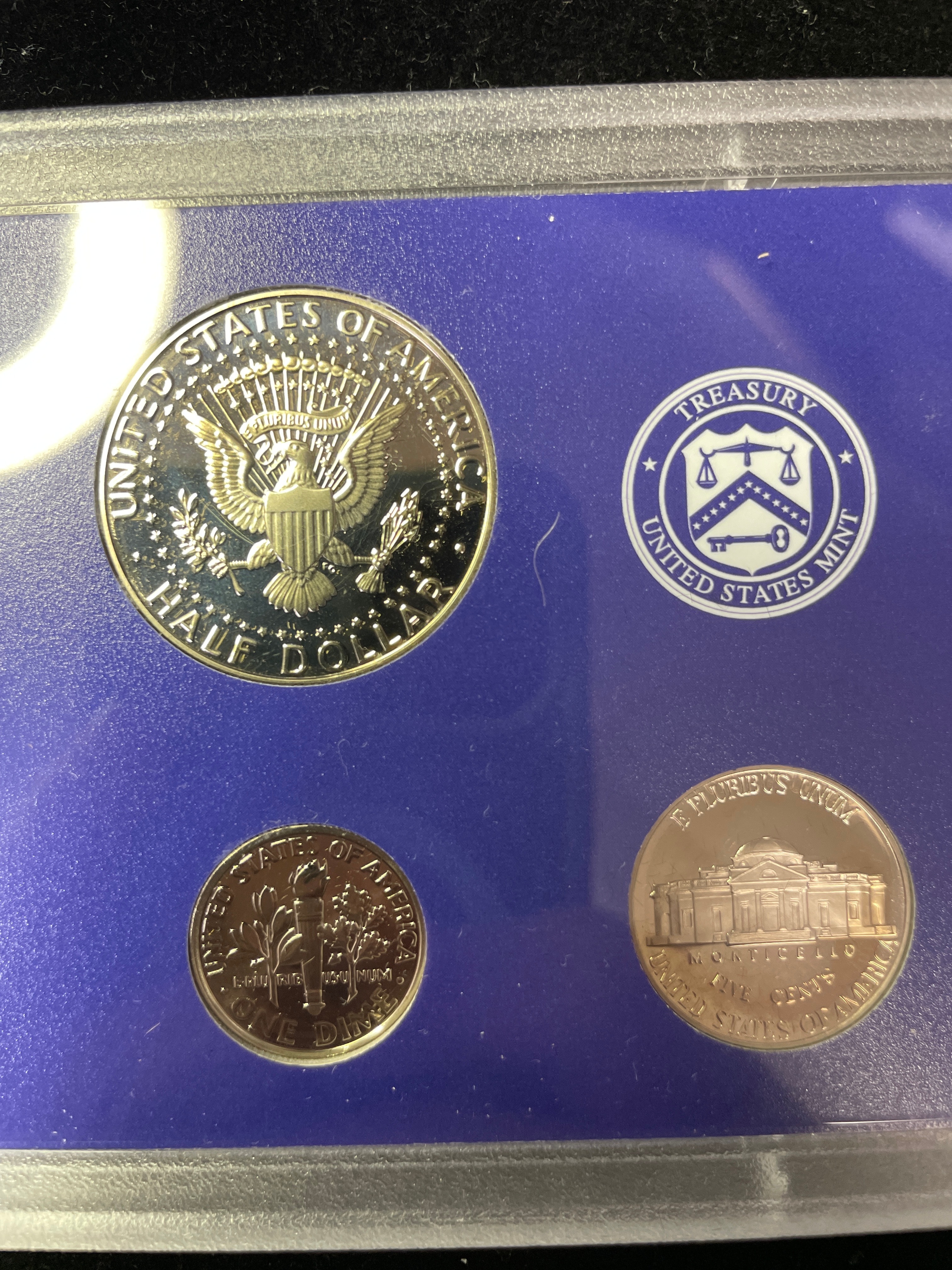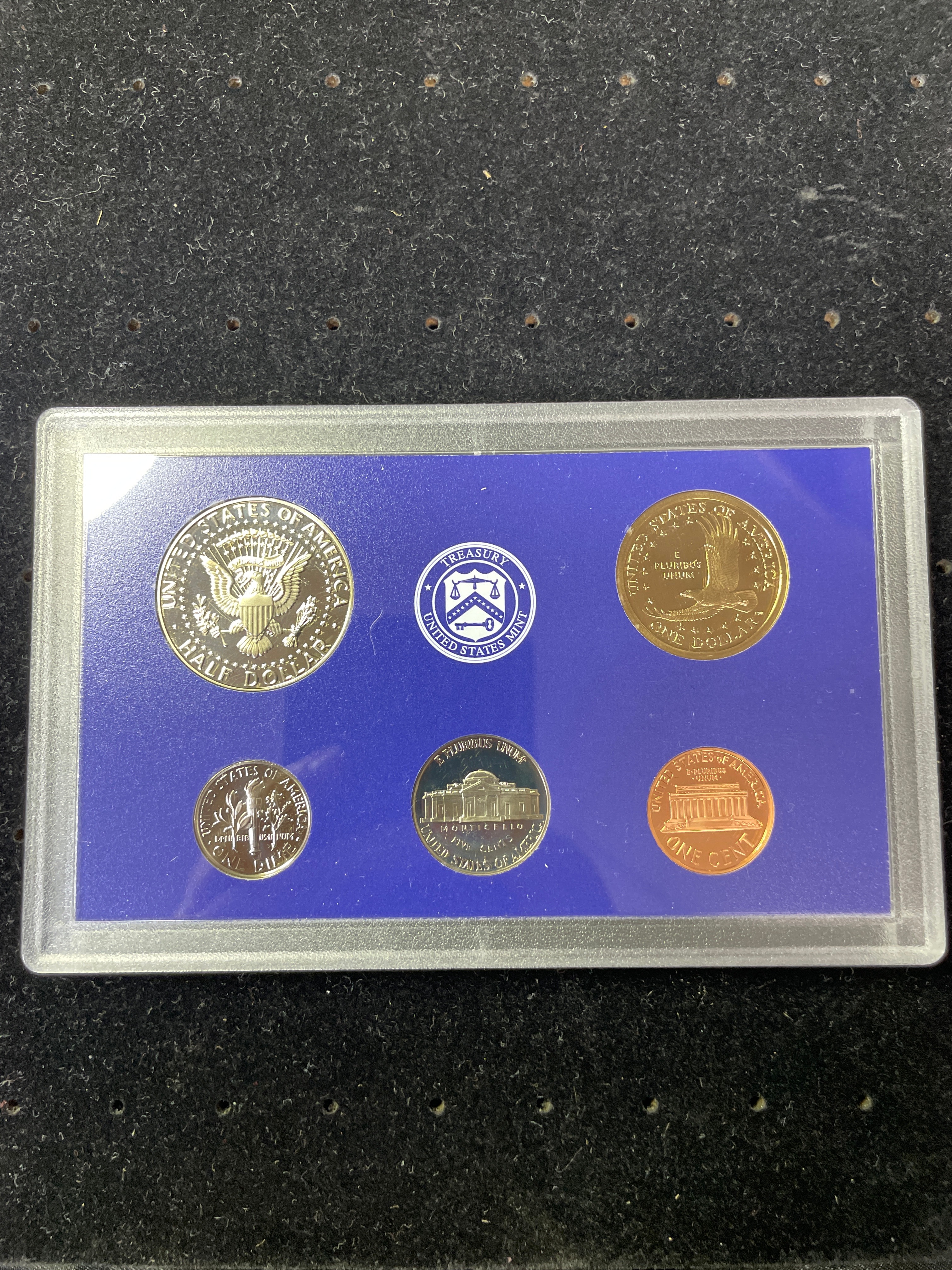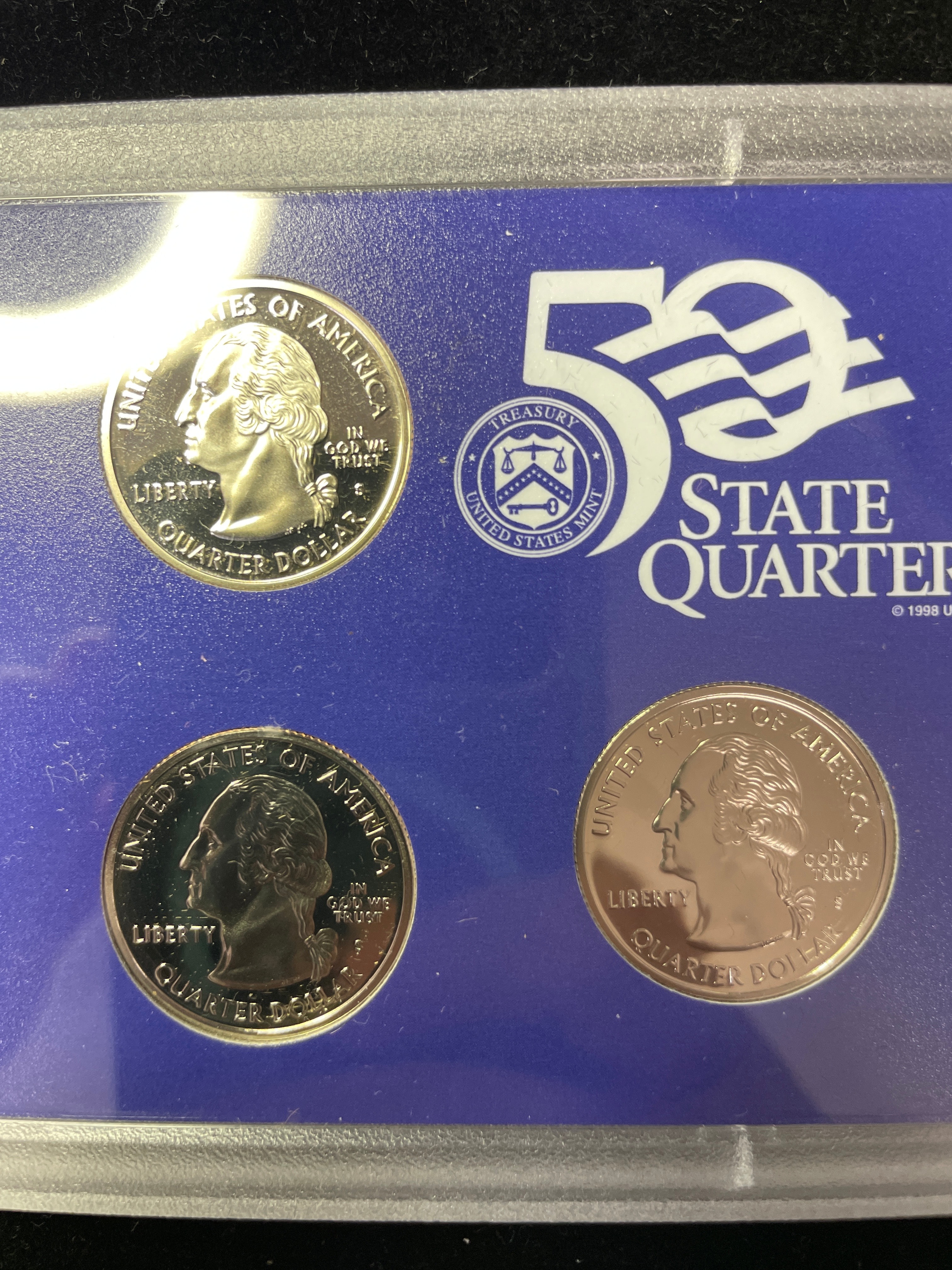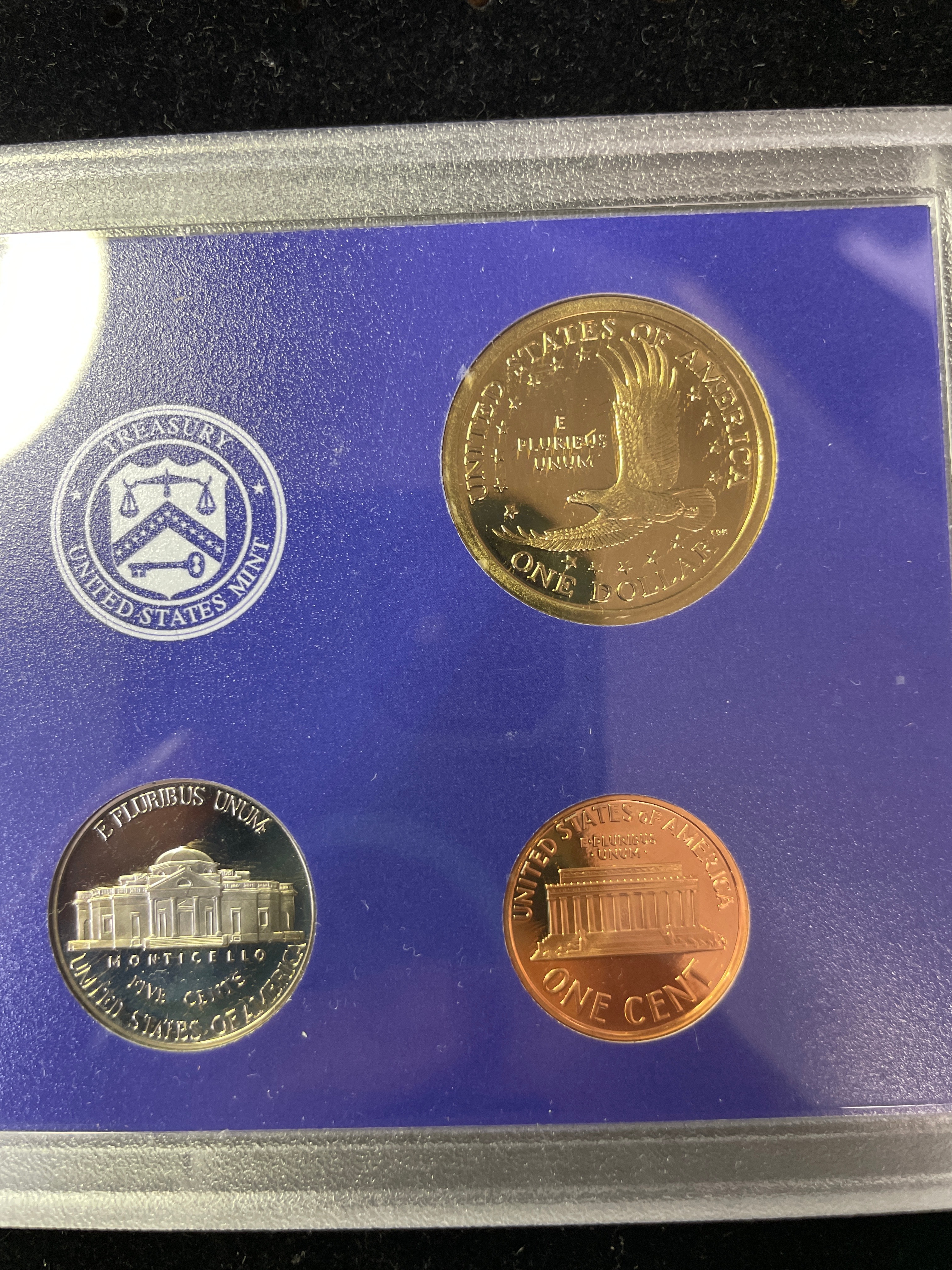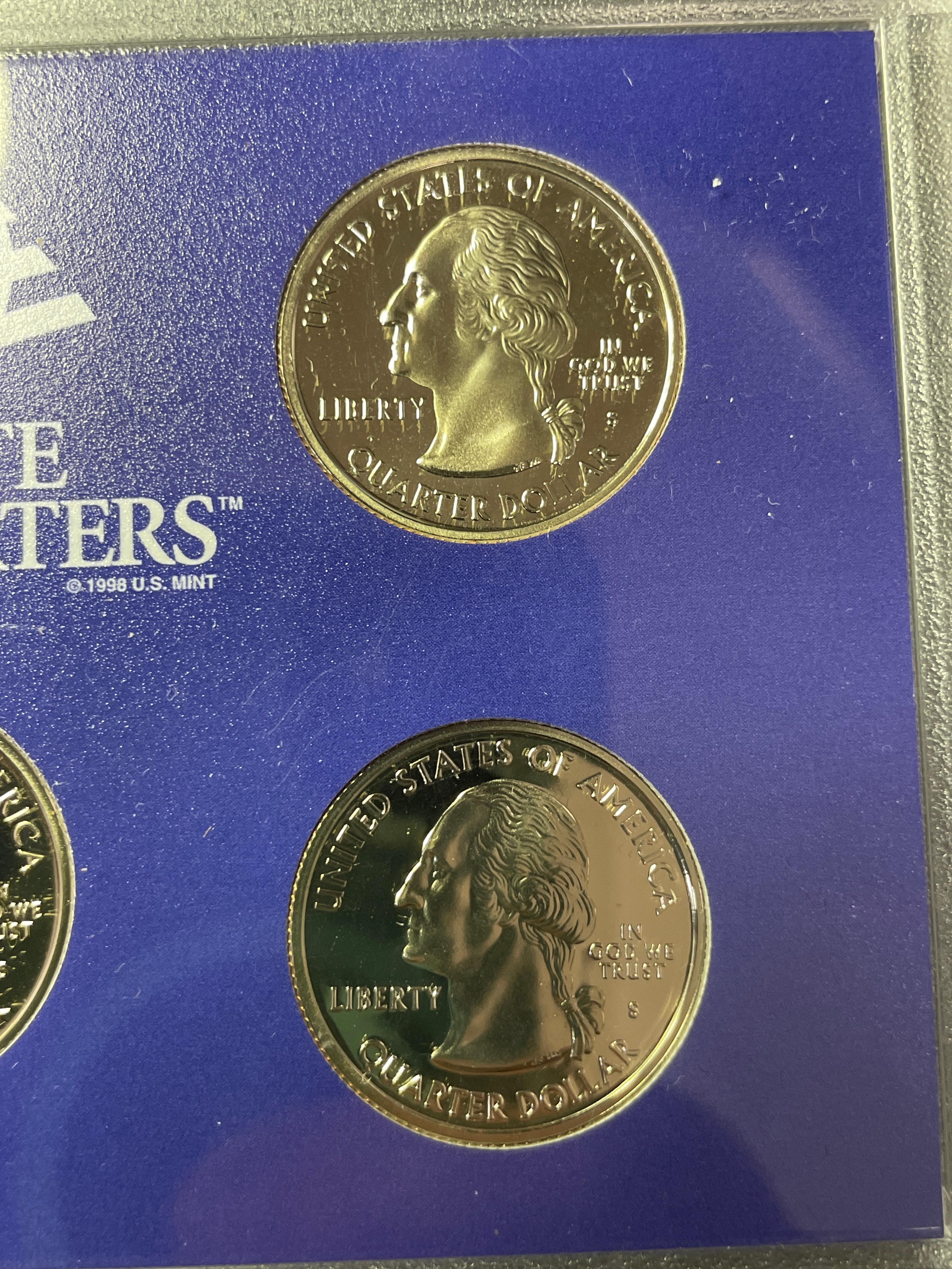 This lot comprises a 2001 United States Mint Proof Set and a 2001 United States Mint 50 State Quarters Proof Set. The standard proof set features five highly polished coins dated 2001: a copper-colored Cent, a silver-colored Nickel, Dime, Half Dollar, and a gold-colored Sacagawea Golden Dollar, each displaying standard U.S. coinage designs. The 50 State Quarters proof set contains five silver-colored quarters, also dated 2001, celebrating New York, North Carolina, Rhode Island, Vermont, and Kentucky, with unique state-specific reverse designs and George Washington on the obverse. Both sets are housed in their original clear plastic display cases and accompanied by the original white and blue cardboard packaging and a Certificate of Authenticity. All coins exhibit a brilliant, mirror-like proof finish characteristic of their issue, appearing in excellent, uncirculated condition within their sealed mint packaging, which also bears English text denoting the collection titles, year “2001,” and U.S. Mint information.