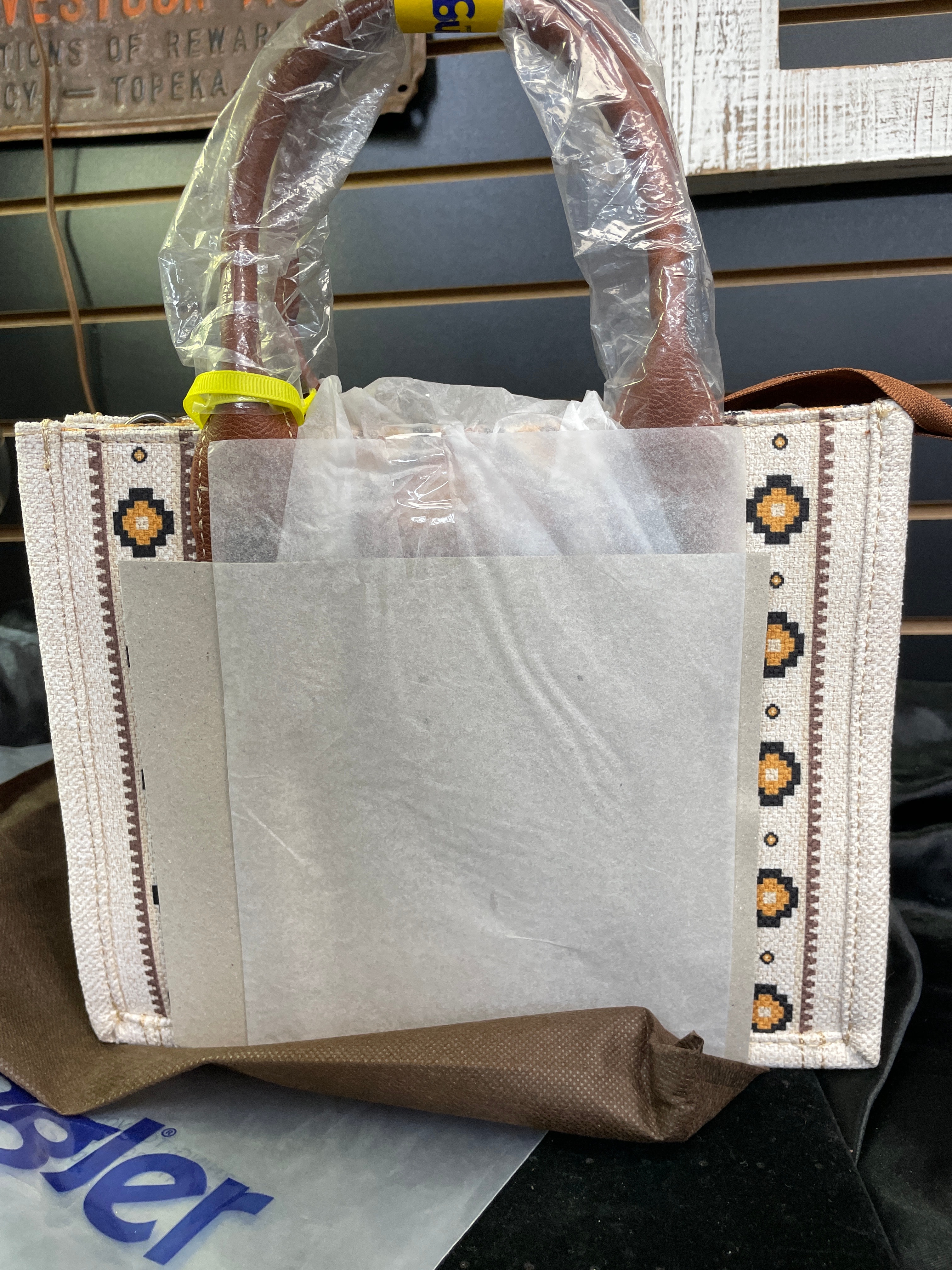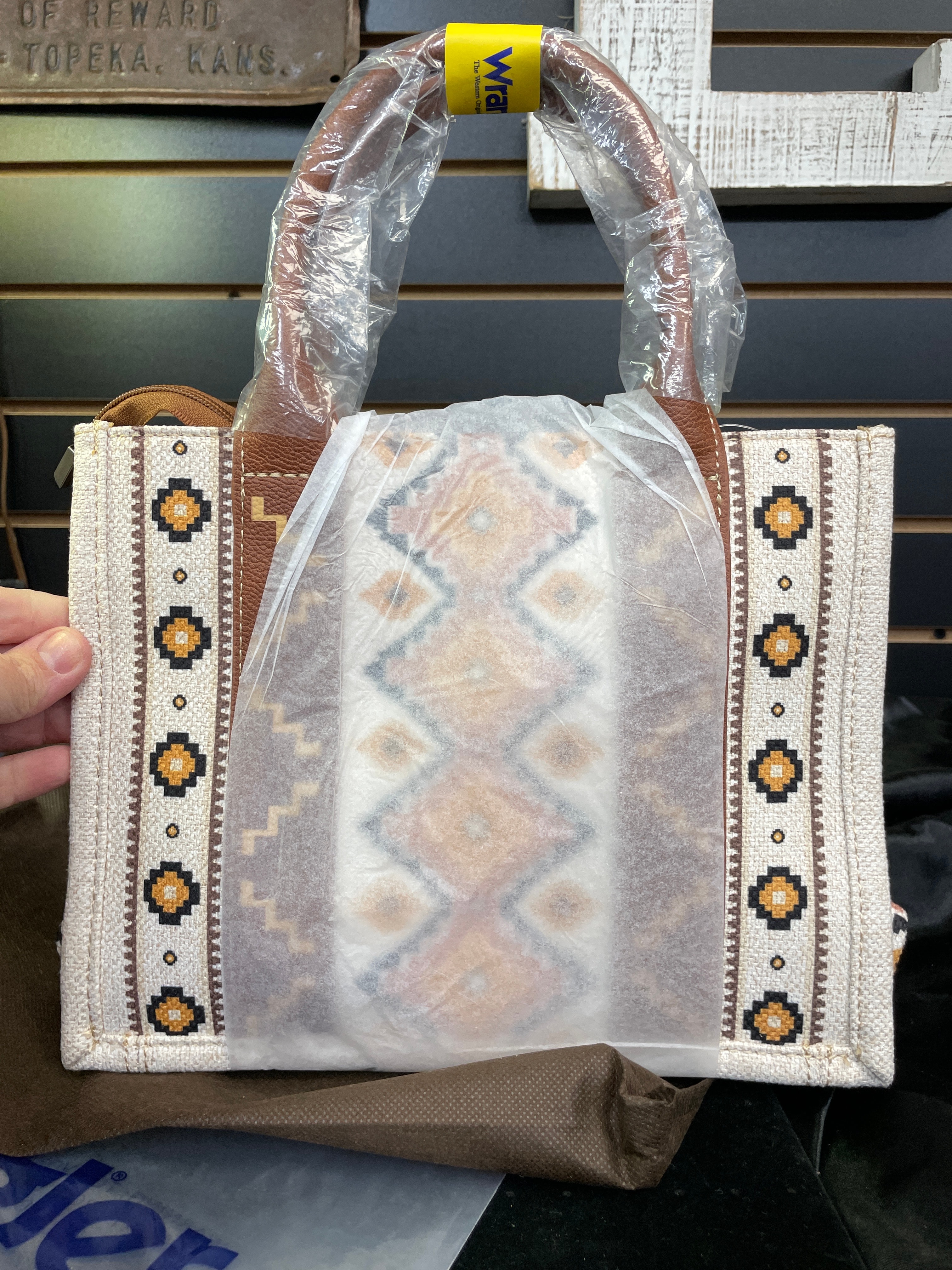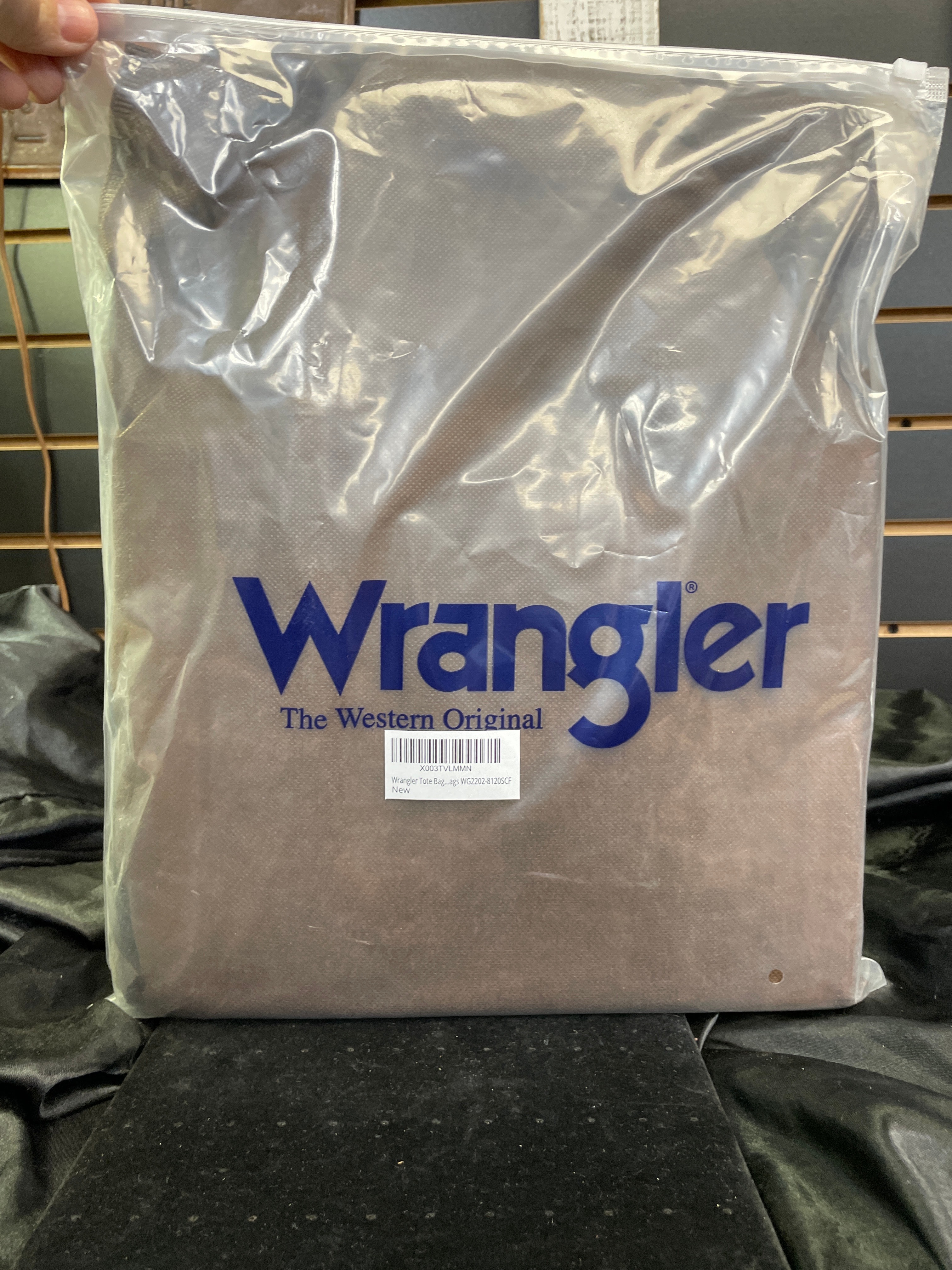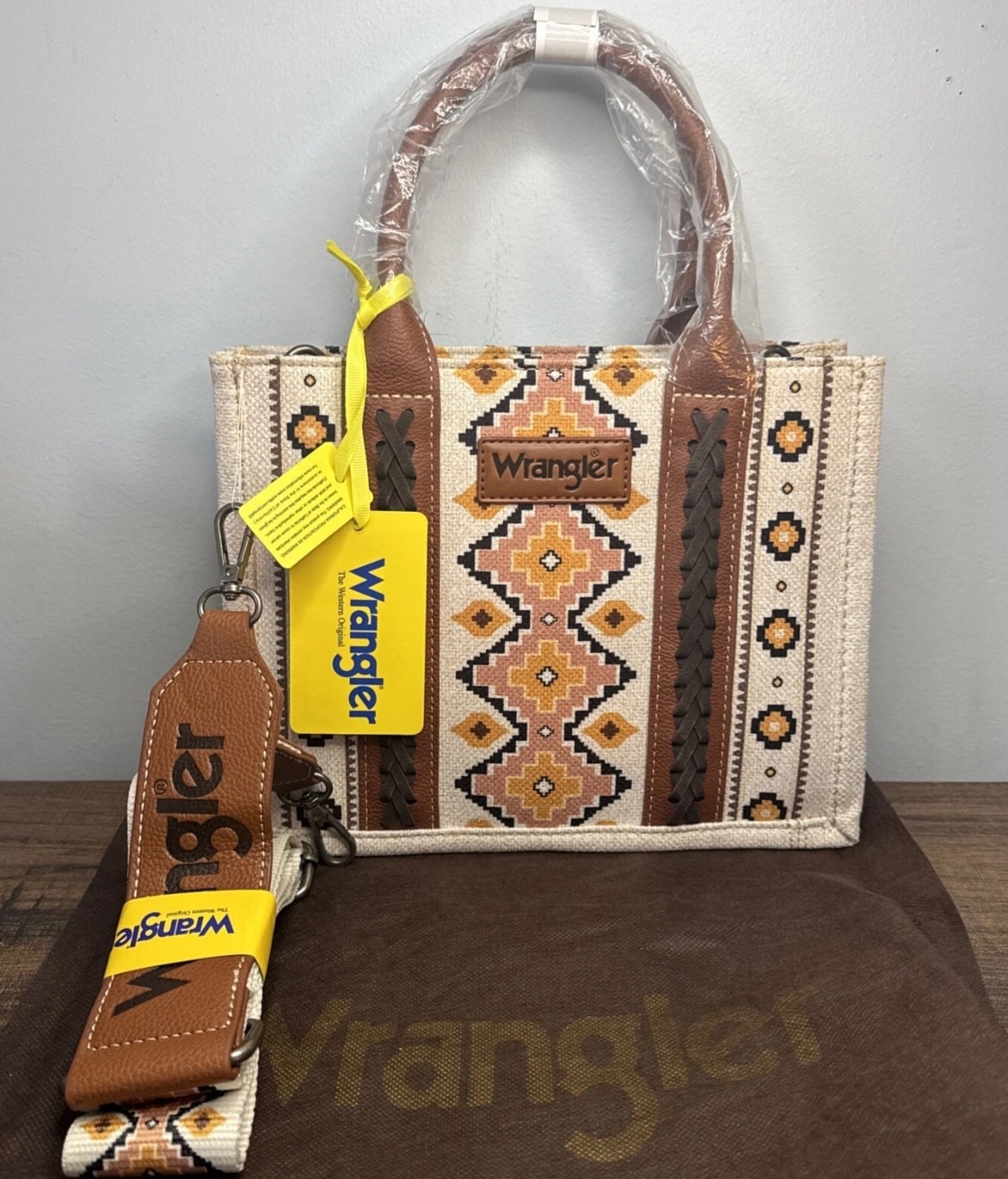 A Wrangler Aztec Tote Bag. This contemporary bag features a distinct Western or Southwestern aesthetic with an off-white woven textile body. The design includes a central geometric diamond pattern in brown, orange, and cream, flanked by side panels with a repeating stylized floral motif in orange and black. Accented with brown faux leather handles, trim, and a detachable shoulder strap, all components bear “Wrangler The Western Original” branding, including an applied front patch. The item comes with its original hang tags attached, and the handles retain their protective plastic wrapping. A branded dust bag is included, and the clear plastic packaging label identifies the item as “Wrangler Tote Bag Item #WG2202 #Y2202CT Brown.”