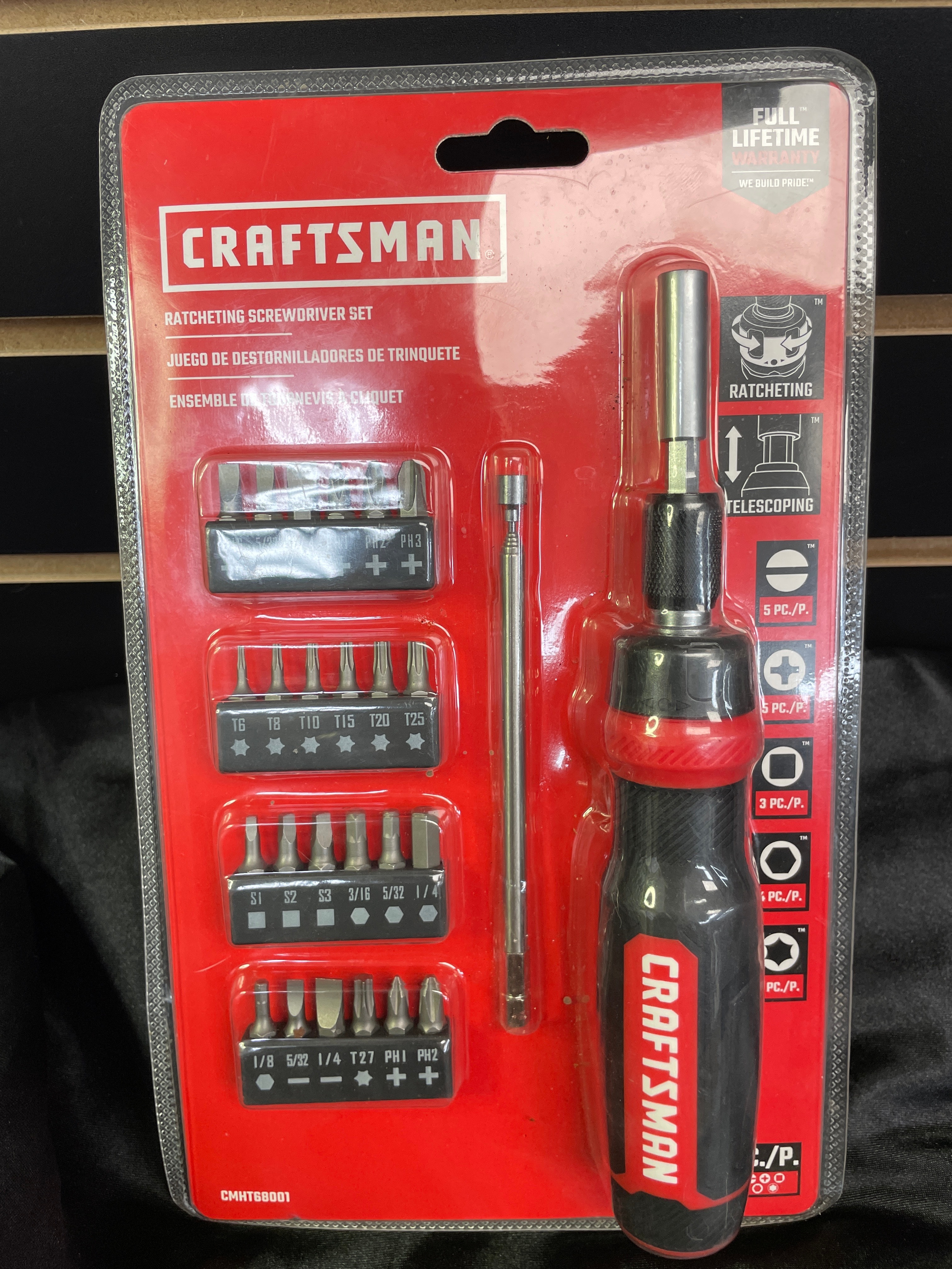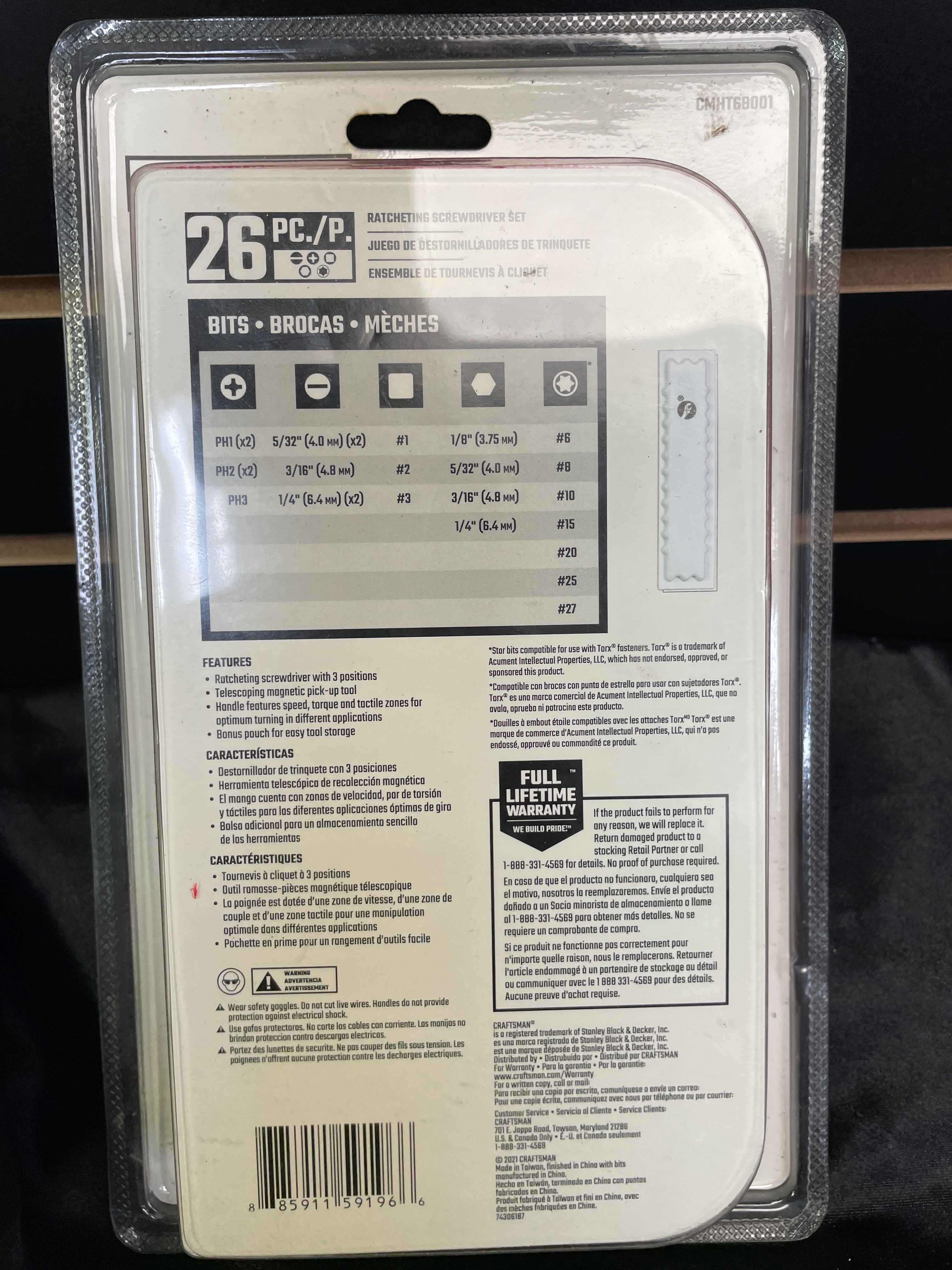 A new, unopened Craftsman 26-piece ratcheting screwdriver set, Model CMHT68001, presented in its original red and clear plastic blister retail packaging. This modern tool set features a ratcheting screwdriver handle with a red and black bi-material grip, a telescopic magnetic bit holder, and multiple sets of various metal screwdriver bits, including Phillips, Slotted, Torx, and Square/Robertson types, stored in dedicated plastic holders. The packaging prominently displays the brand “CRAFTSMAN” and features such as “FULL LIFETIME WARRANTY,” “RATCHETING,” “TELESCOPING,” and “ON-BOARD BIT STORAGE.” Multilingual text includes English, Spanish (“JUEGO DE DESTORNILLADORES DE TRINQUETE,” “BROCAS”), and French (“ENSEMBLE TOURNEVIS À CLIQUET,” “MÈCHES”).