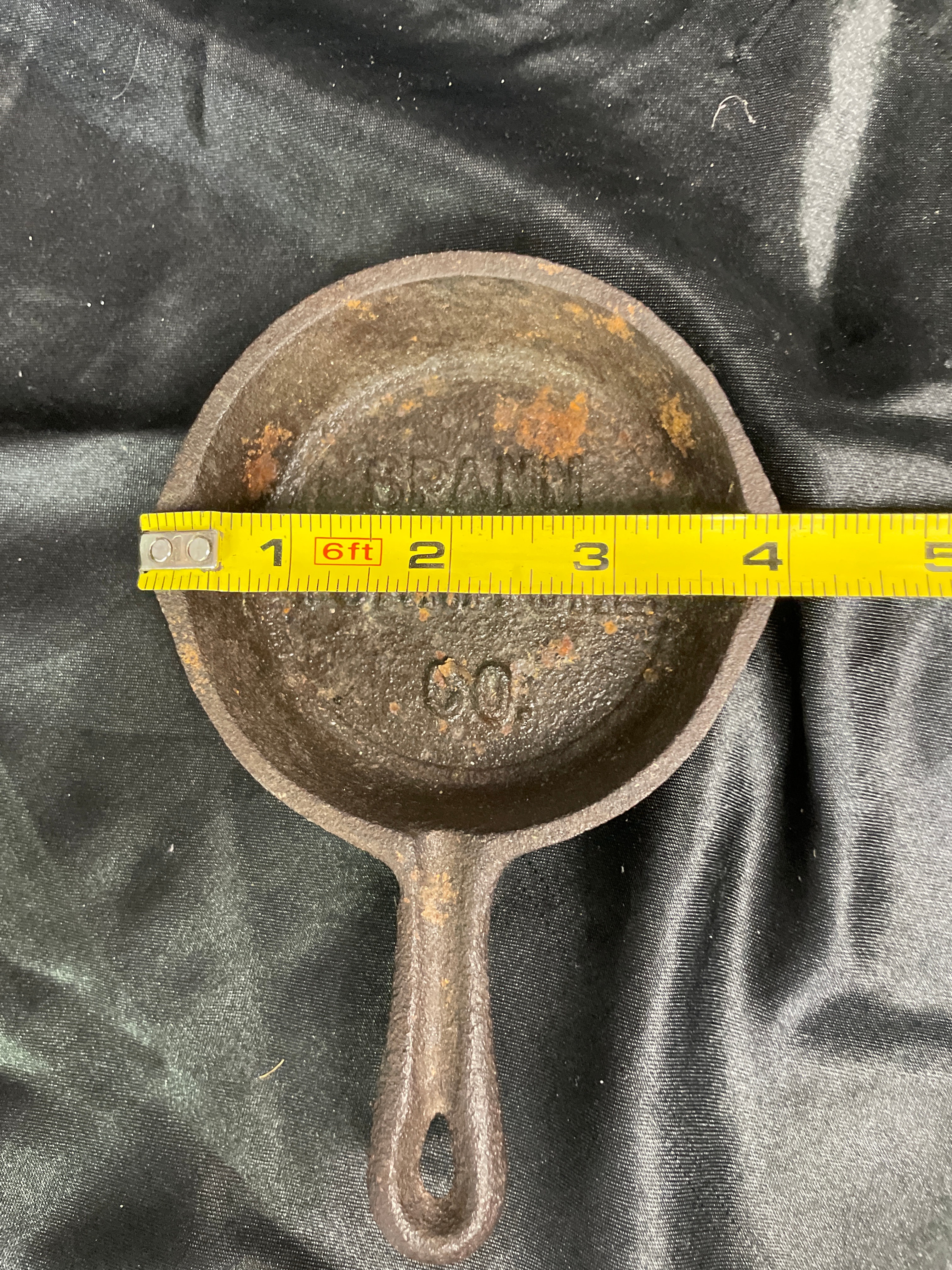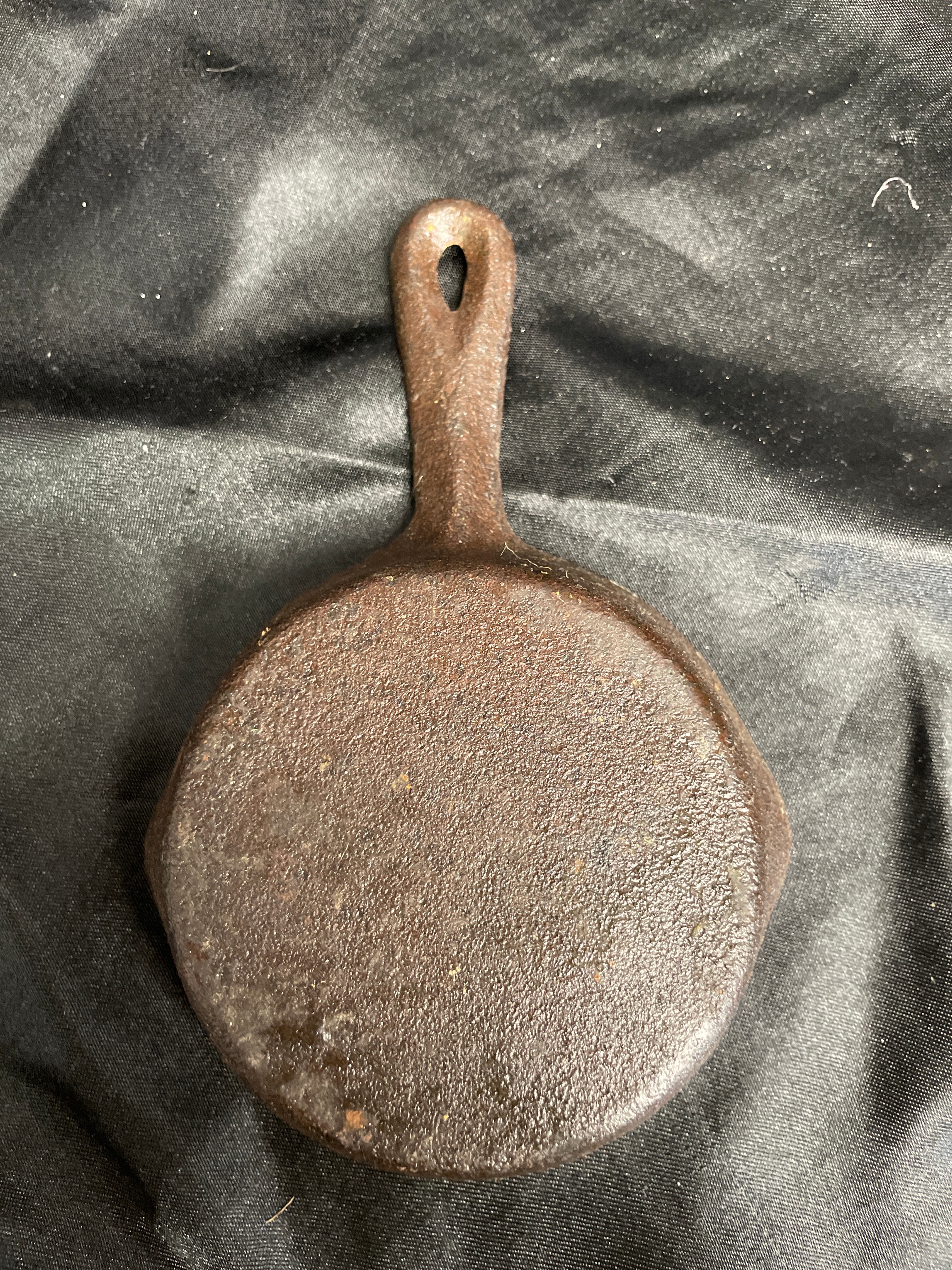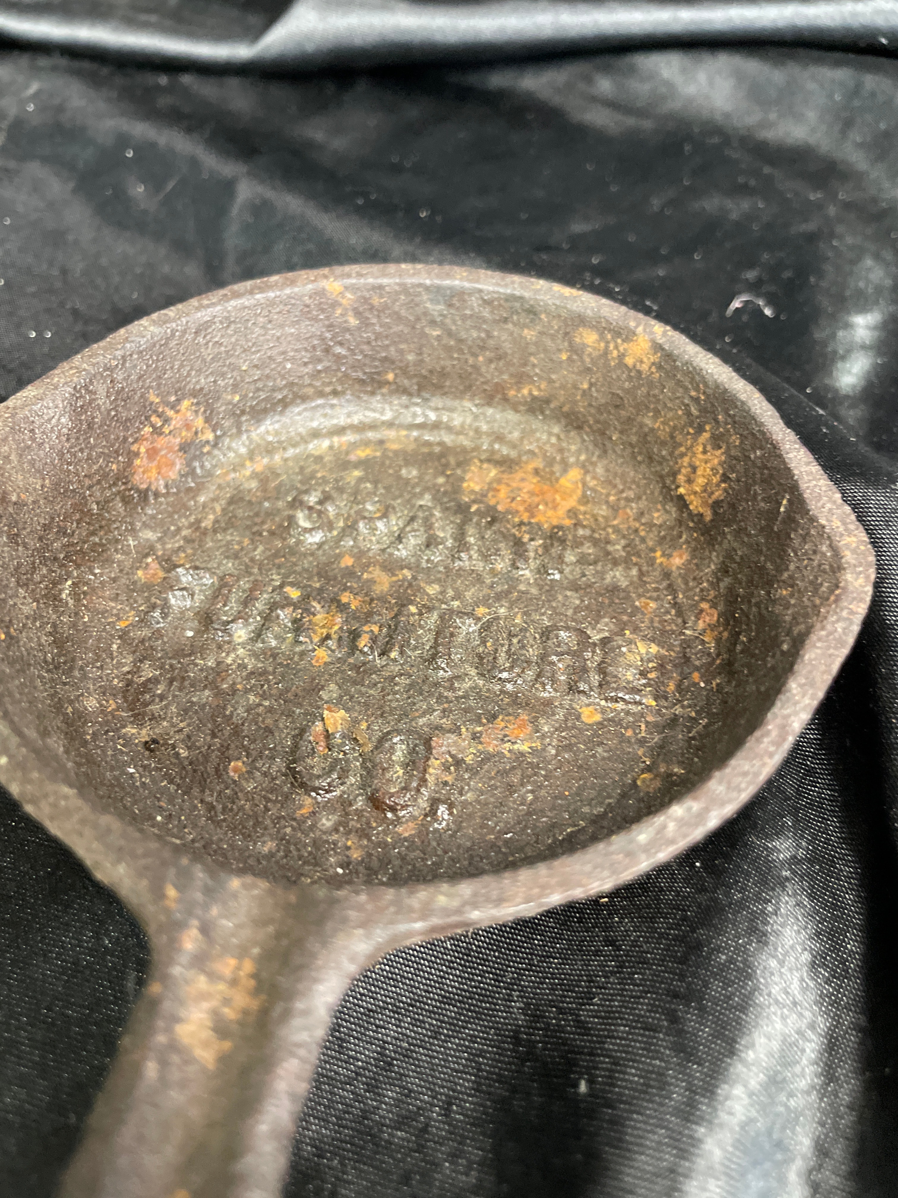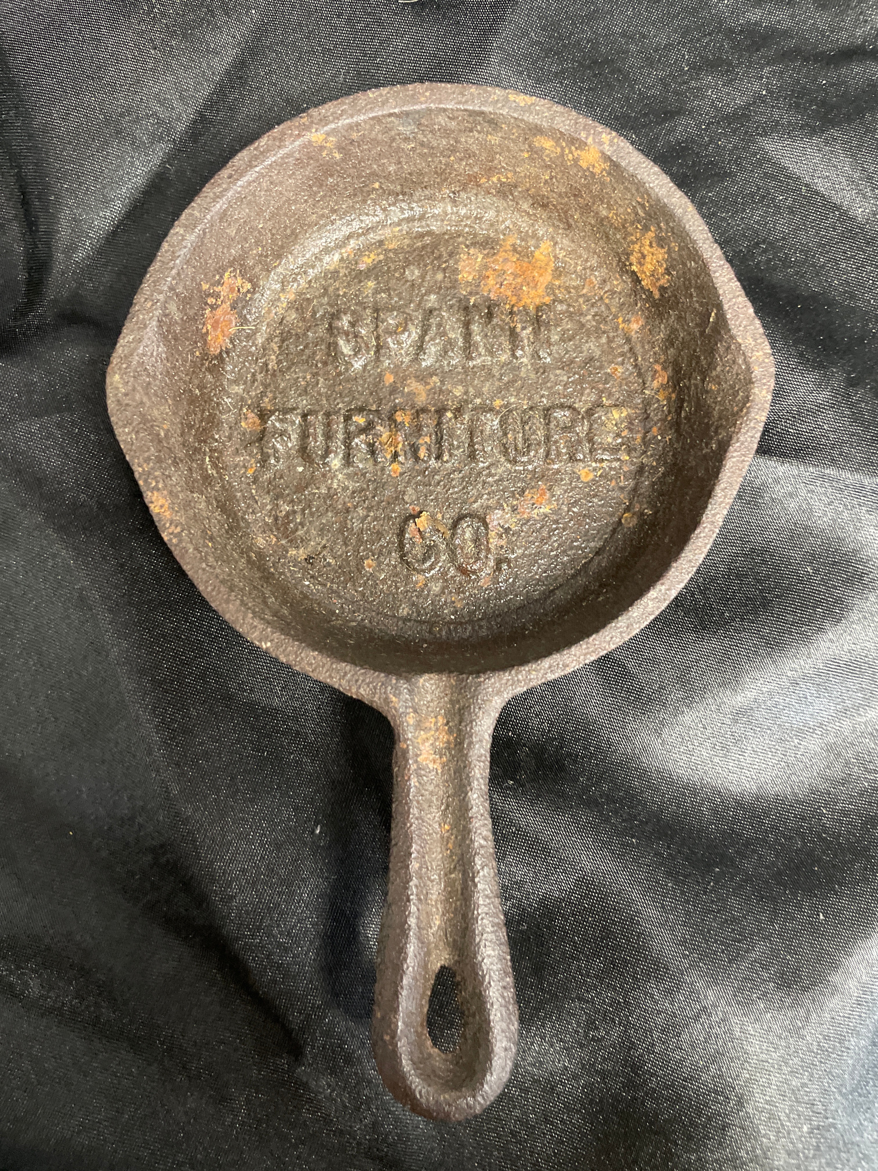 A vintage cast iron advertising miniature skillet, also commonly used as an ashtray, featuring prominently raised lettering on its interior for "Spann", "FURNITURE", and "CO:". Constructed entirely of cast iron, this small frying pan exhibits a dark, aged patina throughout.
