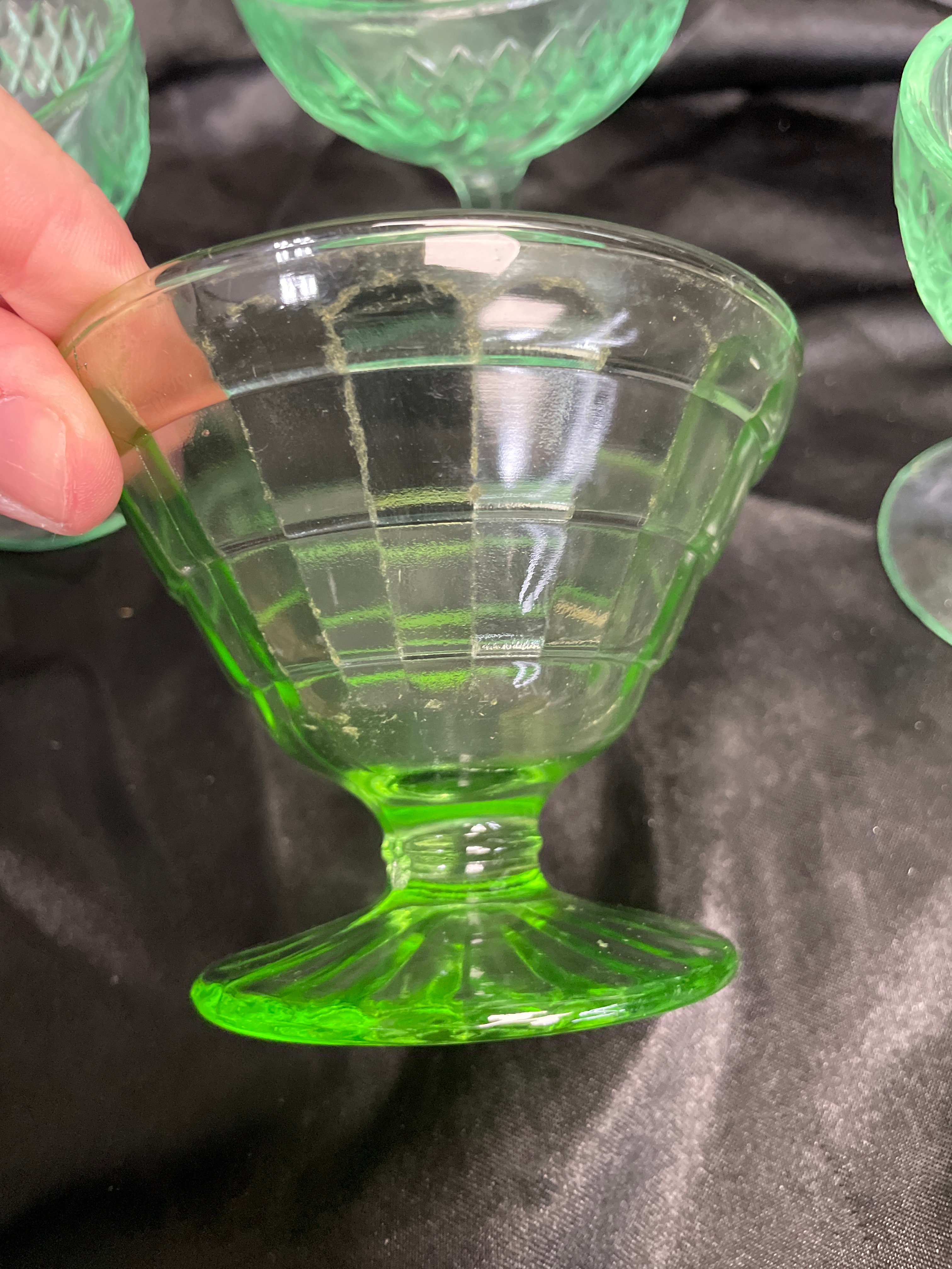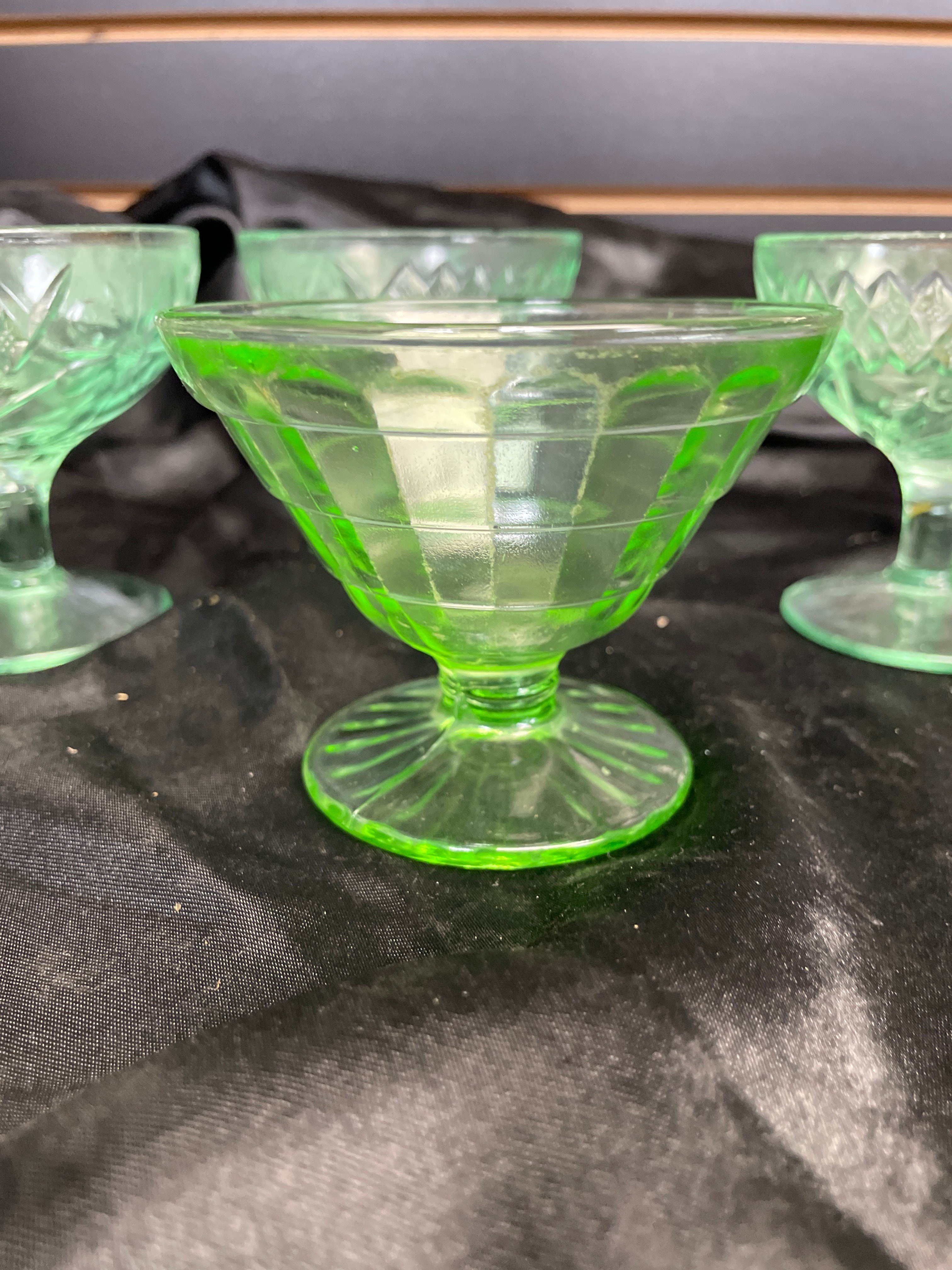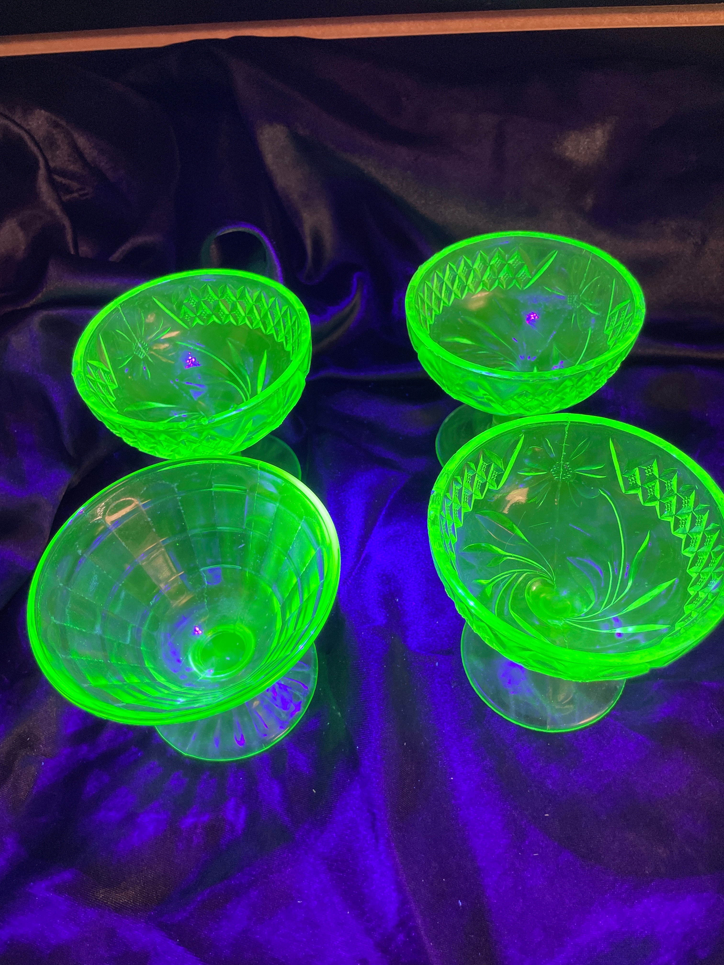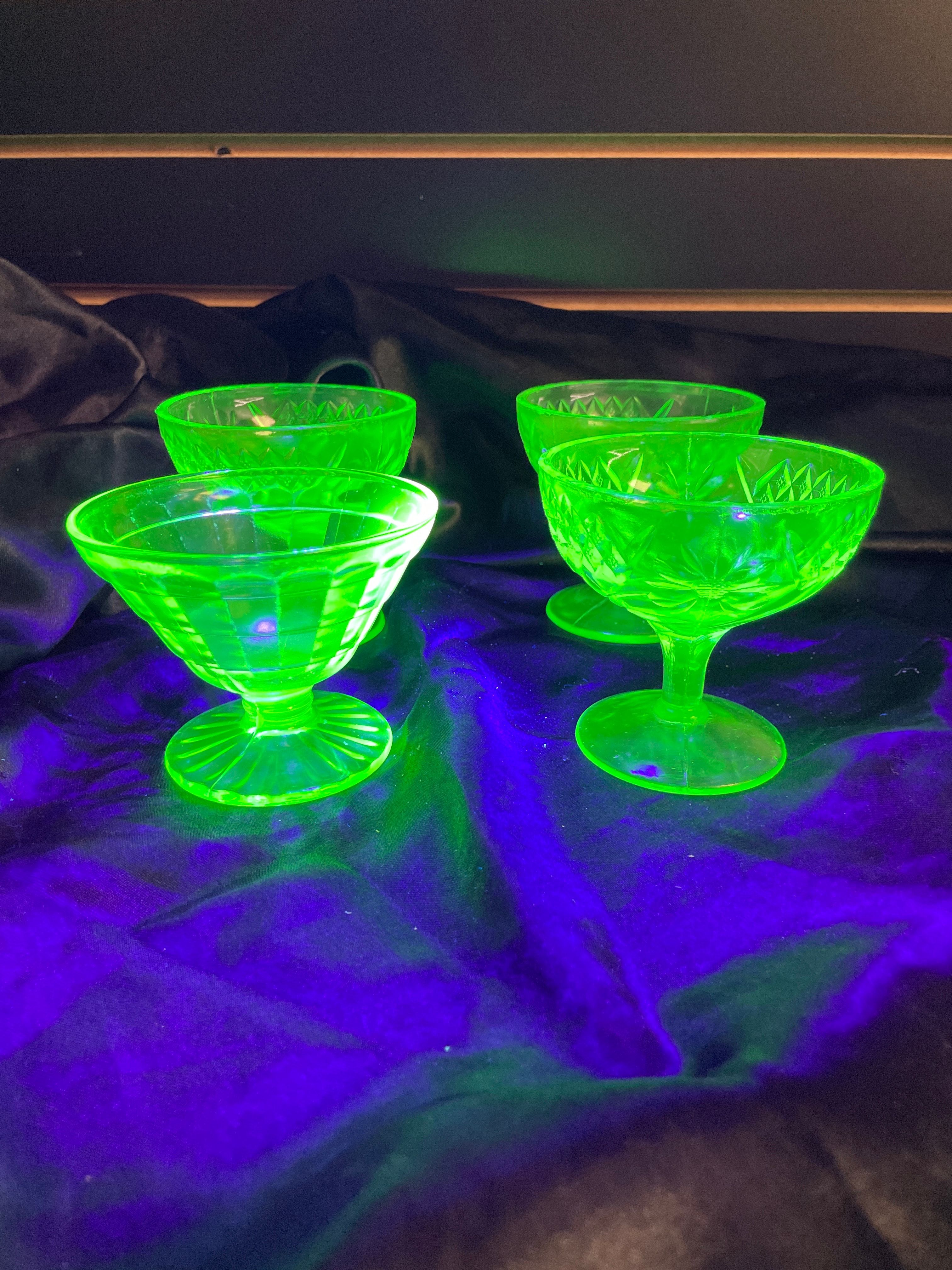 A set of four small, footed dessert or sherbet dishes crafted from translucent pale green pressed glass. The glass exhibits a strong neon green fluorescence under ultraviolet light, indicative of uranium content. The set displays two distinct pressed glass patterns: two dishes feature a diamond-hatch design with interspersed stylized floral or starburst motifs, while the other two show a geometric grid or paneled pattern with a fluted foot. No manufacturer’s marks or discernible text are visible on any of the pieces.