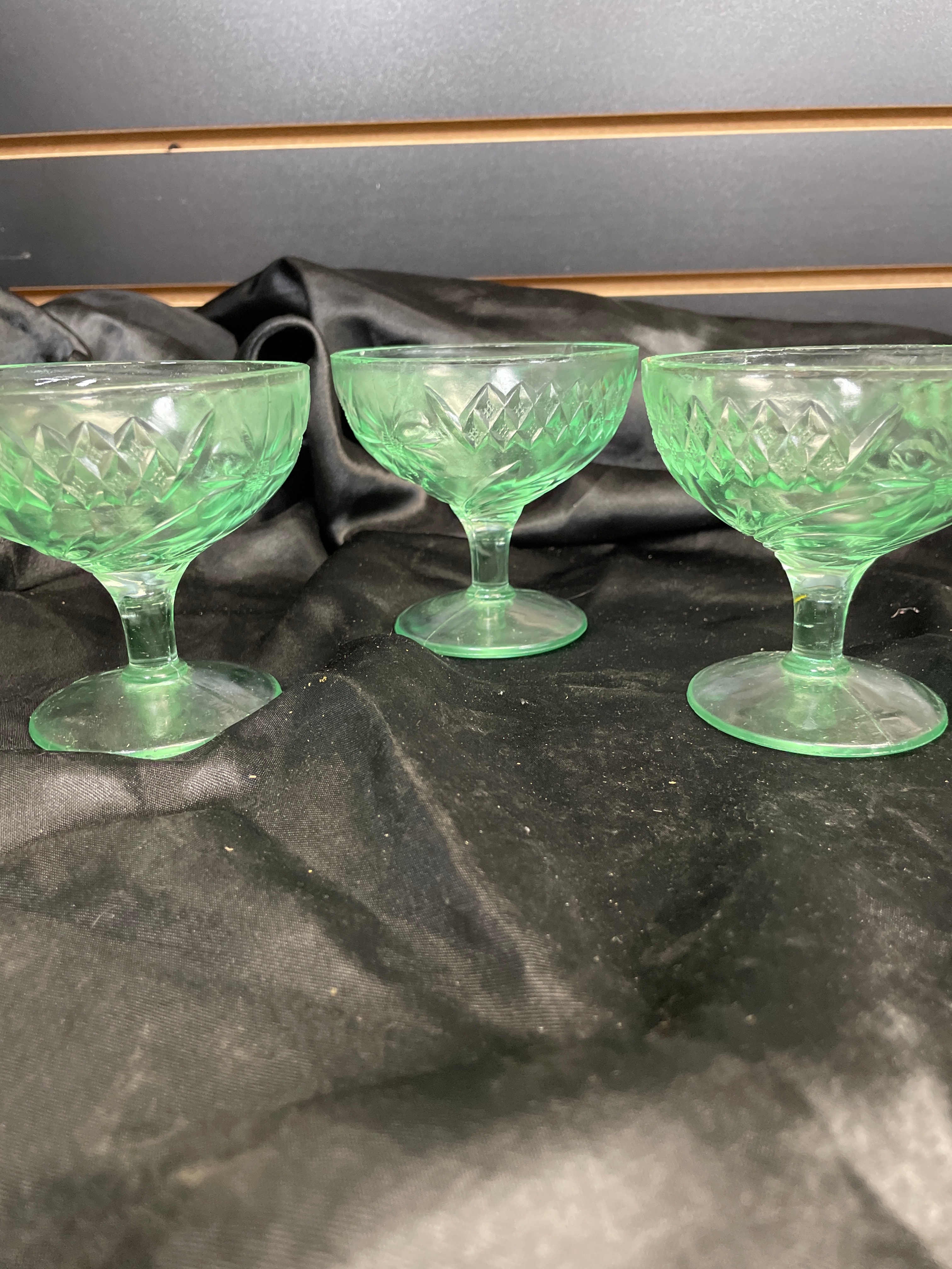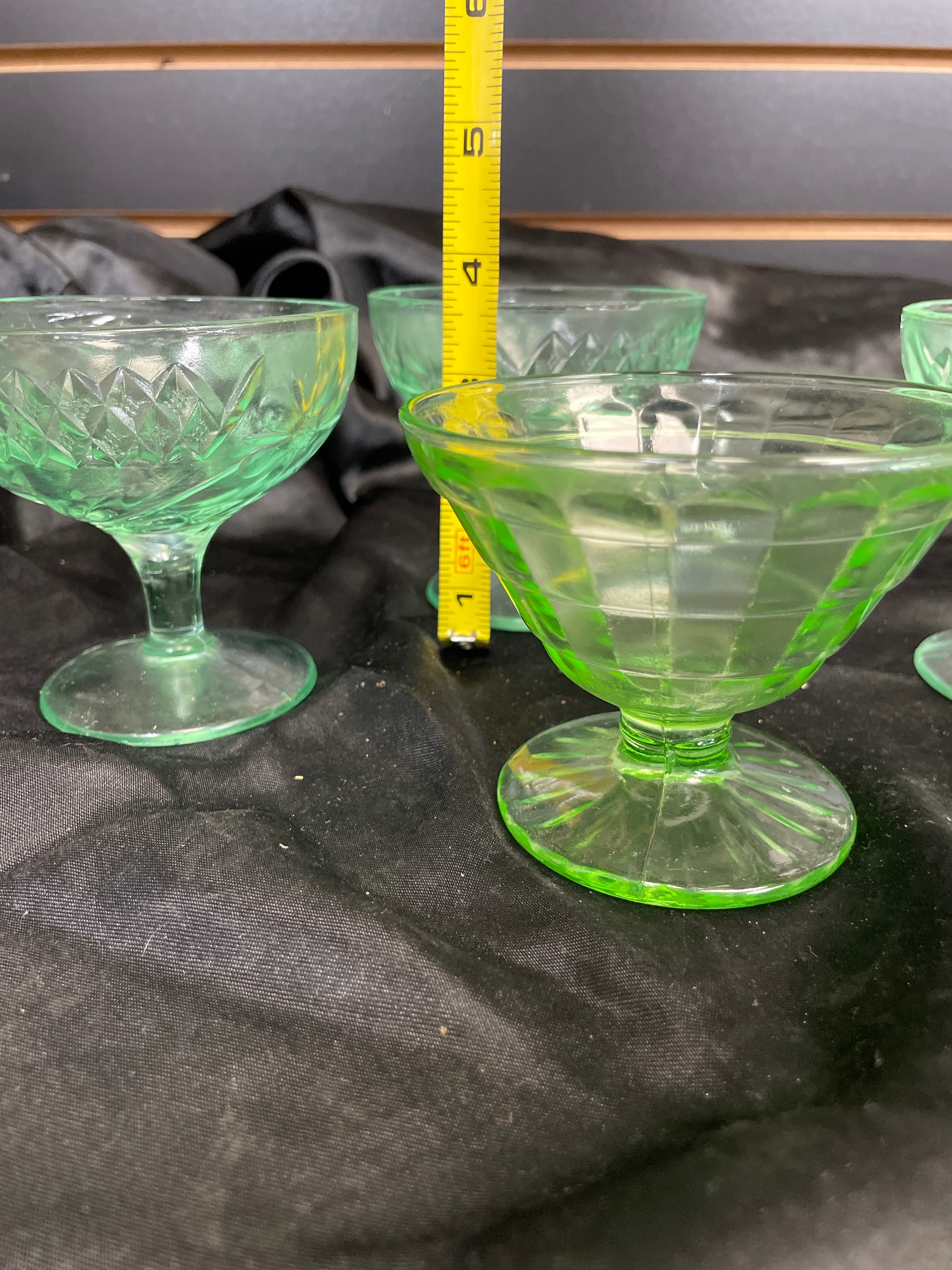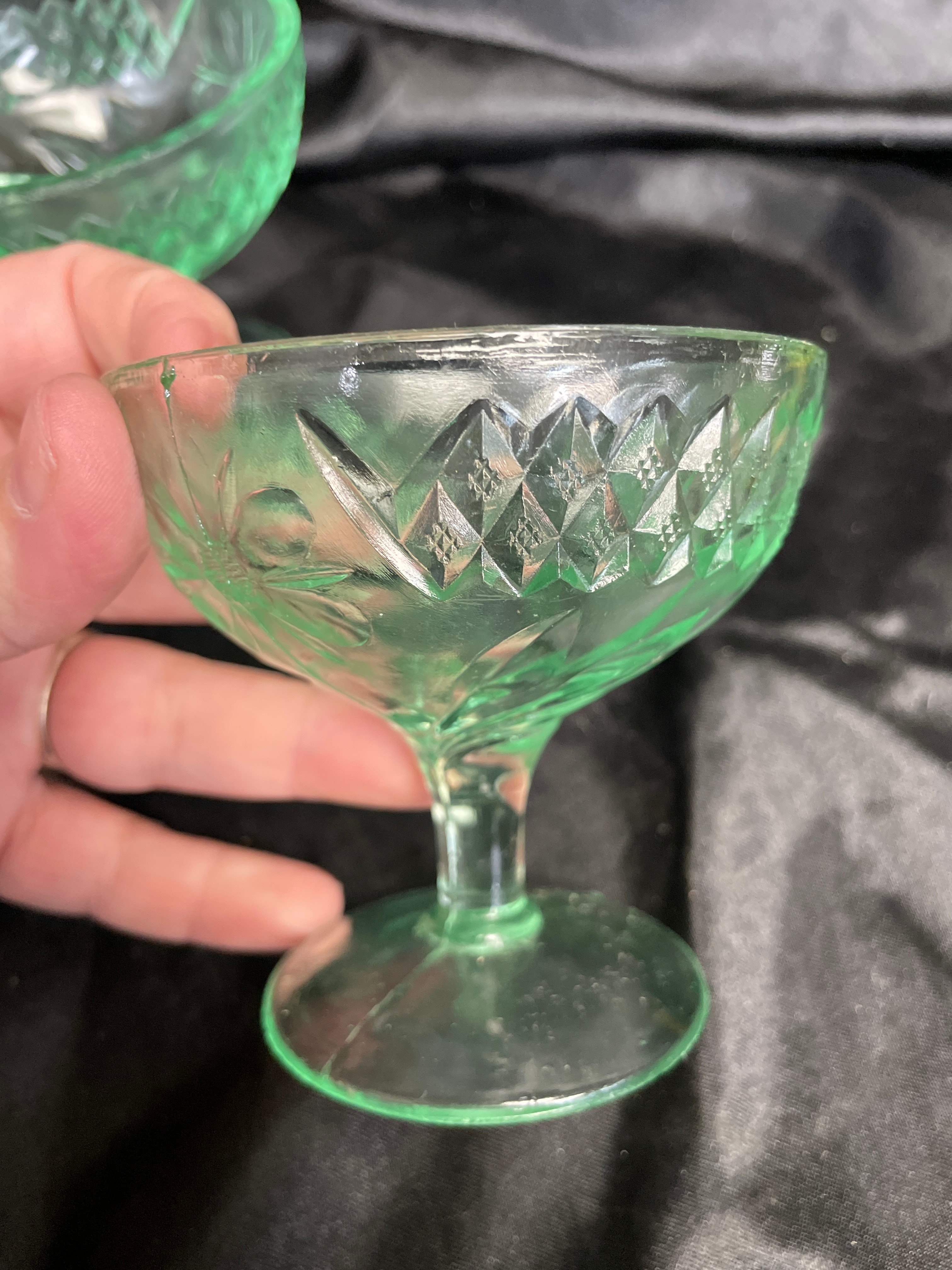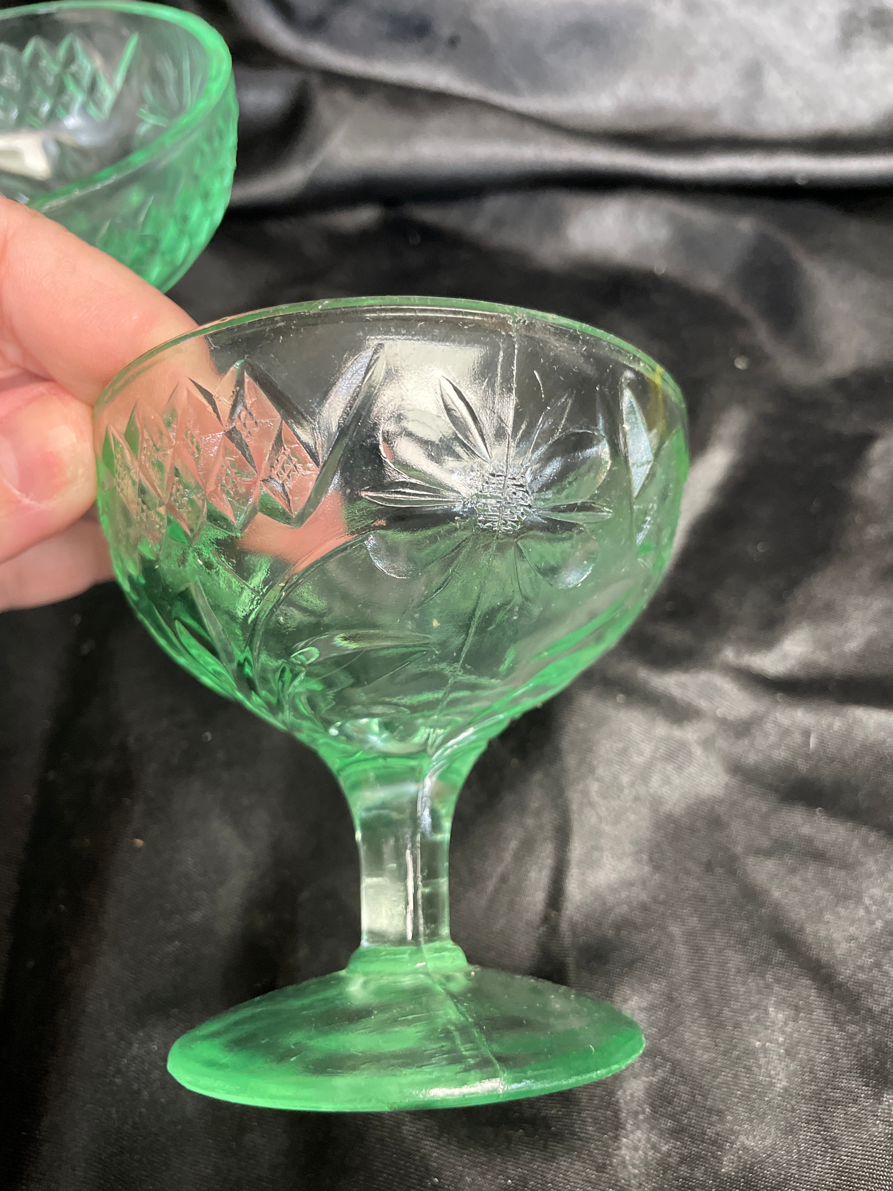 A set of four small, footed dessert or sherbet dishes crafted from translucent pale green pressed glass. The glass exhibits a strong neon green fluorescence under ultraviolet light, indicative of uranium content. The set displays two distinct pressed glass patterns: two dishes feature a diamond-hatch design with interspersed stylized floral or starburst motifs, while the other two show a geometric grid or paneled pattern with a fluted foot. No manufacturer’s marks or discernible text are visible on any of the pieces.