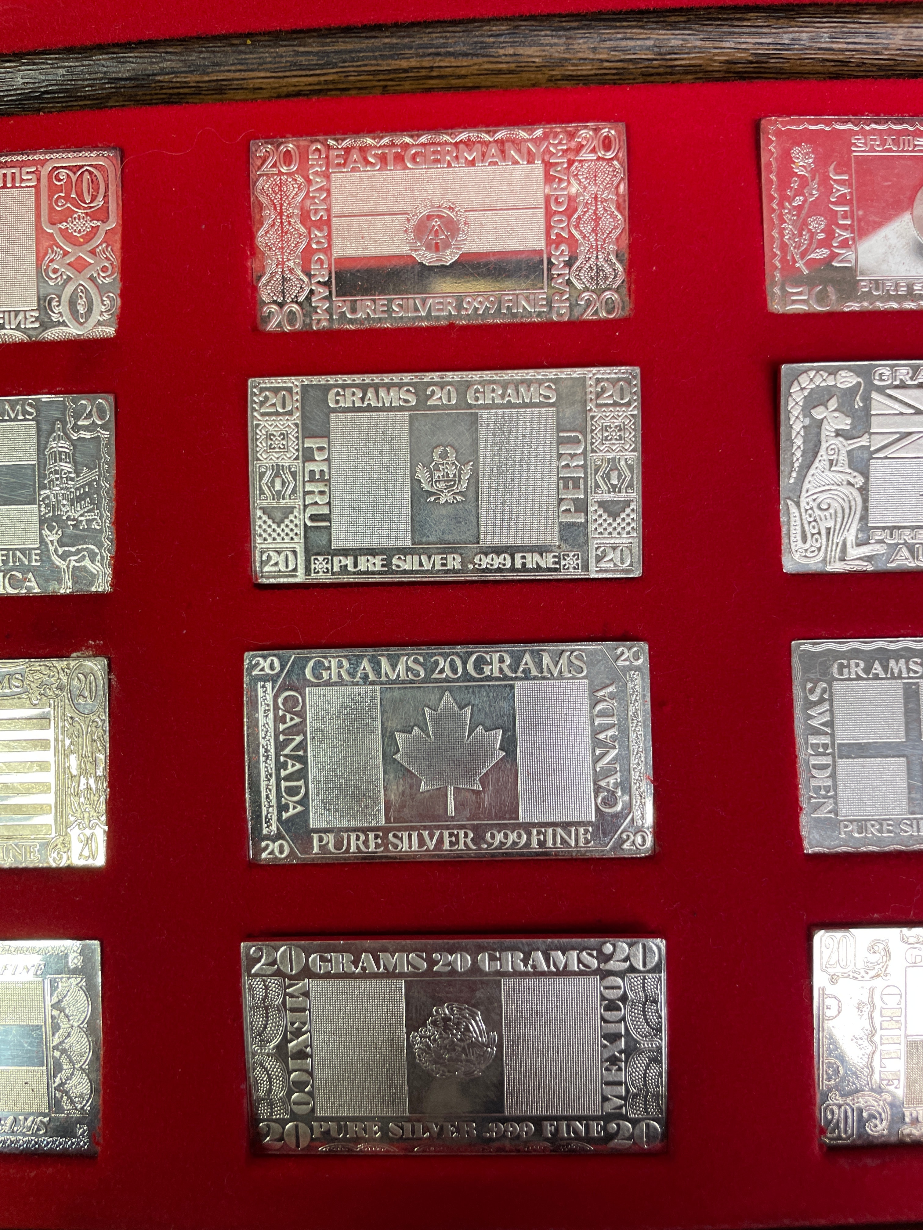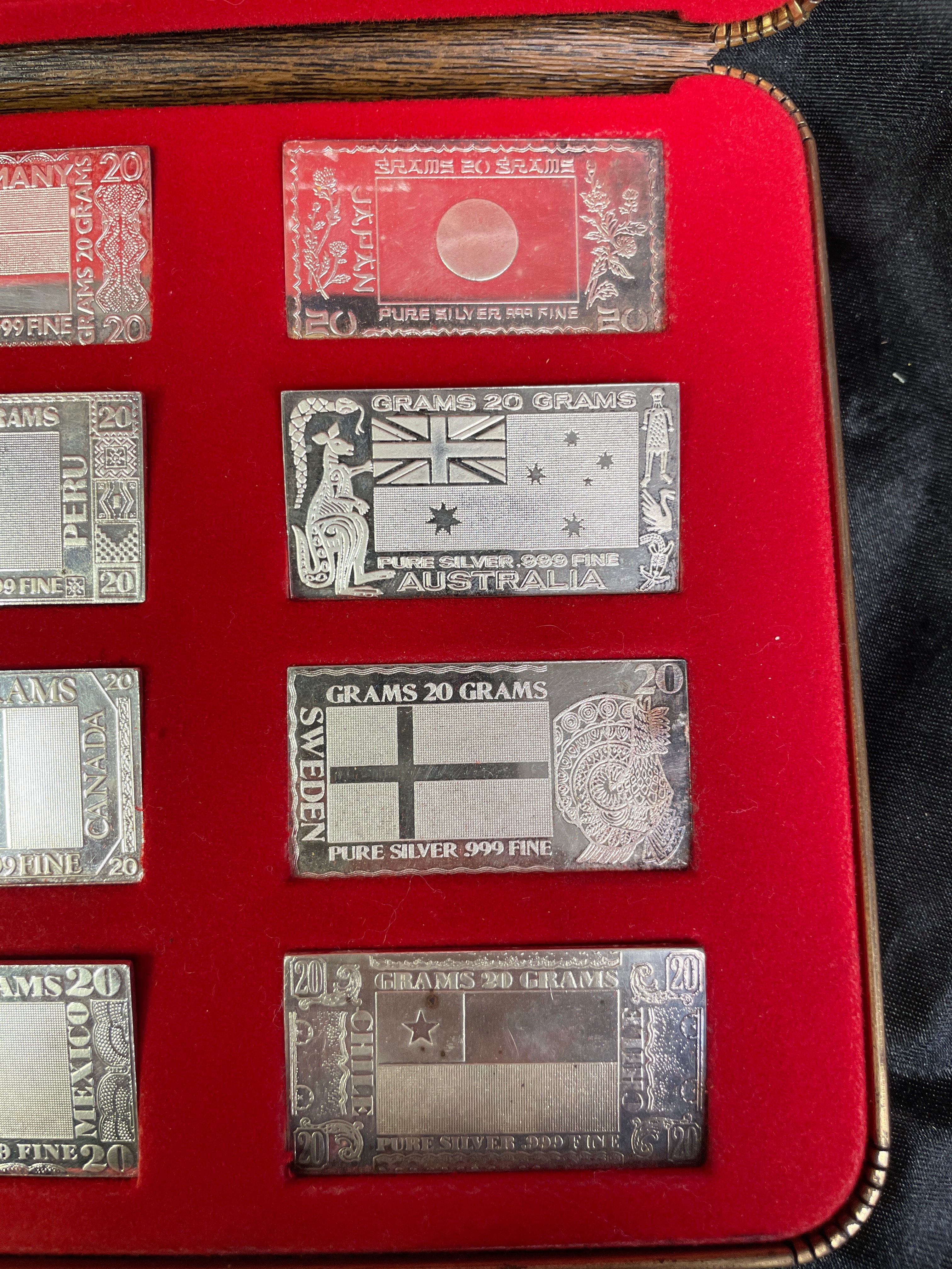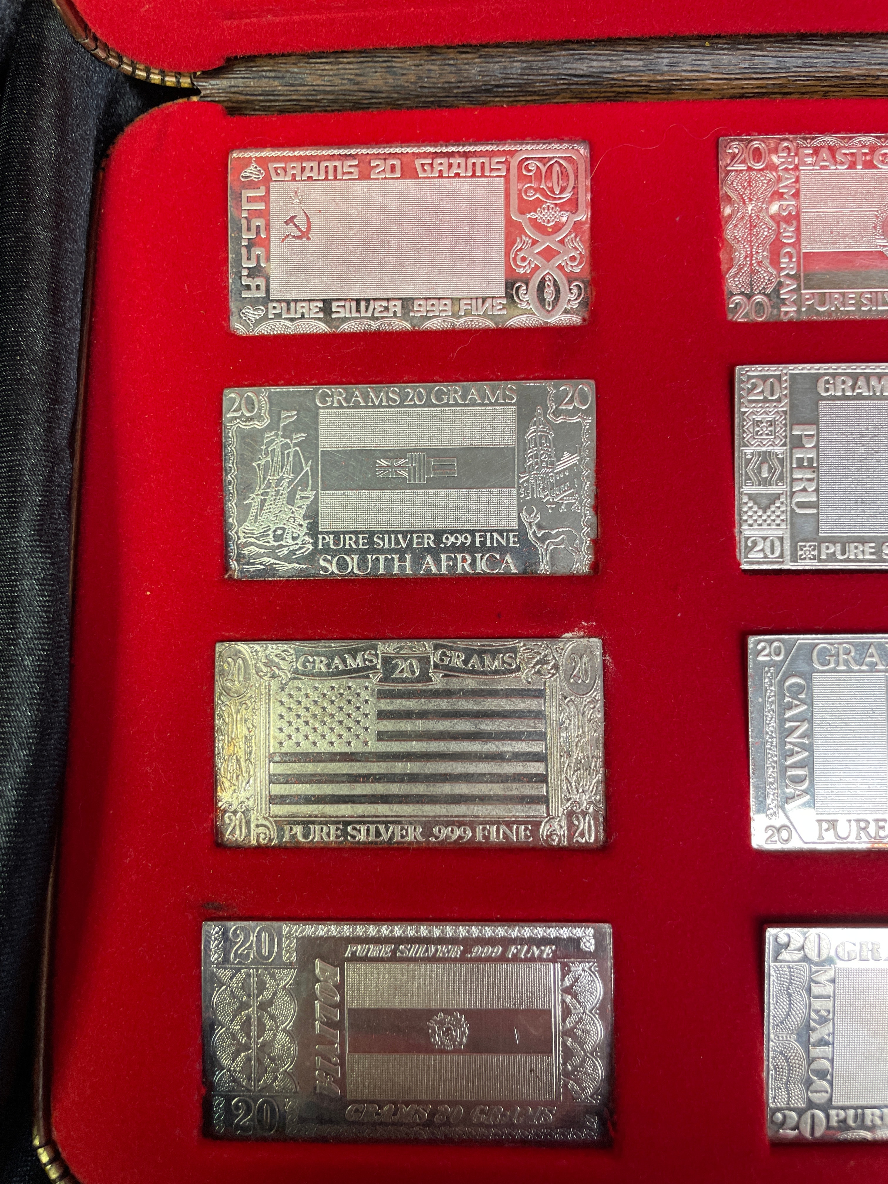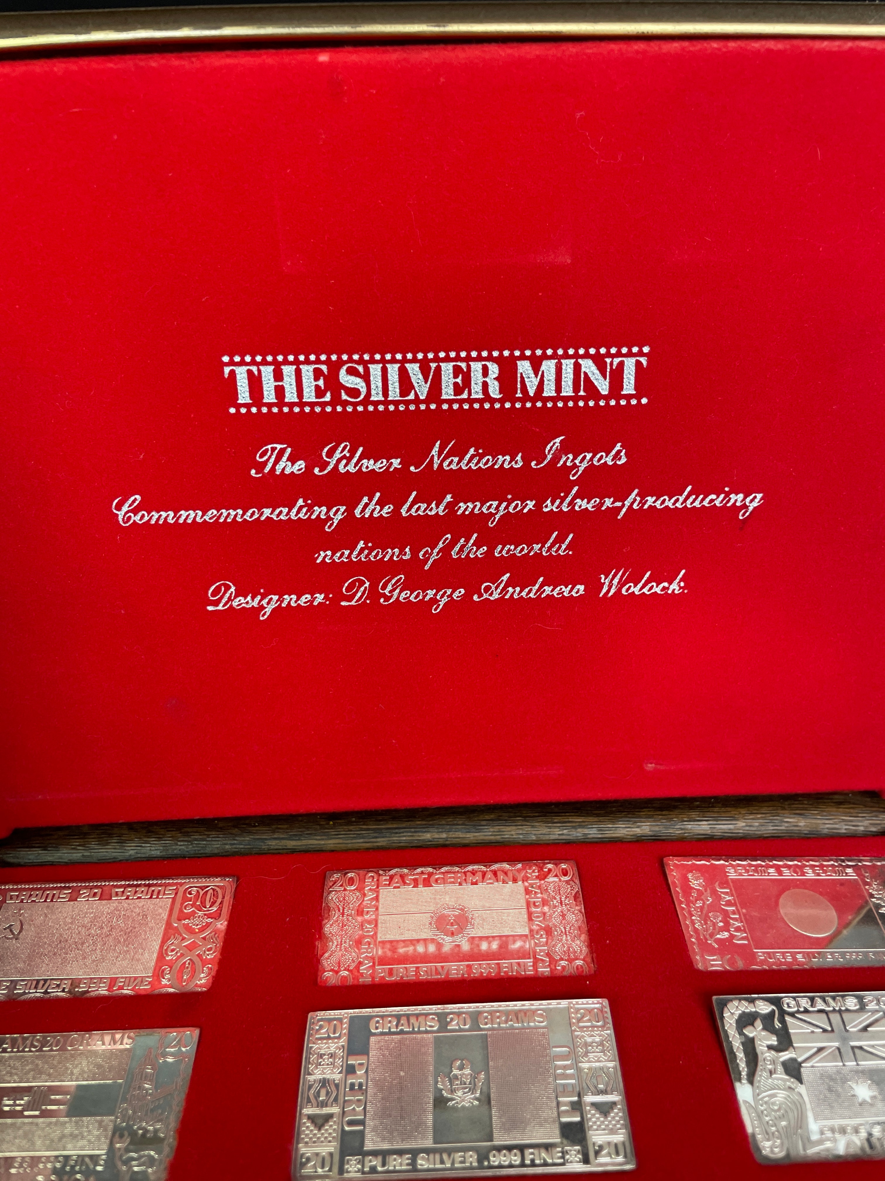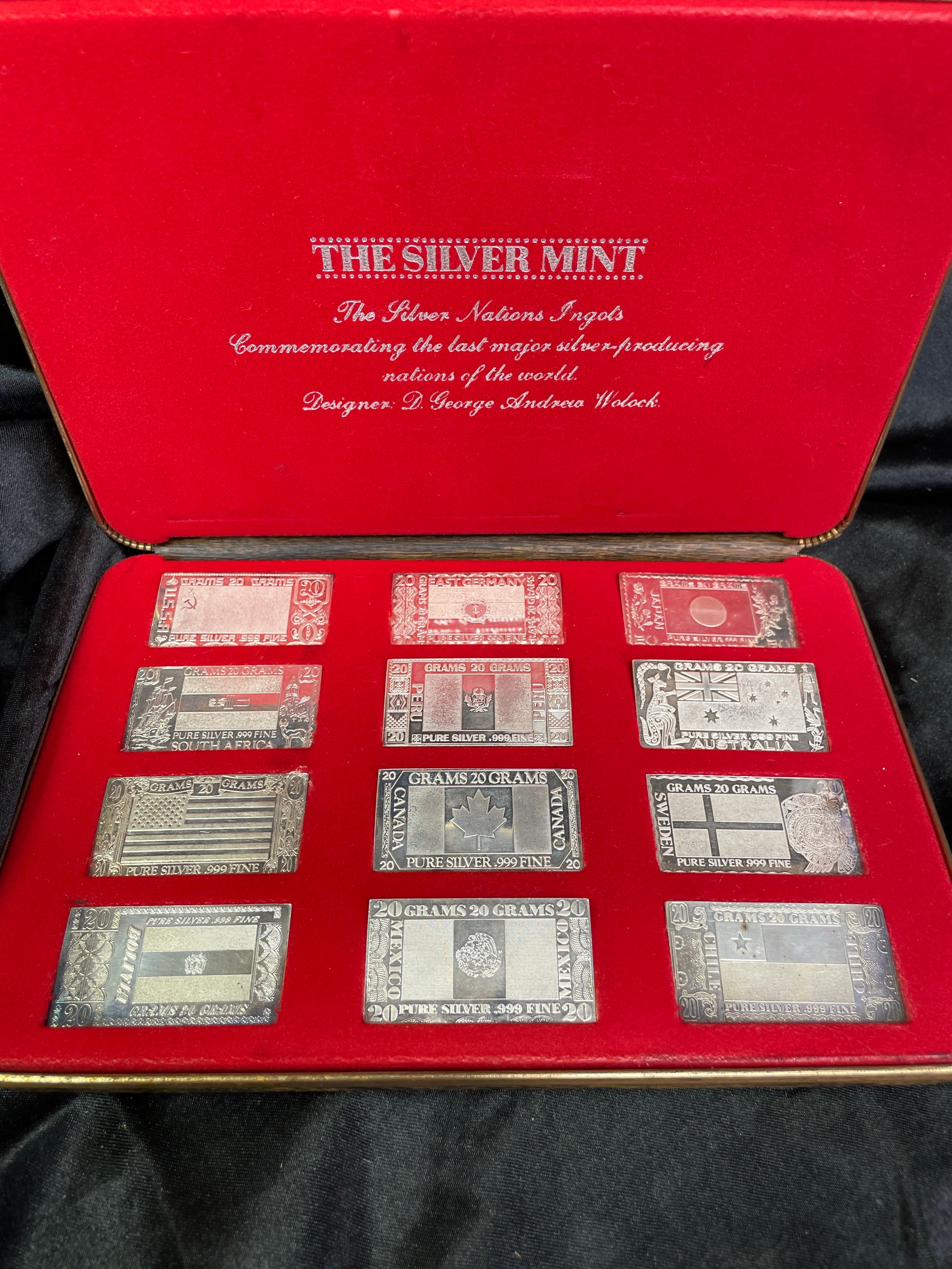 A commemorative set of twelve rectangular ingots, presented in a red velvet-lined display case. The lid’s interior is marked “THE SILVER MINT, ” “The Silver Nations Ingots, ” designed by “D. George Andrew Wolock, ” and “Commemorating the last major silver-producing nations of the world.” Each ingot is visibly marked “20 GRAMS” and “PURE SILVER .999 FINE” and depicts the flag or national emblem of a different country. The collection includes ingots for the USSR, East Germany, Japan, South Africa, Peru, Australia, USA, Canada, Sweden, Bolivia, Mexico, and Chile. The inclusion of the USSR and East Germany flags places the thematic context of the collection to the period before the early 1990s.