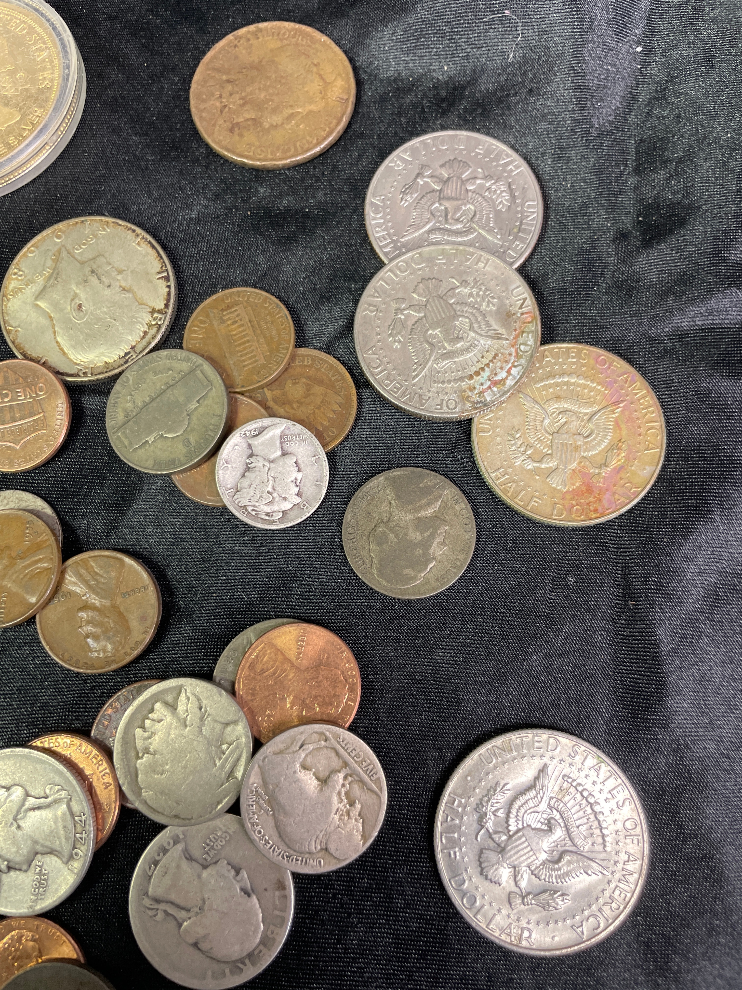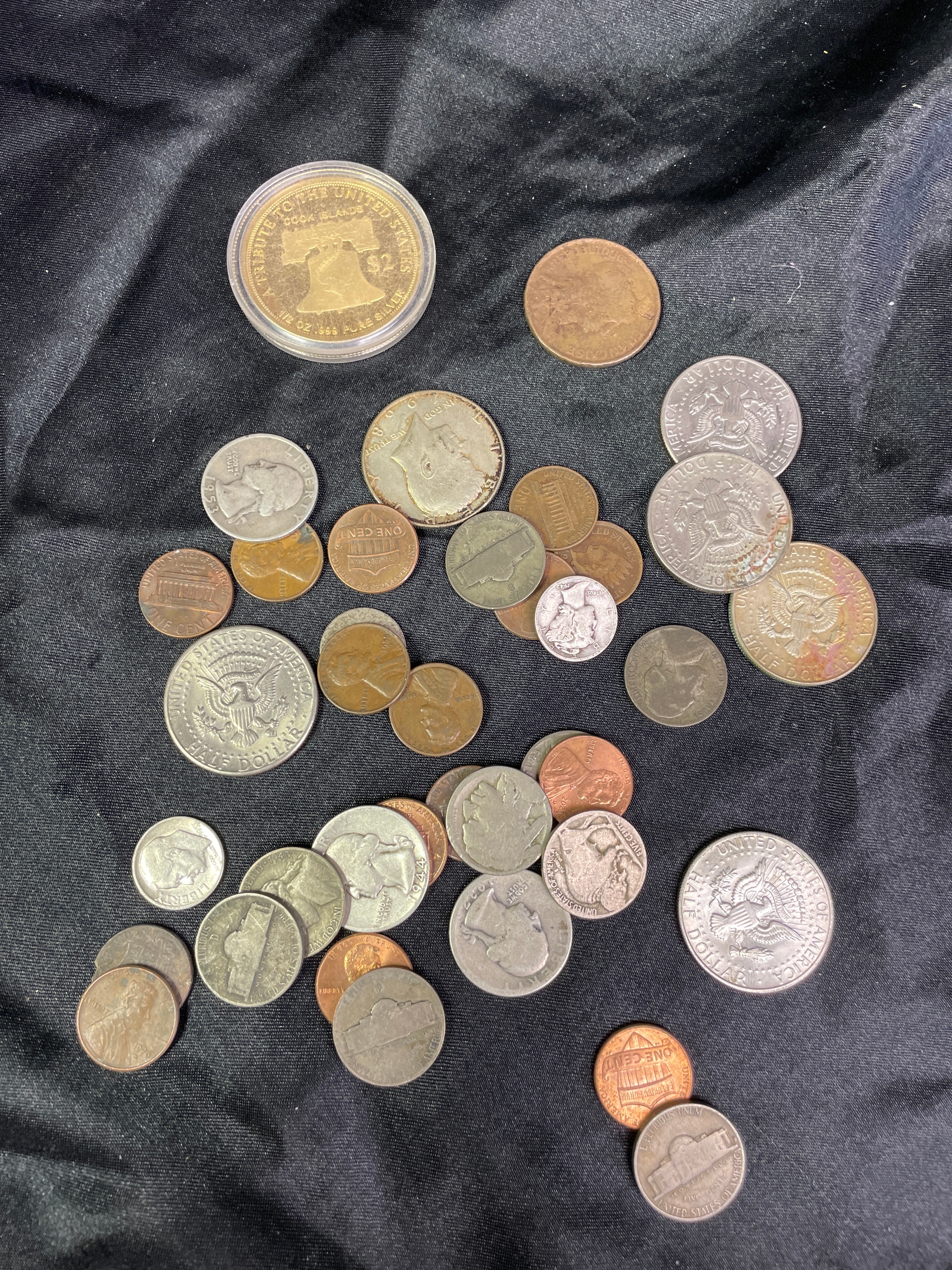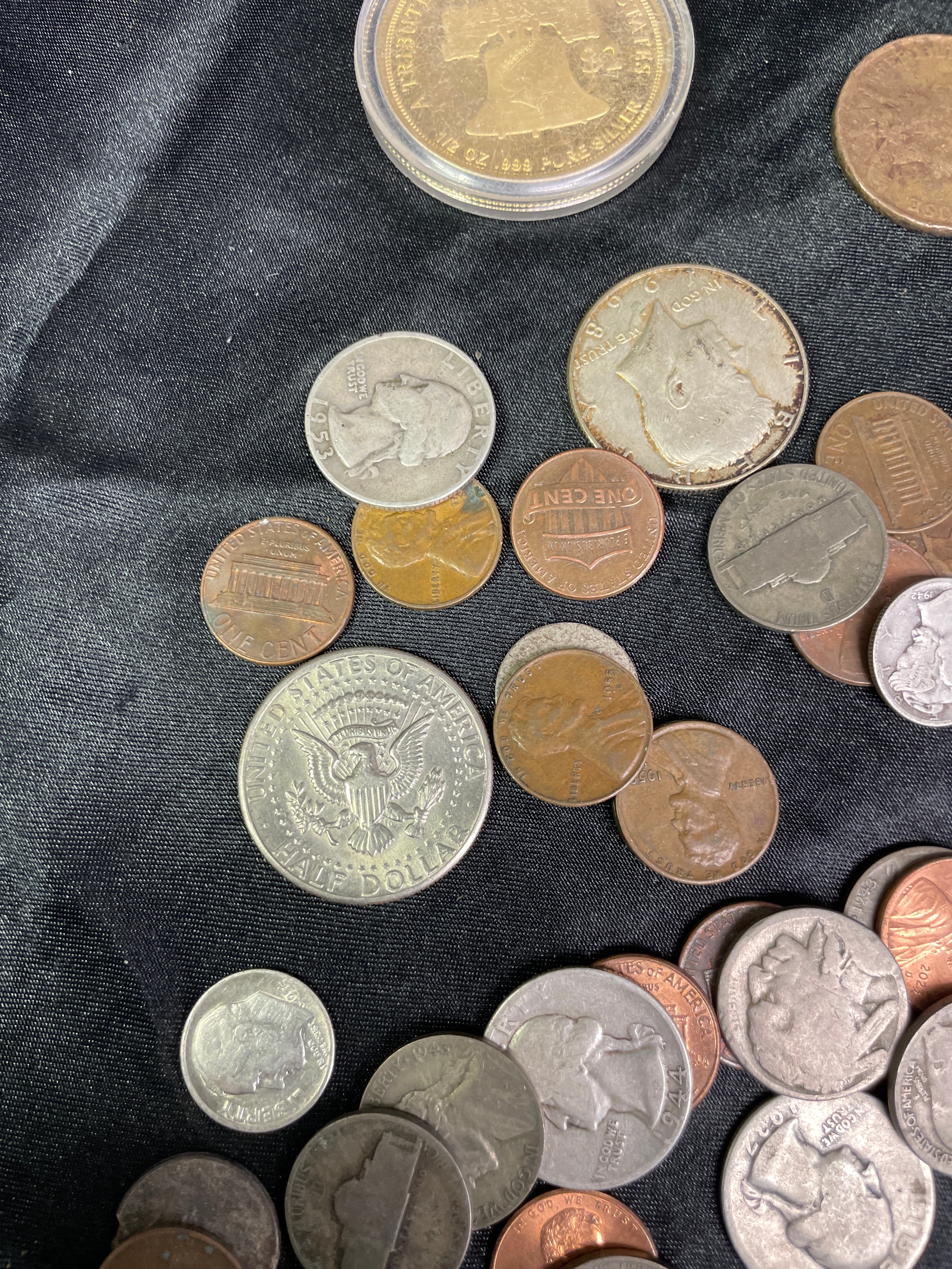 This lot comprises approximately 50-60 assorted United States coins. A prominent feature is a cased 2004 1/2 oz. .999 Pure Silver commemorative round, inscribed “UNITED STATES OF AMERICA,” “ONE HALF DOLLAR,” and “LIBERTY BELL,” depicting the Liberty Bell. The remaining loose coinage includes various denominations and periods, such as copper/bronze Lincoln Cents (with at least one legible 1909 VDB mark), Jefferson and Buffalo Nickels, Roosevelt and Mercury Dimes, Washington and Standing Liberty Quarters, and Kennedy and Walking Liberty Half Dollars. The coins are composed of a mix of metallic alloys consistent with U.S. minting practices.