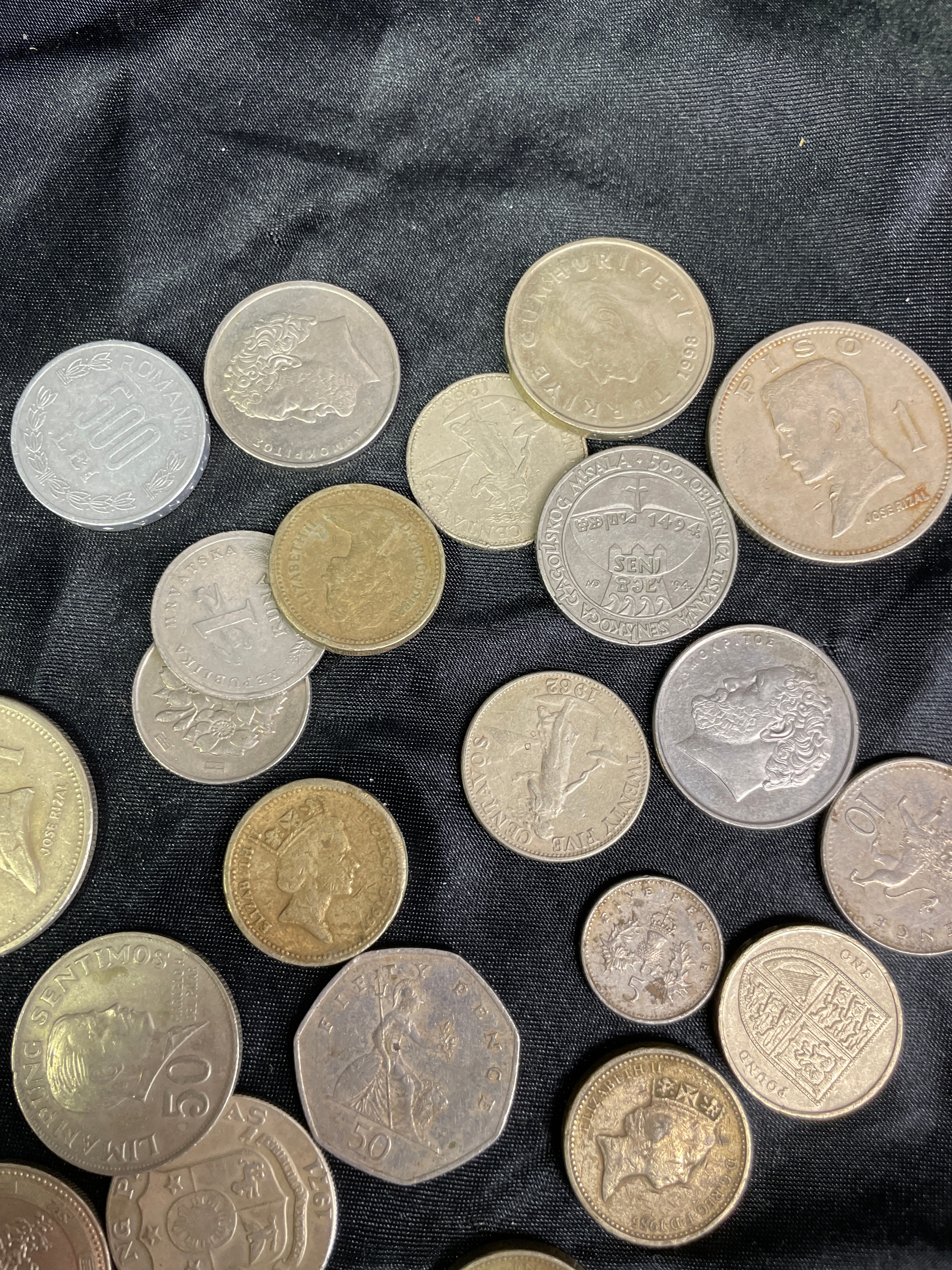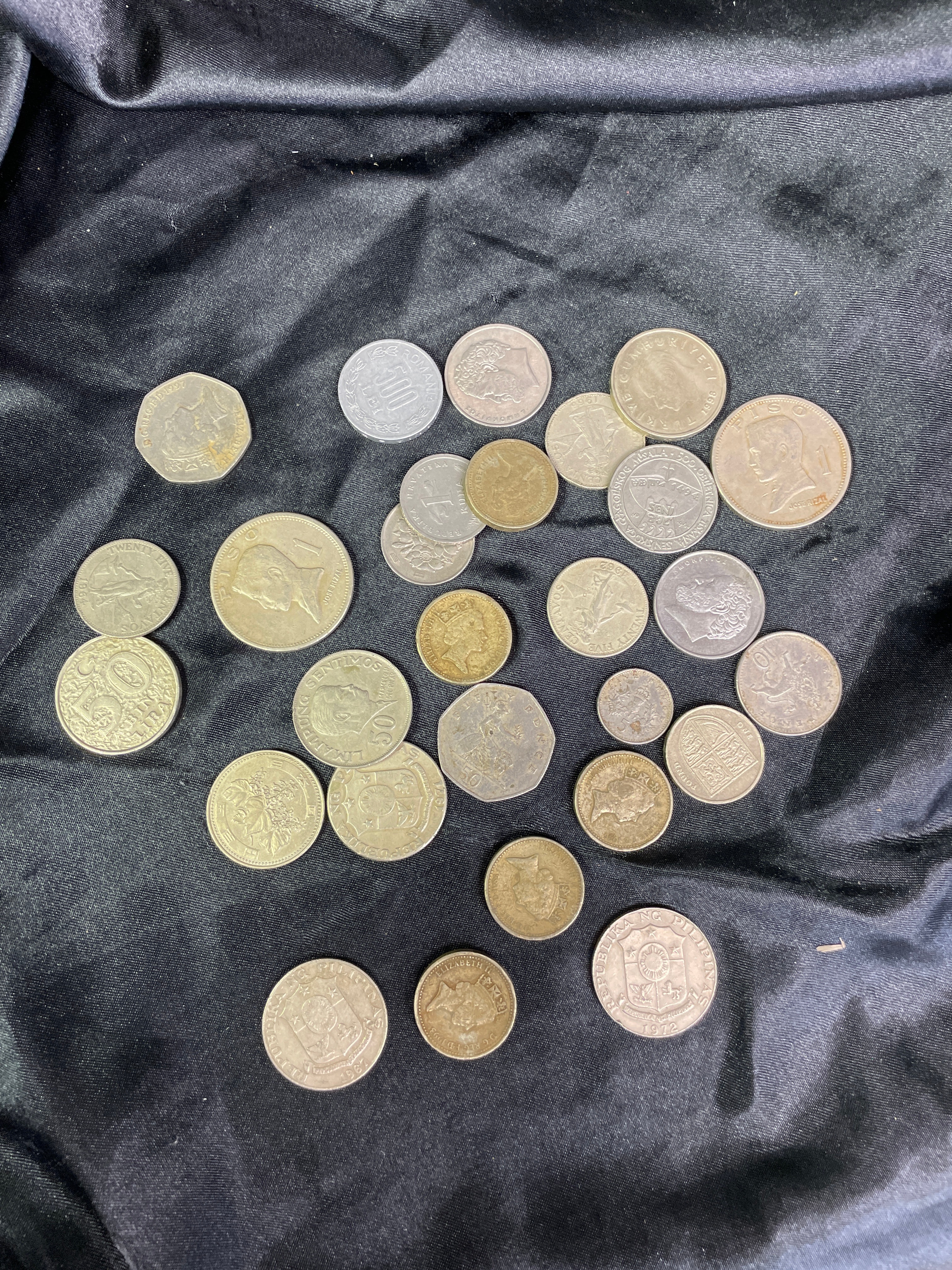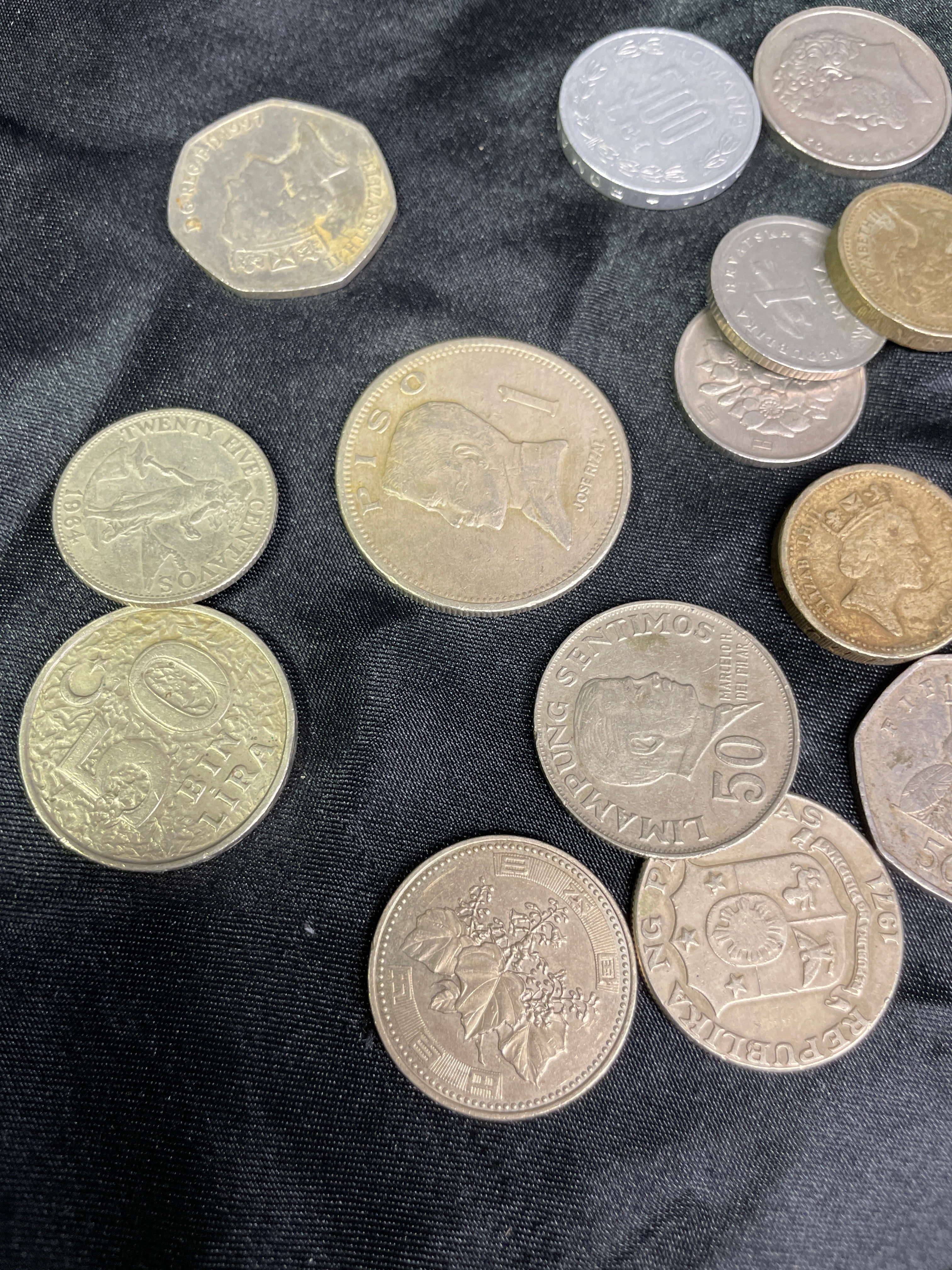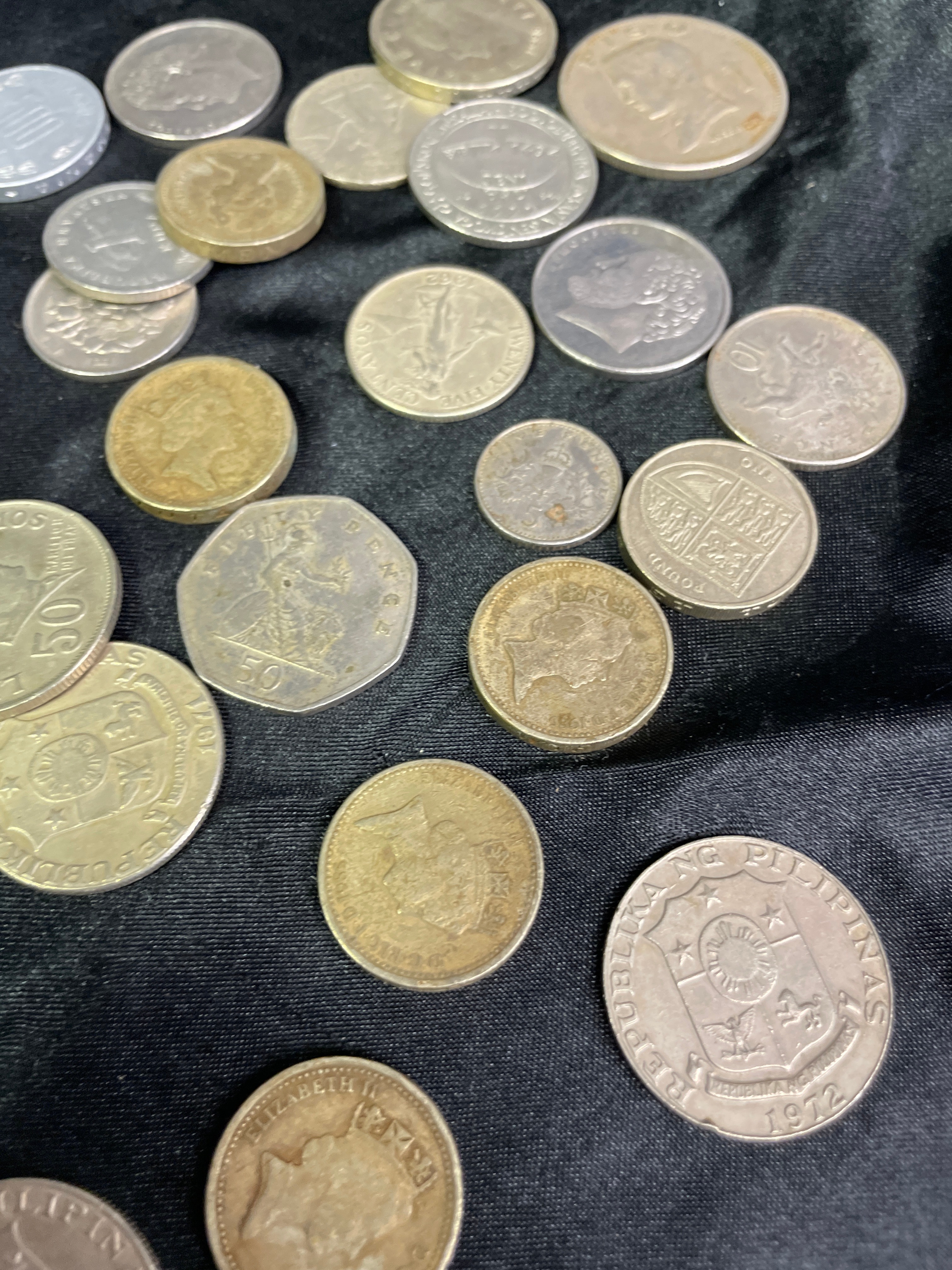 This collection comprises approximately 30-40 assorted metallic coins from diverse global origins, predominantly dating from the early to late 20th century, with visible dates including 1932, 1958, and various 1960s-1980s dates. The collection displays a mix of styles, sizes, and denominations, featuring coinage from the Philippines (“REPUBLIKA NG PILIPINAS,” “JOSE RIZAL,” “SENTIMOS,” “CENTAVOS,” “ONE PESO”), United Kingdom or Commonwealth nations (“QUEEN ELIZABETH THE SECOND,” “KING GEORGE THE SIXTH,” “ONE SHILLING,” “FIFTY PENCE”), Italy (“LIRE”), Romania (“BANI” on a hexagonal coin), Ethiopia (“EMPEROR HAILE SELLASSIE I,” “BIRA”), France (“REPUBLIQUE FRANCAISE”), Germany (“DEUTSCHE BUNDESREPUBLIK”), Portugal (“REPUBLICA PORTUGUESA,” “ESCODOS”), Singapore, Brazil, and Japan (“100 YEN”), among others. The coins are comprised of both silver-toned and gold-toned metals.