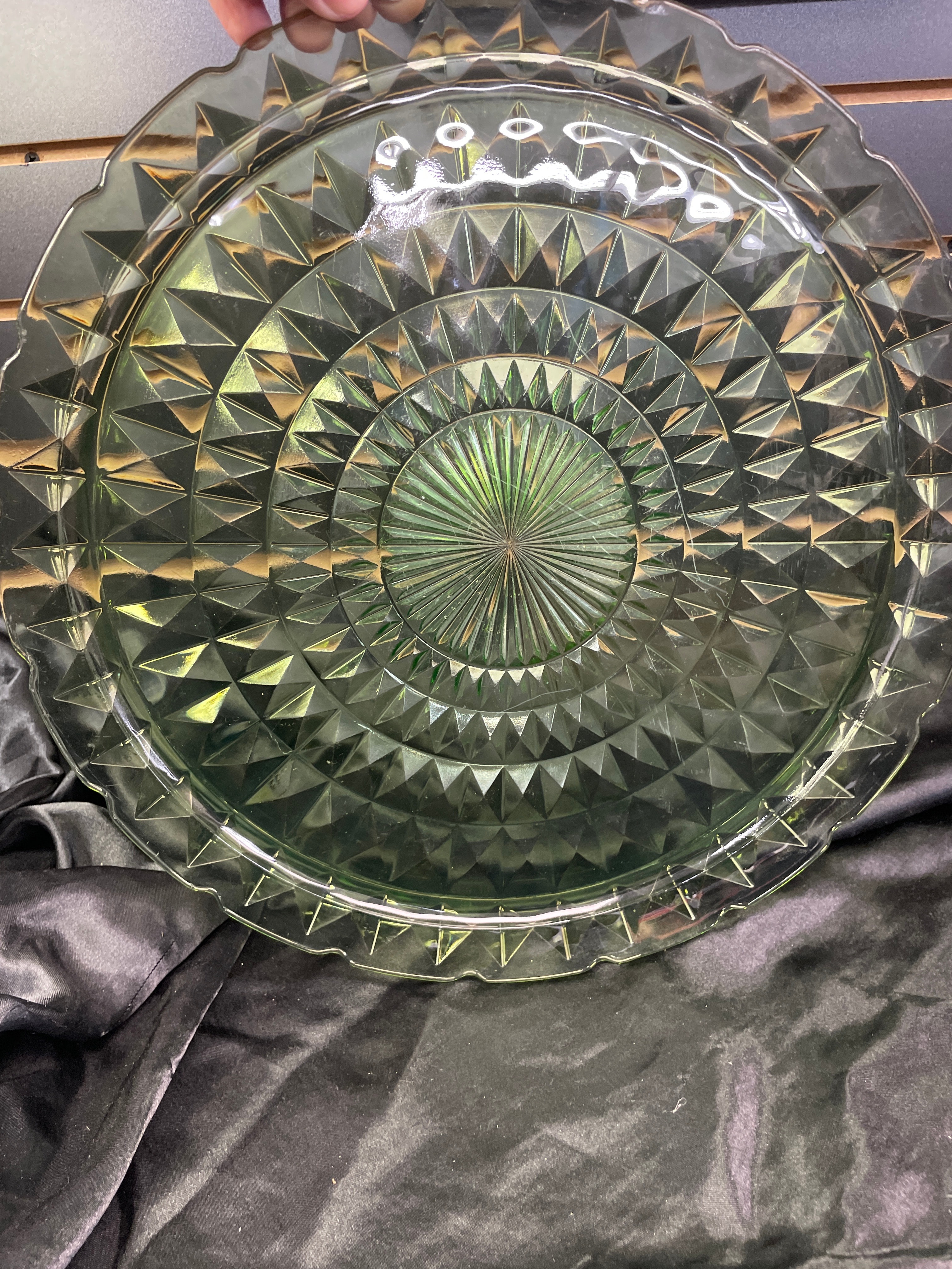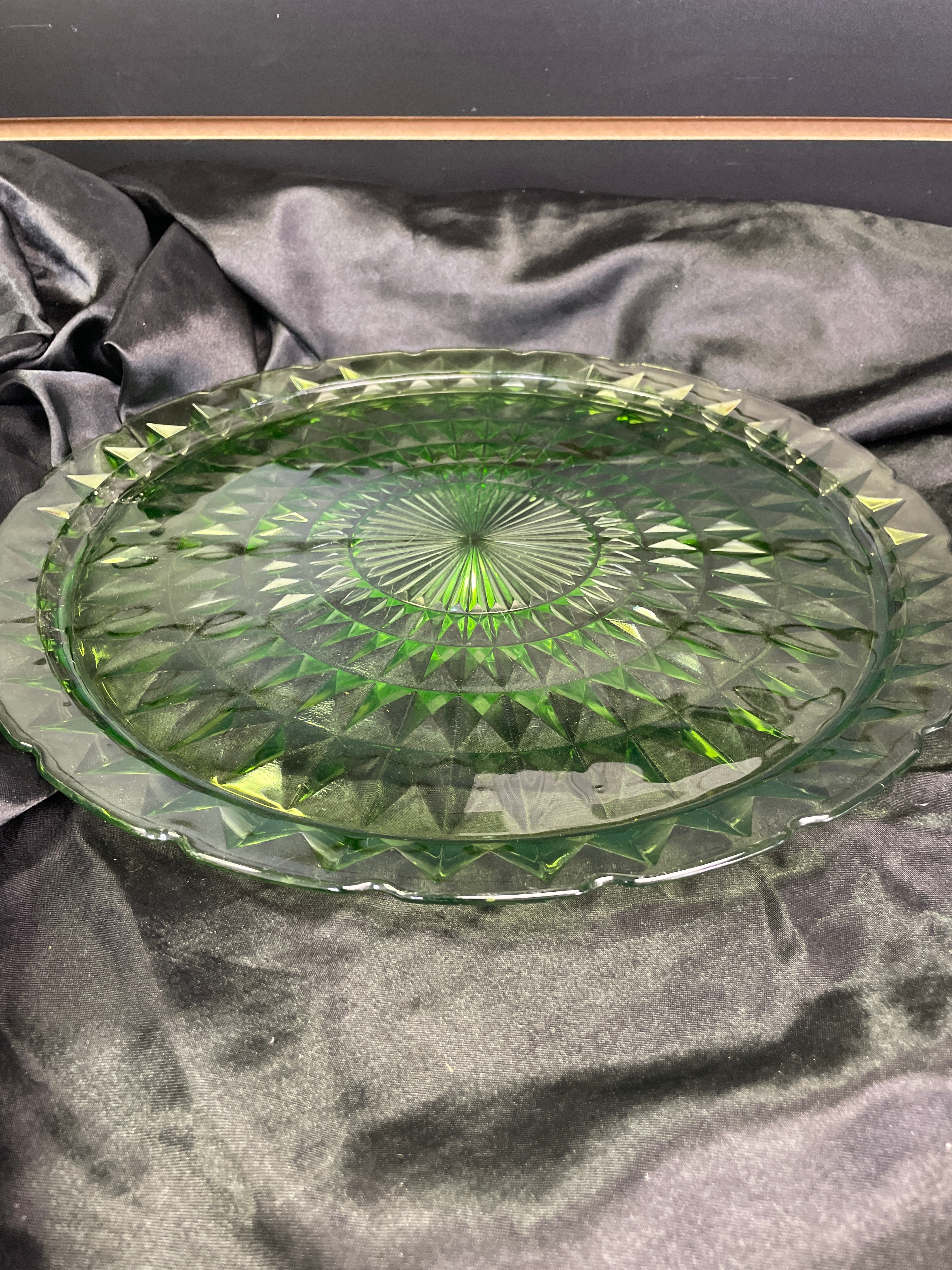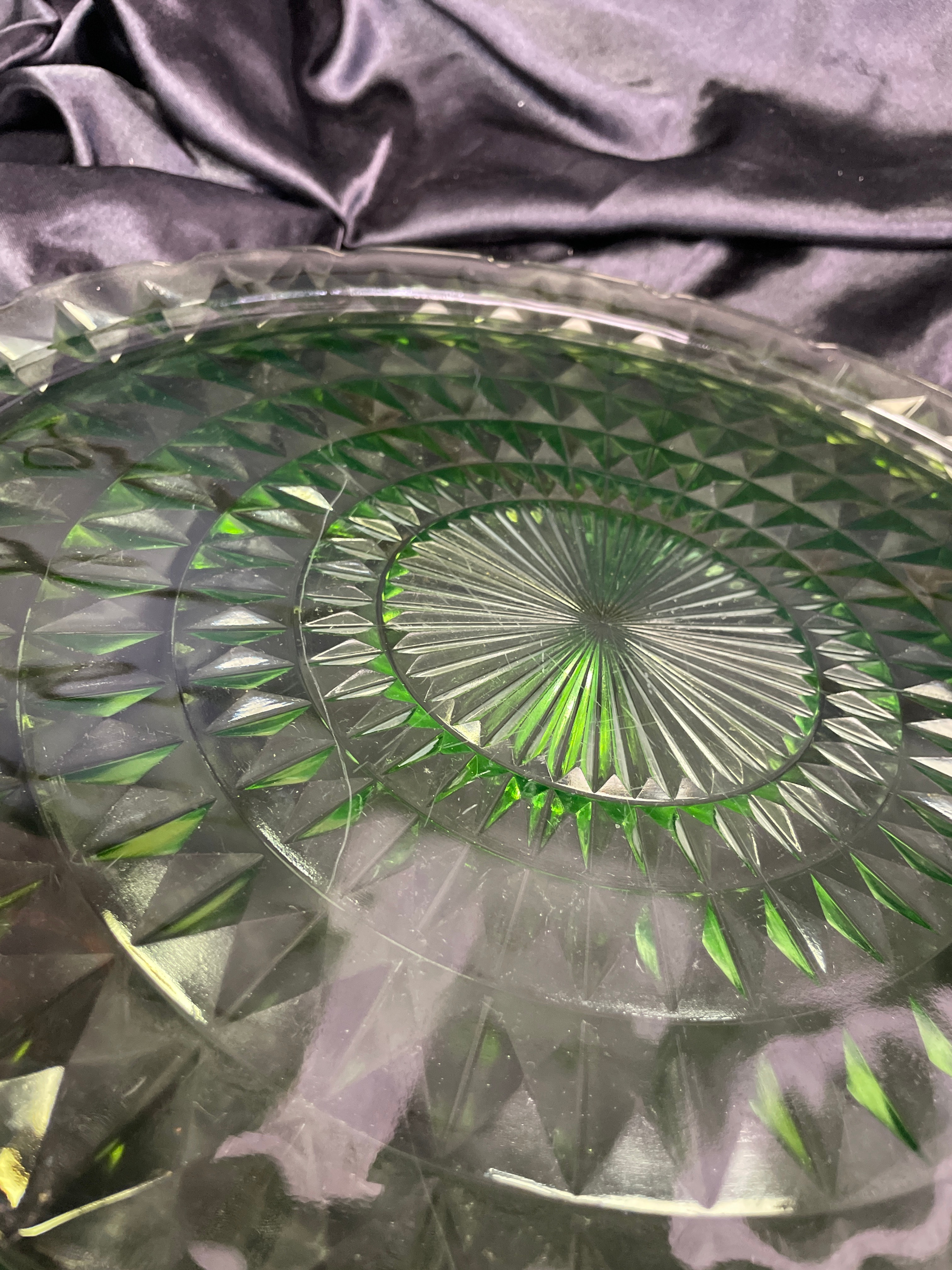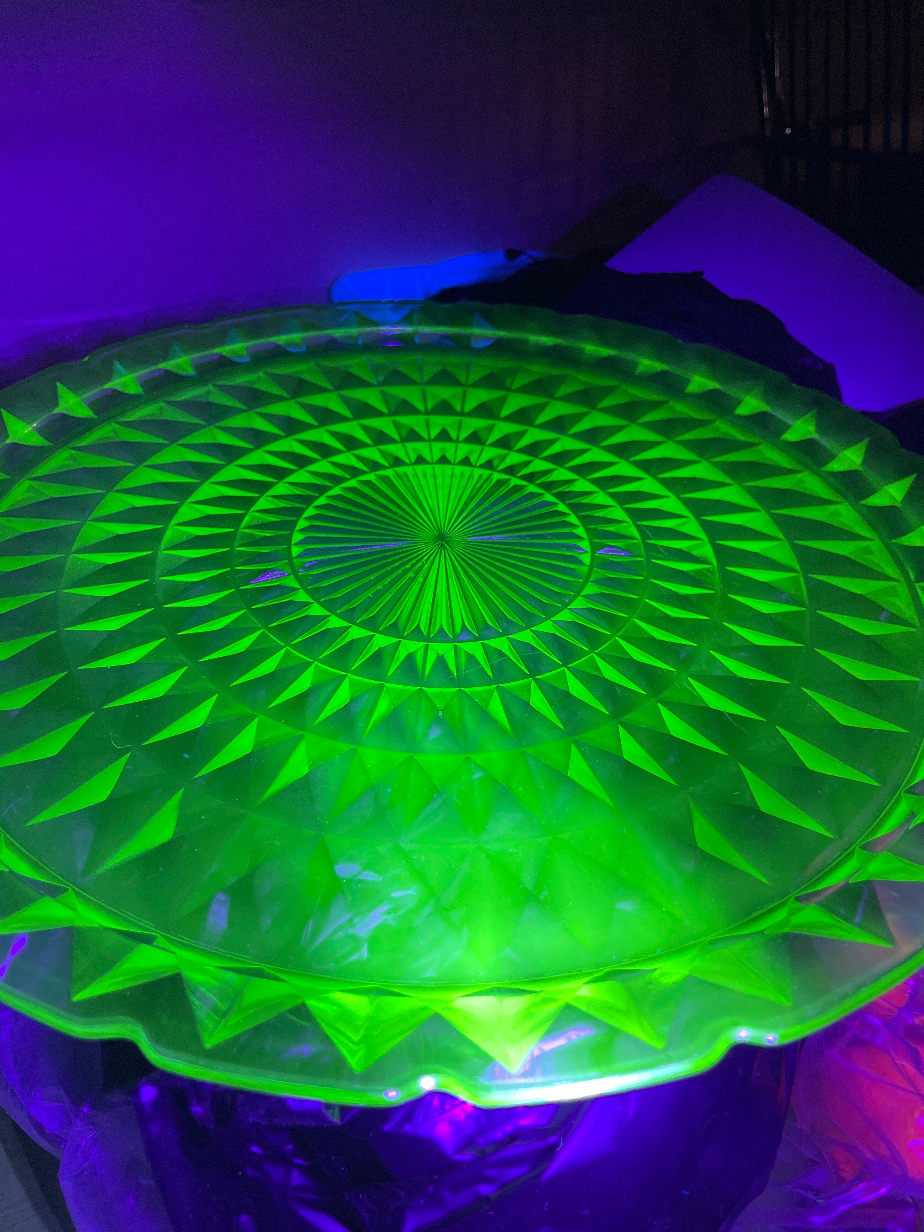 A round, green pressed glass serving plate or platter. The item exhibits strong bright green fluorescence under ultraviolet light, indicating it is uranium glass. The design features a central radial sunburst pattern, surrounded by concentric bands of raised, faceted diamond or triangular motifs. The rim has a gently scalloped or ruffled edge. No manufacturer’s marks, text, or signatures are discernible.