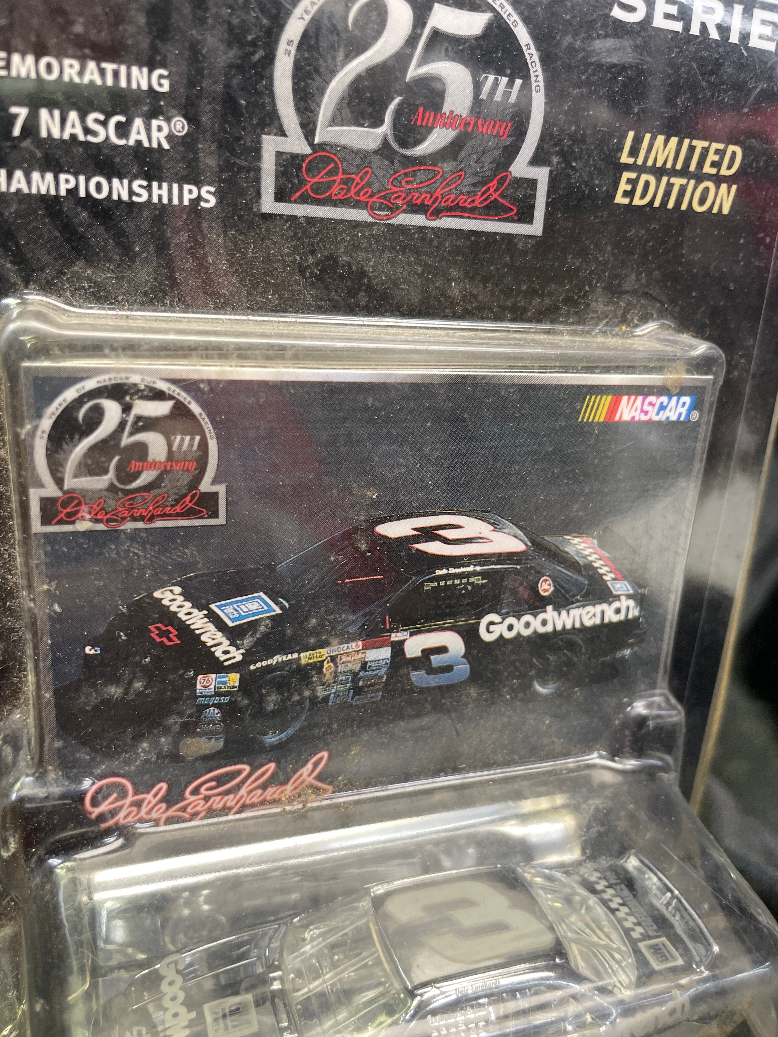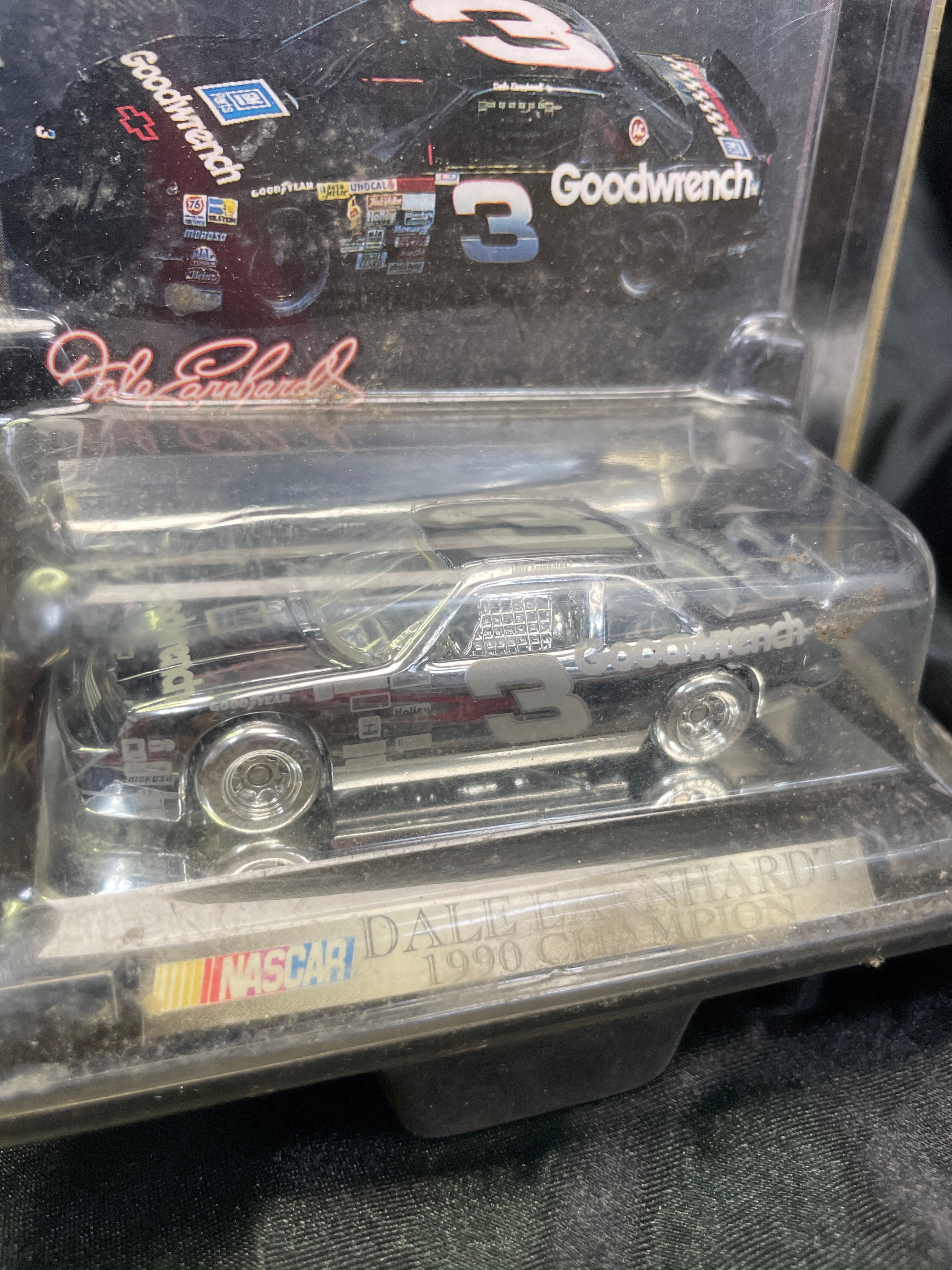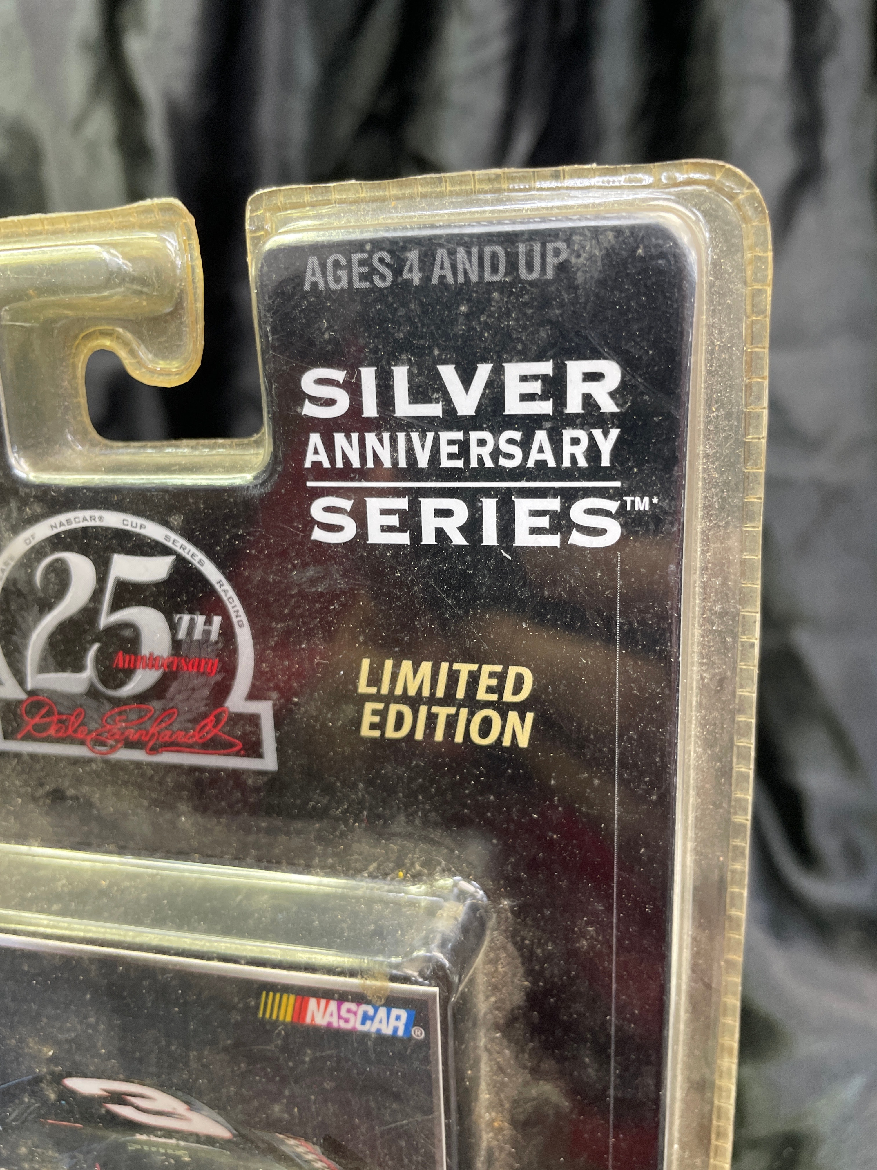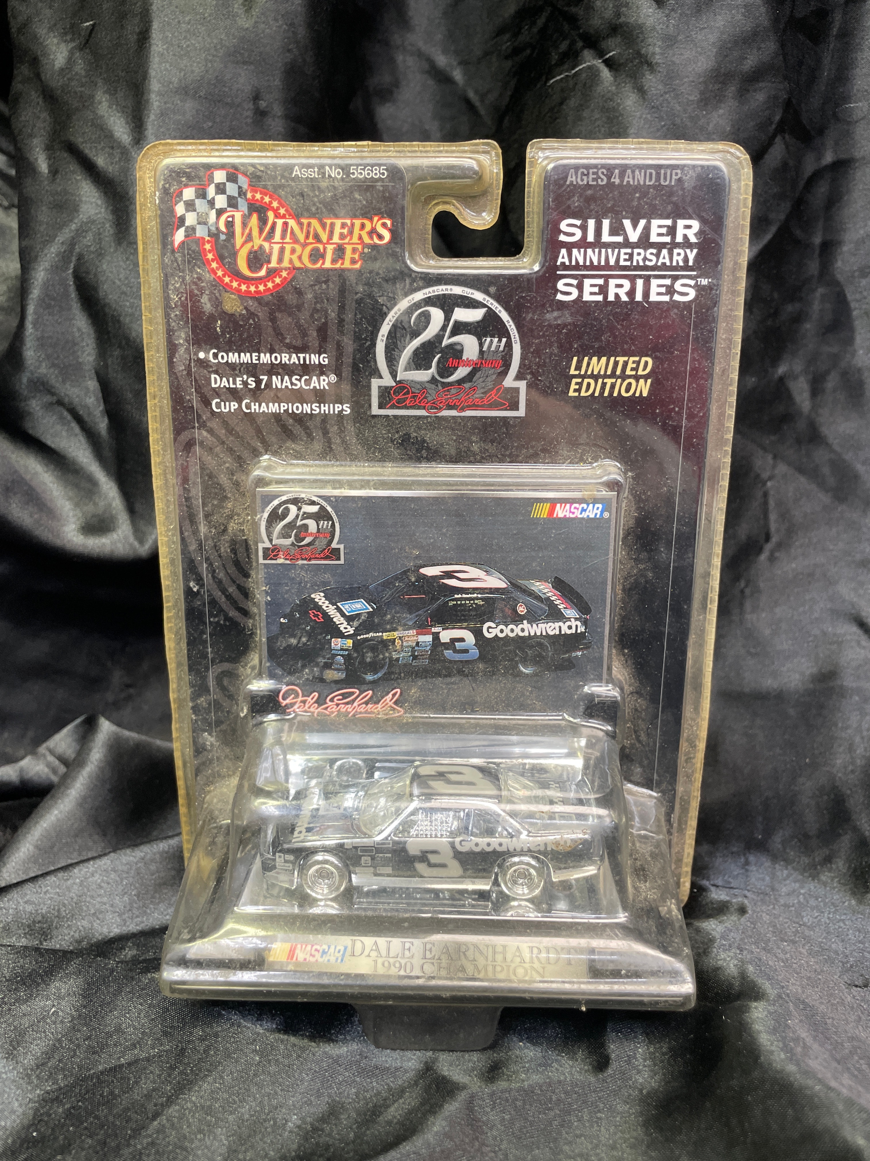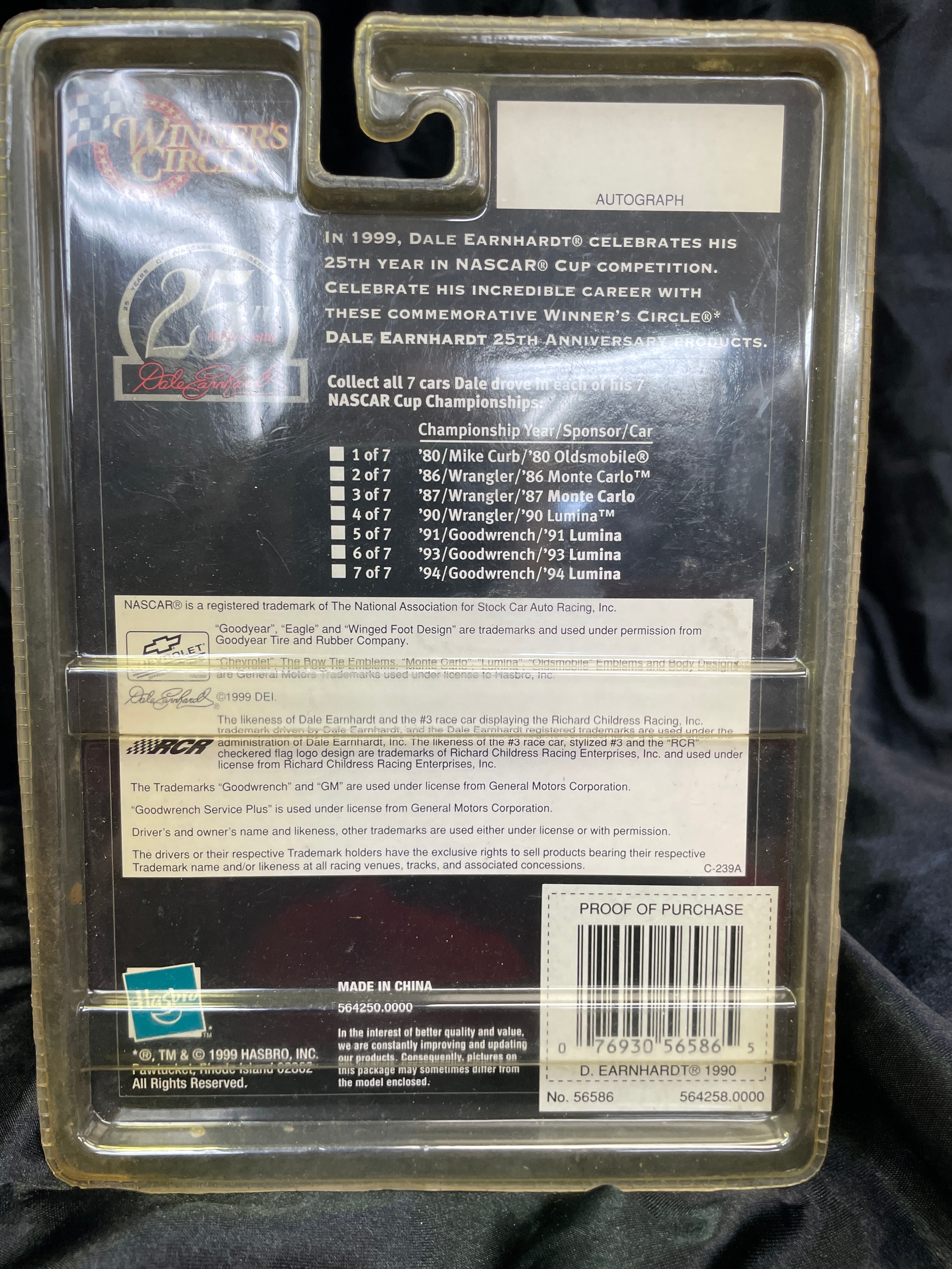 A Dale Earnhardt Winner’s Circle 25th Silver Anniversary Series 1990 NASCAR Lumina die-cast model car. This 1:64 scale replica of Dale Earnhardt’s #3 Goodwrench 1990 NASCAR Lumina race car is presented in its original, unopened plastic blister packaging with a cardboard backing. The packaging indicates it is part of the “Winner’s Circle Silver Anniversary Series, ” commemorating Dale Earnhardt’s 25th year in NASCAR competition in 1999, and is a “Limited Edition.” Visible text includes “Ages 4 and Up, ” “Asst. No. 55685,” “Commemorating Dale’s 7 NASCAR Cup Championships, ” and “Dale Earnhardt 1990 Champion.” The back of the package, dated ©1999 DEI and marked “Made in China, ” details the series as part of a “Collect All 7 Cars” collection, identifying this particular car as “3 of 7 ’90/Wrangler/90 Lumina.”