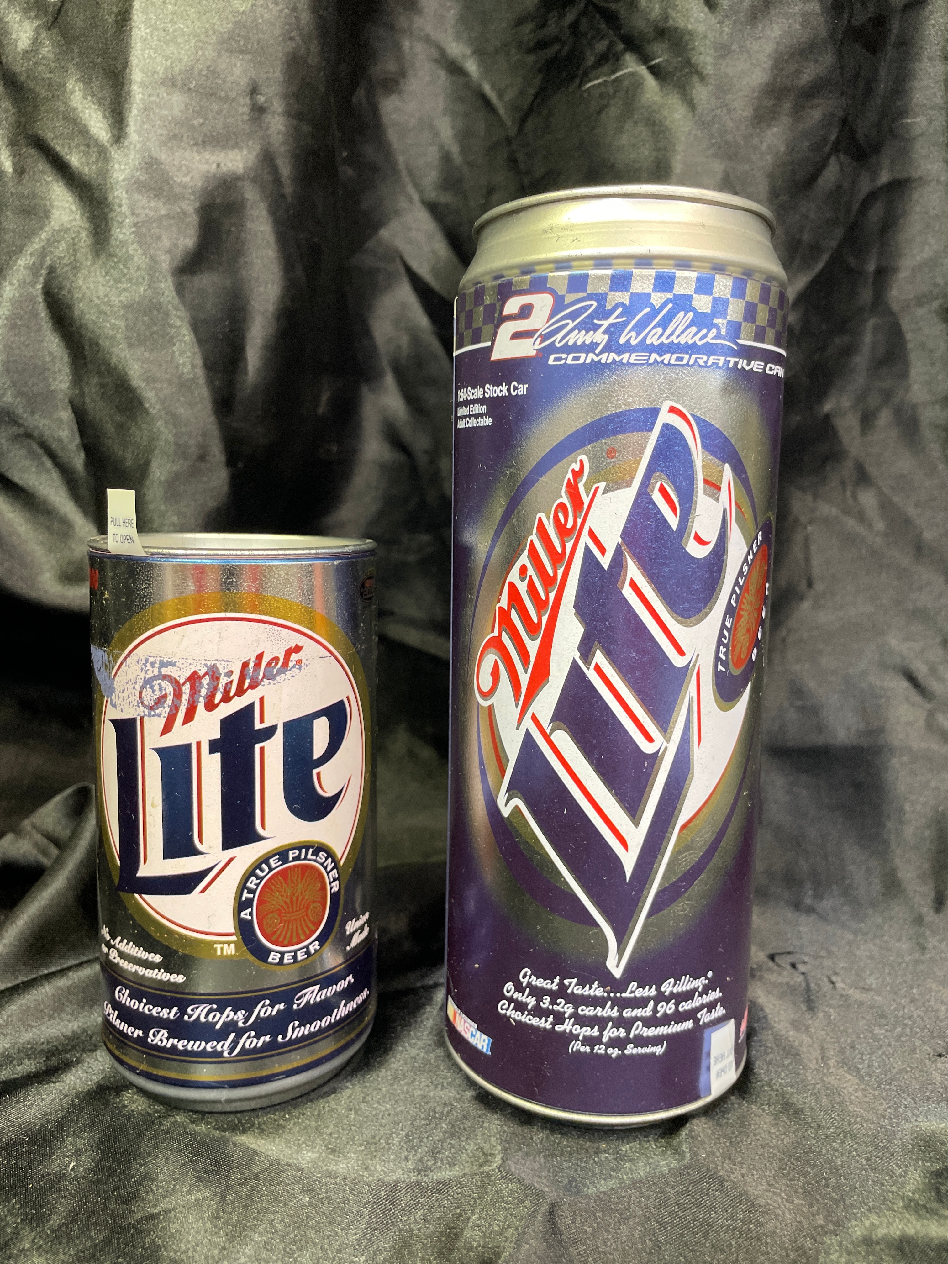 A pair of Miller Lite aluminum cans. The first is a 2005 Rusty Wallace #2 Miller Lite Charger in Can Limited Edition, explicitly identified by a base label (P/N 110556). This commemorative can features “Rusty’s Last Call” and “Penske Racing 2005” with imagery of Rusty Wallace and his #2 car. Text includes “Great Taste…Less Filling®” and “EXACT SCALE REPLICA VEHICLES ARE INTENDED FOR ADULT COLLECTORS”, indicating it contains a 1/64-scale stock car. It is sealed with a modern stay-tab. The second can is a standard Miller Lite aluminum can, featuring classic Miller Lite graphics with text “A TRUE PILSNER, ” “Choicest Hops for Flavor, ” and “Pilsner Brewed for Smoothness.” This can is opened via a modern stay-tab.