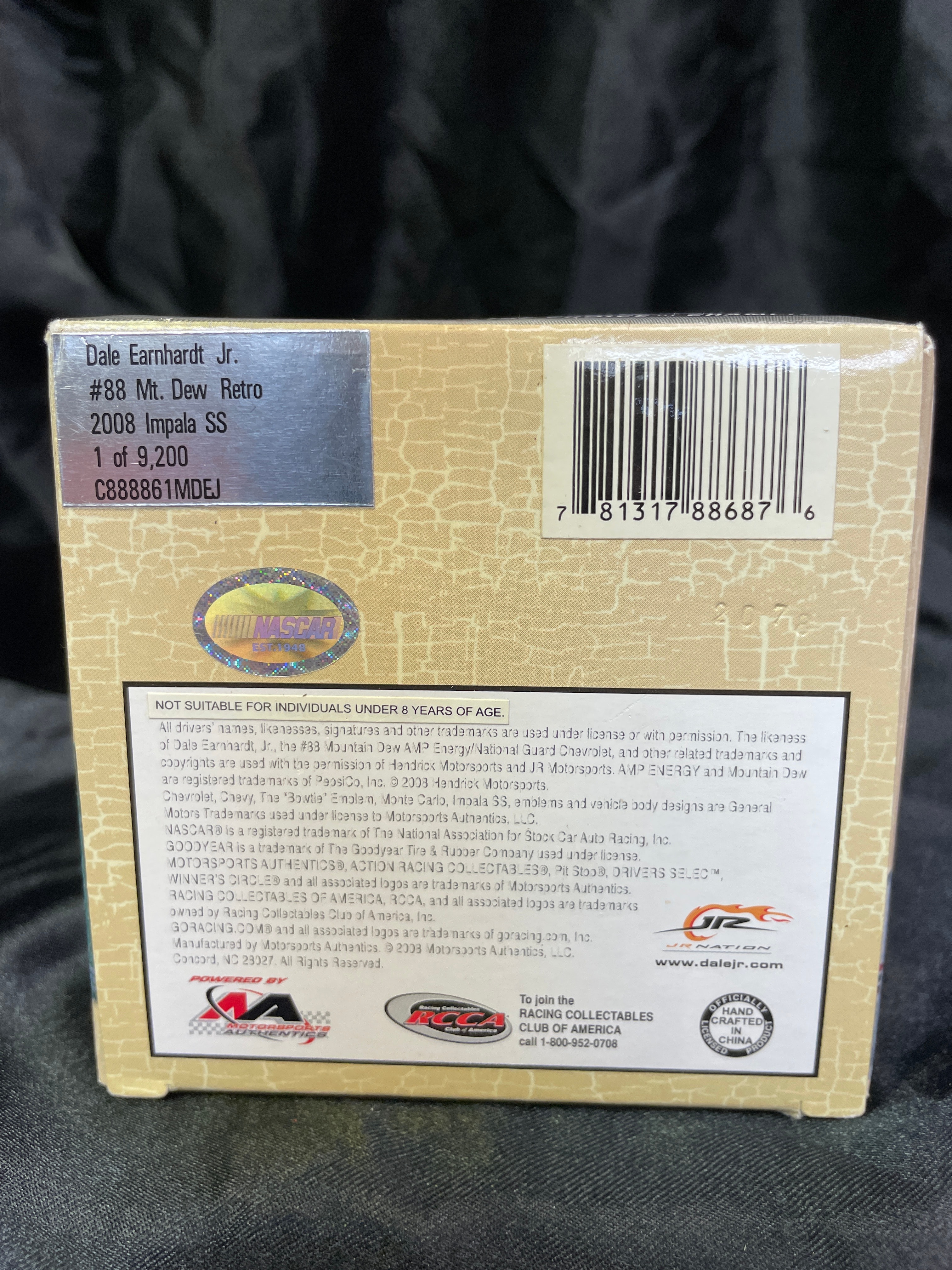 A 1:64-scale die-cast NASCAR collectible stock car by ACTION RACING COLLECTABLES, featuring the 2008 #88 Impala SS driven by Dale Earnhardt Jr. The car is decorated in green, white, and red, with “NATIONAL GUARD” and “MOUNTAIN DEW” sponsorship. This model is identified as a “Mt. Dew Retro” and part of the “OLD SCHOOL New School” branding, limited to “1 of 9,200” pieces, with the production number “C888861MDEJ”. The item is presented in its original cardboard box with a clear plastic display window, bearing “NASCAR, ” “Hendrick Motorsports, ” “JR NATION, ” and “Platinum Series” designations. The packaging also notes “NOT SUITABLE FOR INDIVIDUALS UNDER 8 YEARS OF AGE” and “Made in China.”