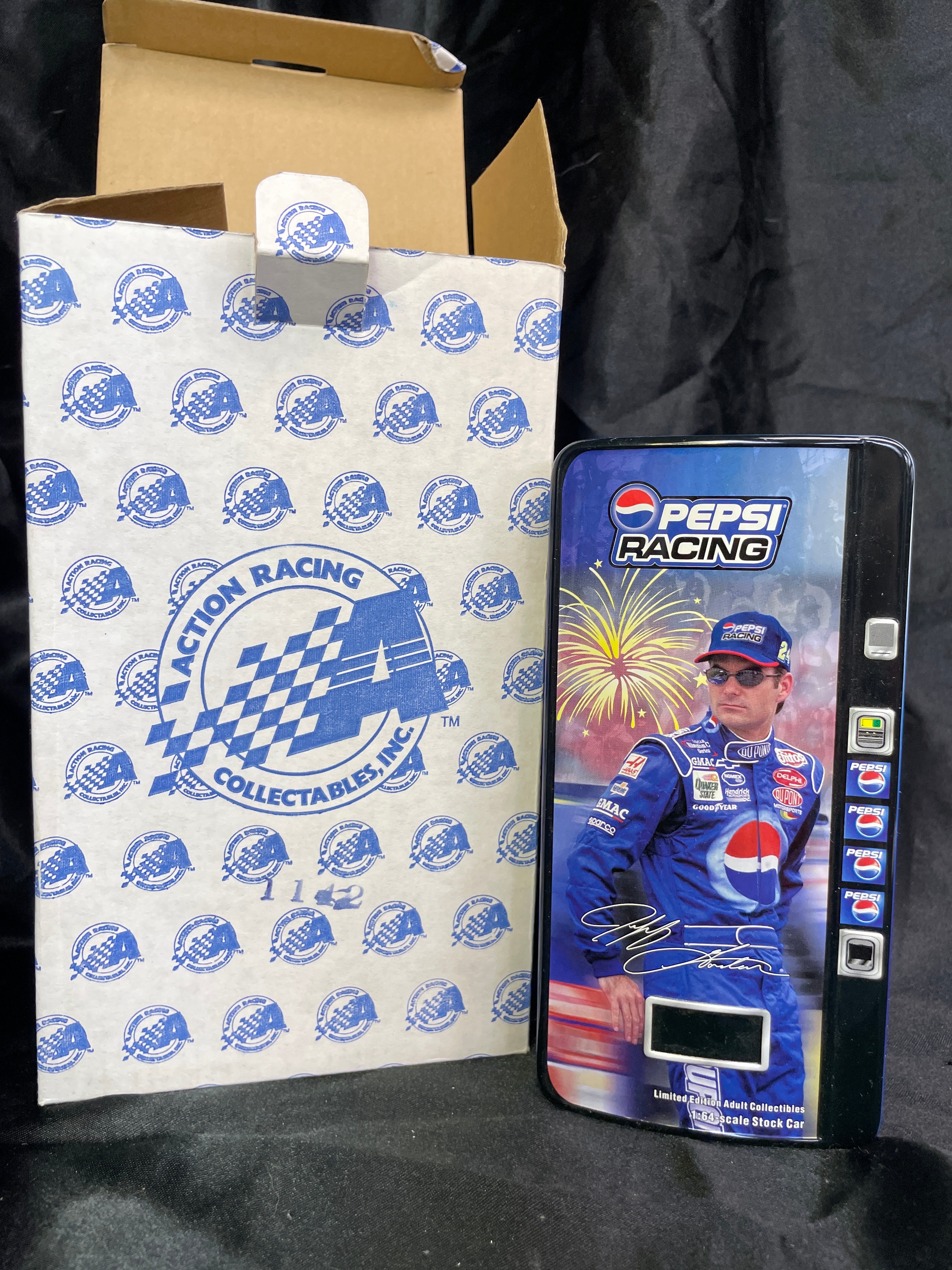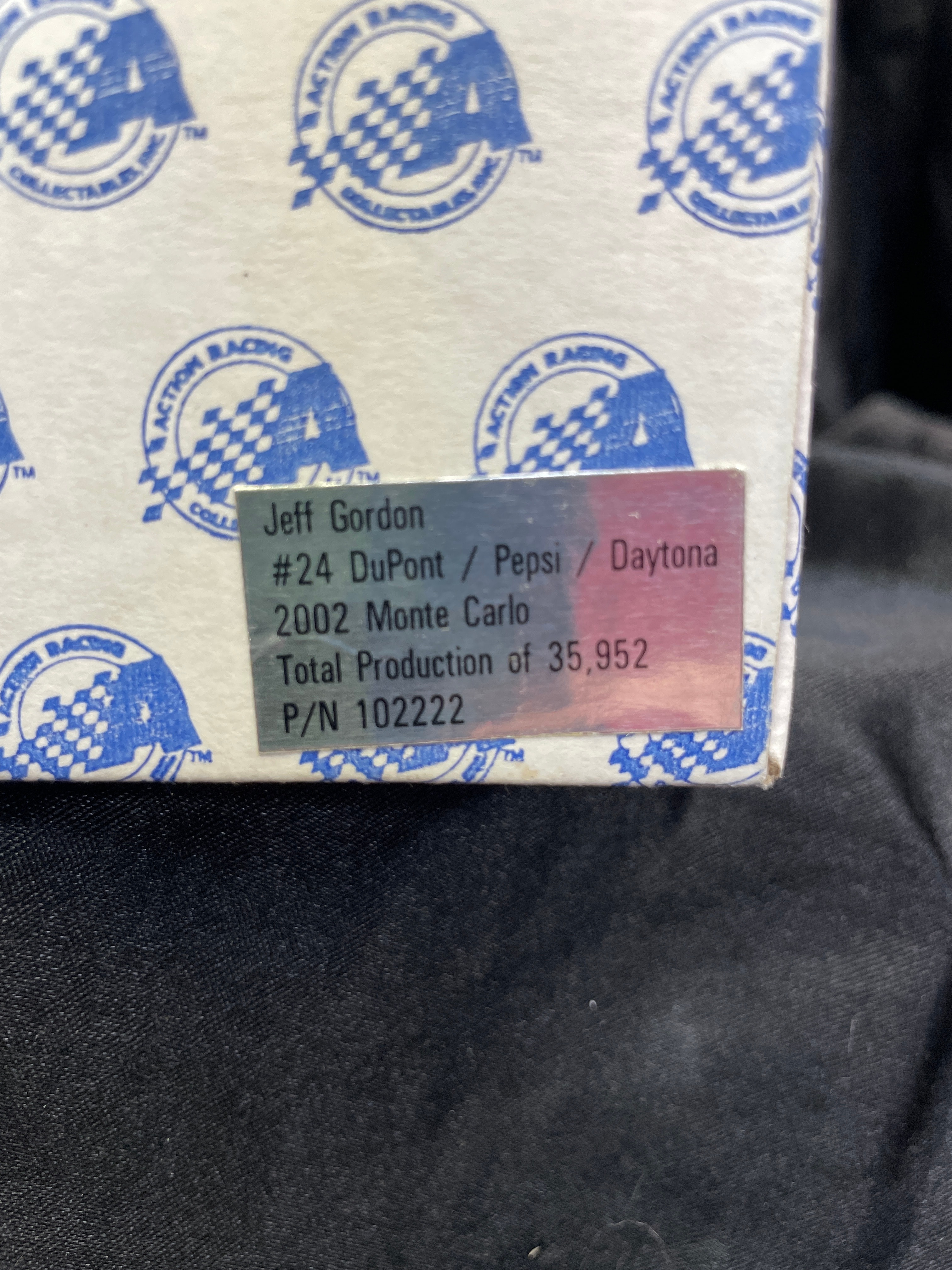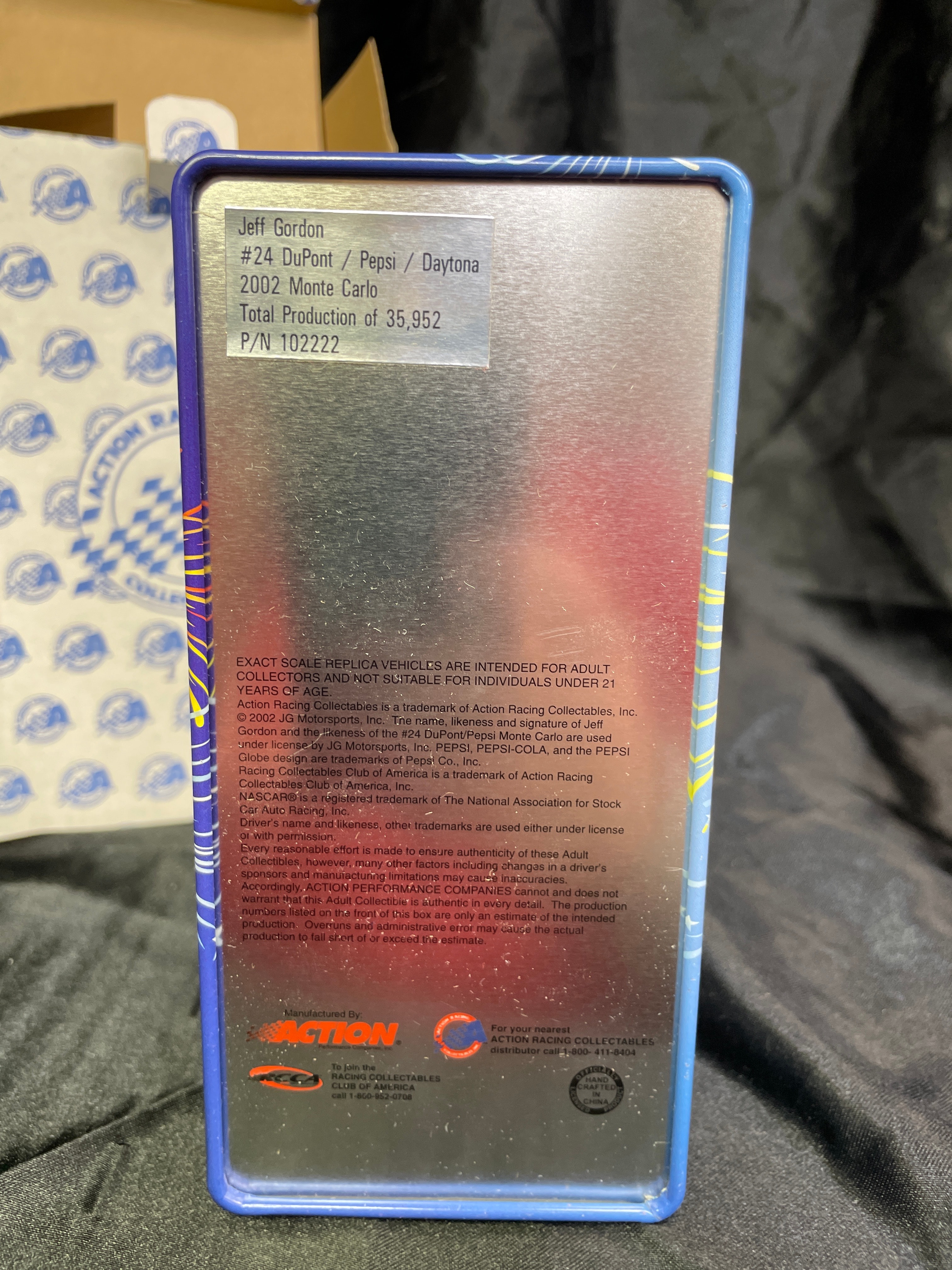 This is a 2002 Jeff Gordon NASCAR 1:24 scale die-cast stock car collectible, presented in a metal tin designed to resemble a Pepsi Racing vending machine, within its original Action Racing Collectables branded cardboard box. The tin prominently displays an image of Jeff Gordon in his #24 Pepsi Racing uniform, along with “Pepsi Racing” text and his signature. Both the tin and an affixed sticker on the outer box identify the item as a “#24 DuPont / Pepsi / Daytona 2002 Monte Carlo” with a “Total Production of 35,952” and P/N 102222. Inside the tin, the blue, red, and white die-cast car, bearing “24” and “Pepsi” branding, is securely nested within a yellow plastic insert.