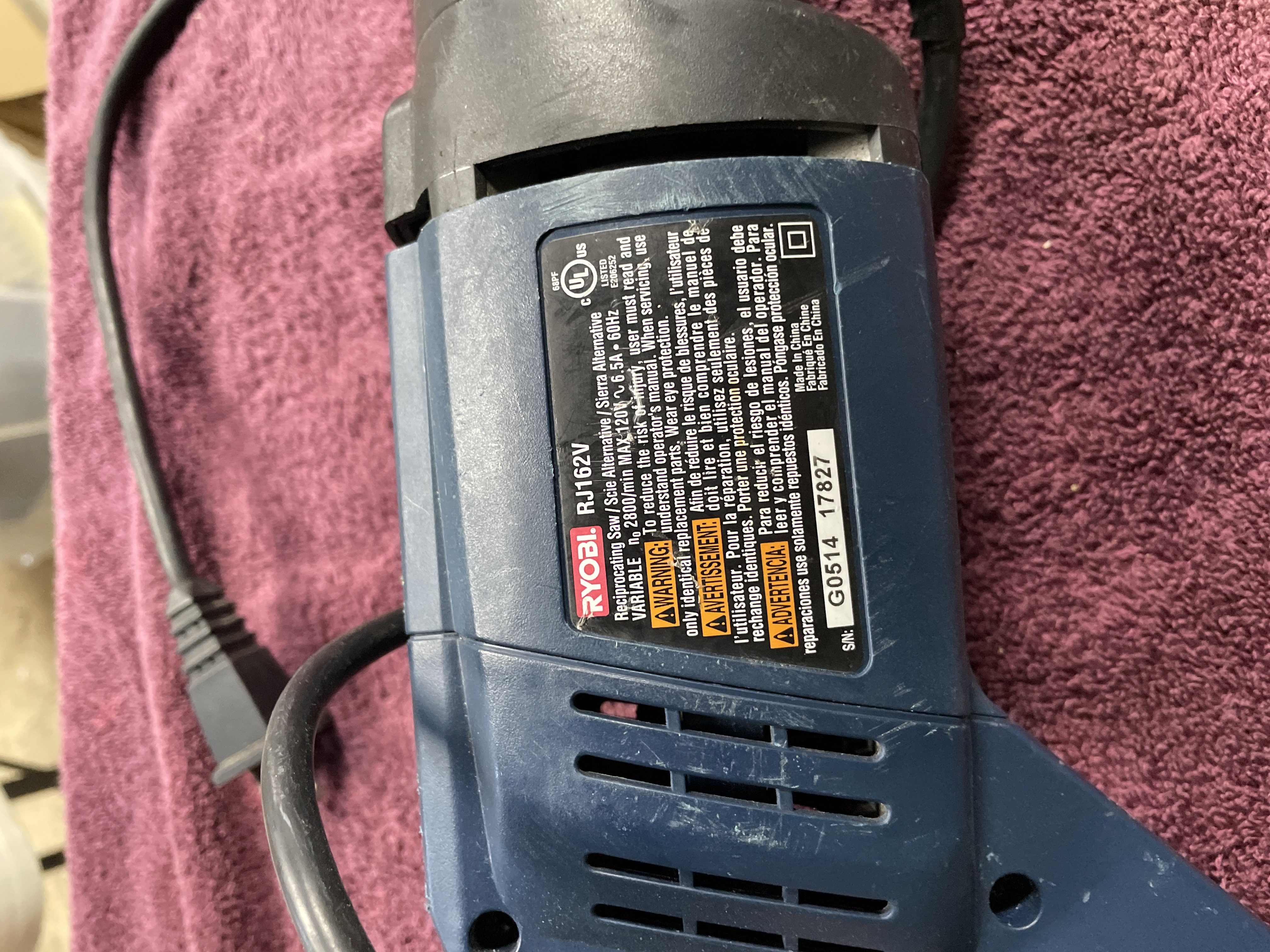 A single corded electric reciprocating saw manufactured by RYOBI, model number RJ162V. The tool features a blue and black plastic housing. Visible markings on the specification label indicate the tool is a Reciprocating Saw / Scie Alternative / Sierra Alternativa, rated for 120V, 6.5A, with a maximum speed of 2000/min. The serial number is G0514 17827. The tool was Made in China. A blue sticker marked “15” is affixed to the side of the housing, and the attached black power cord is wrapped around the tool body.