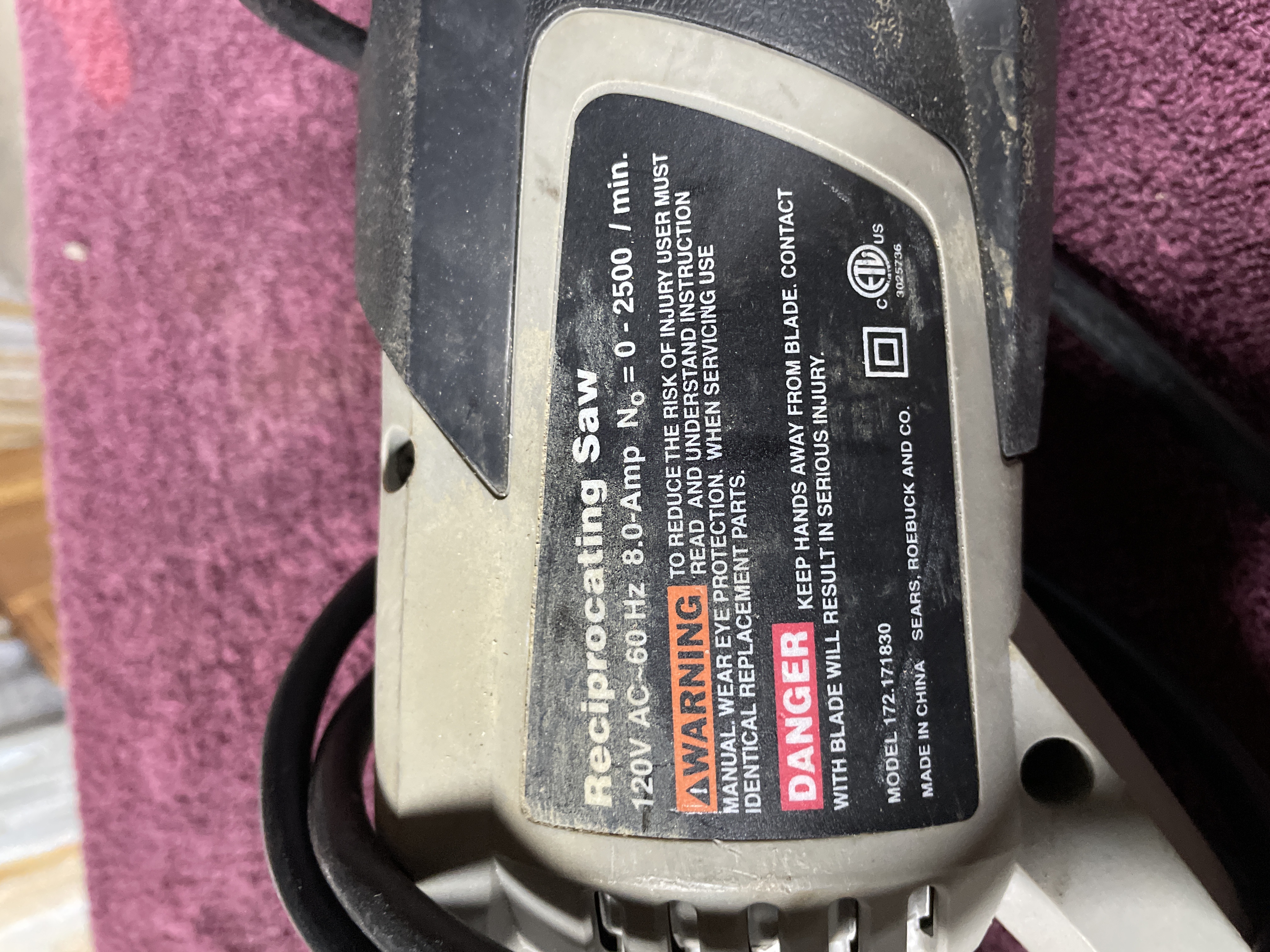A single corded electric reciprocating saw manufactured by Sears, Roebuck and Co. under the CRAFTSMAN brand. The saw features gray and black plastic/composite housing construction. Factual markings indicate the item is Model 172.171830. Specifications are listed as 120V AC, 60 Hz, 8.0-Amp, with a no-load speed (N₀) of 0-2500 per minute. The tool’s origin is marked “MADE IN CHINA.”