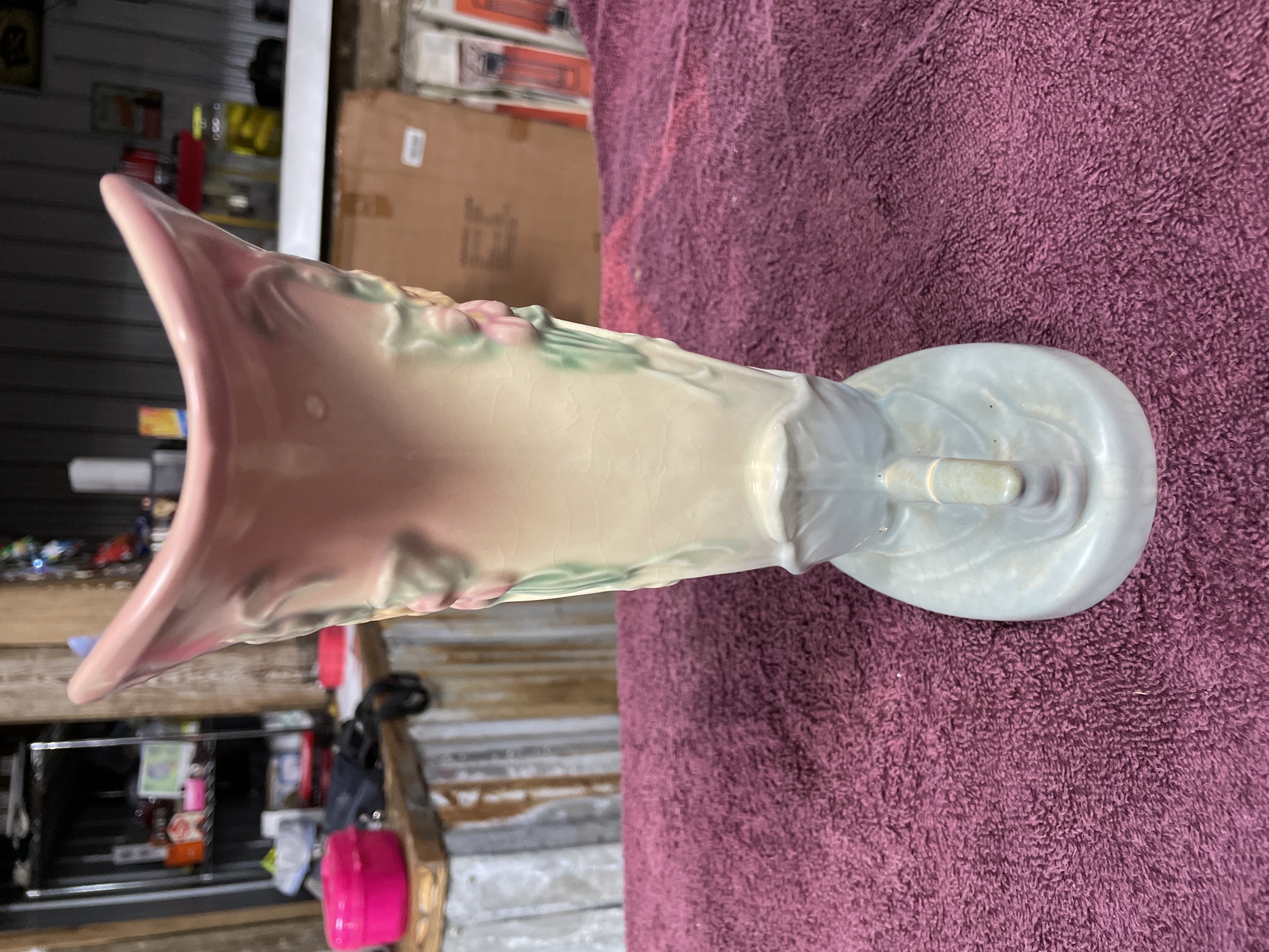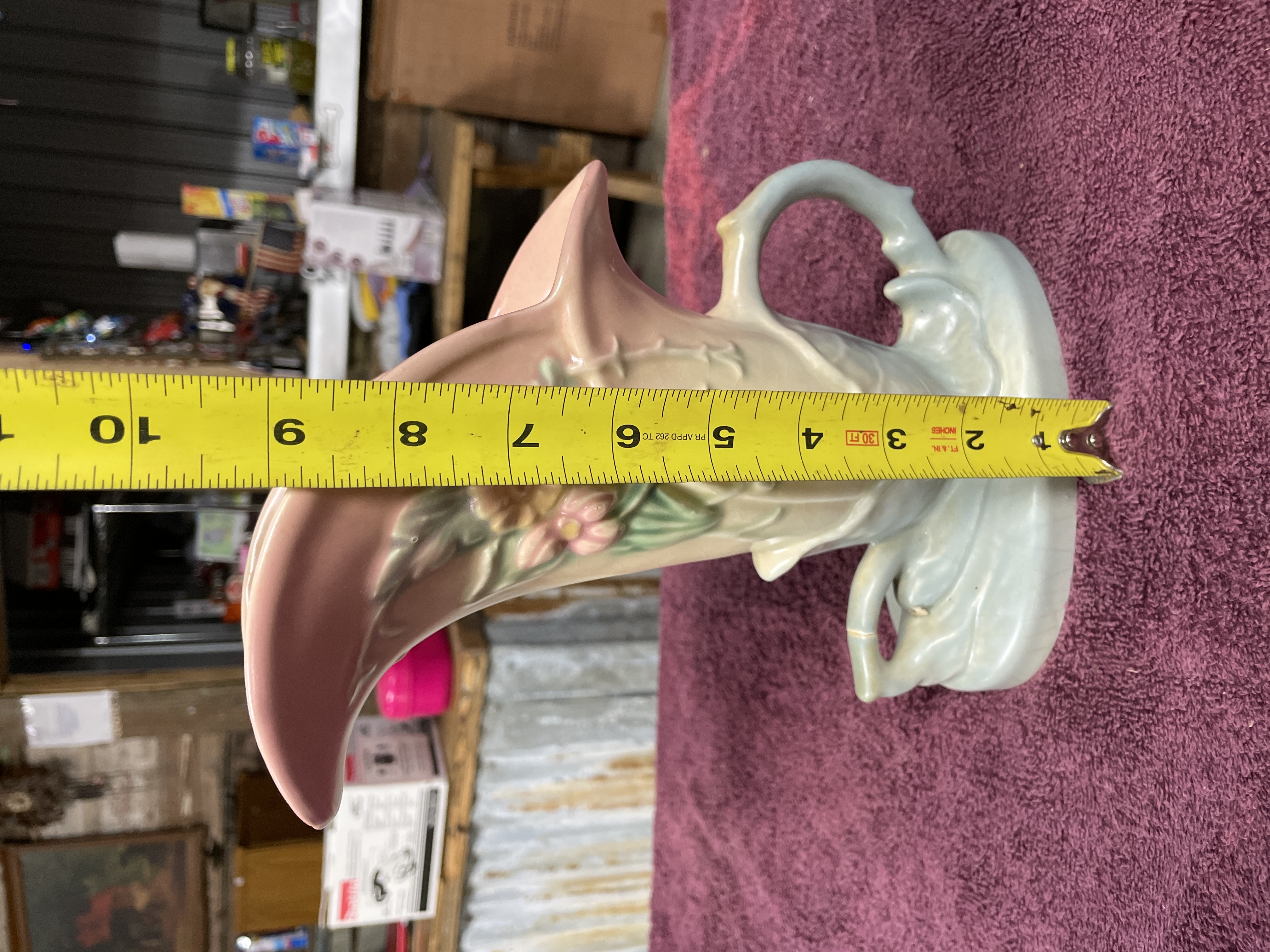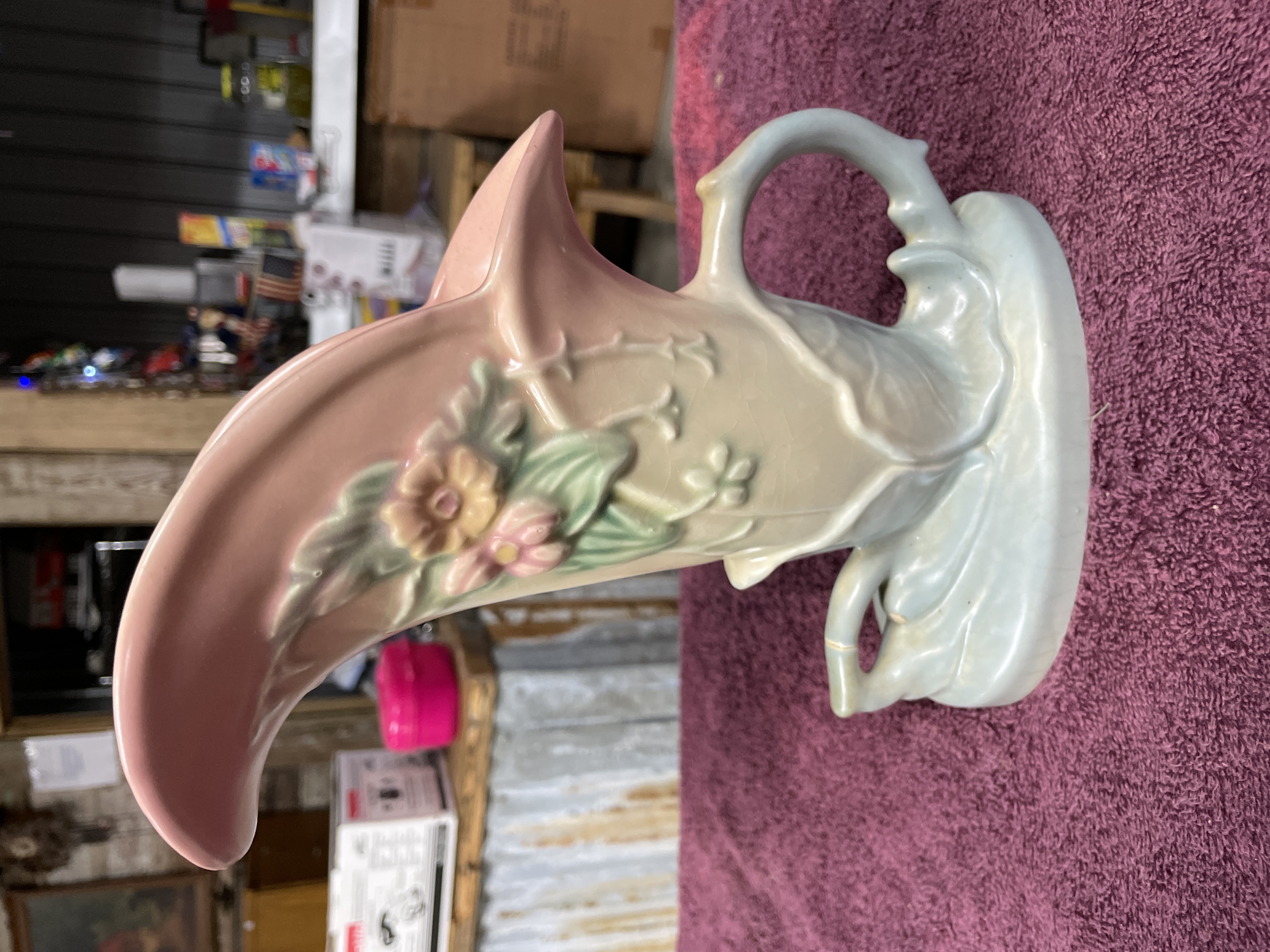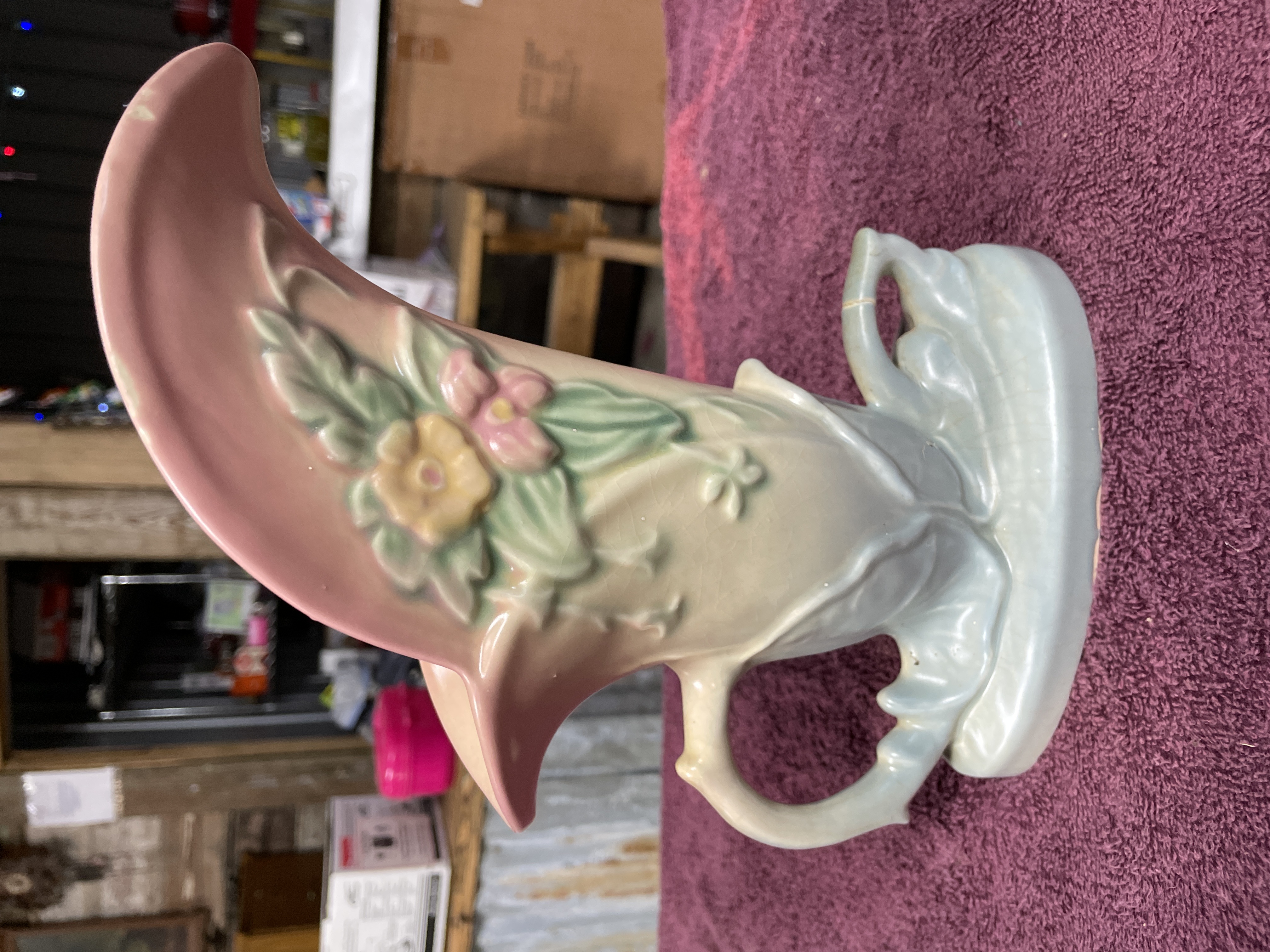 A single vintage glazed ceramic vase manufactured by Hull Pottery in the Wildflower pattern. The piece is executed in an asymmetrical cornucopia or trumpet form, featuring a flaring rim and a sculpted, leaf-like base with a side handle. The multi-colored glaze utilizes pastel hues, including pink on the interior and upper rim, cream on the body, and light blue on the base and handle. The body is decorated in low relief with painted floral motifs. The underside bears clear impressed marks identifying the piece as HULL POTTERY, U.S.A., and the mold number W10-8½.